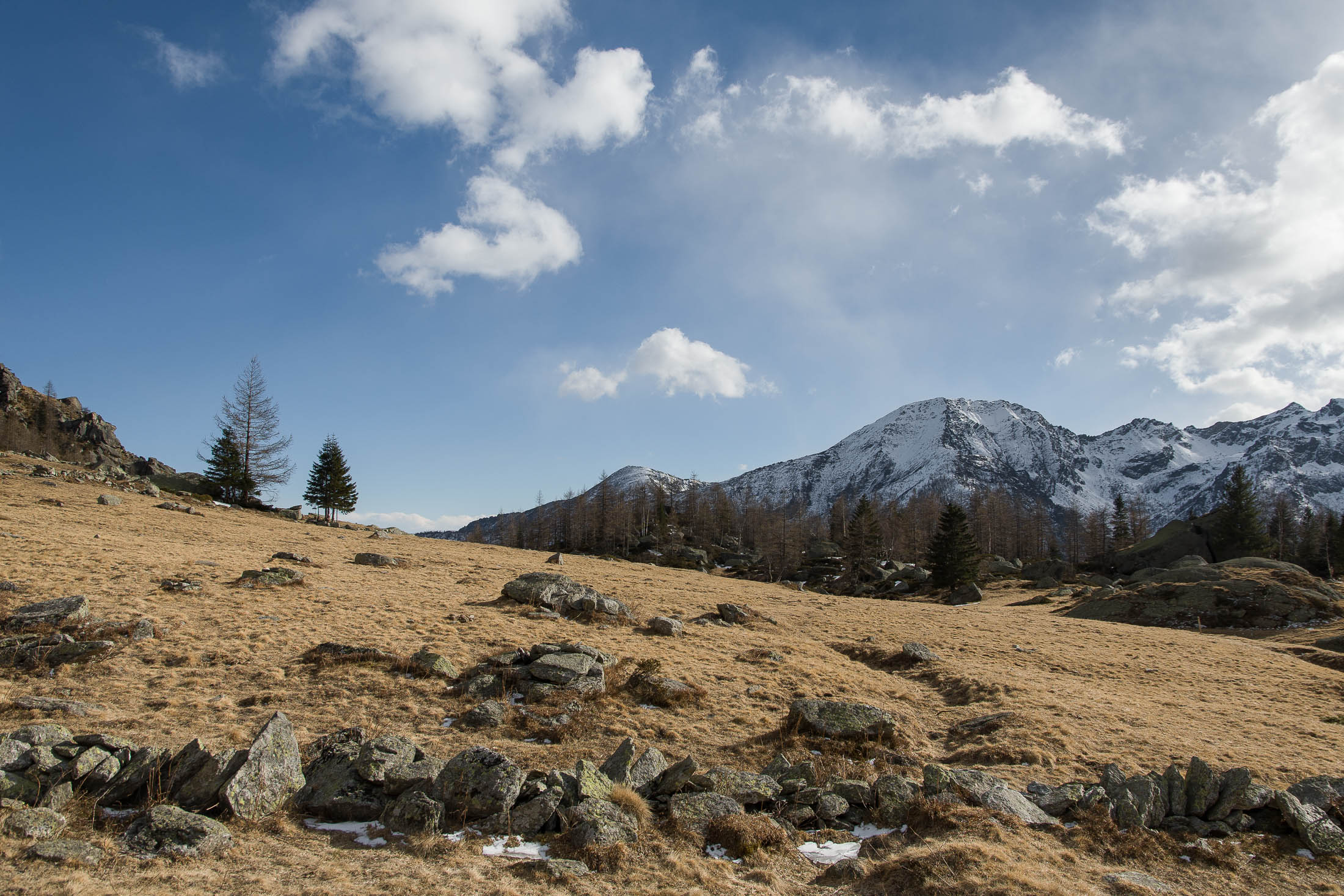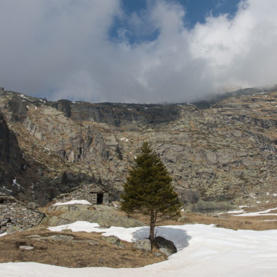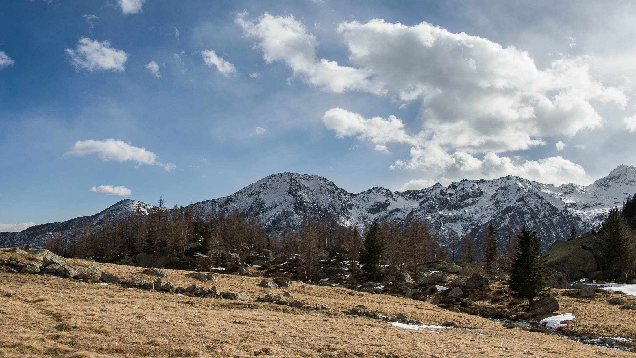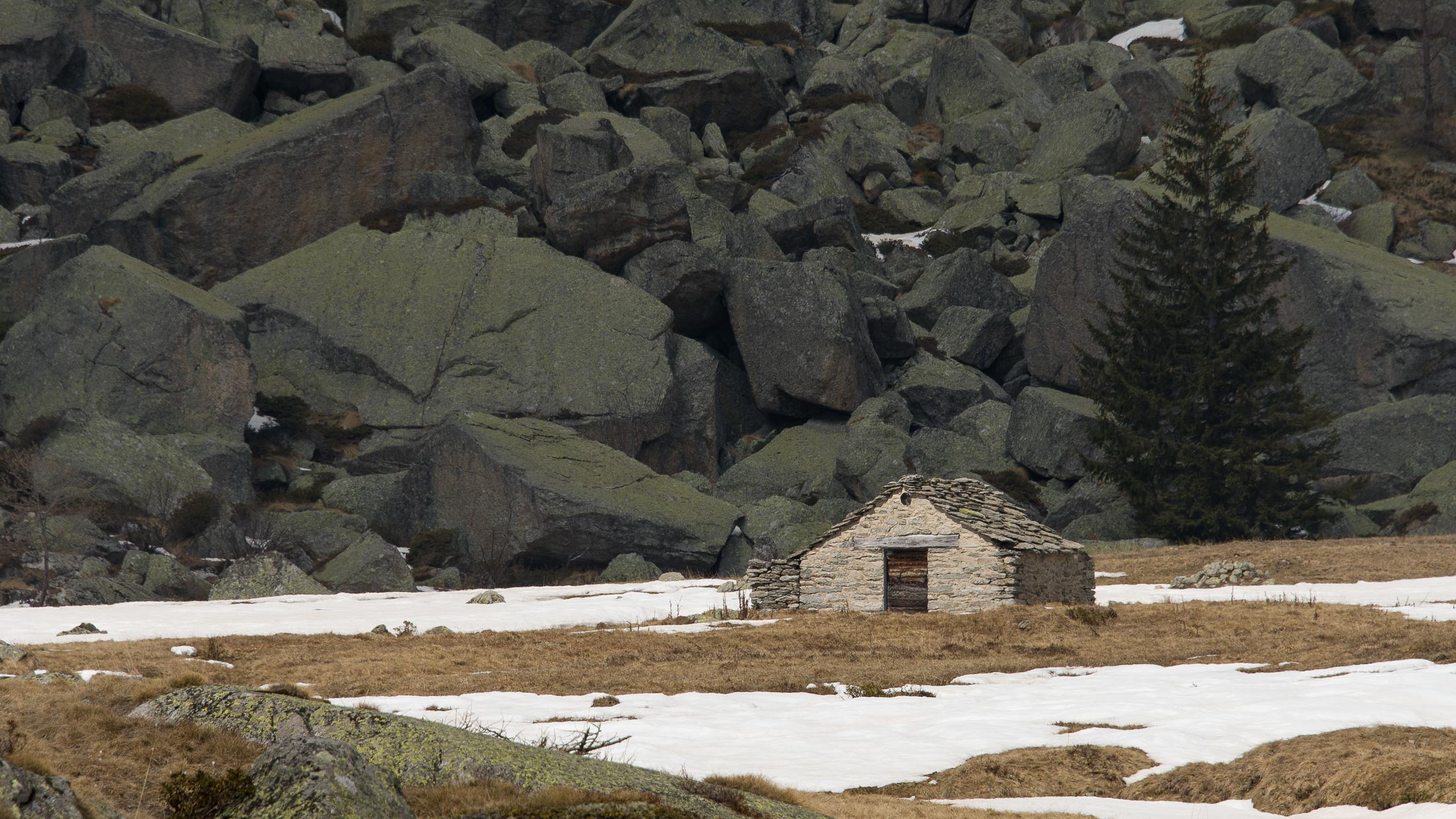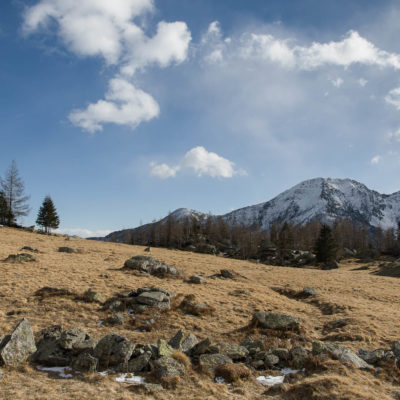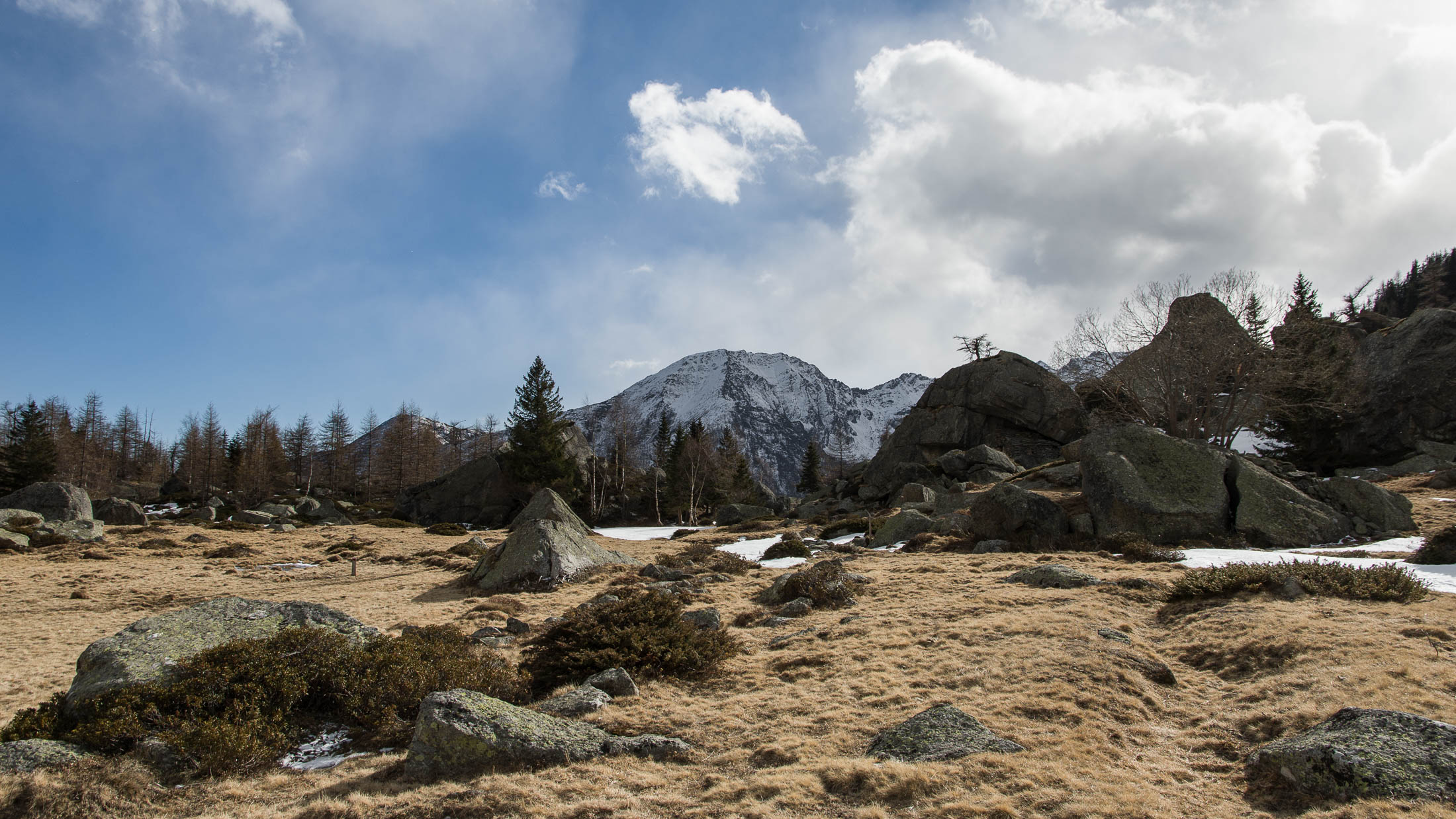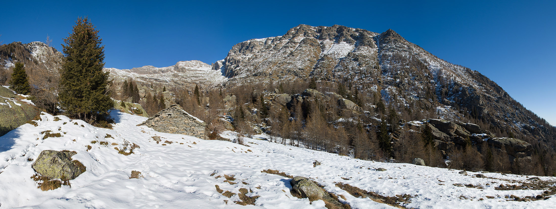 Los gehts am grossen Brunnen am ehemaligen Waschhaus am Ende der Fahrstrasse. Der ausgeschilderte Weg Richtung Mea bleibt unbeachtet, es geht den Hang hinauf, vorbei an einem einzelstehenden Haus. Nach einer Viertelstunde durch schattigen Buchenwald kommt man zu einer Lichtung, hier verlässt man den markierten Weg und geht über die Wiese zu den bereits sichtbaren Hütten von Piane di sotto (1520 m). Zwischen den alten Mauern weilt noch der gute Geist von Domenico, der hier bis zum Jahr 2020 lebte, Sommer für Sommer. Ein Urgestein der Berge, freundlich, aufgeschlossen, authentisch, leider verstarb er ein Jahr später im Alter von 87 Jahren. Die Tür ist abgeschlossen, davor liegt fein säuberlich gestapeltes Brennholz, daneben ein rostiger Eimer, an der Wand ein hölzerner Rechen. Der Brunnen plätschert wie immer friedlich vor sich hin, alles ist noch so, wie es war. Jenseits der Hütten geht es durch eine Lücke zwischen den stämmigen Buchen weiter aufwärts, weiter oben überquert man eine grosse Weide und erreicht einen unbefestigten Fahrweg. Auf diesem trabt man gemütlich weiter bis Vaccheria (1630 m), die Alpgebäude werden noch instandgehalten und genutzt. Von hier schraubt sich ein ein schöner Alpweg den Kiefernwald hinauf, dann weiter auf Treppenstufen durch eine schmale Lichtung entlang einer steilen Felswand bis zu einem Bildstock. Man erreicht einen grasigen Geländerücken (1742 m) mit verstreuten Lärchen und Birken, mittendrin ruhen ein paar verfallene Hütten und Ställe. Keiner mehr da, das einzige, was bleibt, sind die Erinnerungen, trotzdem ein lauschiges Plätzchen. Bis auf den nahen Felsbuckel sind es nur wenige Schritte, zur Belohnung gibts tolle Aussicht.