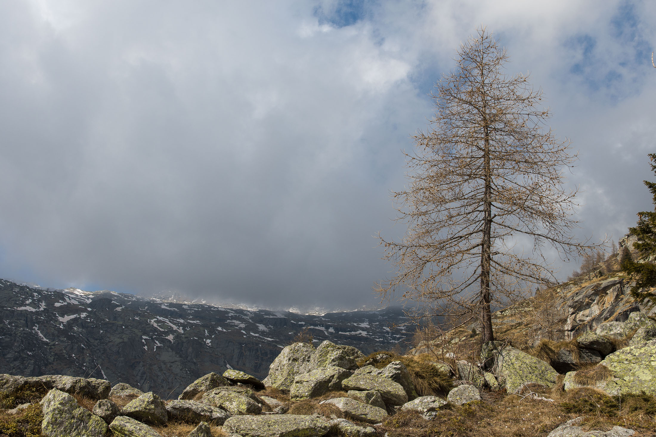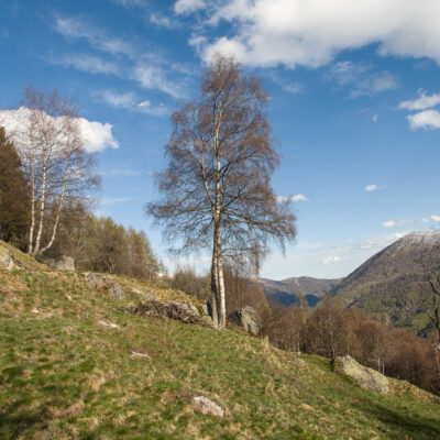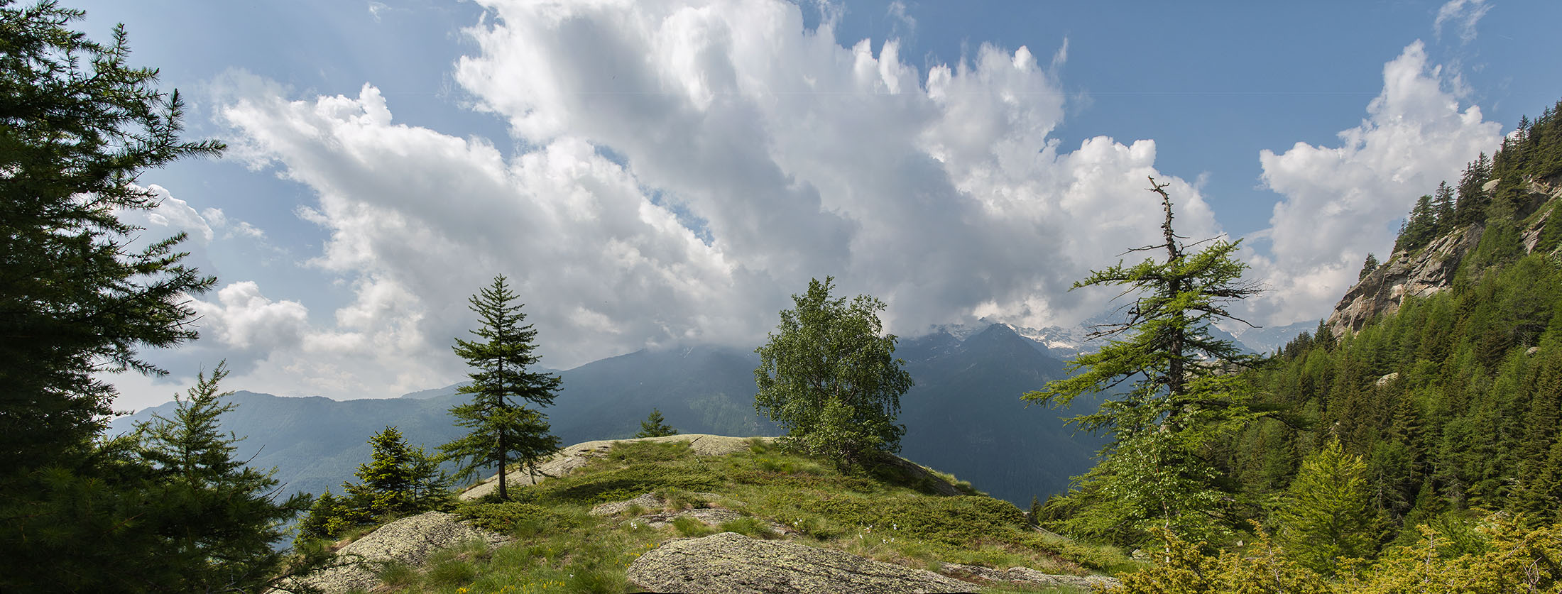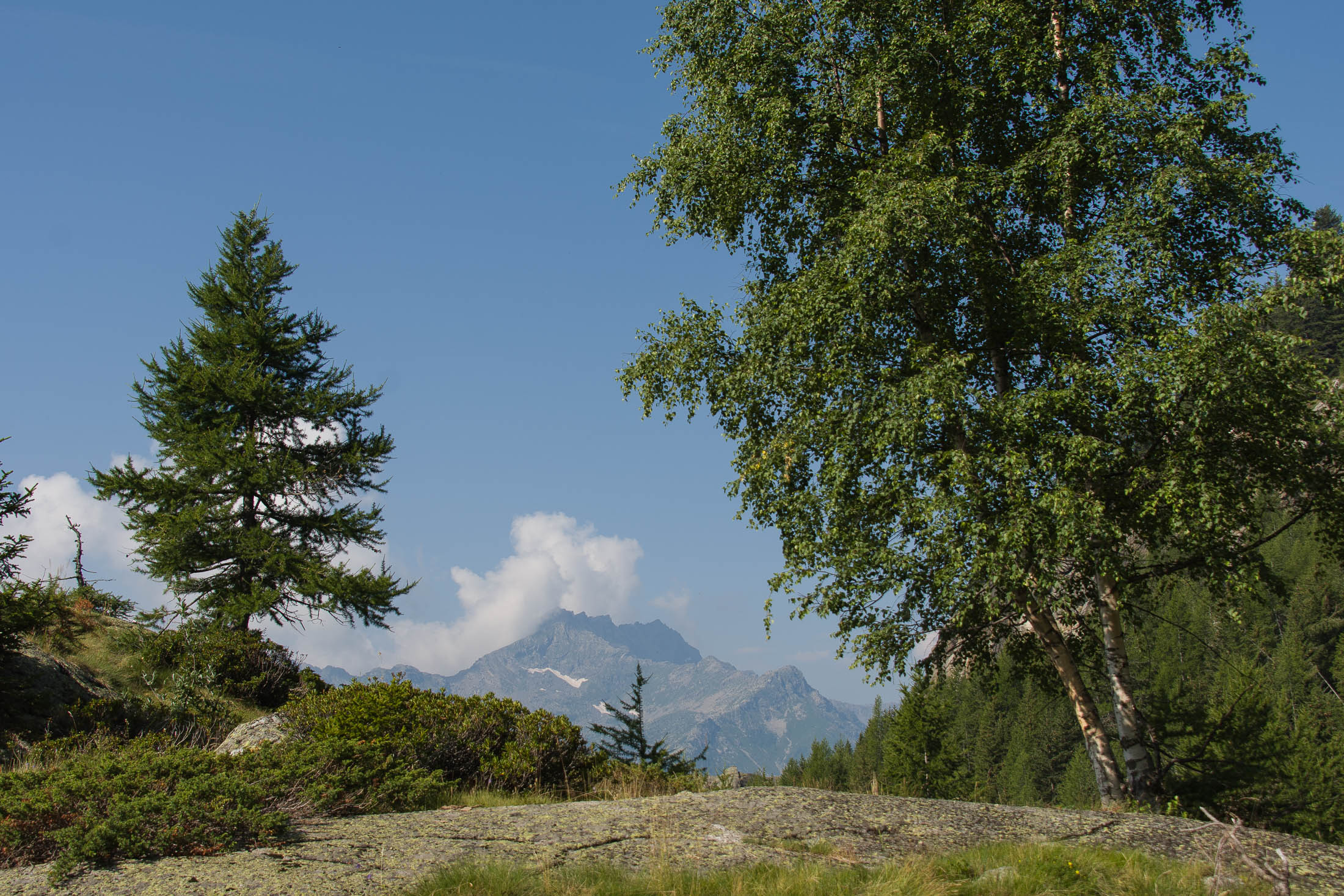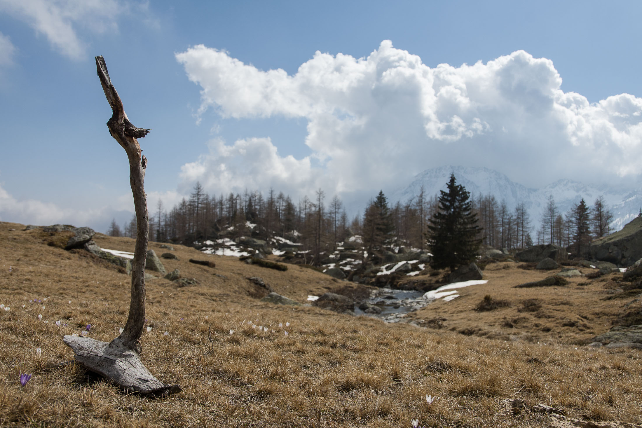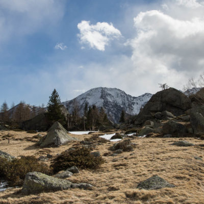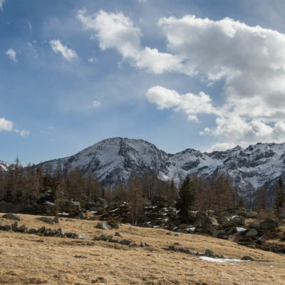 Los gehts am grossen Brunnen am ehemaligen Waschhaus am Ende der Fahrstrasse. Der ausgeschilderte Weg Richtung Mea bleibt unbeachtet, es geht den Hang hinauf, vorbei an einem einzelstehenden Haus. Nach einer Viertelstunde durch schattigen Buchenwald kommt man zu einer Lichtung, hier verlässt man den markierten Weg und geht über die Wiese zu den bereits sichtbaren Hütten von Piane di sotto (1520 m). Zwischen den alten Mauern weilt noch der gute Geist von Domenico, der hier bis zum Jahr 2020 lebte, Sommer für Sommer. Ein Urgestein der Berge, freundlich, aufgeschlossen, authentisch, leider verstarb er ein Jahr später im Alter von 87 Jahren. Die Tür ist abgeschlossen, davor liegt fein säuberlich gestapeltes Brennholz, daneben ein rostiger Eimer, an der Wand ein hölzerner Rechen. Der Brunnen plätschert wie immer friedlich vor sich hin, alles ist noch so, wie es war. Jenseits der Hütten geht es durch eine Lücke zwischen den stämmigen Buchen weiter aufwärts, weiter oben überquert man eine grosse Weide und erreicht einen unbefestigten Fahrweg. Auf diesem trabt man gemütlich weiter bis Vaccheria (1630 m), die Alpgebäude werden noch instandgehalten und genutzt. Von hier schraubt sich ein ein schöner Alpweg den Kiefernwald hinauf, dann weiter auf Treppenstufen durch eine schmale Lichtung entlang einer steilen Felswand bis zu einem Bildstock. Man erreicht einen grasigen Geländerücken (1742 m) mit verstreuten Lärchen und Birken, mittendrin ruhen ein paar verfallene Hütten und Ställe. Keiner mehr da, das einzige, was bleibt, sind die Erinnerungen, trotzdem ein lauschiges Plätzchen. Bis auf den nahen Felsbuckel sind es nur wenige Schritte, zur Belohnung gibts tolle Aussicht.