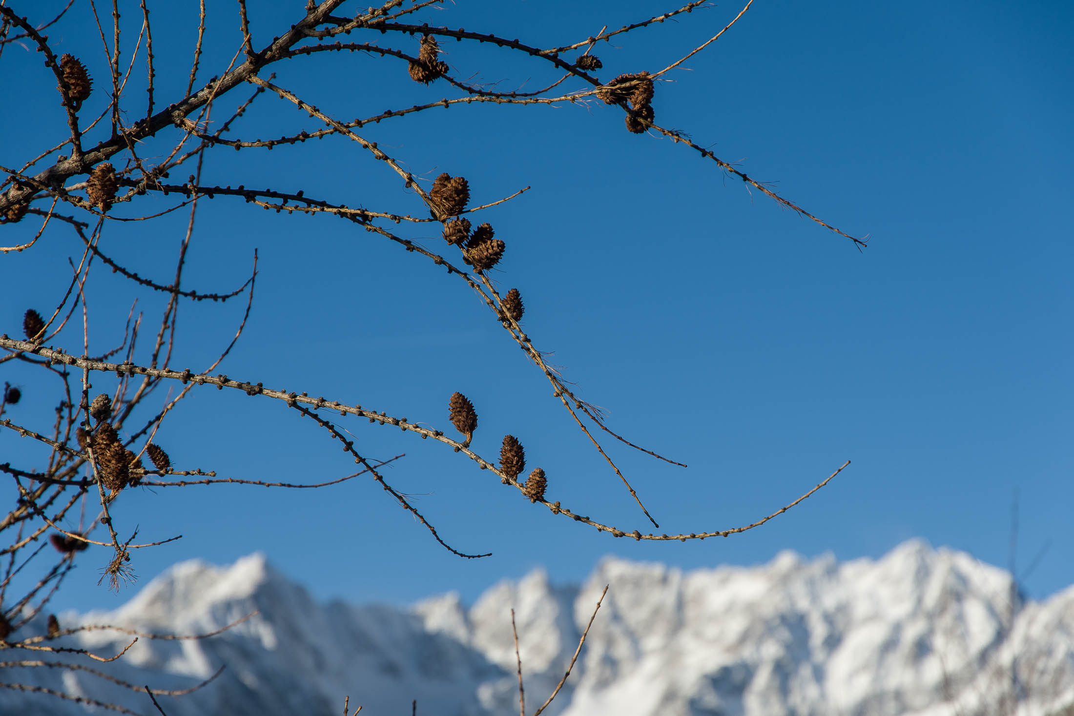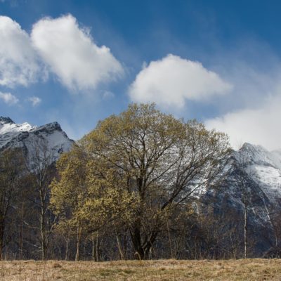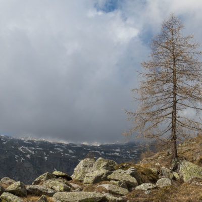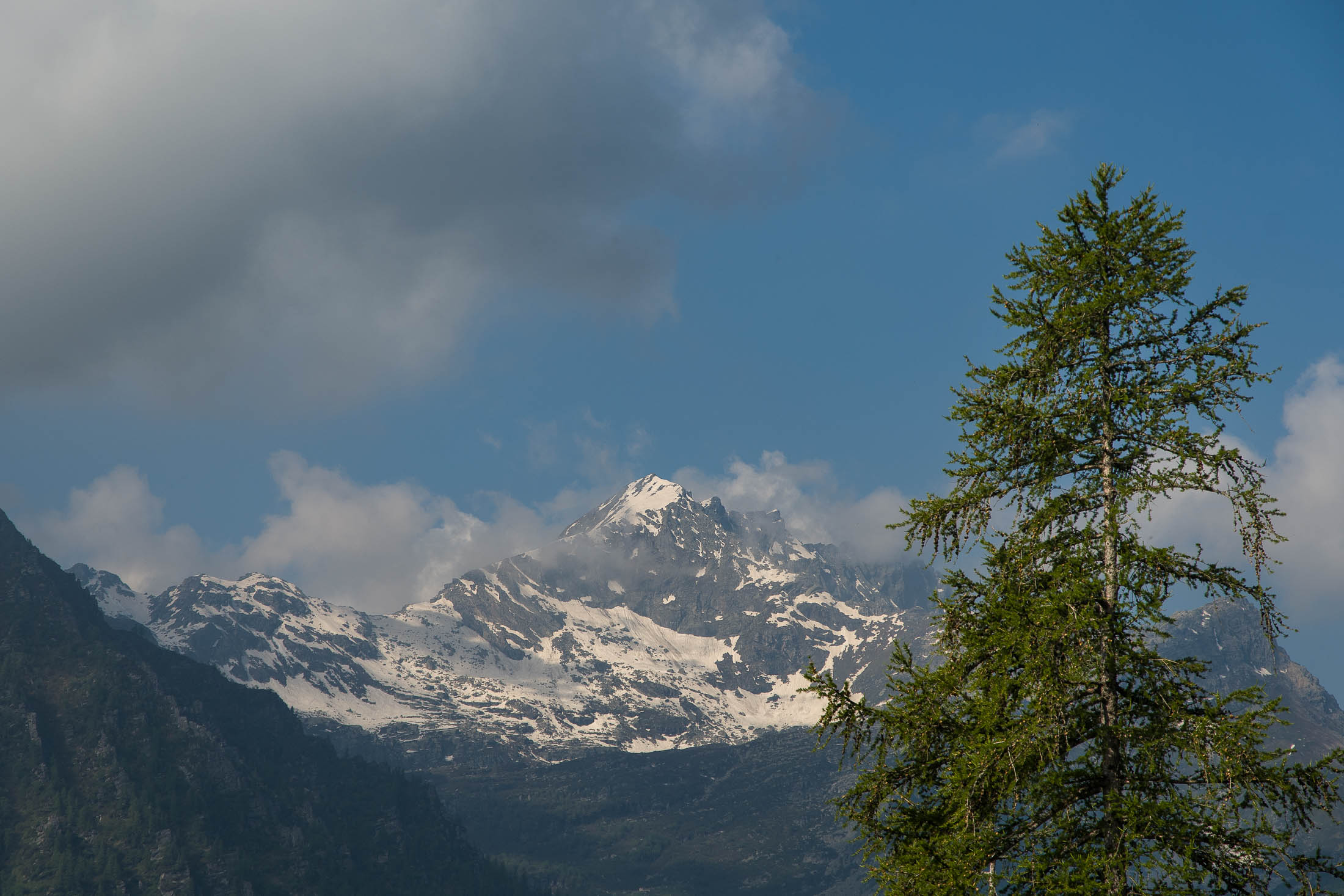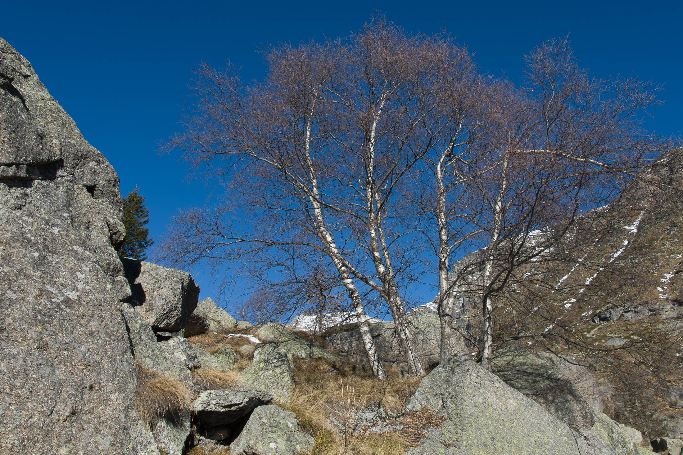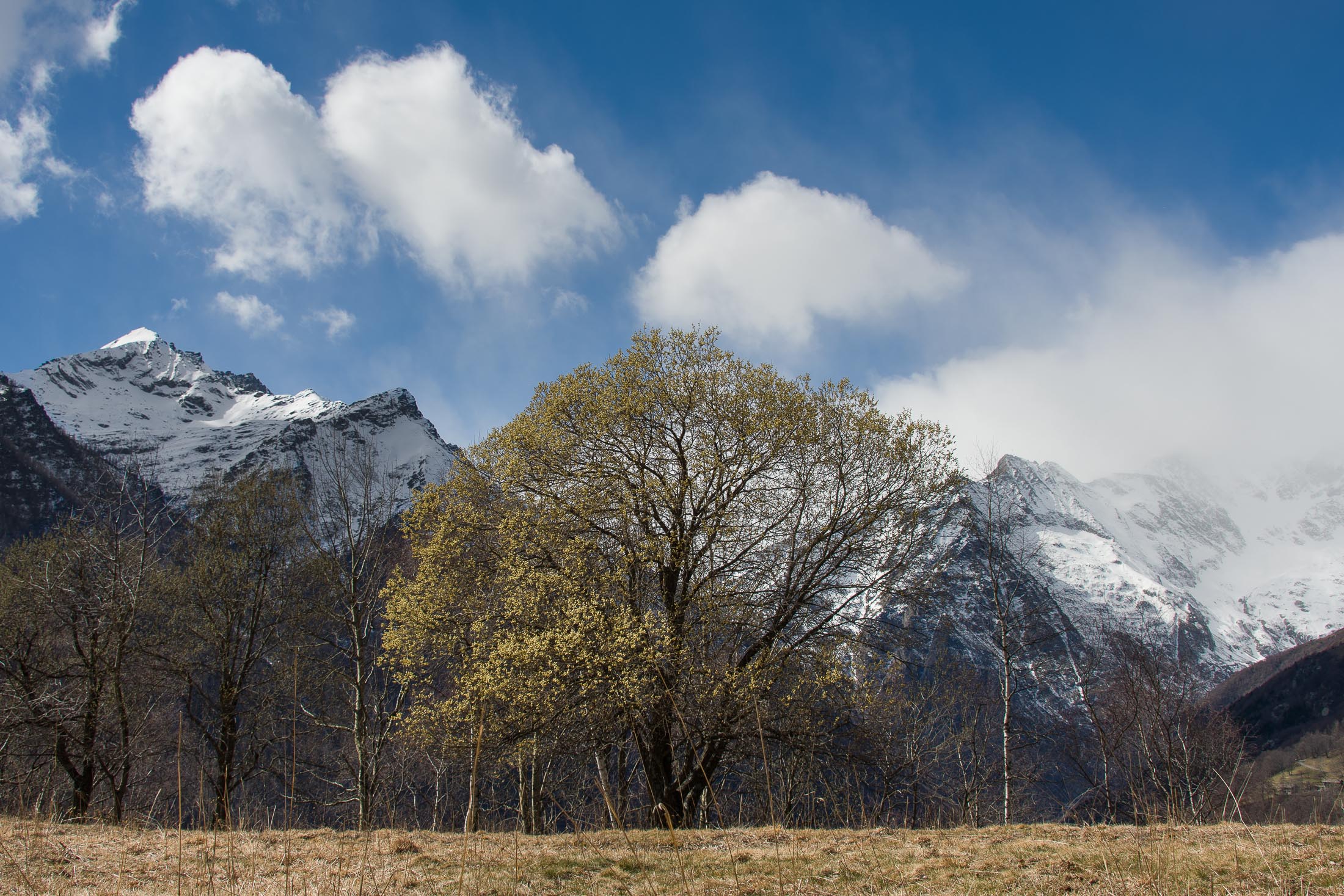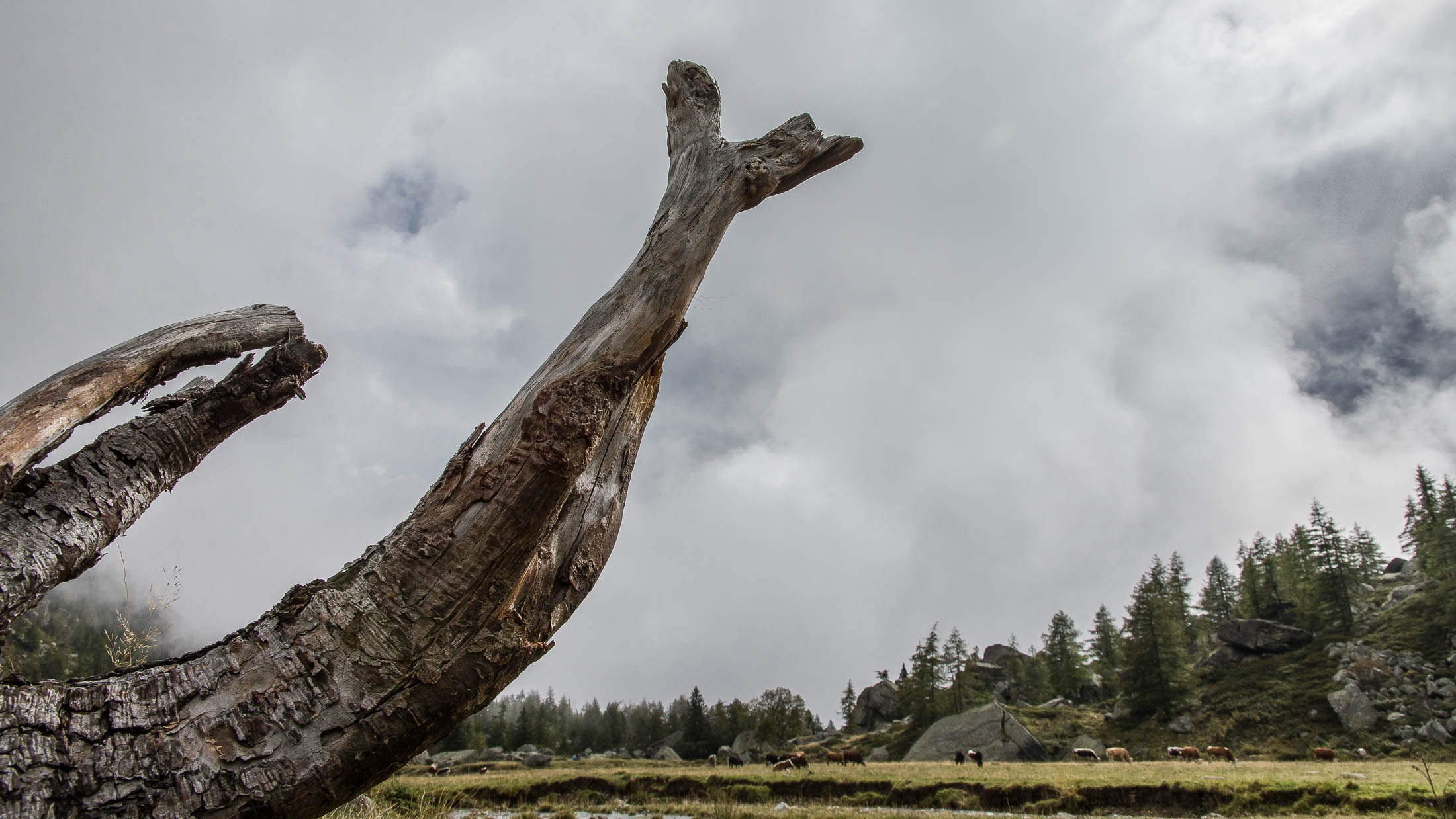 Los gehts am grossen Brunnen am ehemaligen Waschhaus am Ende der Fahrstrasse. Der ausgeschilderte Weg Richtung Mea bleibt unbeachtet, es geht den Hang hinauf, vorbei an einem einzelstehenden Haus. Nach einer Viertelstunde durch schattigen Buchenwald kommt man zu einer Lichtung, hier verlässt man den markierten Weg und geht über die Wiese zu den bereits sichtbaren Hütten von Piane di sotto (1520 m). Zwischen den alten Mauern weilt noch der gute Geist von Domenico, der hier bis zum Jahr 2020 lebte, Sommer für Sommer. Ein Urgestein der Berge, freundlich, aufgeschlossen, authentisch, leider verstarb er ein Jahr später im Alter von 87 Jahren. Die Tür ist abgeschlossen, davor liegt fein säuberlich gestapeltes Brennholz, daneben ein rostiger Eimer, an der Wand ein hölzerner Rechen. Der Brunnen plätschert wie immer friedlich vor sich hin, alles ist noch so, wie es war. Jenseits der Hütten geht es durch eine Lücke zwischen den stämmigen Buchen weiter aufwärts, weiter oben überquert man eine grosse Weide und erreicht einen unbefestigten Fahrweg. Auf diesem trabt man gemütlich weiter bis Vaccheria (1630 m), die Alpgebäude werden noch instandgehalten und genutzt. Von hier schraubt sich ein ein schöner Alpweg den Kiefernwald hinauf, dann weiter auf Treppenstufen durch eine schmale Lichtung entlang einer steilen Felswand bis zu einem Bildstock. Man erreicht einen grasigen Geländerücken (1742 m) mit verstreuten Lärchen und Birken, mittendrin ruhen ein paar verfallene Hütten und Ställe. Keiner mehr da, das einzige, was bleibt, sind die Erinnerungen, trotzdem ein lauschiges Plätzchen. Bis auf den nahen Felsbuckel sind es nur wenige Schritte, zur Belohnung gibts tolle Aussicht.