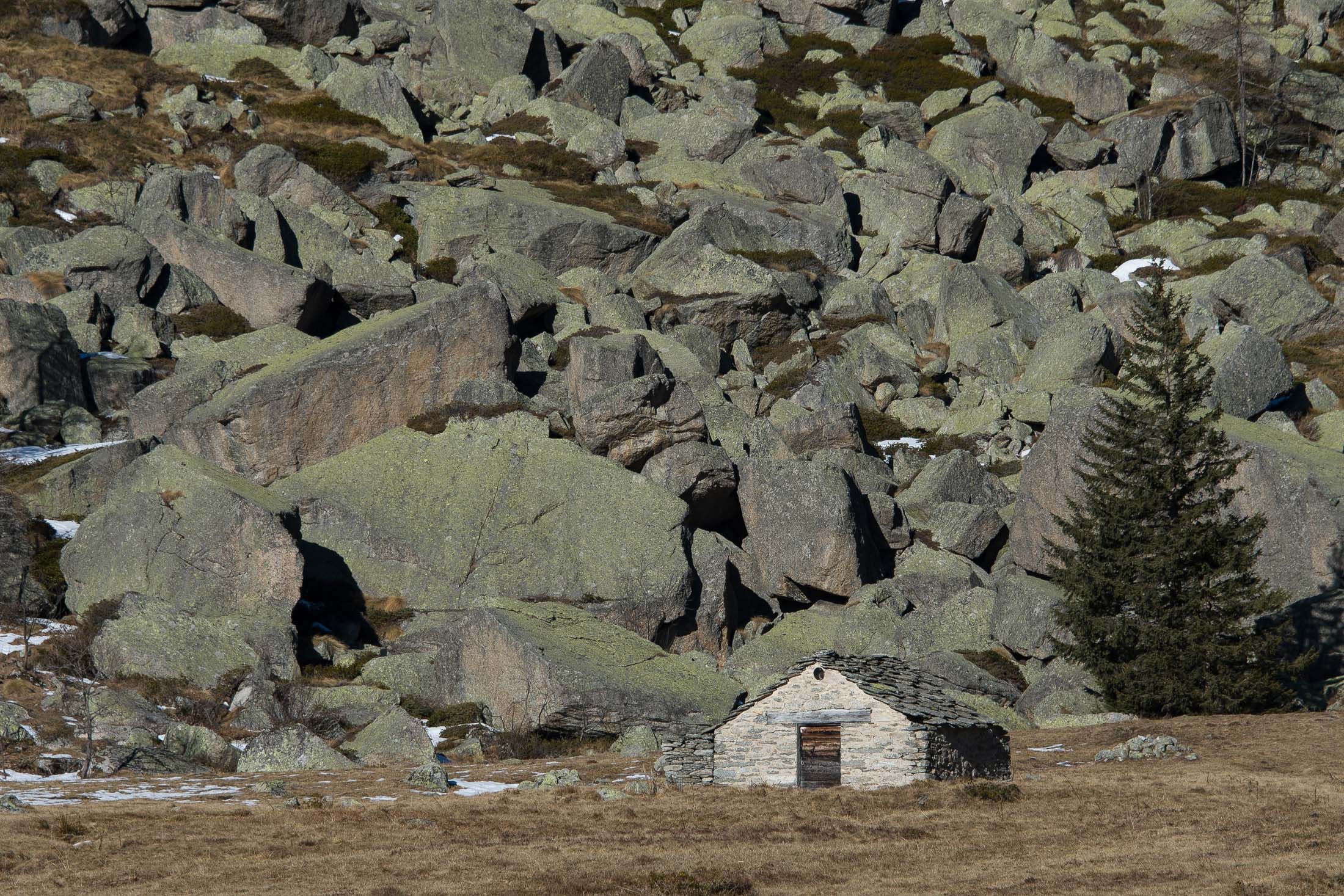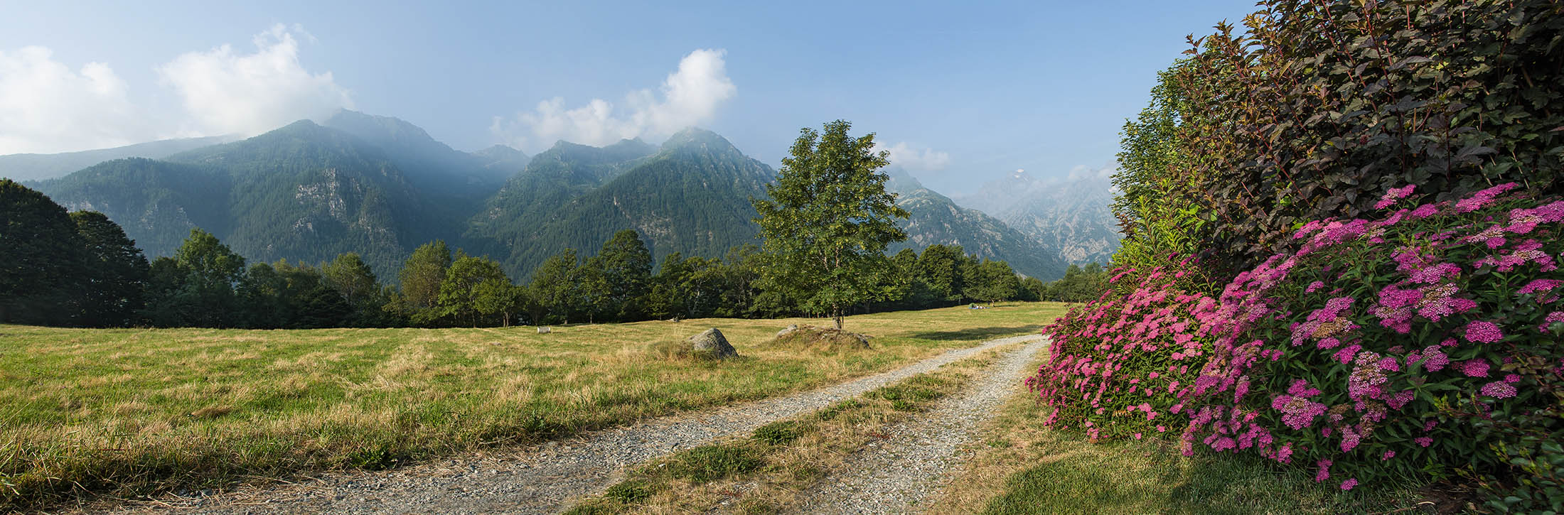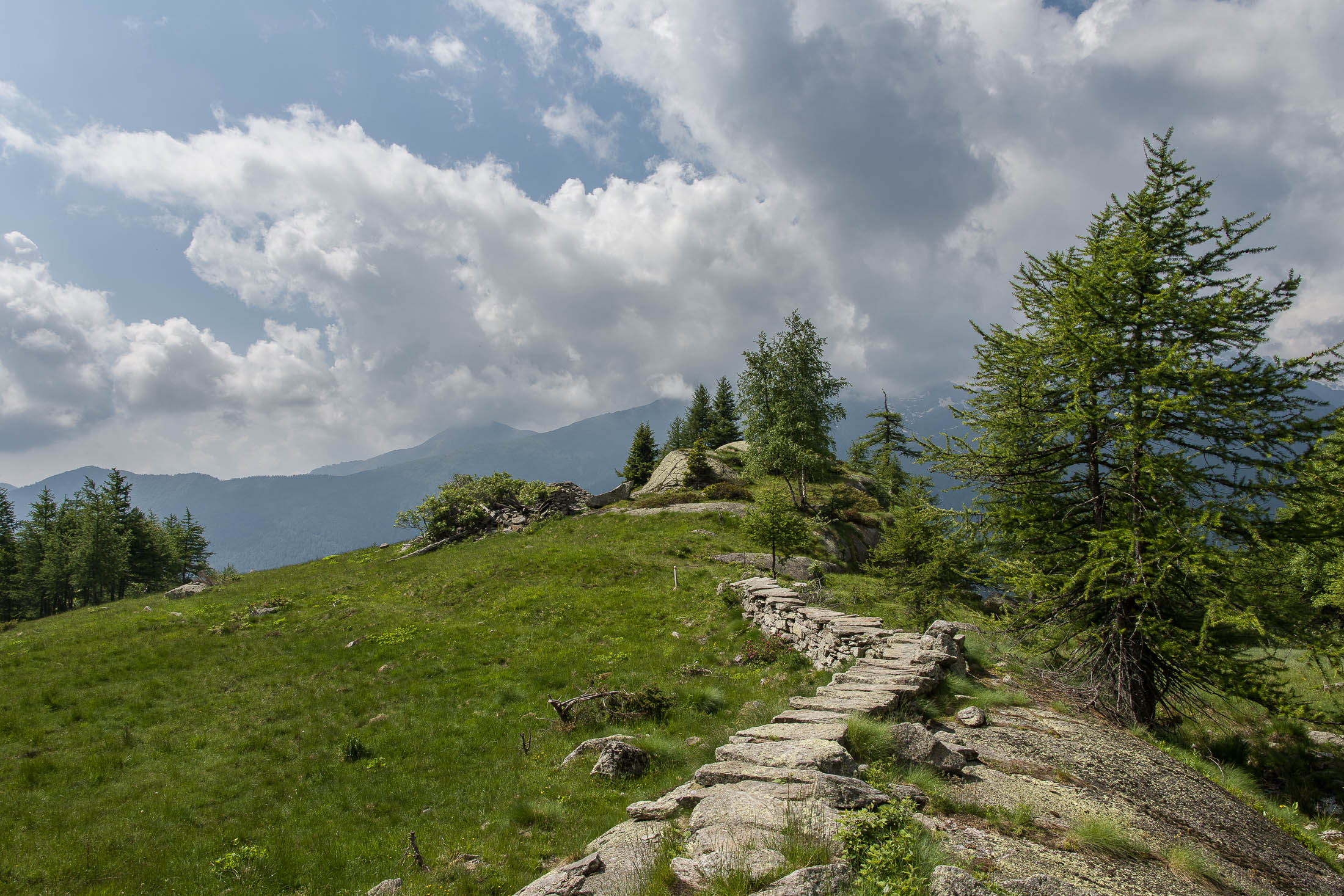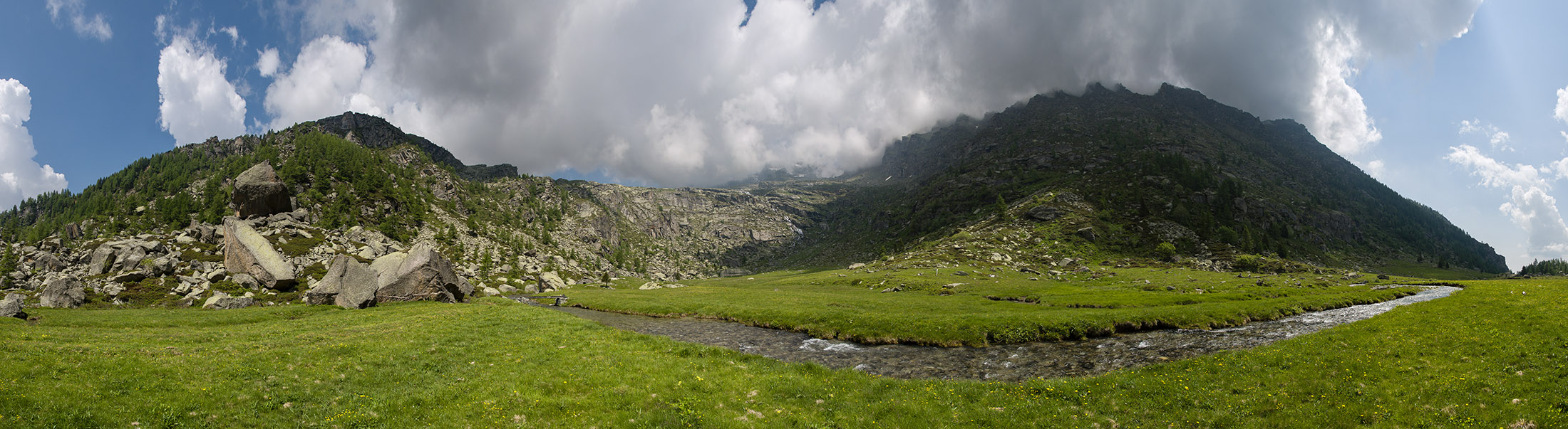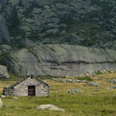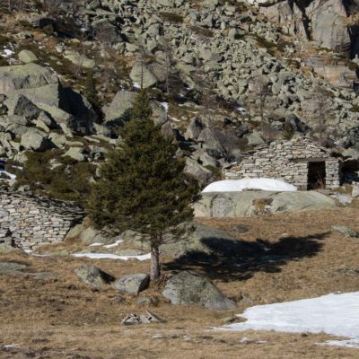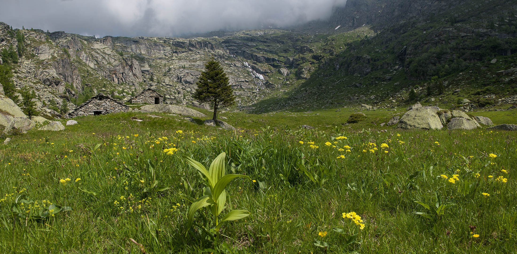 Weiter oben wird es karger, die Gegend ist übersät von Steinen und Felsbrocken, die wunderschöne Mulattiera führt mitten hindurch, mal auf sorgfältig gepflasterten Abschnitten, mal auf kunstvoll angelegten Treppenstufen. Die Erbauer solcher Wege scheuten einst keine Mühe. Wie viele Kühe, Rinder, Schafe und Ziegen wurden über Generationen hier hinauf getrieben? Dann wird es auf einmal flacher, wenige Minuten später ändert sich die Landschaft schlagartig. Man blickt über eine weite Hochebene, vor einem der Pian delle Riane, ein riesiger grüner Teppich in einem gewaltigen Talkessel. Eine kleine und friedliche Welt für sich, auf den Bergwiesen blühen Veilchen und Schlangen-Knöterich, ansonsten sagen sich hier Hase und Igel gute Nacht. Langweilig kommt jedoch nicht auf, hier kann man stundenlang verweilen. Es lohnt sich, die schöne Umgebung bei einem Spaziergang ein wenig näher zu erkunden, auf der Hochfläche befinden sich die verstreuten Hütten von Riane di sotto (1779 m) und Riane di sopra (1800 m), eine undeutliche Wegspur führt entlang des Rio Unghiasse zu den abseits gelegenen Ruinen von Giardonera und der Gias di Balme. Gelegentlich weiden hier oben im Frühsommer eine Herde Kühe und ein einige Pferde, diese werden jedoch im Verlauf des Sommers weiter in höhergelegene Alpgebiete getrieben.