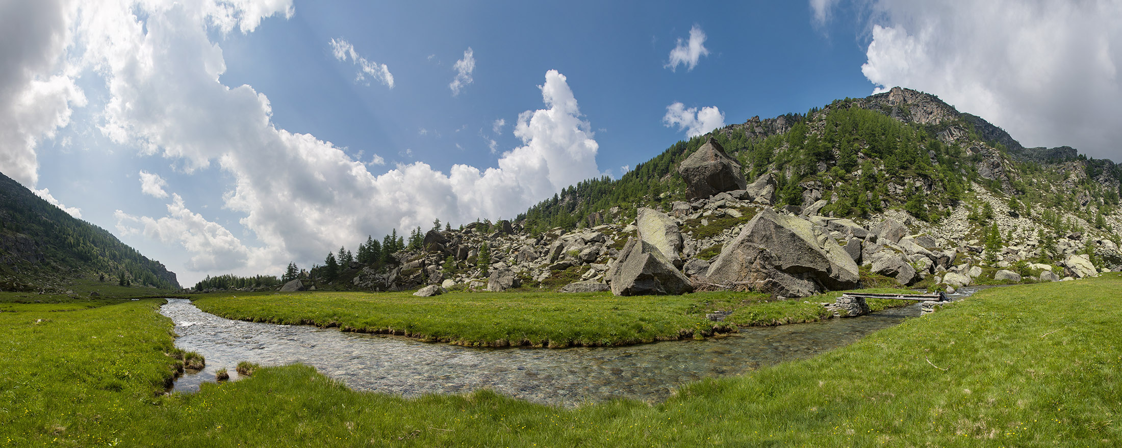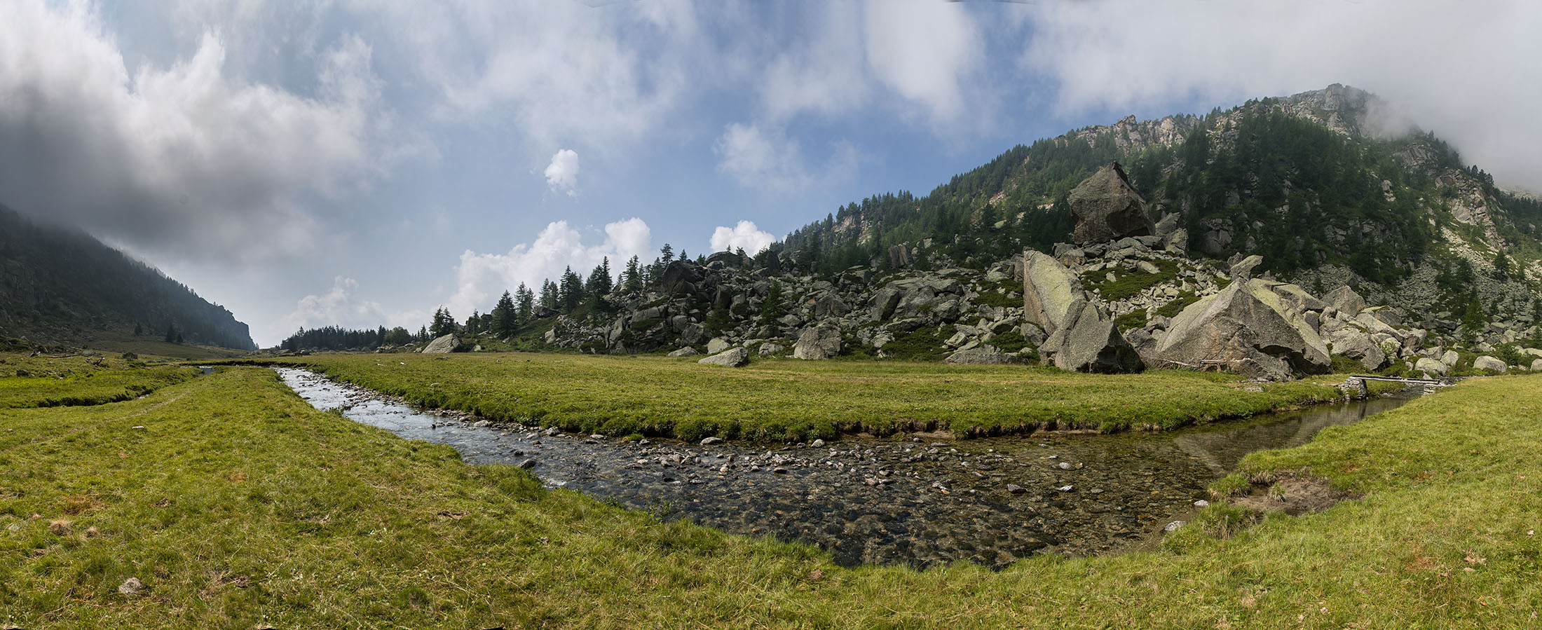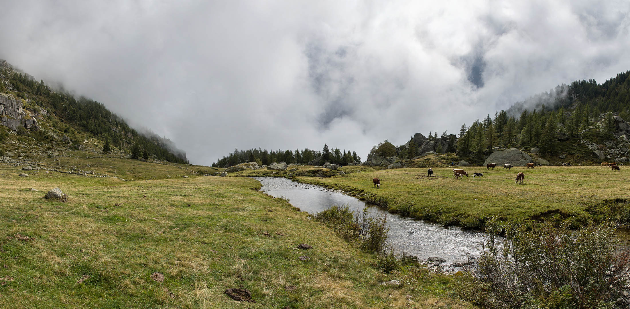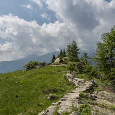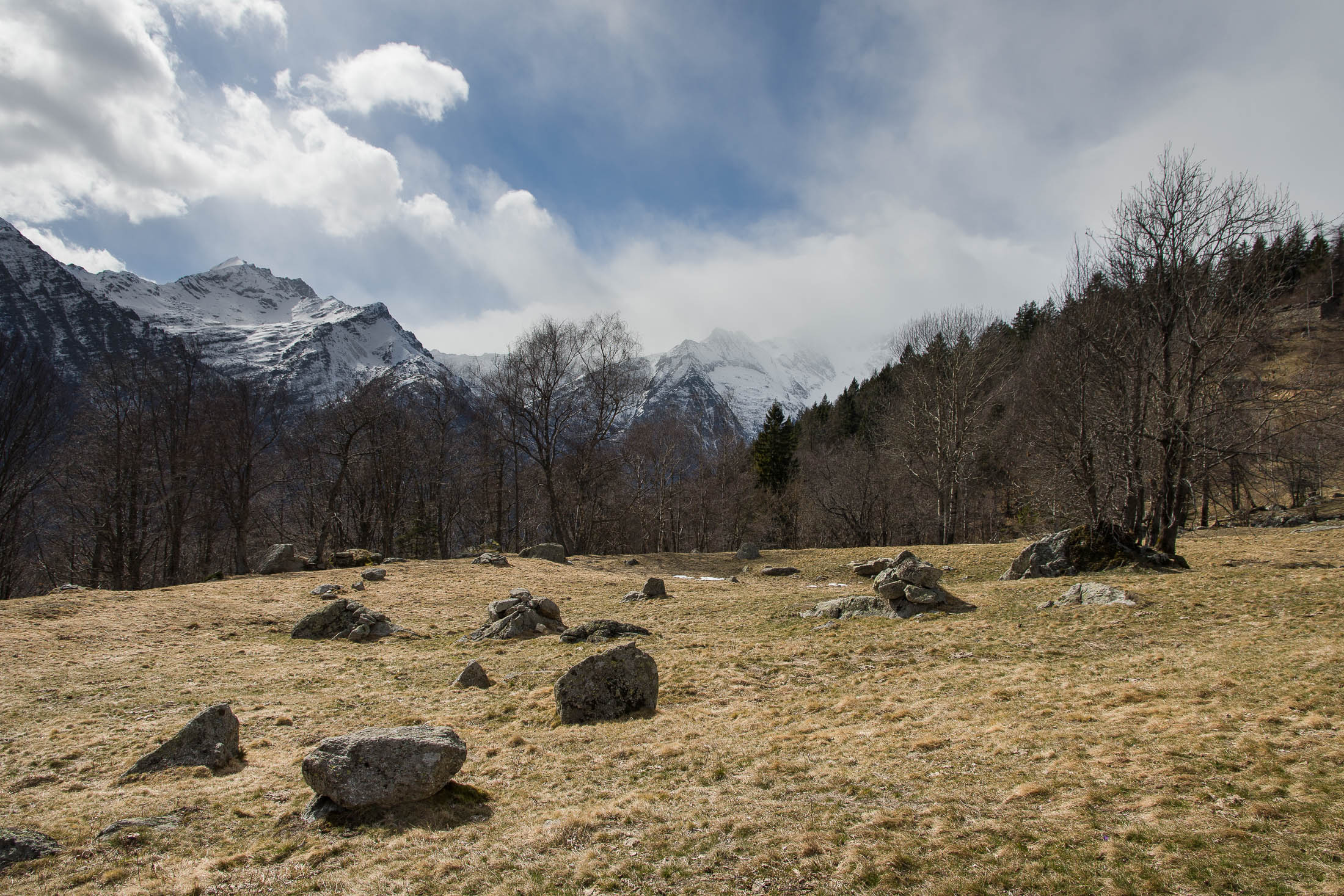 Weiter oben wird es karger, die Gegend ist übersät von Steinen und Felsbrocken, die wunderschöne Mulattiera führt mitten hindurch, mal auf sorgfältig gepflasterten Abschnitten, mal auf kunstvoll angelegten Treppenstufen. Die Erbauer solcher Wege scheuten einst keine Mühe. Wie viele Kühe, Rinder, Schafe und Ziegen wurden über Generationen hier hinauf getrieben? Dann wird es auf einmal flacher, wenige Minuten später ändert sich die Landschaft schlagartig. Man blickt über eine weite Hochebene, vor einem der Pian delle Riane, ein riesiger grüner Teppich in einem gewaltigen Talkessel. Eine kleine und friedliche Welt für sich, auf den Bergwiesen blühen Veilchen und Schlangen-Knöterich, ansonsten sagen sich hier Hase und Igel gute Nacht. Langweilig kommt jedoch nicht auf, hier kann man stundenlang verweilen. Es lohnt sich, die schöne Umgebung bei einem Spaziergang ein wenig näher zu erkunden, auf der Hochfläche befinden sich die verstreuten Hütten von Riane di sotto (1779 m) und Riane di sopra (1800 m), eine undeutliche Wegspur führt entlang des Rio Unghiasse zu den abseits gelegenen Ruinen von Giardonera und der Gias di Balme. Gelegentlich weiden hier oben im Frühsommer eine Herde Kühe und ein einige Pferde, diese werden jedoch im Verlauf des Sommers weiter in höhergelegene Alpgebiete getrieben.
