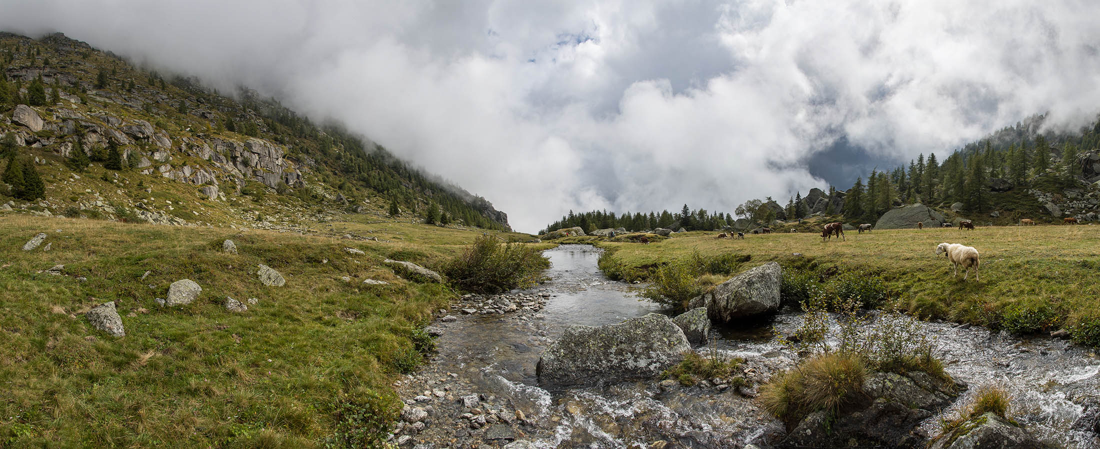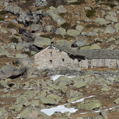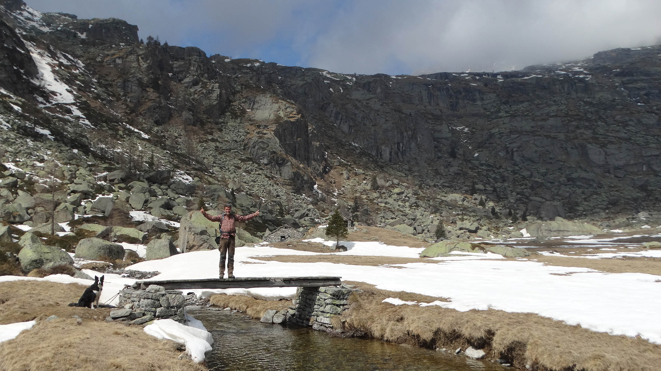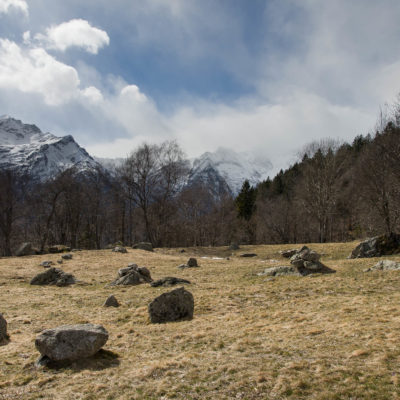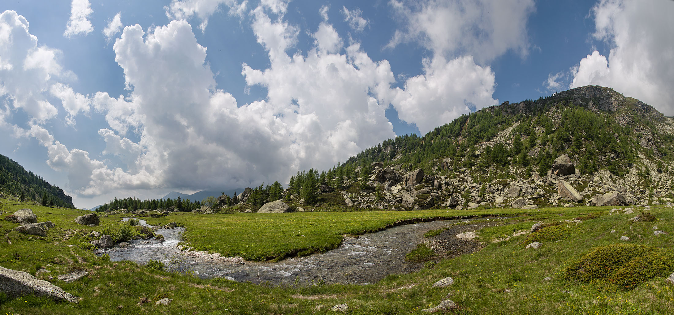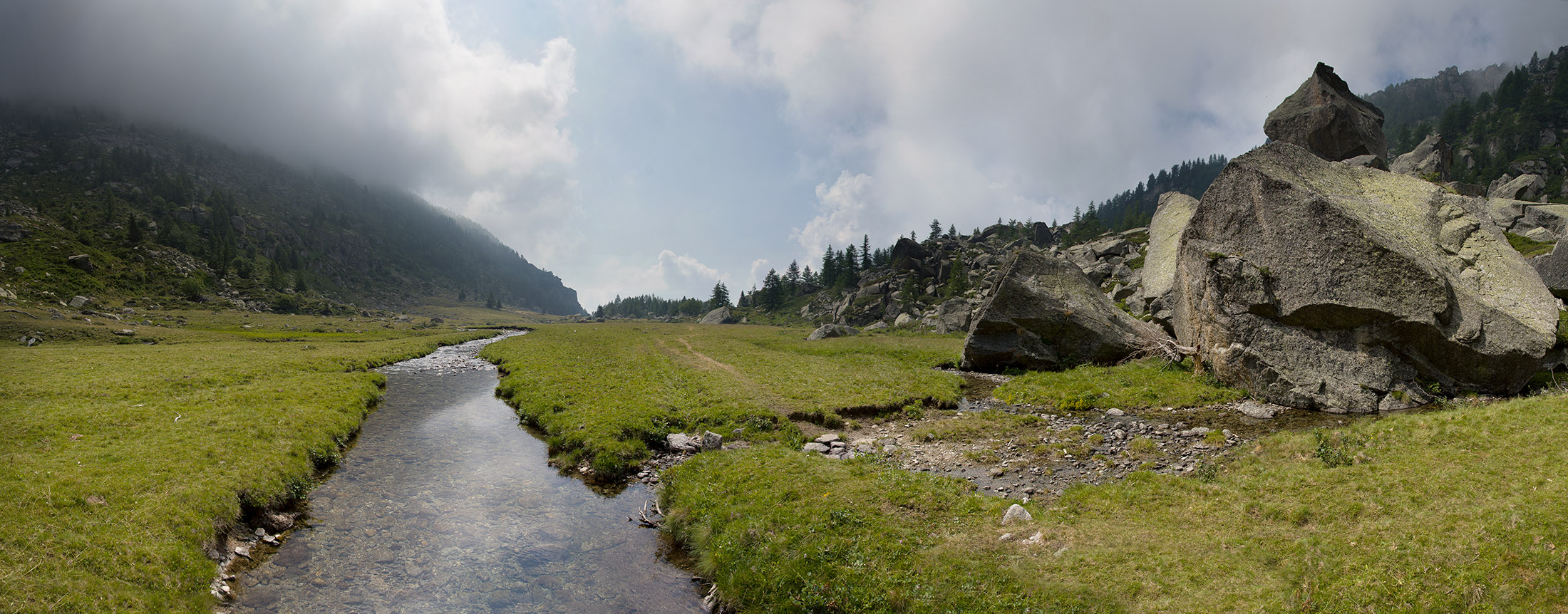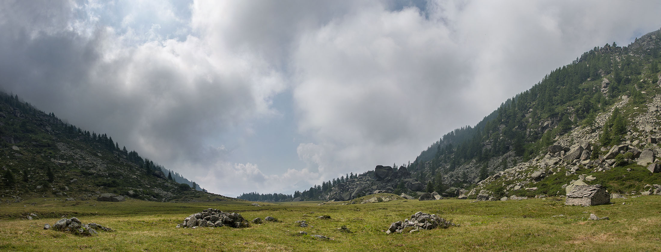 Weiter oben wird es karger, die Gegend ist übersät von Steinen und Felsbrocken, die wunderschöne Mulattiera führt mitten hindurch, mal auf sorgfältig gepflasterten Abschnitten, mal auf kunstvoll angelegten Treppenstufen. Die Erbauer solcher Wege scheuten einst keine Mühe. Wie viele Kühe, Rinder, Schafe und Ziegen wurden über Generationen hier hinauf getrieben? Dann wird es auf einmal flacher, wenige Minuten später ändert sich die Landschaft schlagartig. Man blickt über eine weite Hochebene, vor einem der Pian delle Riane, ein riesiger grüner Teppich in einem gewaltigen Talkessel. Eine kleine und friedliche Welt für sich, auf den Bergwiesen blühen Veilchen und Schlangen-Knöterich, ansonsten sagen sich hier Hase und Igel gute Nacht. Langweilig kommt jedoch nicht auf, hier kann man stundenlang verweilen. Es lohnt sich, die schöne Umgebung bei einem Spaziergang ein wenig näher zu erkunden, auf der Hochfläche befinden sich die verstreuten Hütten von Riane di sotto (1779 m) und Riane di sopra (1800 m), eine undeutliche Wegspur führt entlang des Rio Unghiasse zu den abseits gelegenen Ruinen von Giardonera und der Gias di Balme. Gelegentlich weiden hier oben im Frühsommer eine Herde Kühe und ein einige Pferde, diese werden jedoch im Verlauf des Sommers weiter in höhergelegene Alpgebiete getrieben.