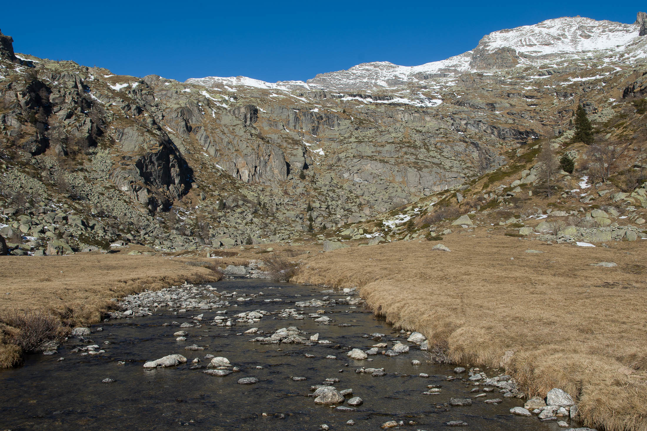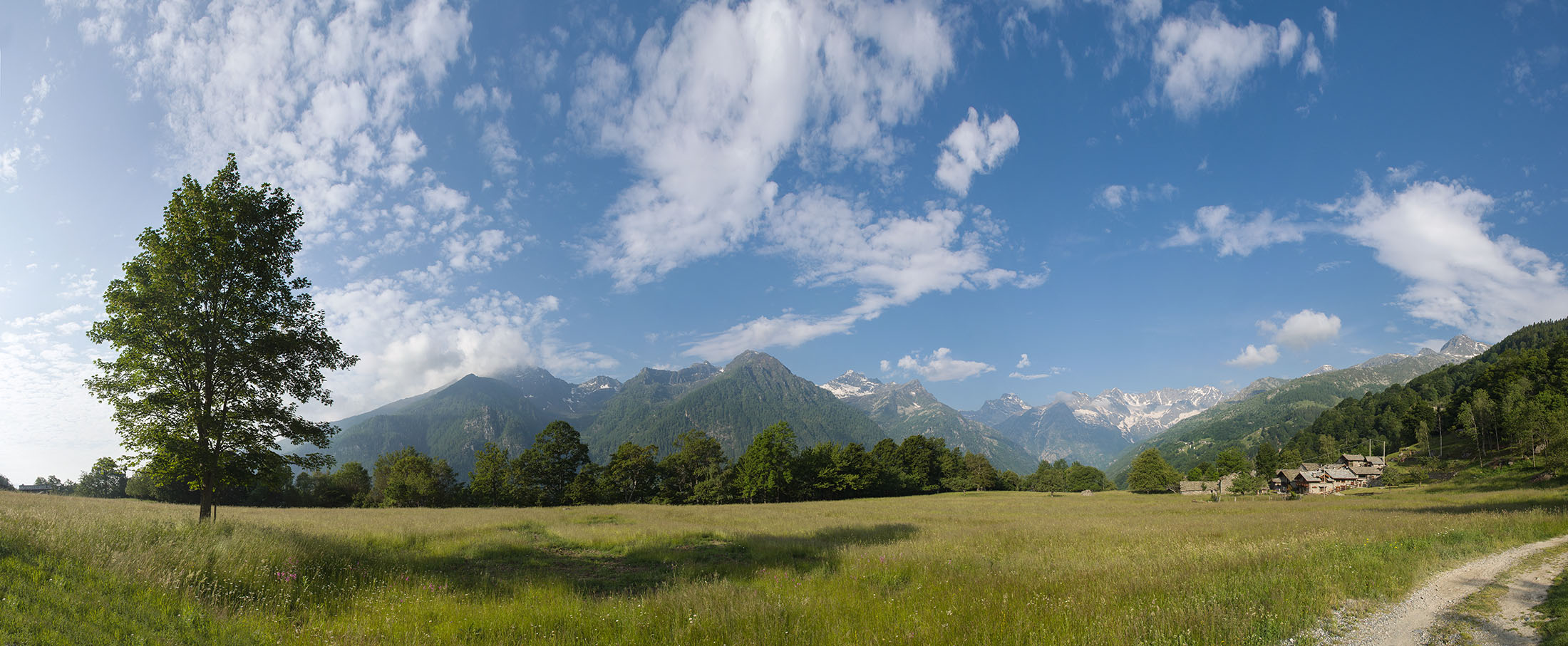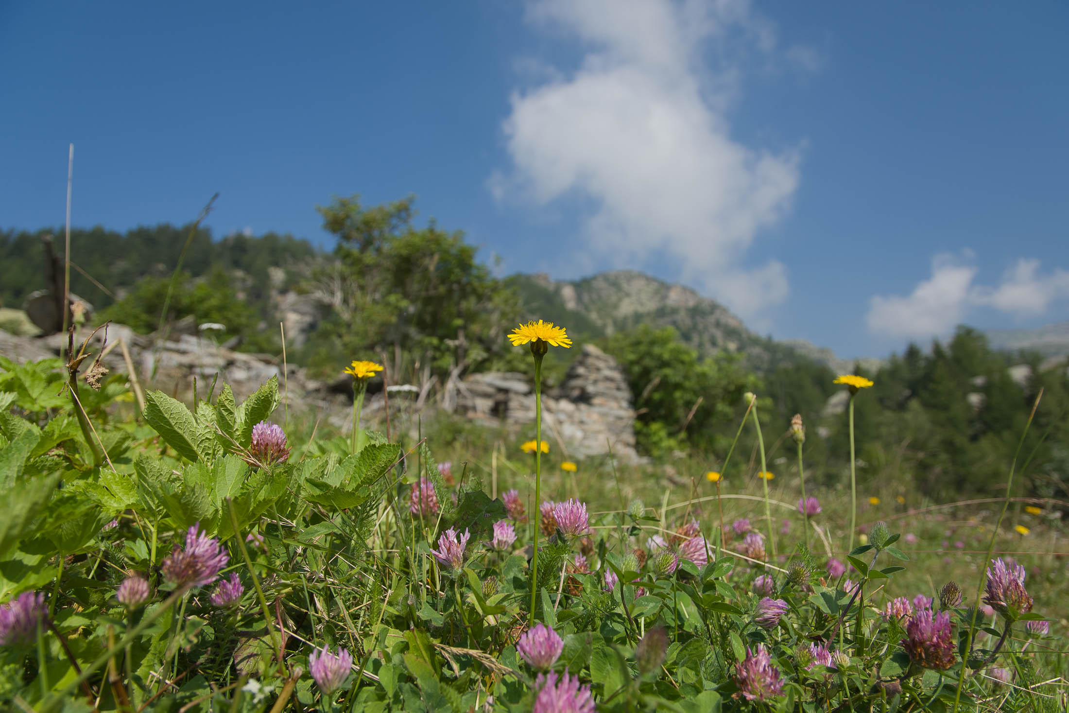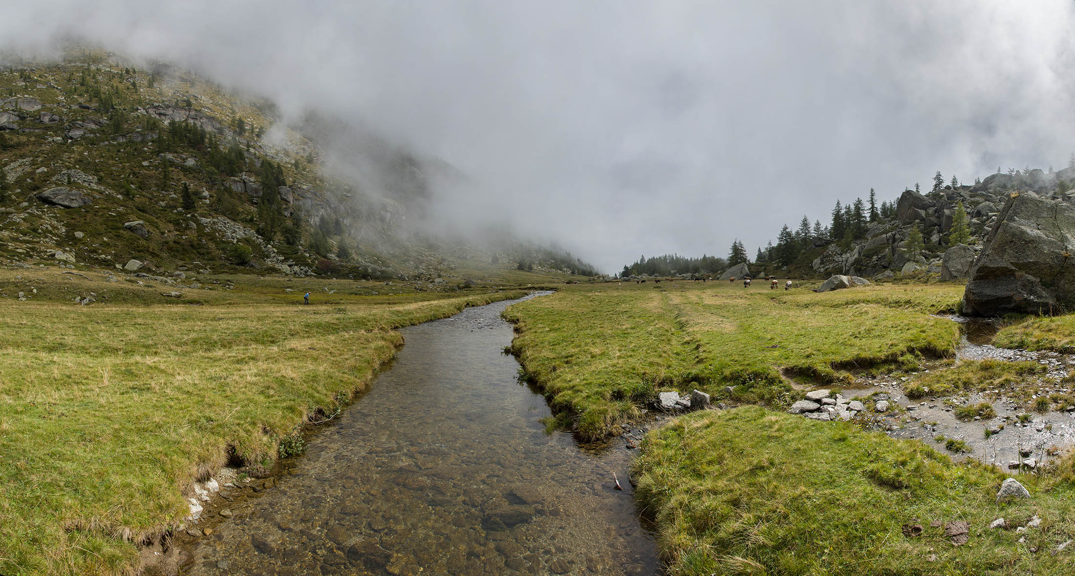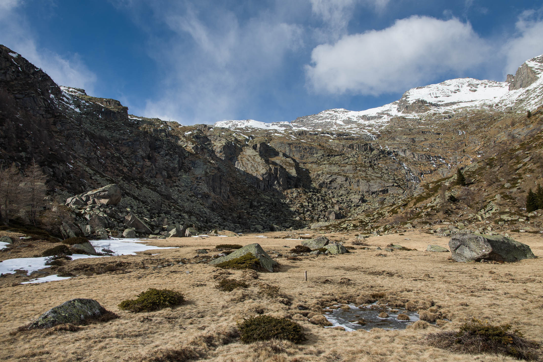 Weiter oben wird es karger, die Gegend ist übersät von Steinen und Felsbrocken, die wunderschöne Mulattiera führt mitten hindurch, mal auf sorgfältig gepflasterten Abschnitten, mal auf kunstvoll angelegten Treppenstufen. Die Erbauer solcher Wege scheuten einst keine Mühe. Wie viele Kühe, Rinder, Schafe und Ziegen wurden über Generationen hier hinauf getrieben? Dann wird es auf einmal flacher, wenige Minuten später ändert sich die Landschaft schlagartig. Man blickt über eine weite Hochebene, vor einem der Pian delle Riane, ein riesiger grüner Teppich in einem gewaltigen Talkessel. Eine kleine und friedliche Welt für sich, auf den Bergwiesen blühen Veilchen und Schlangen-Knöterich, ansonsten sagen sich hier Hase und Igel gute Nacht. Langweilig kommt jedoch nicht auf, hier kann man stundenlang verweilen. Es lohnt sich, die schöne Umgebung bei einem Spaziergang ein wenig näher zu erkunden, auf der Hochfläche befinden sich die verstreuten Hütten von Riane di sotto (1779 m) und Riane di sopra (1800 m), eine undeutliche Wegspur führt entlang des Rio Unghiasse zu den abseits gelegenen Ruinen von Giardonera und der Gias di Balme. Gelegentlich weiden hier oben im Frühsommer eine Herde Kühe und ein einige Pferde, diese werden jedoch im Verlauf des Sommers weiter in höhergelegene Alpgebiete getrieben.