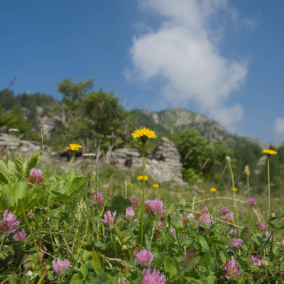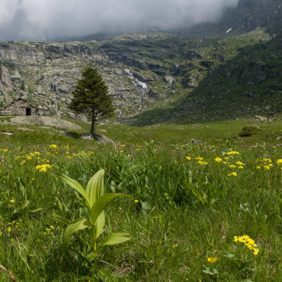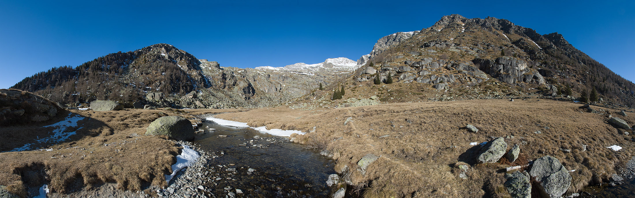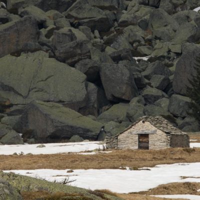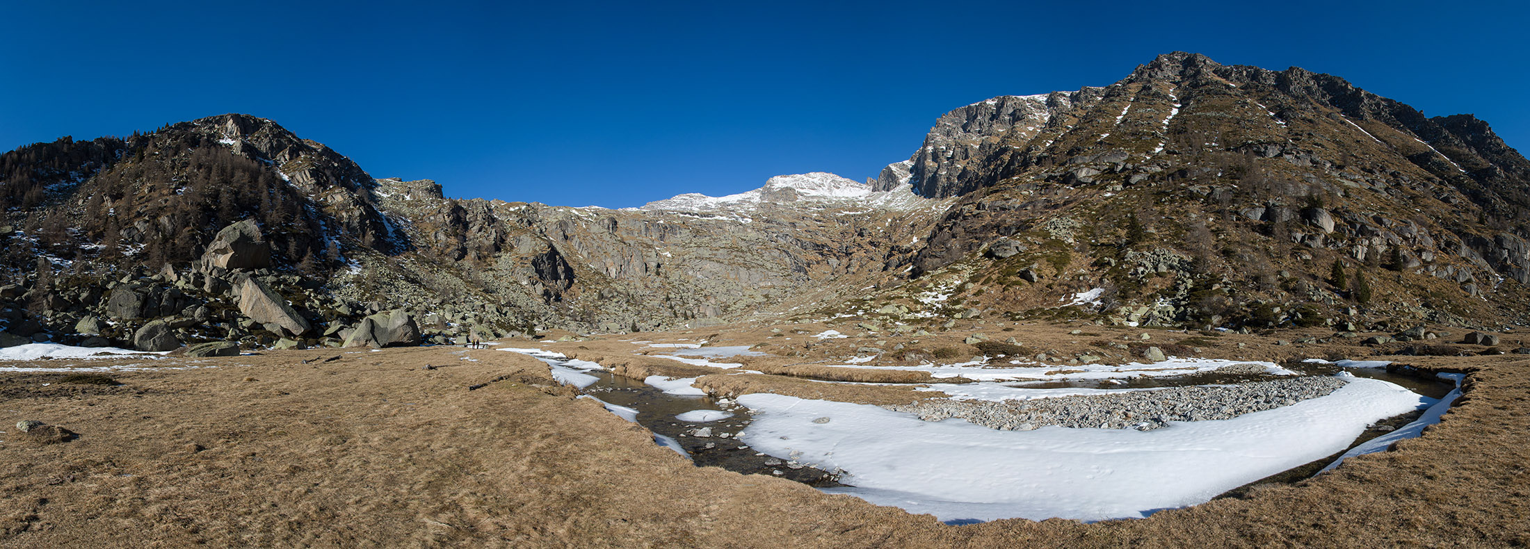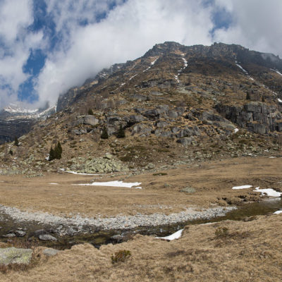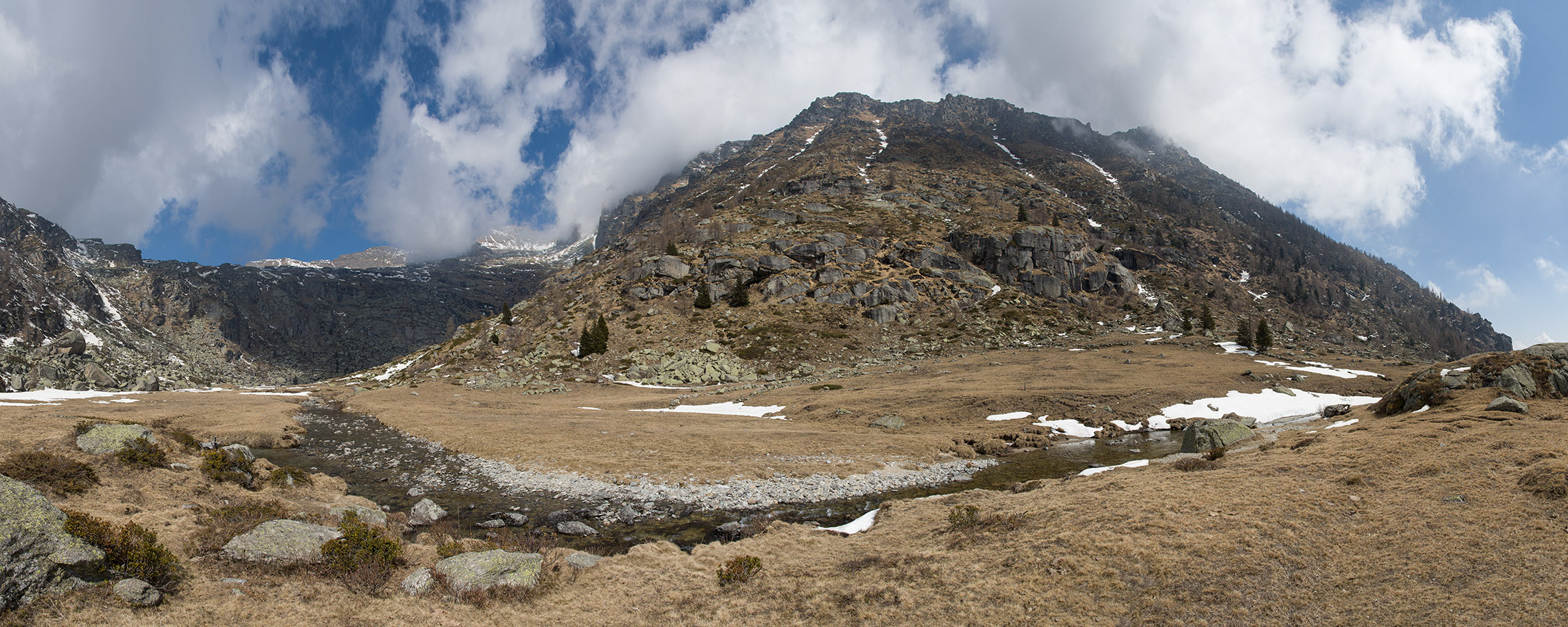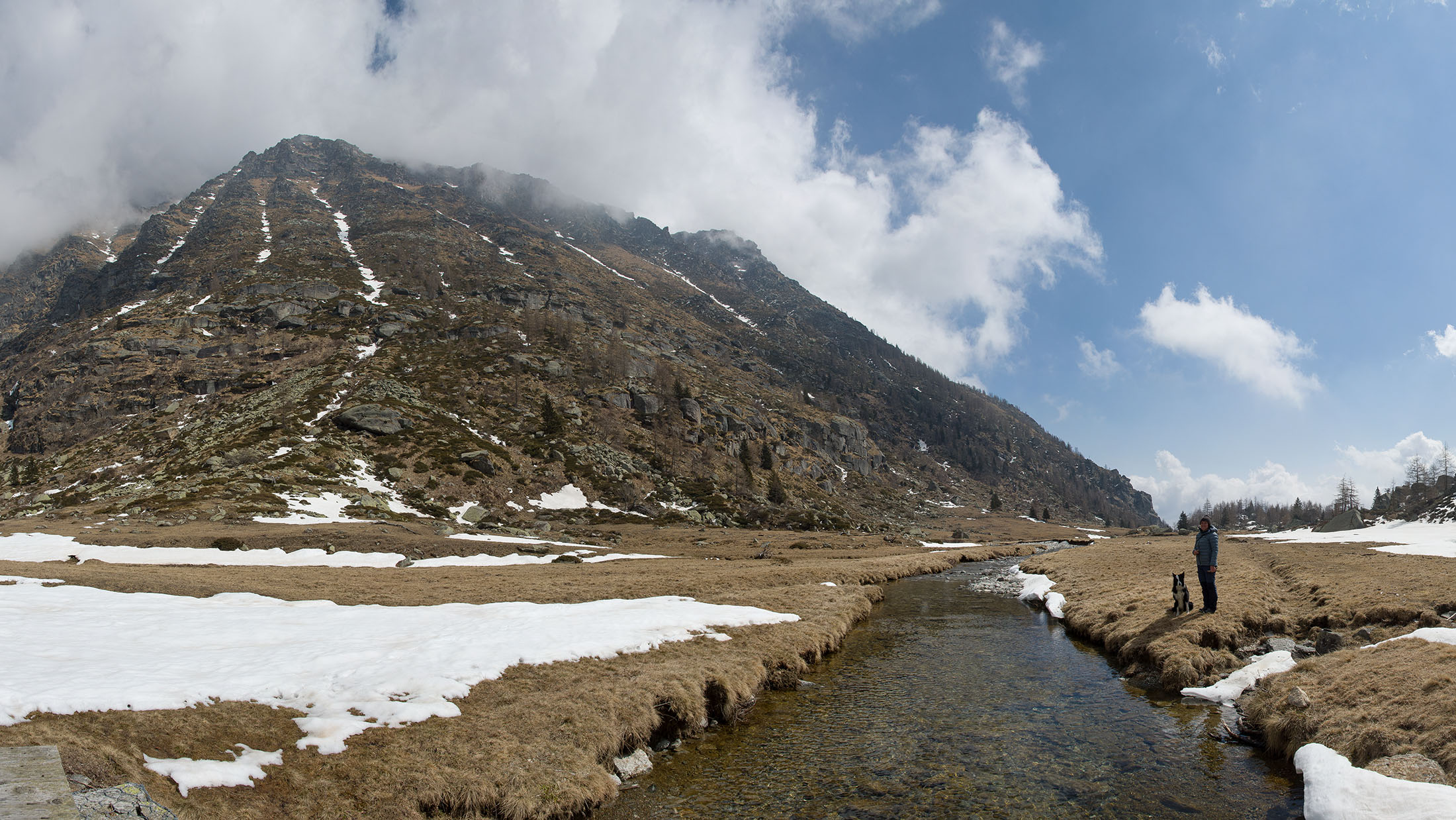 Weiter oben wird es karger, die Gegend ist übersät von Steinen und Felsbrocken, die wunderschöne Mulattiera führt mitten hindurch, mal auf sorgfältig gepflasterten Abschnitten, mal auf kunstvoll angelegten Treppenstufen. Die Erbauer solcher Wege scheuten einst keine Mühe. Wie viele Kühe, Rinder, Schafe und Ziegen wurden über Generationen hier hinauf getrieben? Dann wird es auf einmal flacher, wenige Minuten später ändert sich die Landschaft schlagartig. Man blickt über eine weite Hochebene, vor einem der Pian delle Riane, ein riesiger grüner Teppich in einem gewaltigen Talkessel. Eine kleine und friedliche Welt für sich, auf den Bergwiesen blühen Veilchen und Schlangen-Knöterich, ansonsten sagen sich hier Hase und Igel gute Nacht. Langweilig kommt jedoch nicht auf, hier kann man stundenlang verweilen. Es lohnt sich, die schöne Umgebung bei einem Spaziergang ein wenig näher zu erkunden, auf der Hochfläche befinden sich die verstreuten Hütten von Riane di sotto (1779 m) und Riane di sopra (1800 m), eine undeutliche Wegspur führt entlang des Rio Unghiasse zu den abseits gelegenen Ruinen von Giardonera und der Gias di Balme. Gelegentlich weiden hier oben im Frühsommer eine Herde Kühe und ein einige Pferde, diese werden jedoch im Verlauf des Sommers weiter in höhergelegene Alpgebiete getrieben.