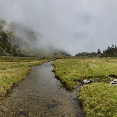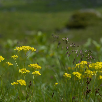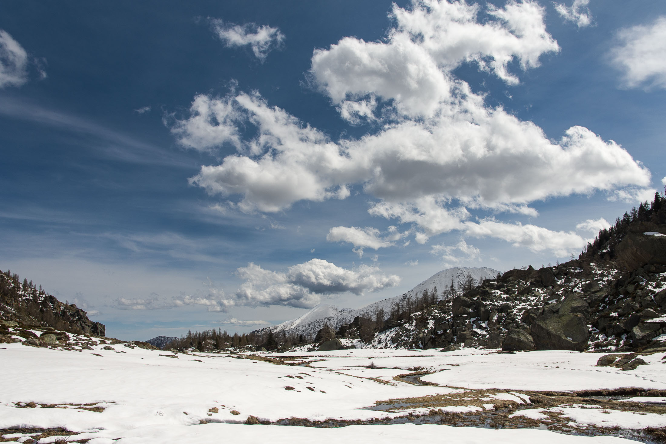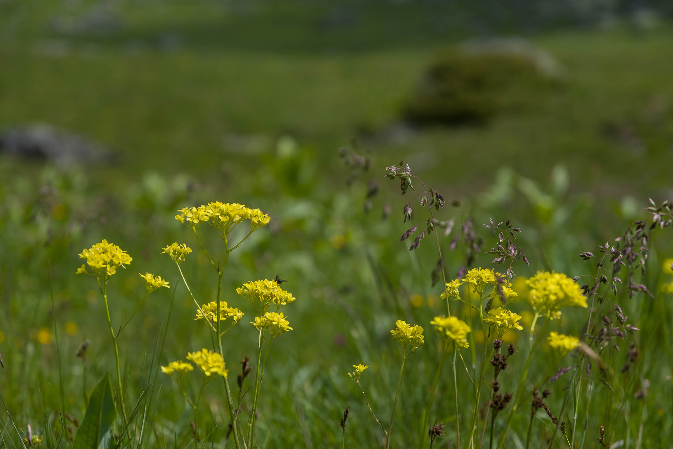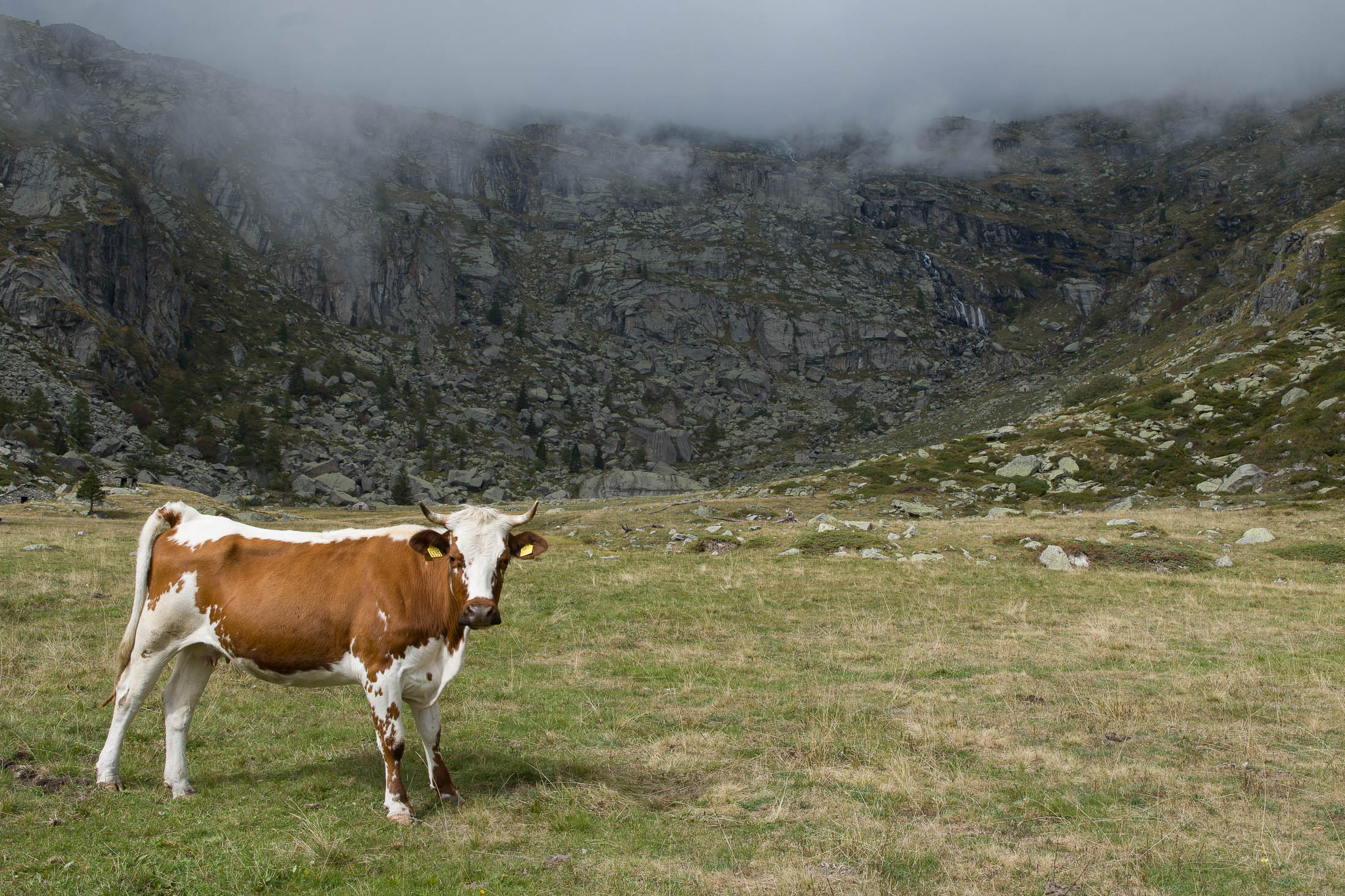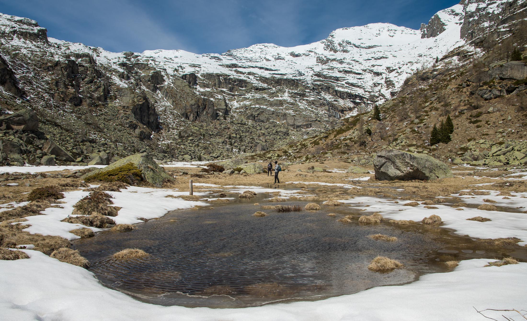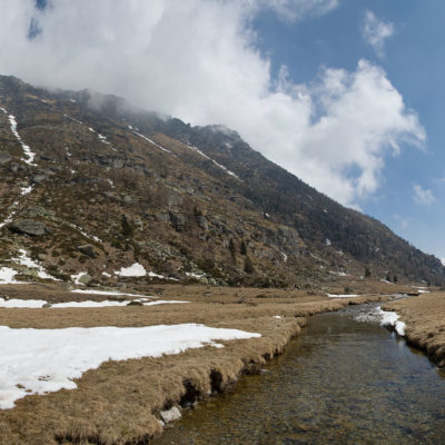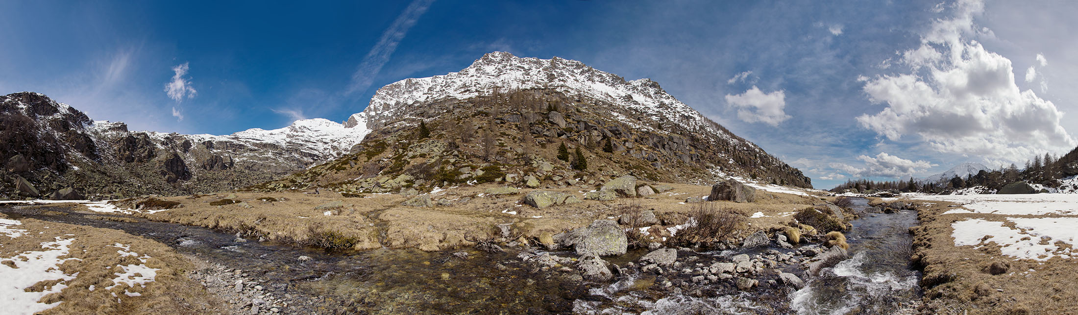 Weiter oben wird es karger, die Gegend ist übersät von Steinen und Felsbrocken, die wunderschöne Mulattiera führt mitten hindurch, mal auf sorgfältig gepflasterten Abschnitten, mal auf kunstvoll angelegten Treppenstufen. Die Erbauer solcher Wege scheuten einst keine Mühe. Wie viele Kühe, Rinder, Schafe und Ziegen wurden über Generationen hier hinauf getrieben? Dann wird es auf einmal flacher, wenige Minuten später ändert sich die Landschaft schlagartig. Man blickt über eine weite Hochebene, vor einem der Pian delle Riane, ein riesiger grüner Teppich in einem gewaltigen Talkessel. Eine kleine und friedliche Welt für sich, auf den Bergwiesen blühen Veilchen und Schlangen-Knöterich, ansonsten sagen sich hier Hase und Igel gute Nacht. Langweilig kommt jedoch nicht auf, hier kann man stundenlang verweilen. Es lohnt sich, die schöne Umgebung bei einem Spaziergang ein wenig näher zu erkunden, auf der Hochfläche befinden sich die verstreuten Hütten von Riane di sotto (1779 m) und Riane di sopra (1800 m), eine undeutliche Wegspur führt entlang des Rio Unghiasse zu den abseits gelegenen Ruinen von Giardonera und der Gias di Balme. Gelegentlich weiden hier oben im Frühsommer eine Herde Kühe und ein einige Pferde, diese werden jedoch im Verlauf des Sommers weiter in höhergelegene Alpgebiete getrieben.