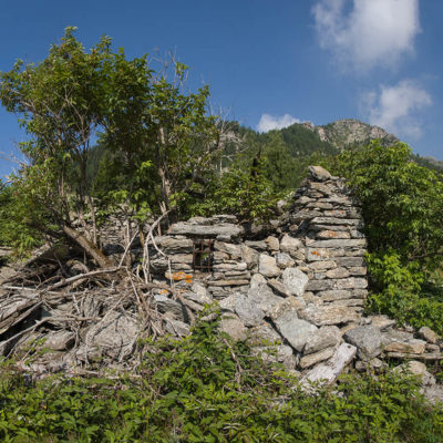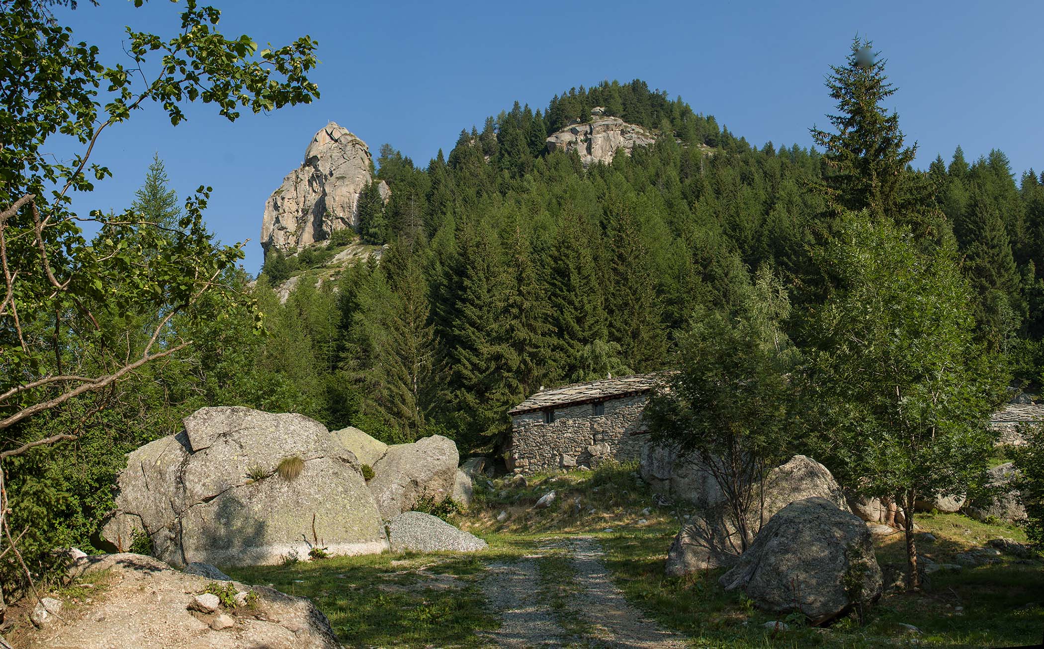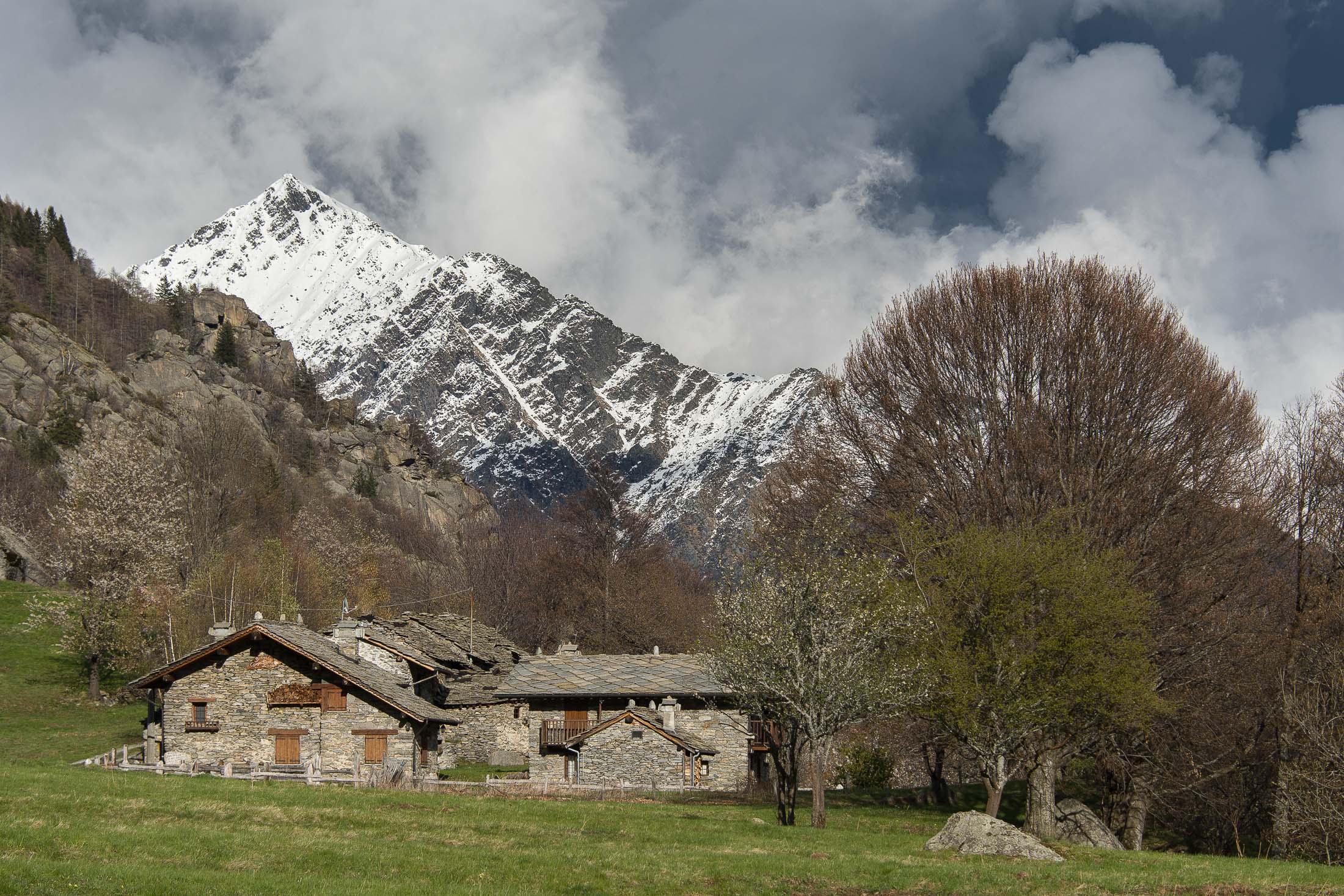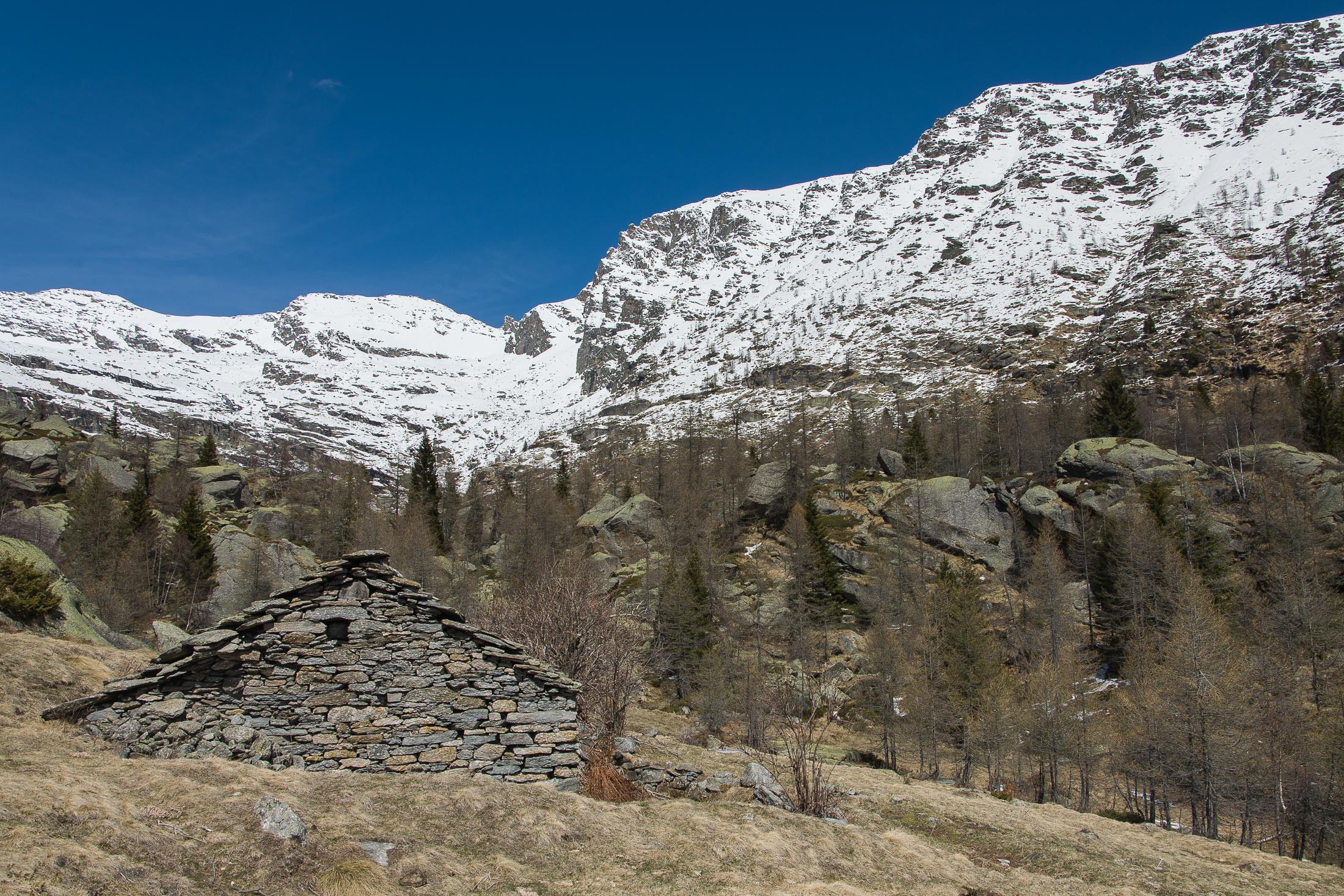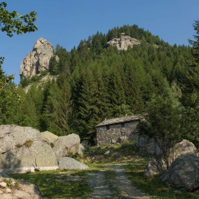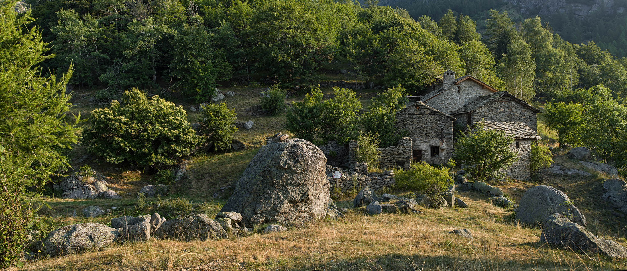Nach all den vielen schönen Eindrücken steigt man zunächst auf dem Aufstiegsweg nach Vaccheria (1630 m) ab. Von dort in 20 Minuten auf dem unbefestigten Alpsträsschen durch den Wald hinab nach Mea (1526 m), ein zusammengewürfelter steinerner Häuserhaufen auf einem aussichtsreichen Geländerücken über dem Val Grande di Lanzo, unmittelbar am Fuss des markanten Felsgipfels Bec di Mea (1546 m). Gelegentlich beobachtet man hier Kletterfreaks, wie sie über den schwindelerregenden Abgründen in ihren Seilen hängen. Was für eine verträumte Kulisse, malerisch schön, im Westen erhebt sich der gewaltige Steilabfall des Alpenhauptkamms über dem Tal, von der Uja di Ciamarella (3676 m) bis zur Levanna Orientale (3555 m). Auffällig sind die vielen verwilderten Ackerbauterrassen, die sich bis weit in die angrenzenden Berghänge hinaufziehen und einst mühsam angelegt und bewirtschaftet wurden. Die Umgebung von Mea war früher waldfrei, die gerodeten Flächen wurden als Weiden genutzt, nach der weitgehenden Einstellung der Land- und Alpwirtschaft schreitet die Verbuschung und die darauffolgende Wiederbewaldung der Landschaft seit vielen Jahrzehnten unaufhaltsam voran.