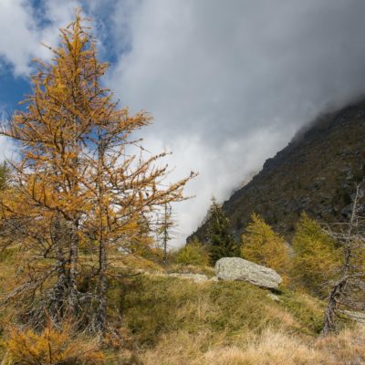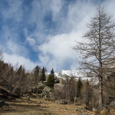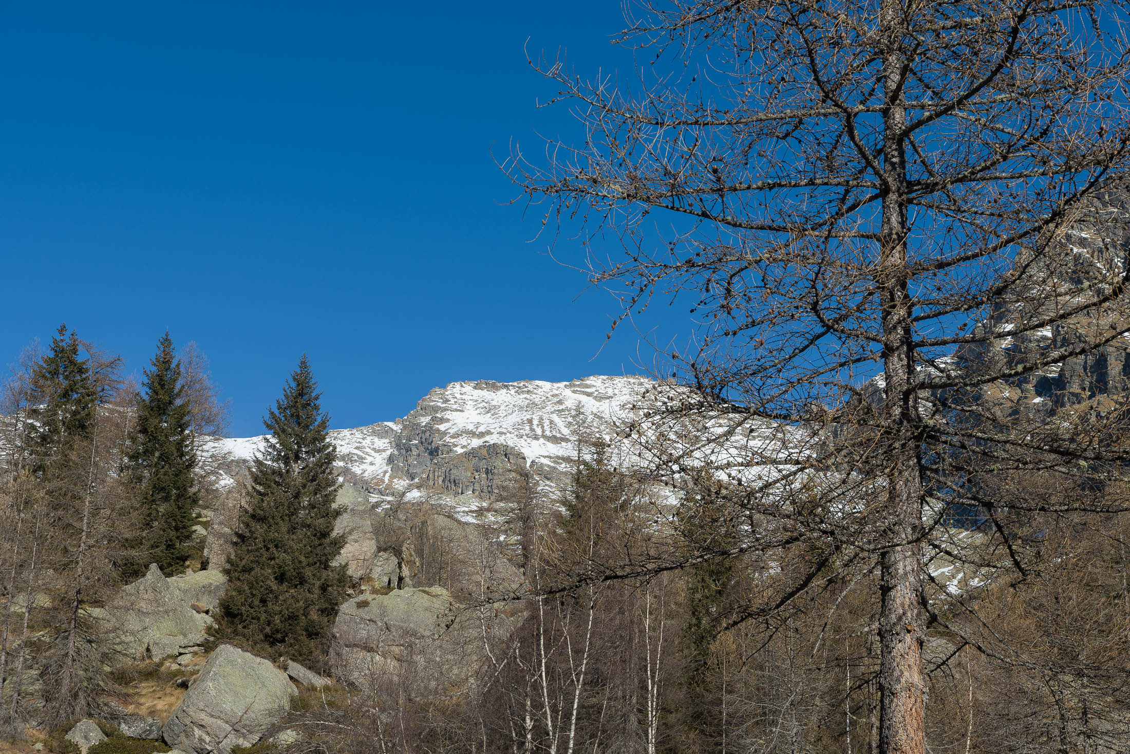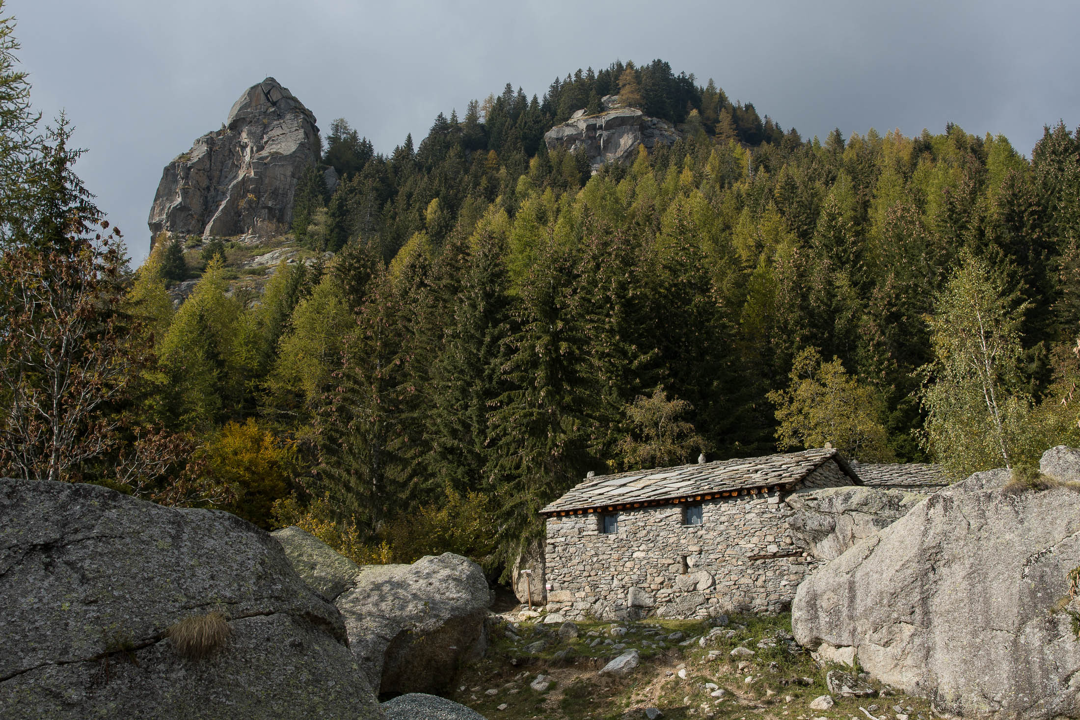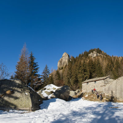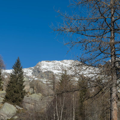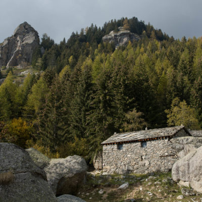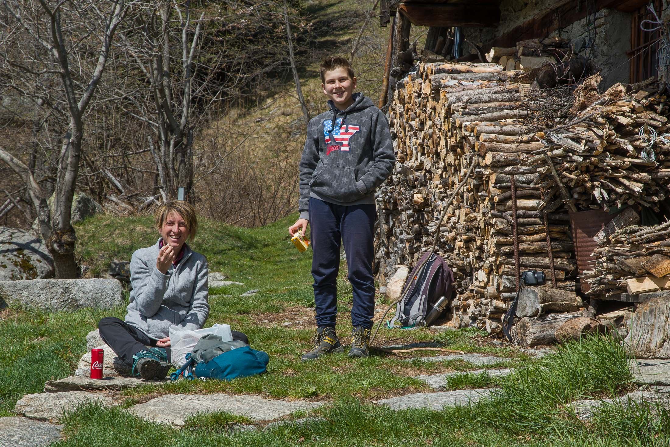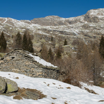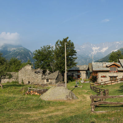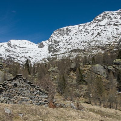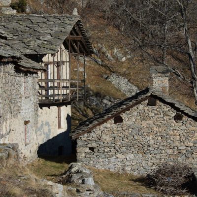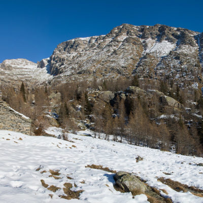 Nach all den vielen schönen Eindrücken steigt man zunächst auf dem Aufstiegsweg nach Vaccheria (1630 m) ab. Von dort in 20 Minuten auf dem unbefestigten Alpsträsschen durch den Wald hinab nach Mea (1526 m), ein zusammengewürfelter steinerner Häuserhaufen auf einem aussichtsreichen Geländerücken über dem Val Grande di Lanzo, unmittelbar am Fuss des markanten Felsgipfels Bec di Mea (1546 m). Gelegentlich beobachtet man hier Kletterfreaks, wie sie über den schwindelerregenden Abgründen in ihren Seilen hängen. Was für eine verträumte Kulisse, malerisch schön, im Westen erhebt sich der gewaltige Steilabfall des Alpenhauptkamms über dem Tal, von der Uja di Ciamarella (3676 m) bis zur Levanna Orientale (3555 m). Auffällig sind die vielen verwilderten Ackerbauterrassen, die sich bis weit in die angrenzenden Berghänge hinaufziehen und einst mühsam angelegt und bewirtschaftet wurden. Die Umgebung von Mea war früher waldfrei, die gerodeten Flächen wurden als Weiden genutzt, nach der weitgehenden Einstellung der Land- und Alpwirtschaft schreitet die Verbuschung und die darauffolgende Wiederbewaldung der Landschaft seit vielen Jahrzehnten unaufhaltsam voran.