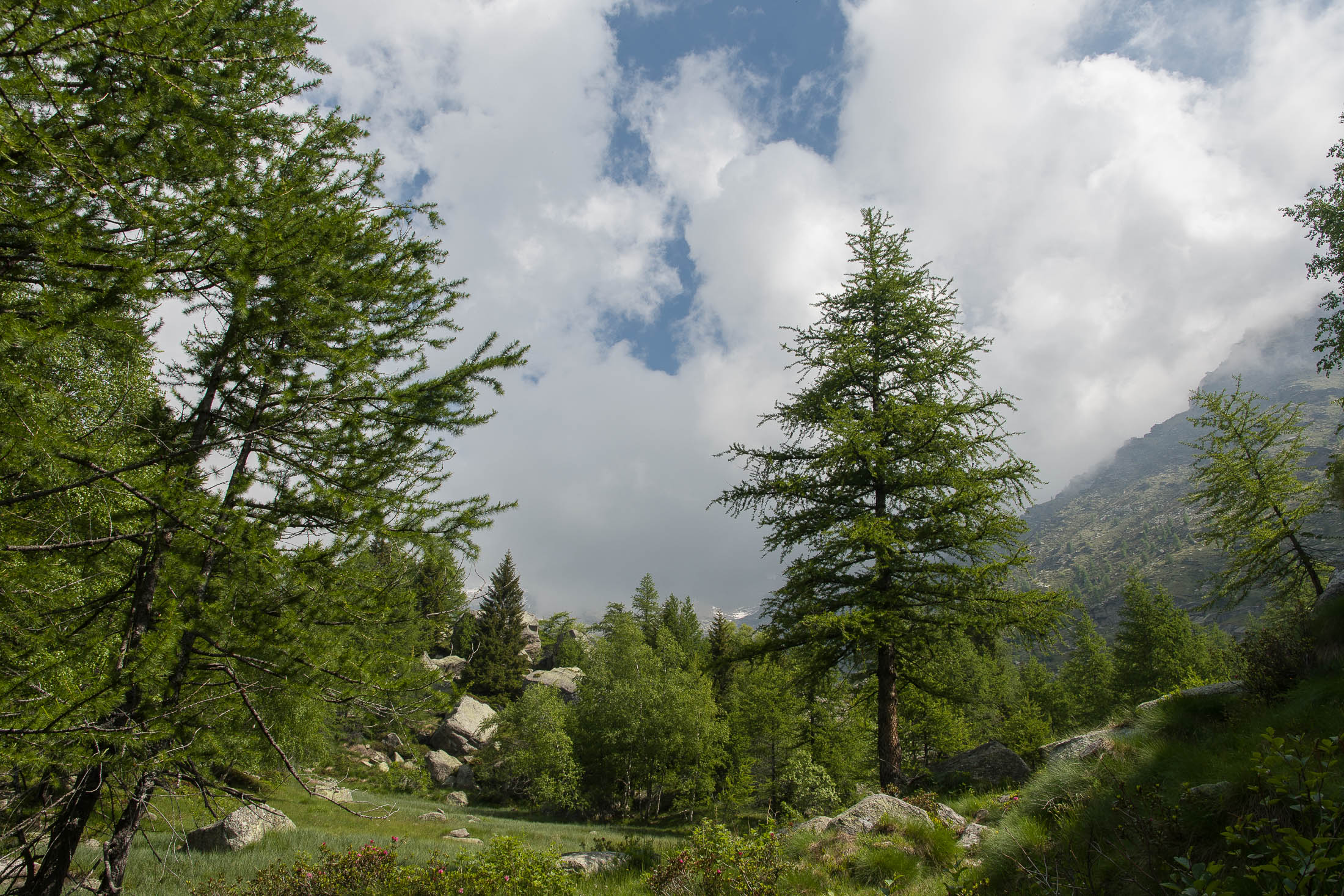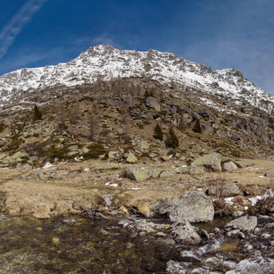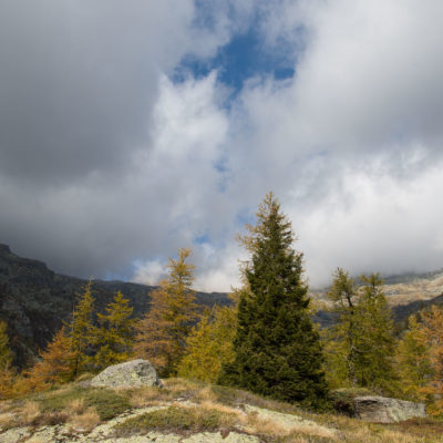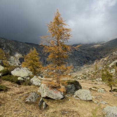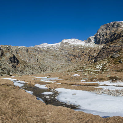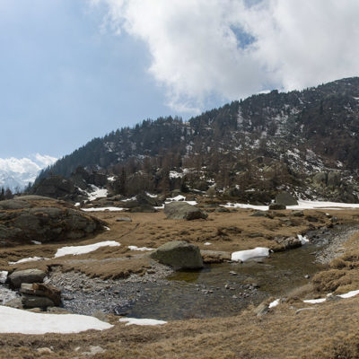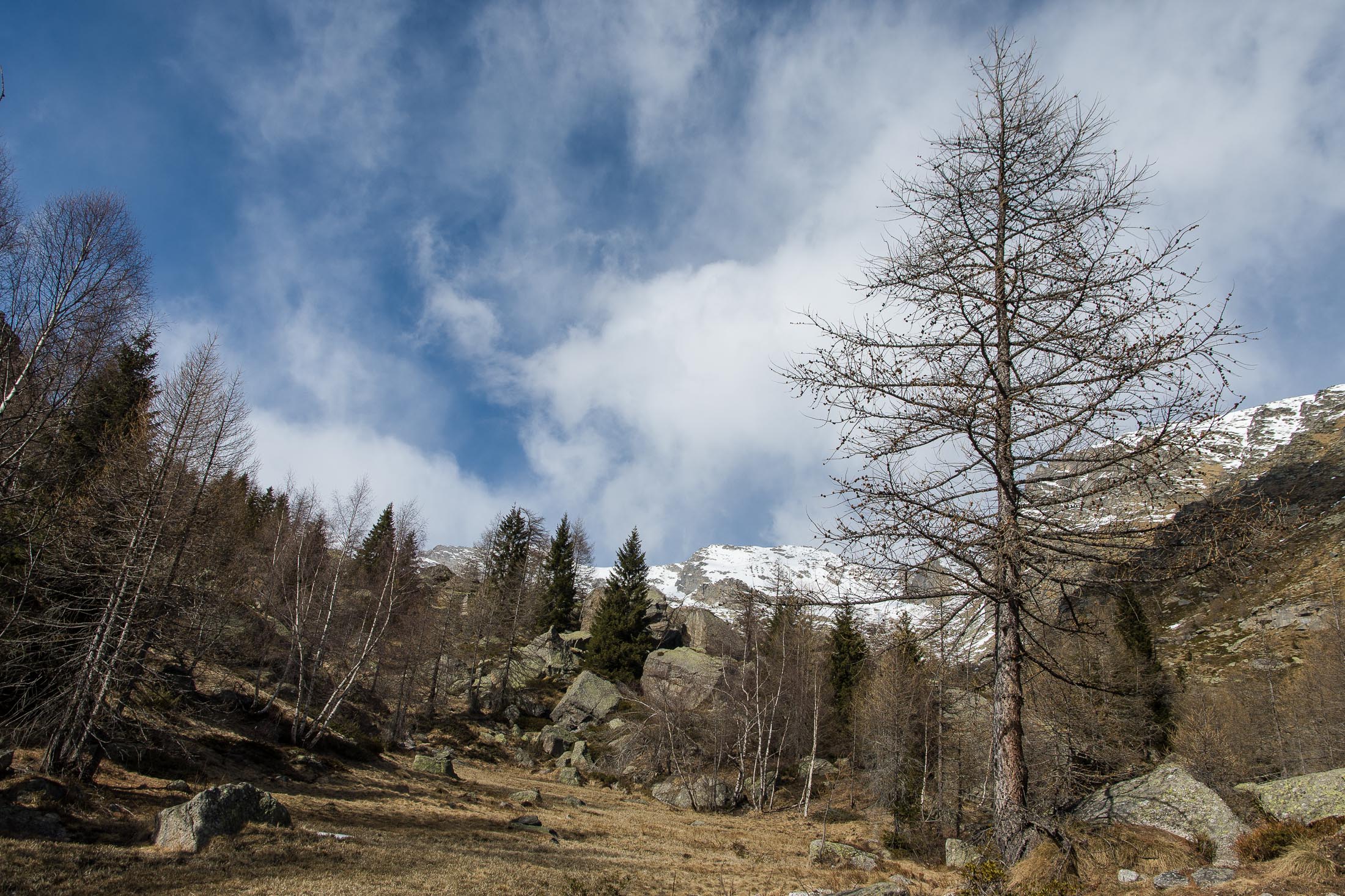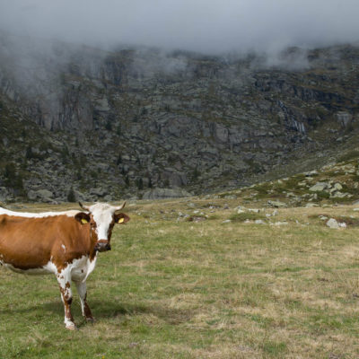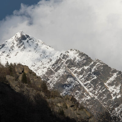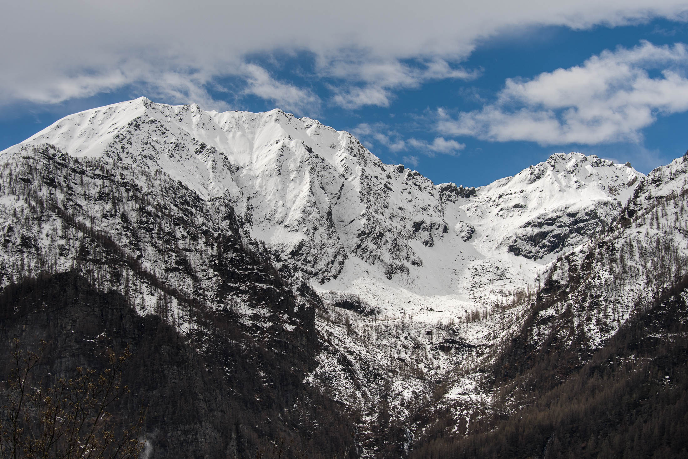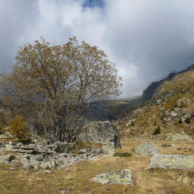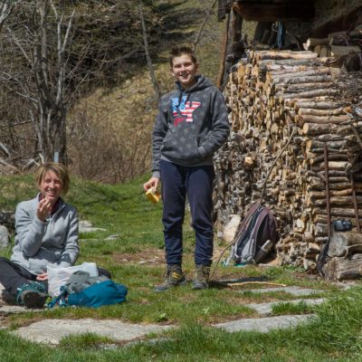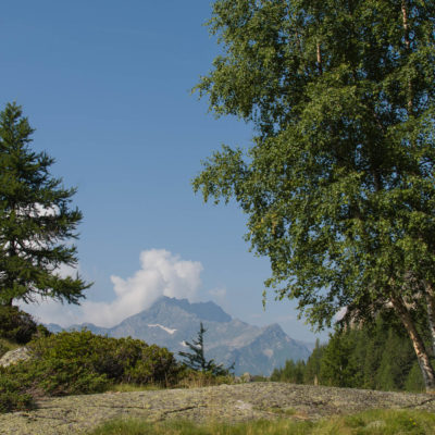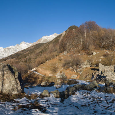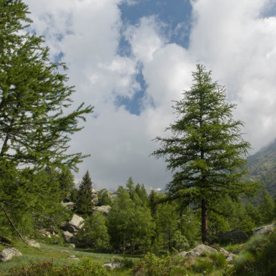 Nach all den vielen schönen Eindrücken steigt man zunächst auf dem Aufstiegsweg nach Vaccheria (1630 m) ab. Von dort in 20 Minuten auf dem unbefestigten Alpsträsschen durch den Wald hinab nach Mea (1526 m), ein zusammengewürfelter steinerner Häuserhaufen auf einem aussichtsreichen Geländerücken über dem Val Grande di Lanzo, unmittelbar am Fuss des markanten Felsgipfels Bec di Mea (1546 m). Gelegentlich beobachtet man hier Kletterfreaks, wie sie über den schwindelerregenden Abgründen in ihren Seilen hängen. Was für eine verträumte Kulisse, malerisch schön, im Westen erhebt sich der gewaltige Steilabfall des Alpenhauptkamms über dem Tal, von der Uja di Ciamarella (3676 m) bis zur Levanna Orientale (3555 m). Auffällig sind die vielen verwilderten Ackerbauterrassen, die sich bis weit in die angrenzenden Berghänge hinaufziehen und einst mühsam angelegt und bewirtschaftet wurden. Die Umgebung von Mea war früher waldfrei, die gerodeten Flächen wurden als Weiden genutzt, nach der weitgehenden Einstellung der Land- und Alpwirtschaft schreitet die Verbuschung und die darauffolgende Wiederbewaldung der Landschaft seit vielen Jahrzehnten unaufhaltsam voran.