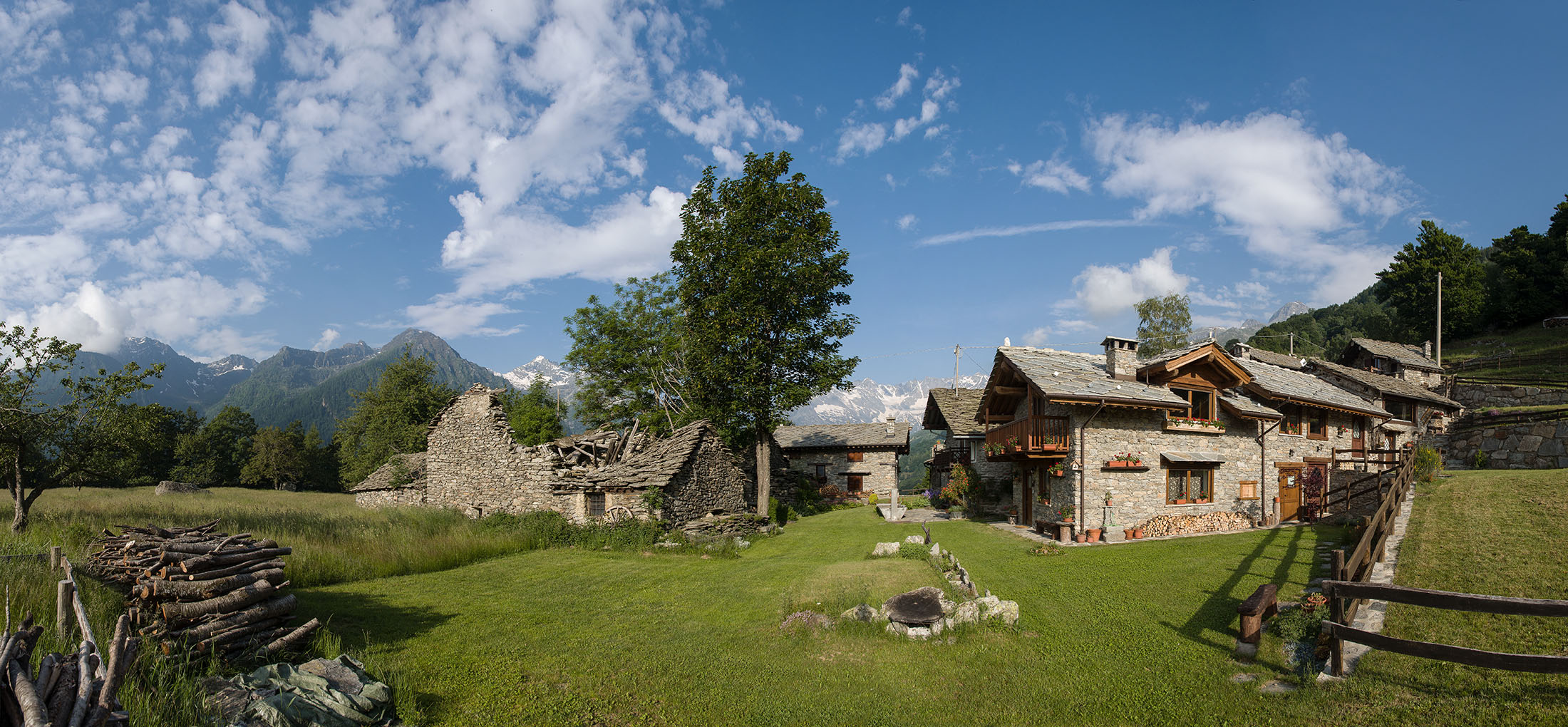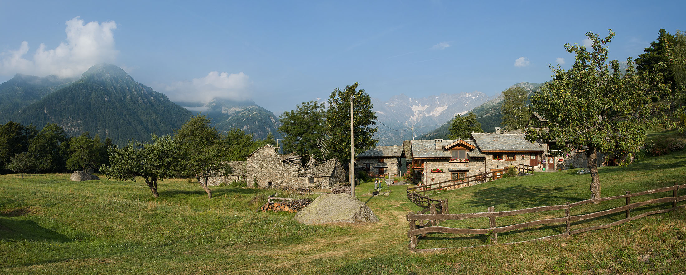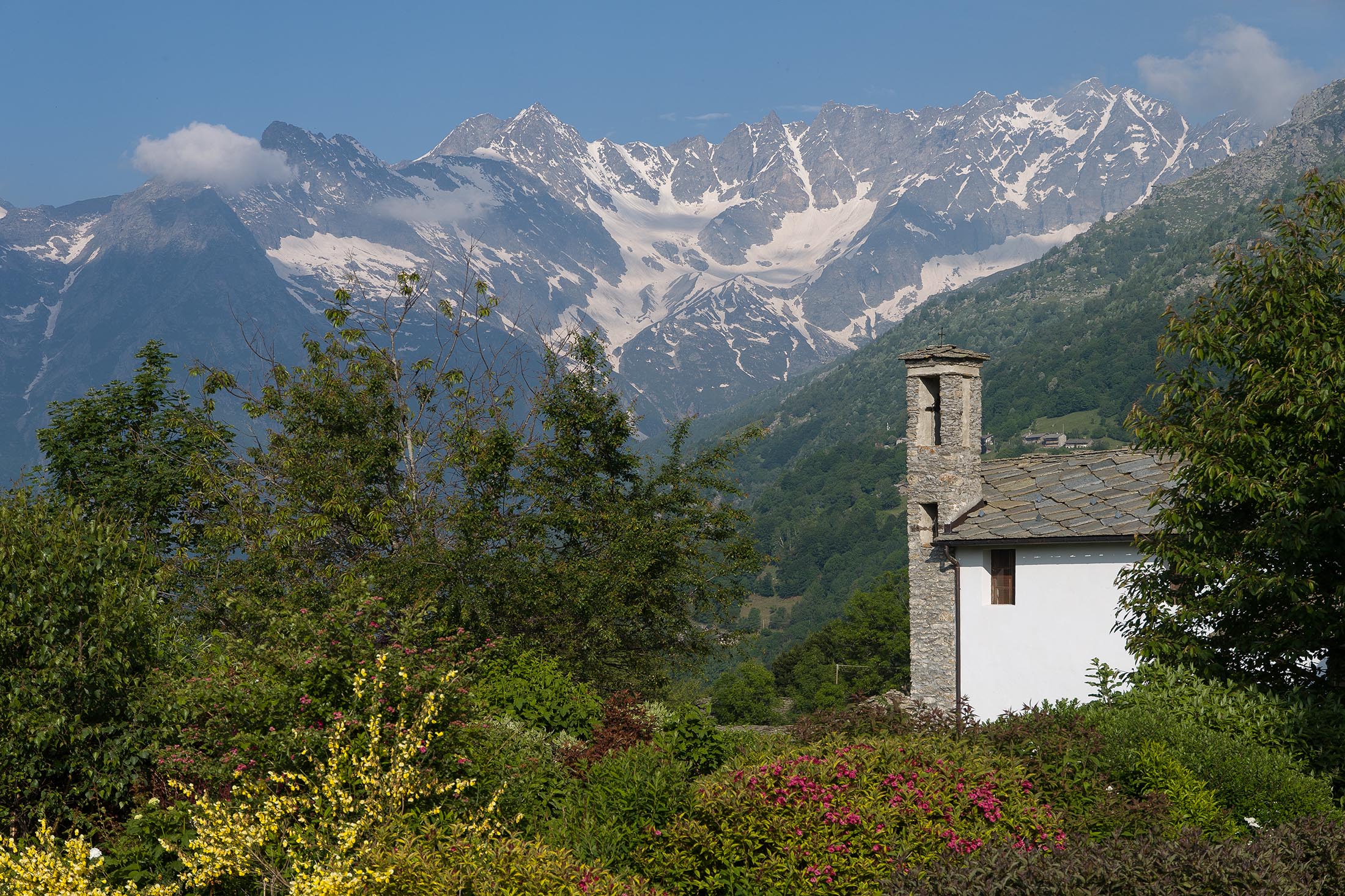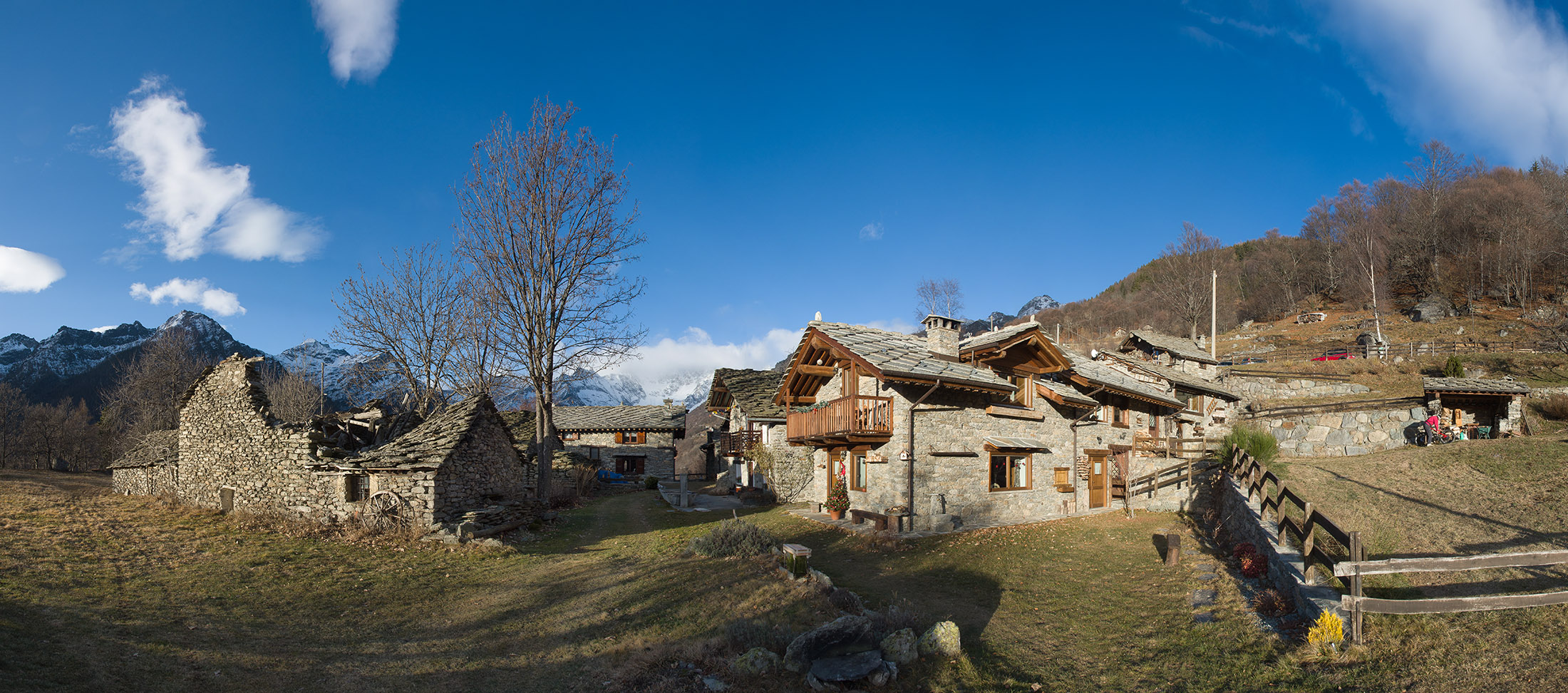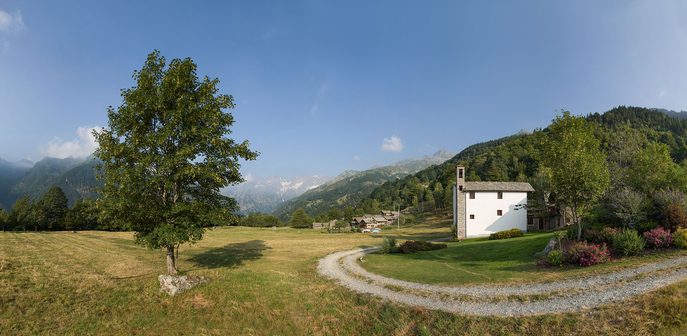 Schon der Ausgangspunkt ist bereits eine Reise wert. Alboni ist eine aus mehreren Häusergruppen bestehende Siedlung auf einer aussichtsreichen Hochfläche über dem Val Grande di Lanzo. Jeder Winkel ist hier aufgeräumt und gepflegt. Man blickt auf aufwendig und geschmackvoll renovierte Anwesen, manchenorts wurde viel Geld in die Hand genommen und keine Mühe gescheut. Und trotzdem ist kaum jemand zuhause, ausser am Samstag und Sonntag und in den italienischen Ferien. Alles nur Zweitwohnsitze. Schicksal oder Glück? Vielleicht beides. Alboni ist kein Einzelfall in den piemontesischen Alpen. Die schmale und serpentinenreiche Zufahrtsstrasse ist nicht wintersicher. Die nächste Stadt? 30 km auf kurvenreichen Strassen. Schnelles Internet? Gibts hier nicht. All das ist schon nicht mehr kompatibel mit dem heutigen modernen Alltagsleben, wo scheinbar alles auf Schnelligkeit und spontane Erreichbarkeit ausgerichtet ist. Das war nicht immer so. Alboni war bis in die 1950er Jahre ganzjährig bewohnt, in jedem Haus lebten zwei oder drei Generationen unter einem Dach, sonntags ging man gemeinsam zum Gottesdienst in die weissgekalkte Cappella di San Grato. Die Hänge in der näheren Umgebung waren gerodet und wurden in mühseliger Arbeit kultiviert. 50 bis 70 Jahre später sind diese Flächen vom Wald beschlagnahmt. Die Einstellung der traditionellen Berglandwirtschaft und die damit verbundene Abwanderung haben den Ort geleert, bis er eines Tages nahe zu verlassen war. Viele Häuser verfielen im Laufe der Zeit. In den 1990er Jahren begann eine Trendwende, Alboni wurde wiederentdeckt – und wiederaufgebaut. Heute blickt man auf ein Schmuckstück, ein liebenswerter Ort inmitten der Stille.