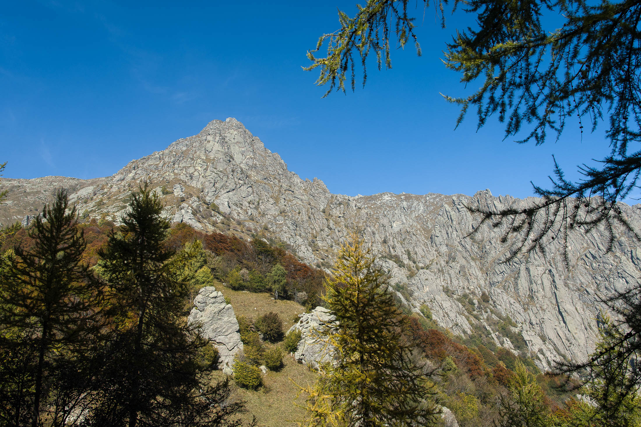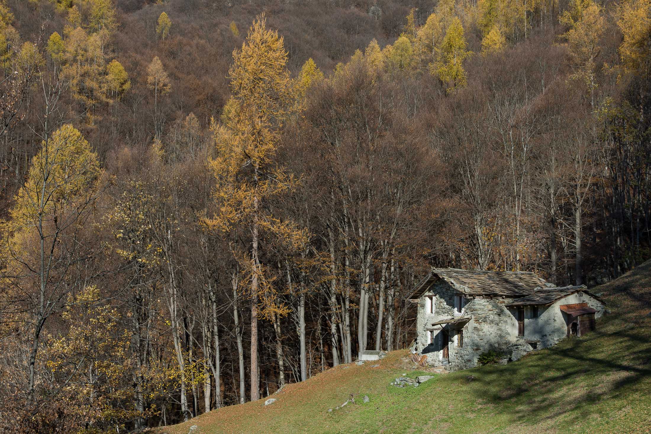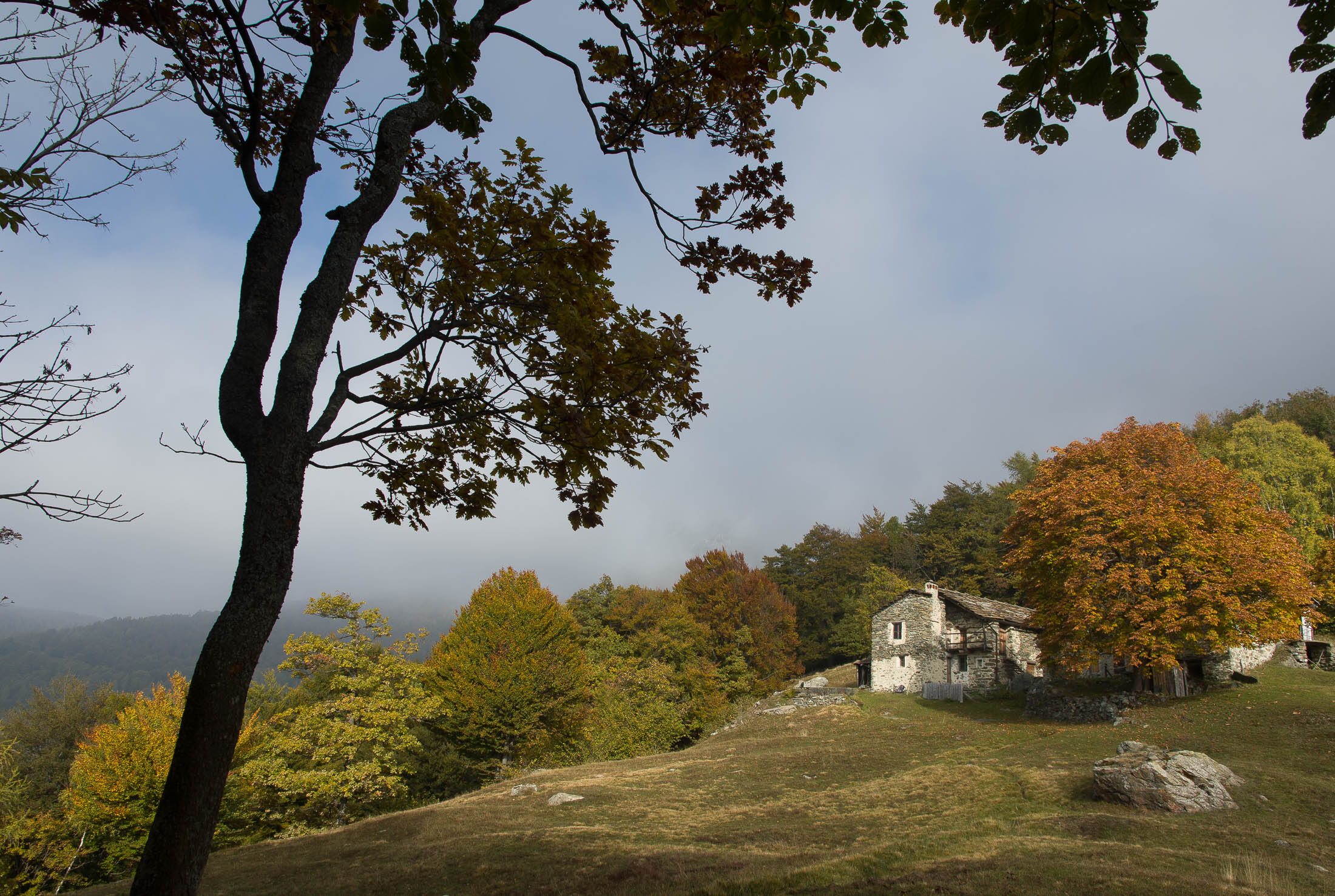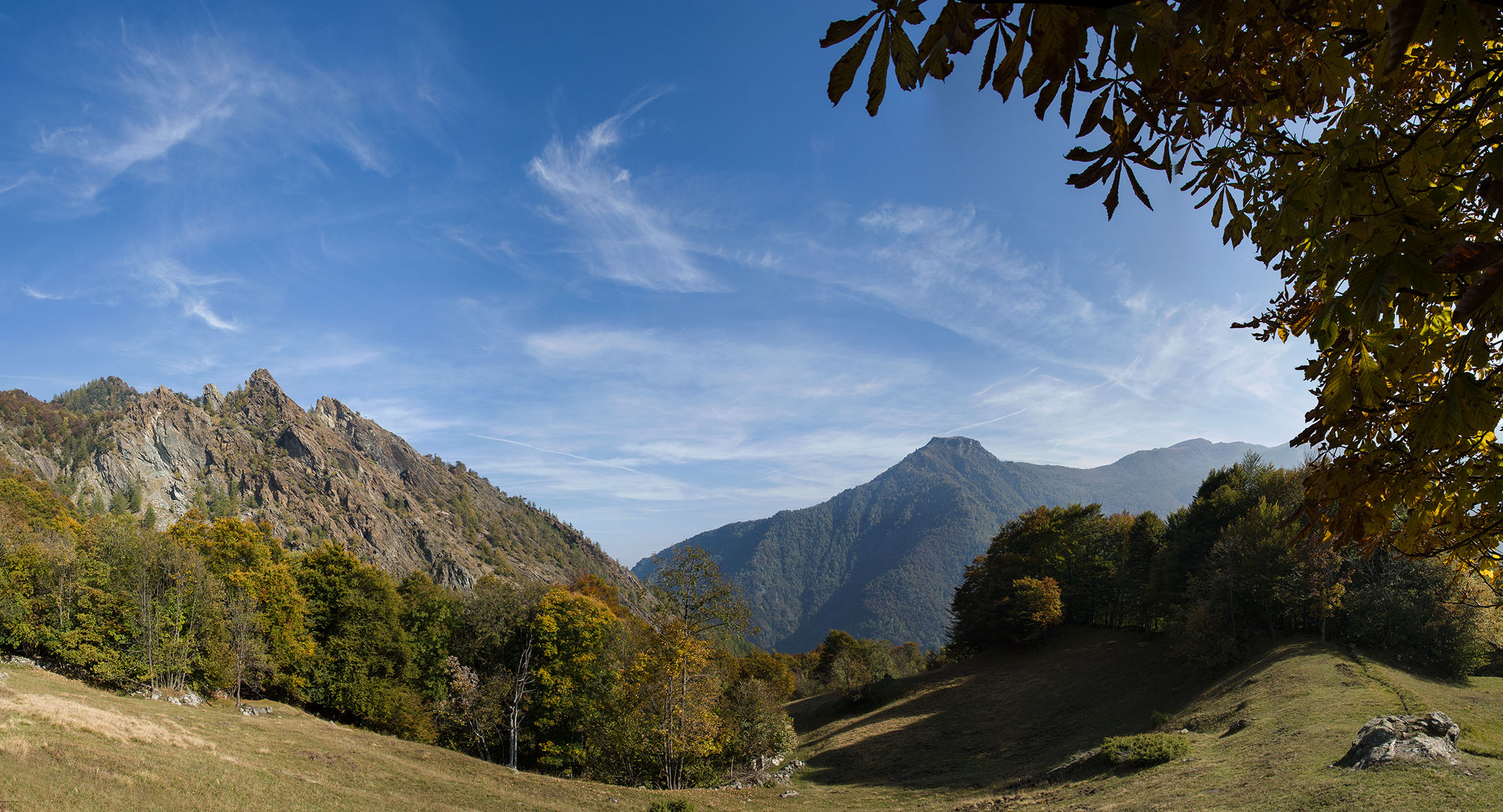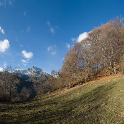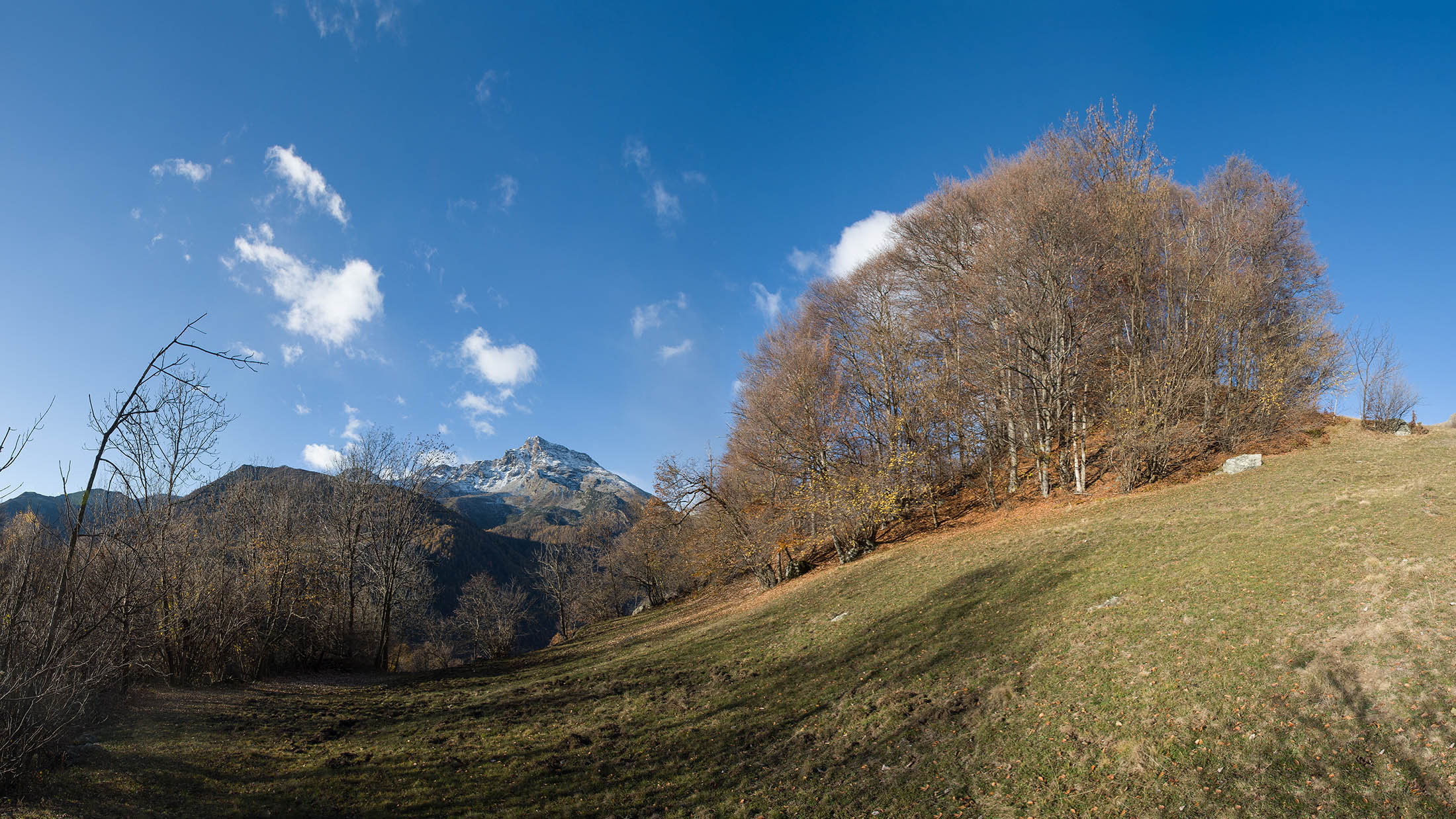 Oberhalb des Ortskerns überquert man die Fahrstrasse, der Weg verschwindet alsbald im Wald, nach wenigen Schritten endet die Zivilisation, zumindest in den nächsten Stunden. Wenige Minuten später kommt man zu einer Wegverzweigung bei einem Bildstock, bei dieser Variante bleibt der Abzweig nach Credarian unbeachtet. Durch steilen Buchenwald geht es kurz stramm bergauf. Wenig später lässt man den direkten Weg nach Il Tourn links liegen und steigt auf einer breiten unmarkierten Mulattiera (= Saumweg oder Maultierweg) hinauf zur traumhaft schön gelegenen Alphochfläche des Pian Scuro (1321 m), ein überaus lohnender Schlenker. Ein idyllisches Fleckchen, mit prächtiger Aussicht auf das Val d‘Ala und seine Berge. Wohltuende Stille, nur der Brunnen plätschert leise vor sich hin. Hier kann man stundenlang vor sich hinträumen. Oberhalb der Alphütten führt eine undeutliche Pfadspur zurück in den Wald, diese mündet leicht fallend zehn Minuten später wieder in den markierten Hauptweg, der direkt von Pian del Tetto nach Il Tourn führt. Auf diesem geht es nun durch dichten Buchenwald kontinuierlich bergauf, im Herbst stapft man hier durch enorme Laubmassen. Weiter oben wird der Weg flacher, nach etwa 1,5 Stunden erreicht man unverhofft einen aussichtsreichen Sattel am Fuss des Monte Plù (2197 m), etwas abseits die verfallenen Alpgebäude von Il Tourn (1622 m). Von den Viehweiden in der näheren Umgebung ist nicht mehr viel zu sehen, sie sind überwuchert von Gestrüpp und vielen Birken. Nichts desto trotz ein faszinierender und stimmungsvoller Ort mitten im Nirgendwo.