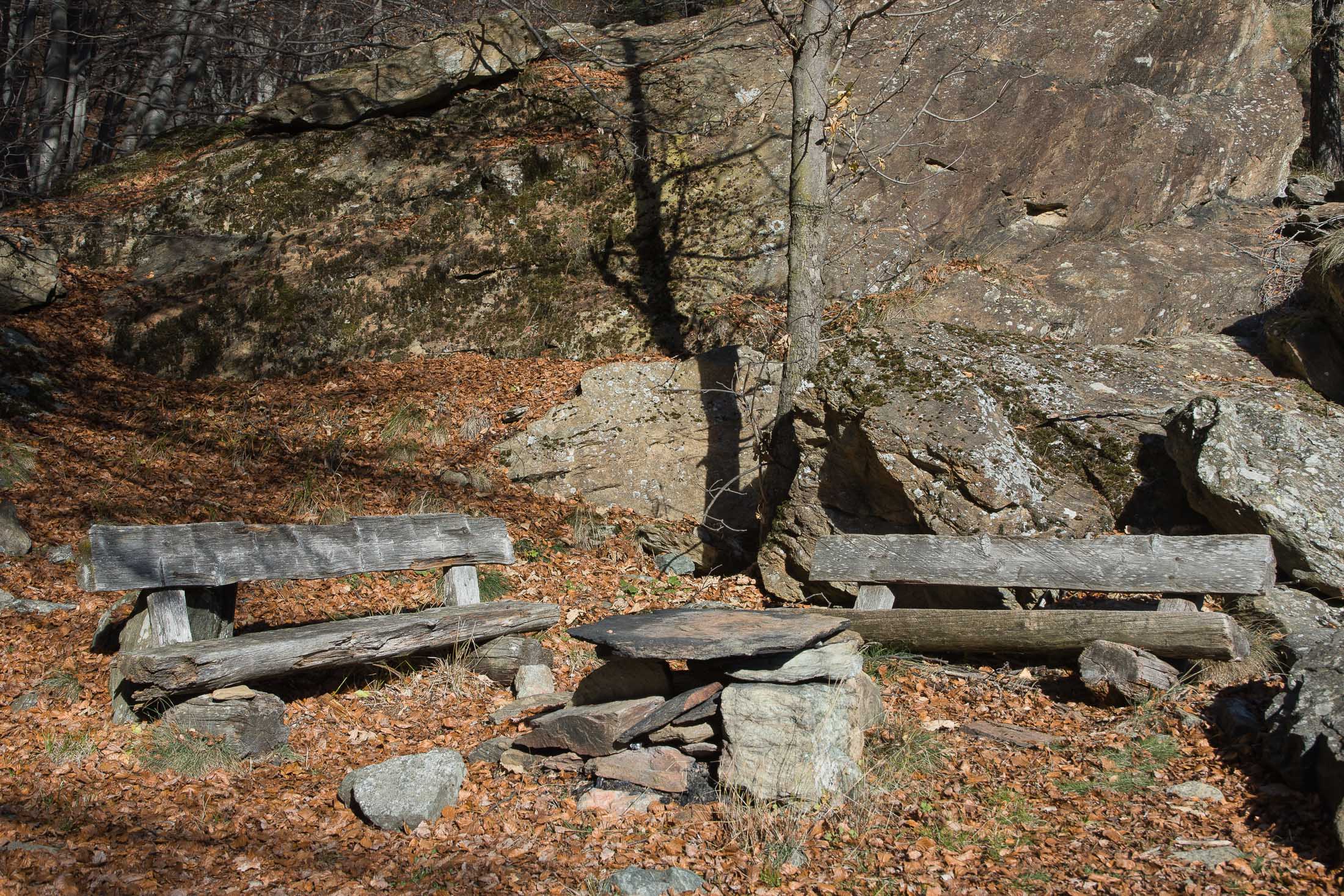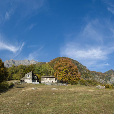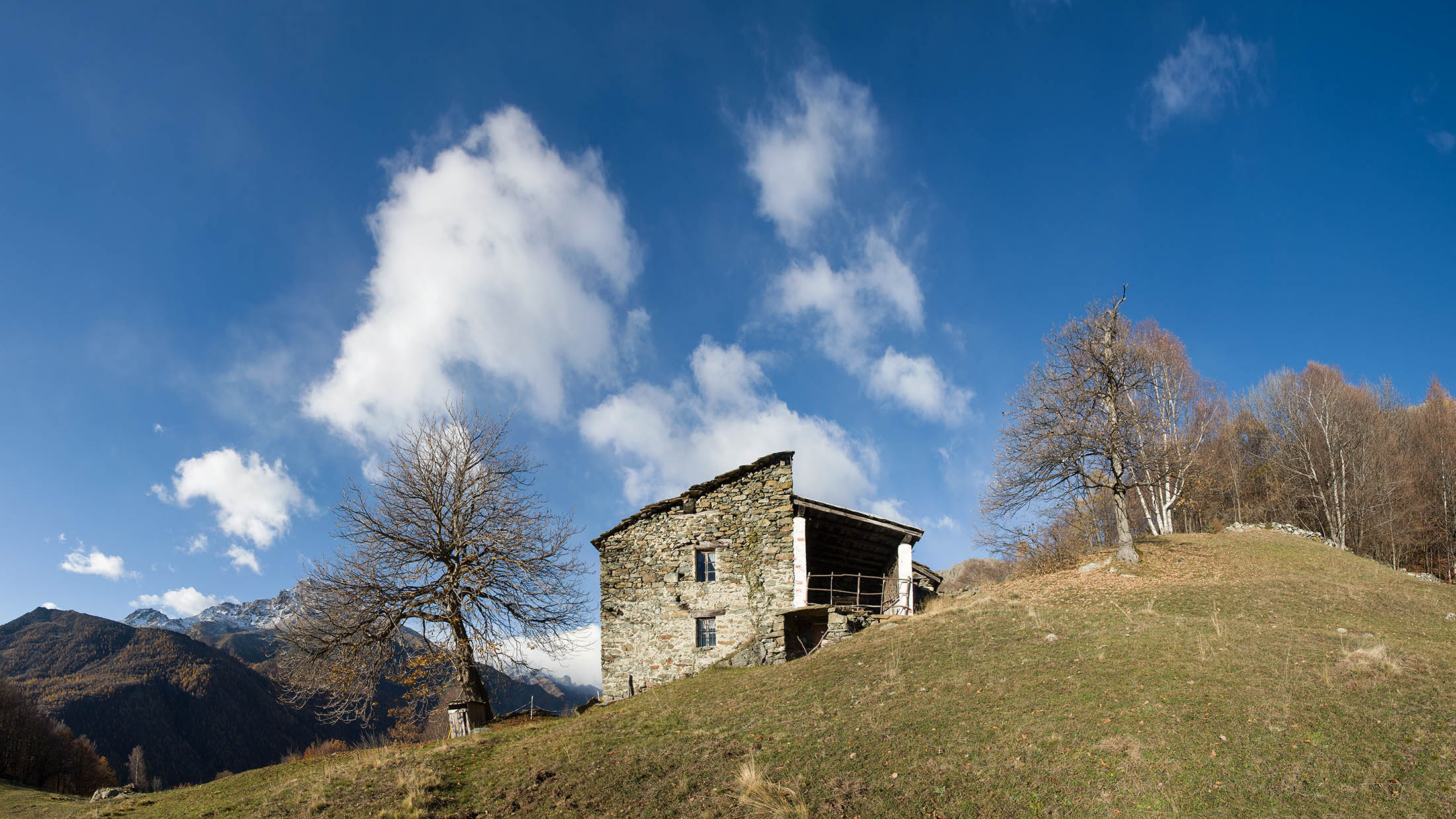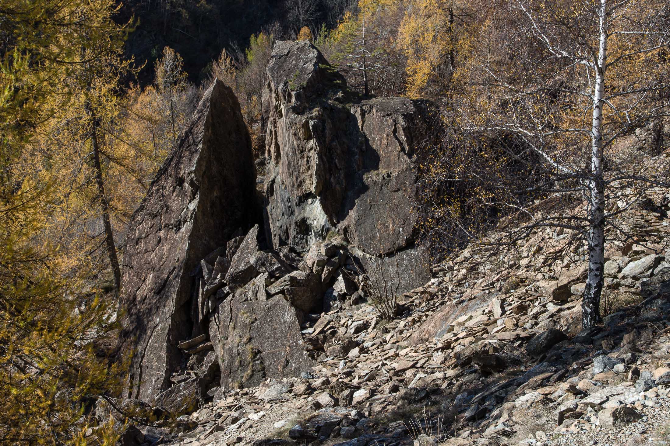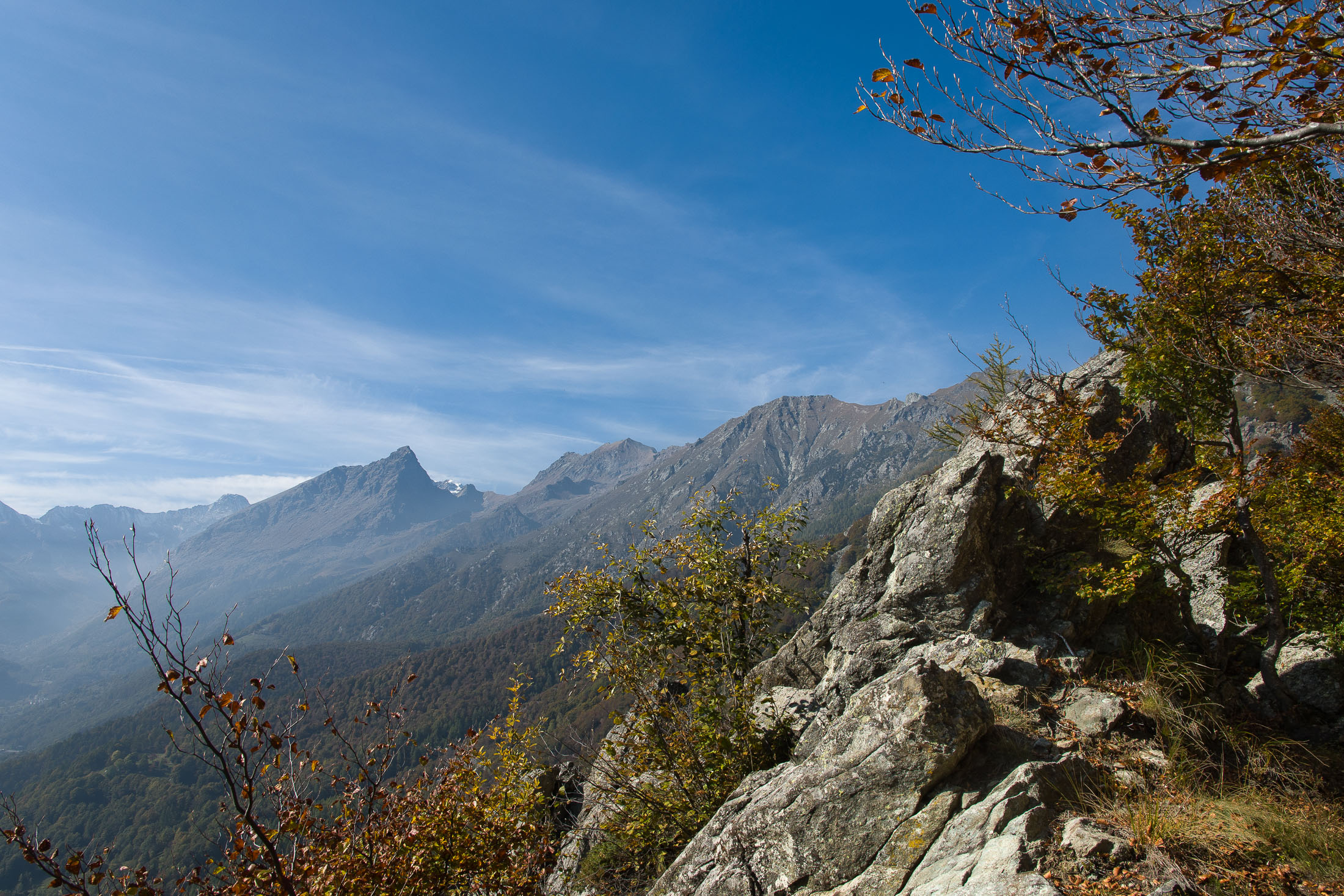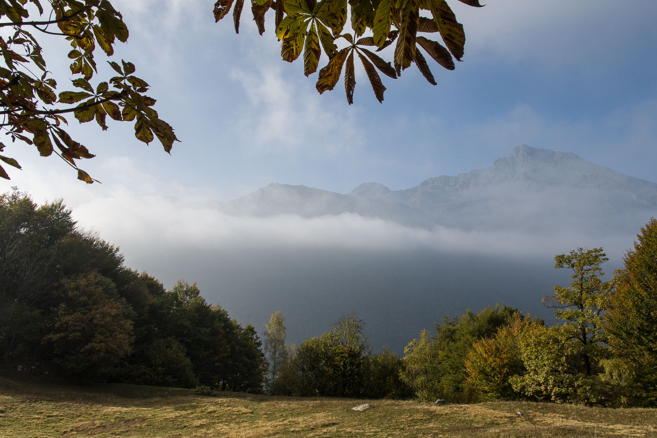 Oberhalb des Ortskerns überquert man die Fahrstrasse, der Weg verschwindet alsbald im Wald, nach wenigen Schritten endet die Zivilisation, zumindest in den nächsten Stunden. Wenige Minuten später kommt man zu einer Wegverzweigung bei einem Bildstock, bei dieser Variante bleibt der Abzweig nach Credarian unbeachtet. Durch steilen Buchenwald geht es kurz stramm bergauf. Wenig später lässt man den direkten Weg nach Il Tourn links liegen und steigt auf einer breiten unmarkierten Mulattiera (= Saumweg oder Maultierweg) hinauf zur traumhaft schön gelegenen Alphochfläche des Pian Scuro (1321 m), ein überaus lohnender Schlenker. Ein idyllisches Fleckchen, mit prächtiger Aussicht auf das Val d‘Ala und seine Berge. Wohltuende Stille, nur der Brunnen plätschert leise vor sich hin. Hier kann man stundenlang vor sich hinträumen. Oberhalb der Alphütten führt eine undeutliche Pfadspur zurück in den Wald, diese mündet leicht fallend zehn Minuten später wieder in den markierten Hauptweg, der direkt von Pian del Tetto nach Il Tourn führt. Auf diesem geht es nun durch dichten Buchenwald kontinuierlich bergauf, im Herbst stapft man hier durch enorme Laubmassen. Weiter oben wird der Weg flacher, nach etwa 1,5 Stunden erreicht man unverhofft einen aussichtsreichen Sattel am Fuss des Monte Plù (2197 m), etwas abseits die verfallenen Alpgebäude von Il Tourn (1622 m). Von den Viehweiden in der näheren Umgebung ist nicht mehr viel zu sehen, sie sind überwuchert von Gestrüpp und vielen Birken. Nichts desto trotz ein faszinierender und stimmungsvoller Ort mitten im Nirgendwo.