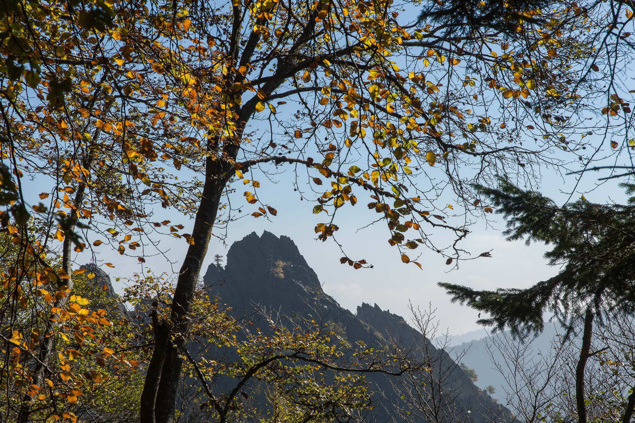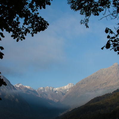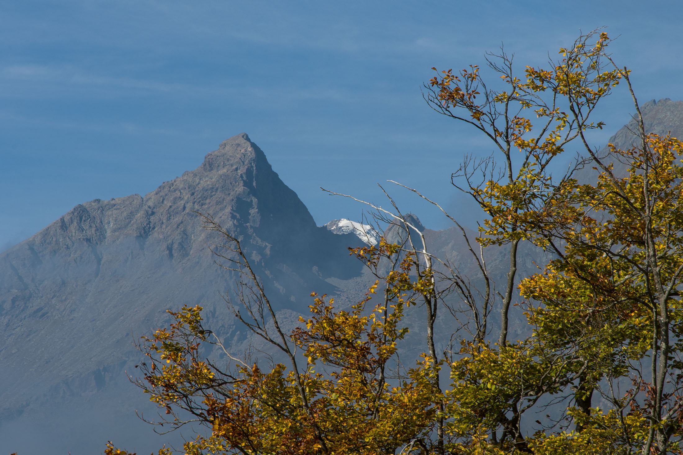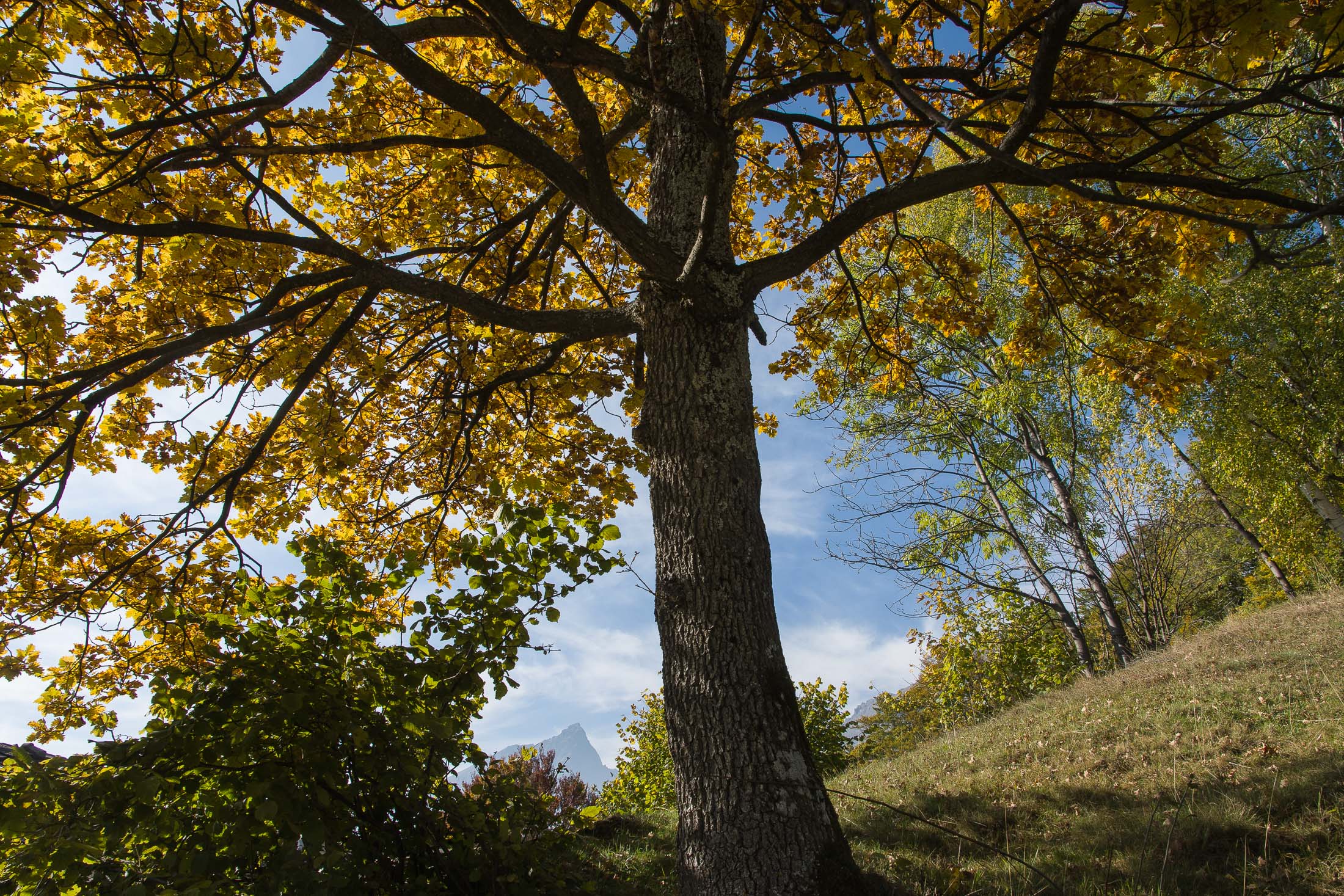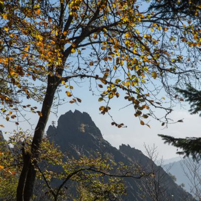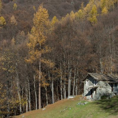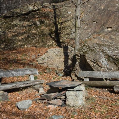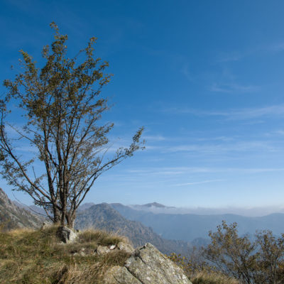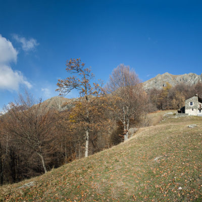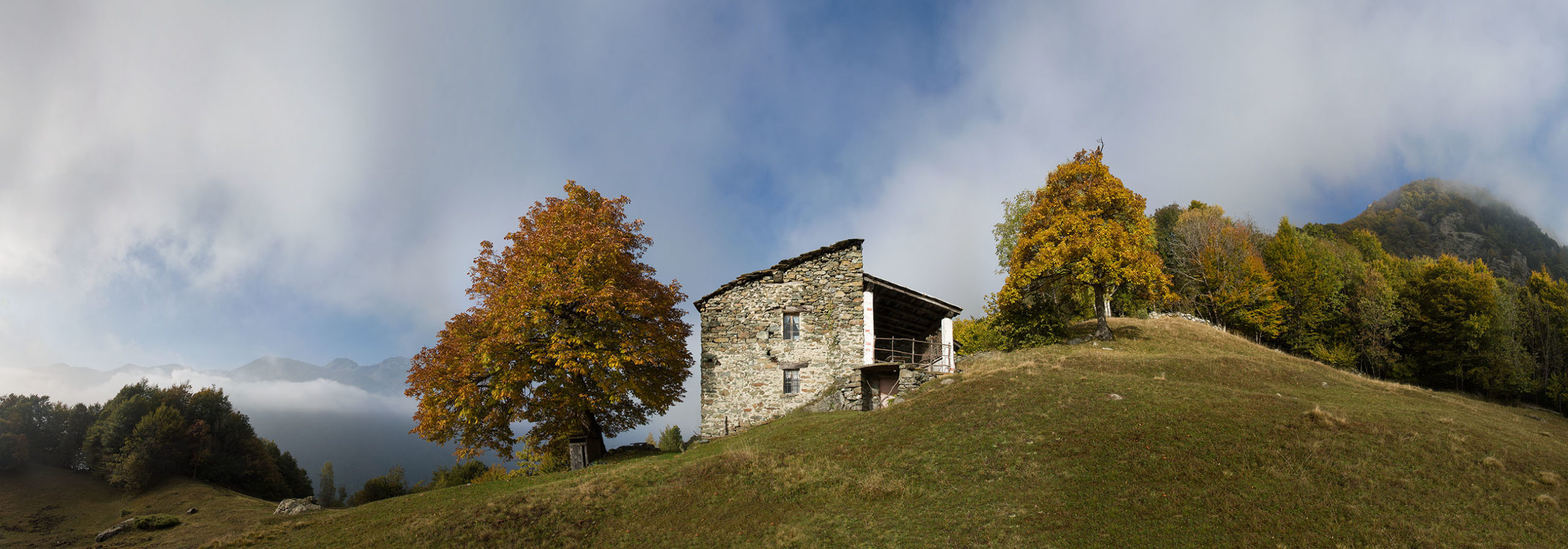 Oberhalb des Ortskerns überquert man die Fahrstrasse, der Weg verschwindet alsbald im Wald, nach wenigen Schritten endet die Zivilisation, zumindest in den nächsten Stunden. Wenige Minuten später kommt man zu einer Wegverzweigung bei einem Bildstock, bei dieser Variante bleibt der Abzweig nach Credarian unbeachtet. Durch steilen Buchenwald geht es kurz stramm bergauf. Wenig später lässt man den direkten Weg nach Il Tourn links liegen und steigt auf einer breiten unmarkierten Mulattiera (= Saumweg oder Maultierweg) hinauf zur traumhaft schön gelegenen Alphochfläche des Pian Scuro (1321 m), ein überaus lohnender Schlenker. Ein idyllisches Fleckchen, mit prächtiger Aussicht auf das Val d‘Ala und seine Berge. Wohltuende Stille, nur der Brunnen plätschert leise vor sich hin. Hier kann man stundenlang vor sich hinträumen. Oberhalb der Alphütten führt eine undeutliche Pfadspur zurück in den Wald, diese mündet leicht fallend zehn Minuten später wieder in den markierten Hauptweg, der direkt von Pian del Tetto nach Il Tourn führt. Auf diesem geht es nun durch dichten Buchenwald kontinuierlich bergauf, im Herbst stapft man hier durch enorme Laubmassen. Weiter oben wird der Weg flacher, nach etwa 1,5 Stunden erreicht man unverhofft einen aussichtsreichen Sattel am Fuss des Monte Plù (2197 m), etwas abseits die verfallenen Alpgebäude von Il Tourn (1622 m). Von den Viehweiden in der näheren Umgebung ist nicht mehr viel zu sehen, sie sind überwuchert von Gestrüpp und vielen Birken. Nichts desto trotz ein faszinierender und stimmungsvoller Ort mitten im Nirgendwo.