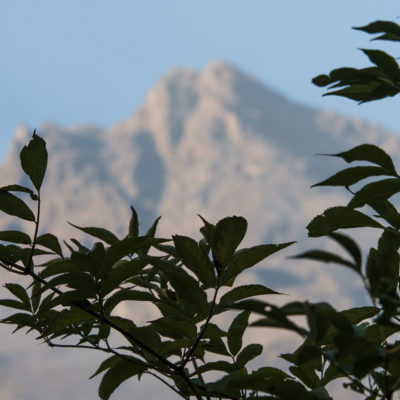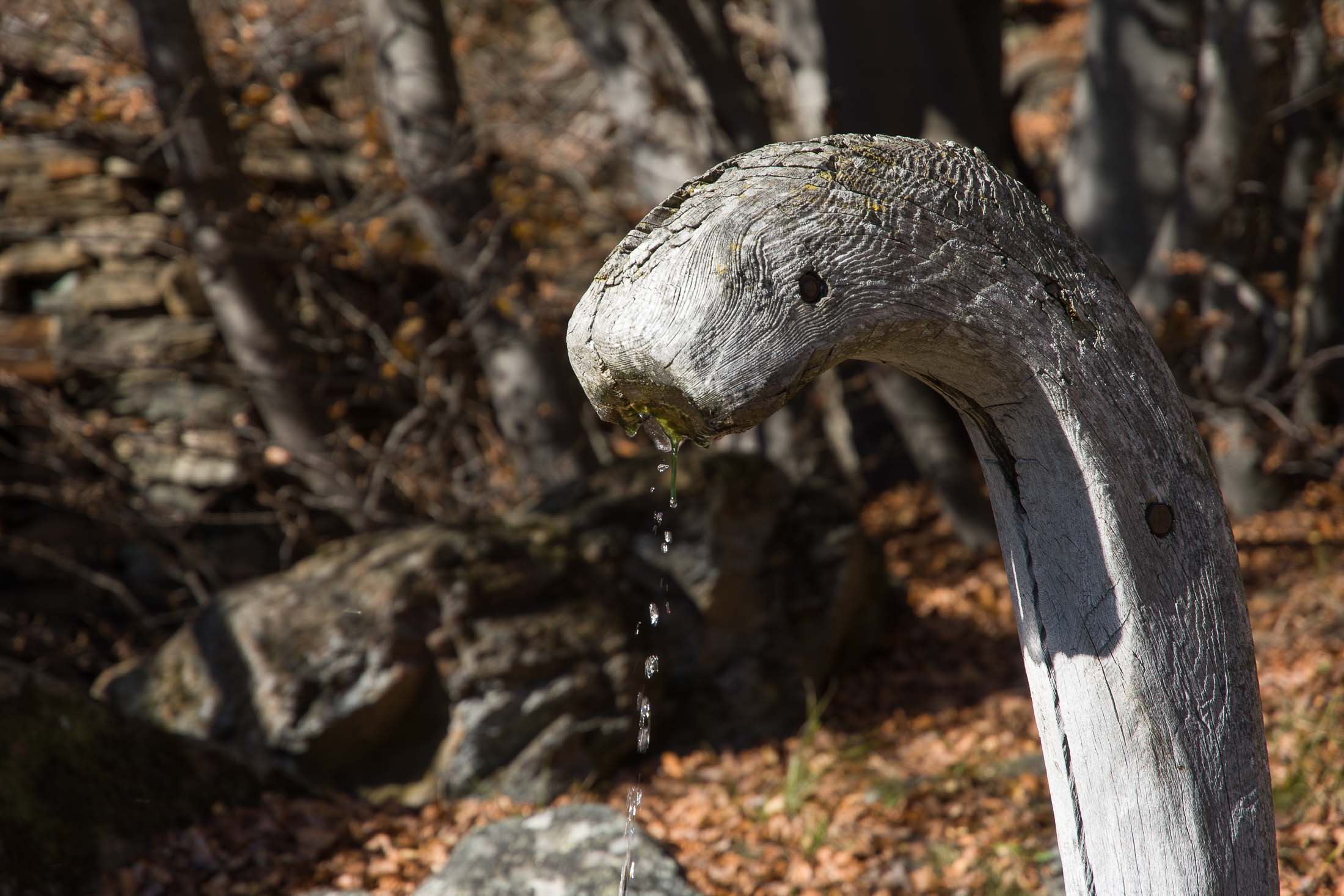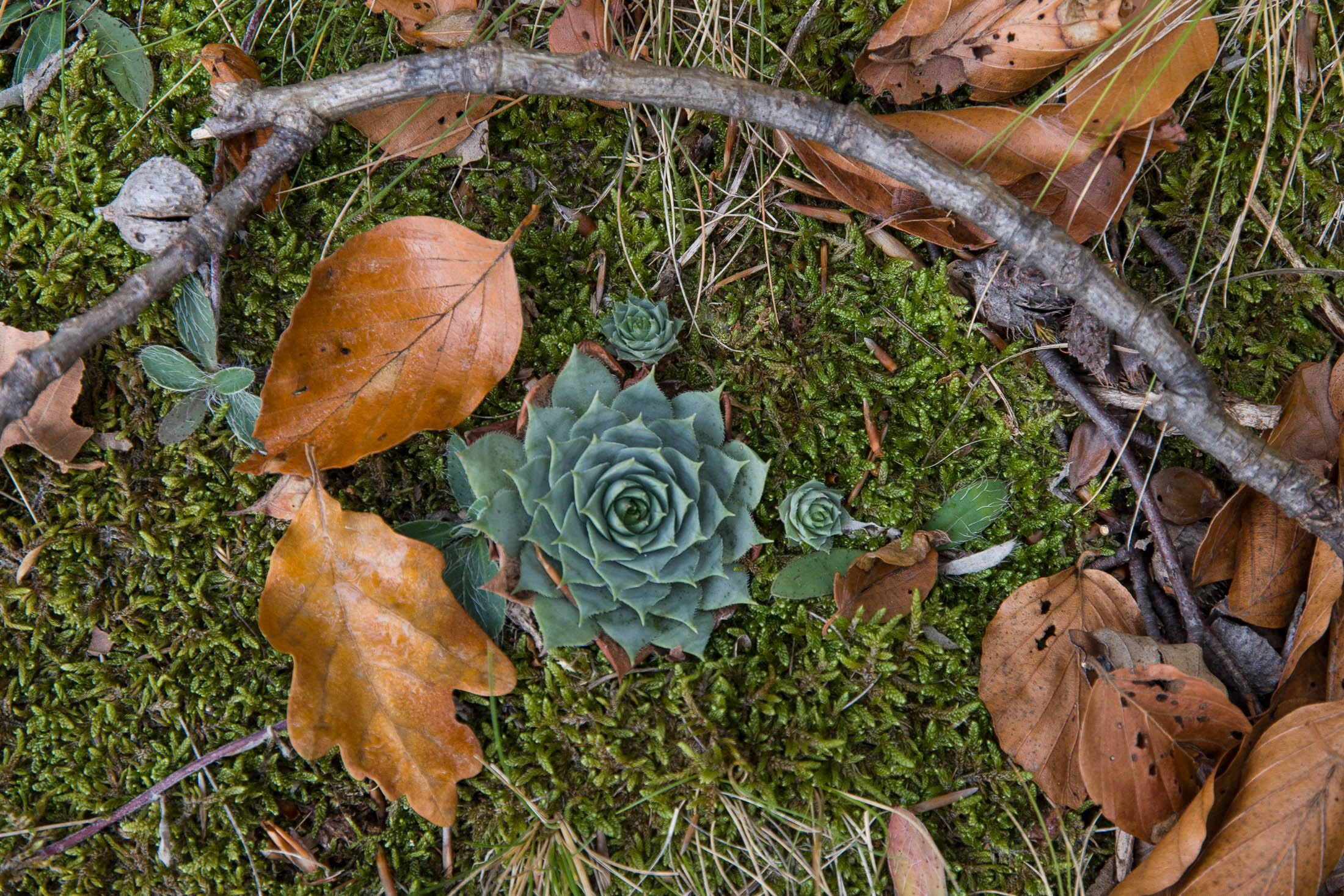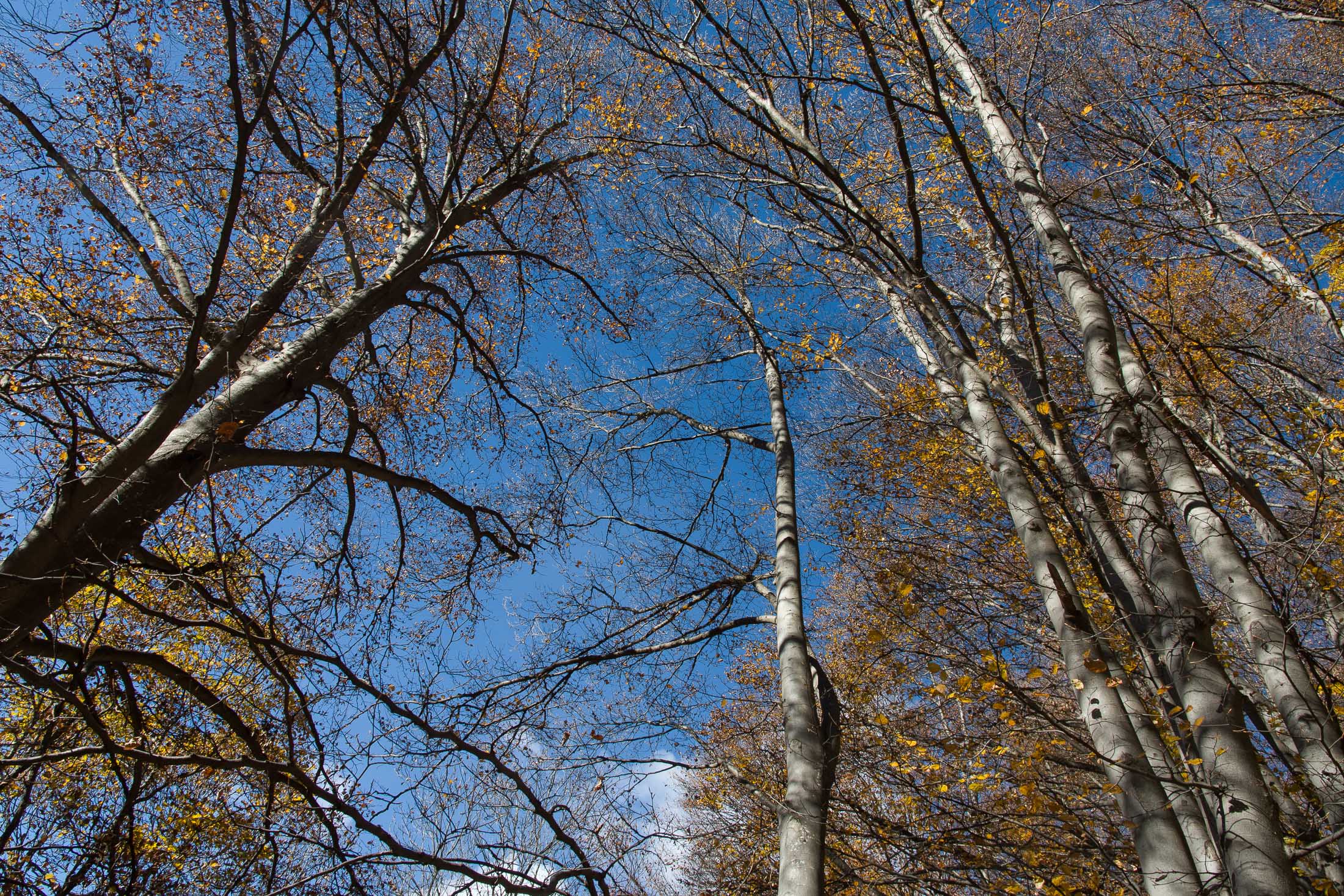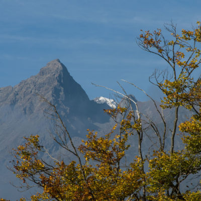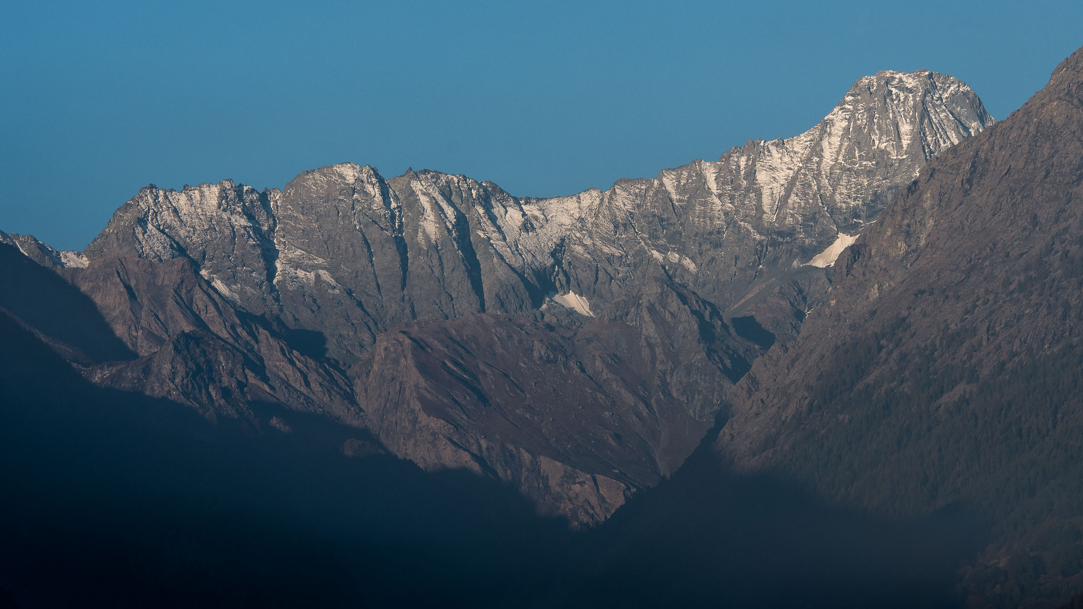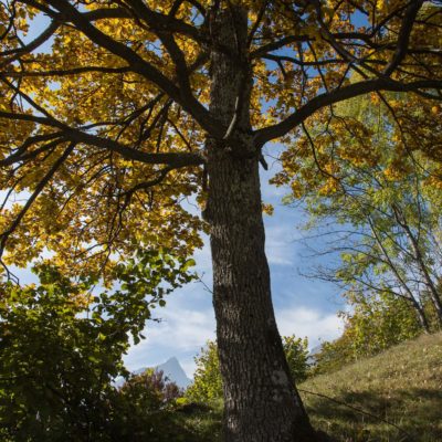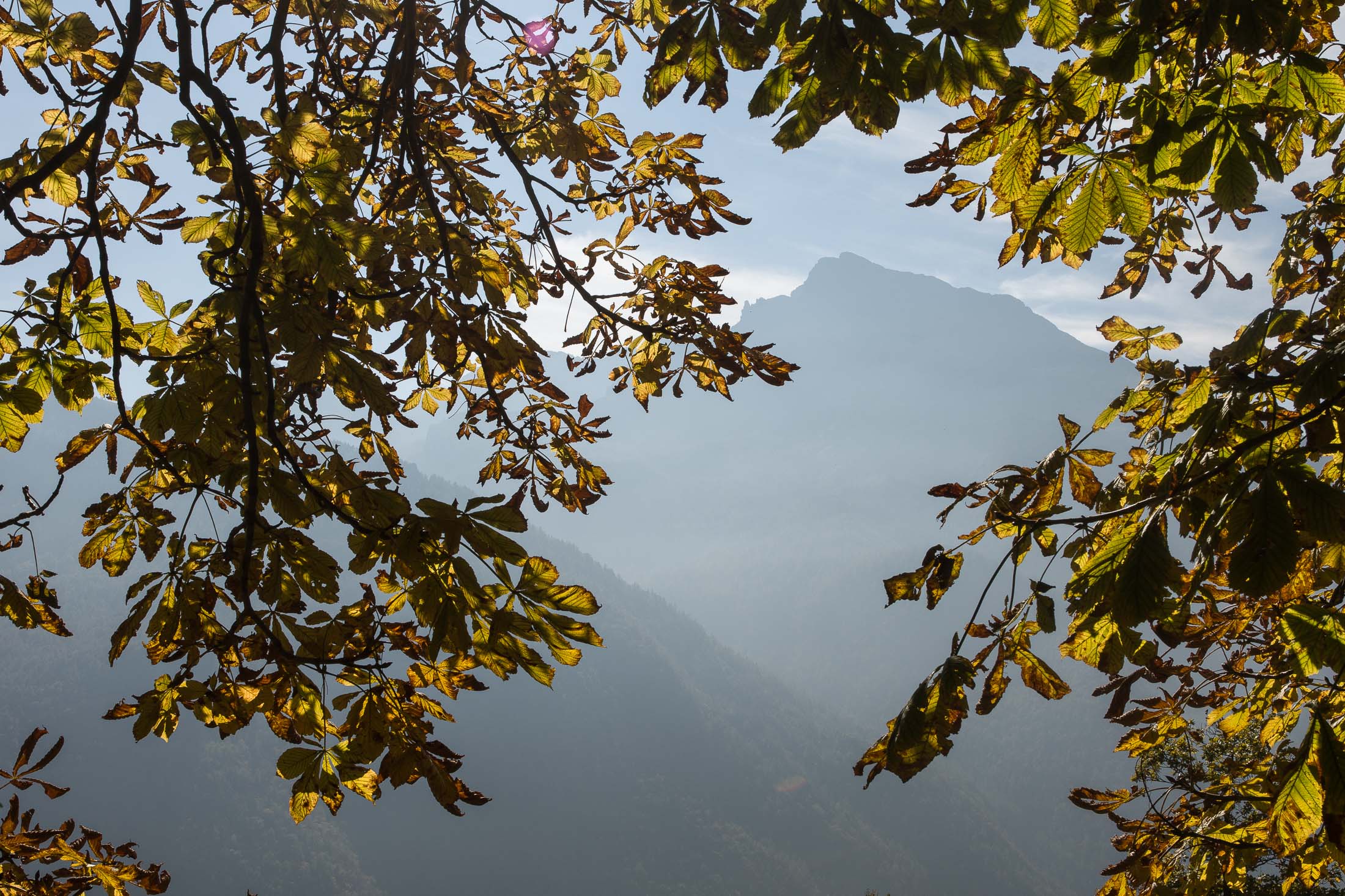 Oberhalb des Ortskerns überquert man die Fahrstrasse, der Weg verschwindet alsbald im Wald, nach wenigen Schritten endet die Zivilisation, zumindest in den nächsten Stunden. Wenige Minuten später kommt man zu einer Wegverzweigung bei einem Bildstock, bei dieser Variante bleibt der Abzweig nach Credarian unbeachtet. Durch steilen Buchenwald geht es kurz stramm bergauf. Wenig später lässt man den direkten Weg nach Il Tourn links liegen und steigt auf einer breiten unmarkierten Mulattiera (= Saumweg oder Maultierweg) hinauf zur traumhaft schön gelegenen Alphochfläche des Pian Scuro (1321 m), ein überaus lohnender Schlenker. Ein idyllisches Fleckchen, mit prächtiger Aussicht auf das Val d‘Ala und seine Berge. Wohltuende Stille, nur der Brunnen plätschert leise vor sich hin. Hier kann man stundenlang vor sich hinträumen. Oberhalb der Alphütten führt eine undeutliche Pfadspur zurück in den Wald, diese mündet leicht fallend zehn Minuten später wieder in den markierten Hauptweg, der direkt von Pian del Tetto nach Il Tourn führt. Auf diesem geht es nun durch dichten Buchenwald kontinuierlich bergauf, im Herbst stapft man hier durch enorme Laubmassen. Weiter oben wird der Weg flacher, nach etwa 1,5 Stunden erreicht man unverhofft einen aussichtsreichen Sattel am Fuss des Monte Plù (2197 m), etwas abseits die verfallenen Alpgebäude von Il Tourn (1622 m). Von den Viehweiden in der näheren Umgebung ist nicht mehr viel zu sehen, sie sind überwuchert von Gestrüpp und vielen Birken. Nichts desto trotz ein faszinierender und stimmungsvoller Ort mitten im Nirgendwo.