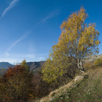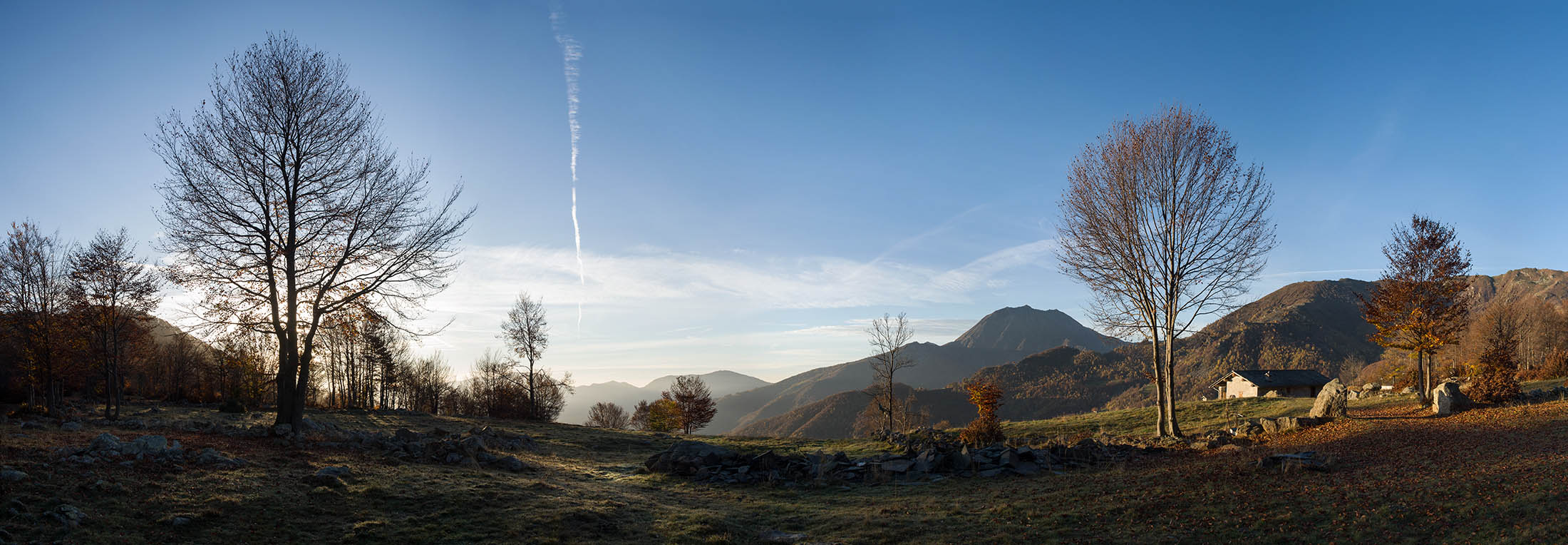 Nach der ausgiebigen Gipfelschau wird es Zeit für den Abstieg. Dieser verläuft bis zum Colle Pian Fium auf dem Aufstiegsweg. Vom Pass wandert man auf dem bequem zu begehenden Alpsträsschen hinab zur herrlich gelegenen, in den Sommermonaten bewirtschafteten Alpe Grosso (1756 m). Von dort weiter abwärts bis zu einer bereits von weitem sichtbaren Gruppe von Alpgebäuden (ohne Namen in den einschlägigen Karten), entweder über die steinige Piste, die unterhalb der Alpe Grosso links abzweigt oder einfach direkt und weglos über die Weiden. Im weiteren Verlauf verläuft das Alpsträsschen eine Weile durch dichten Buchenwald. Bei den Ruinen der Alpe Foiere (1446 m) erreicht man die weite Hochfläche des Pian delle Mutte, über die man schliesslich zum Ausgangspunkt zurückkehrt. Der gesamte Abstieg ab der Alpe Grosso ist zwar nicht markiert aber problemlos zu finden.