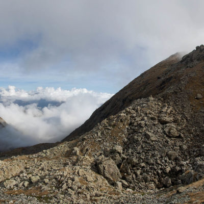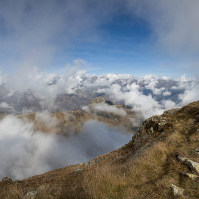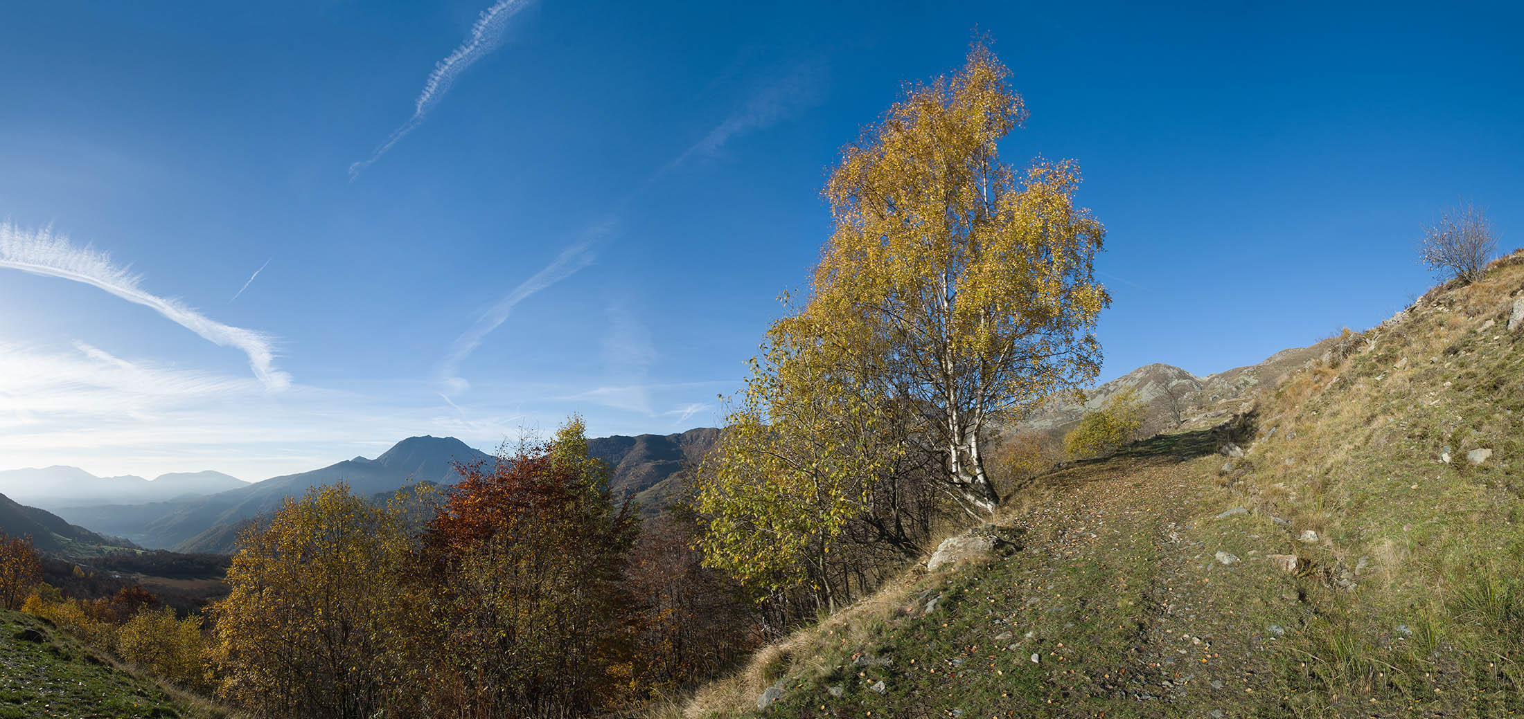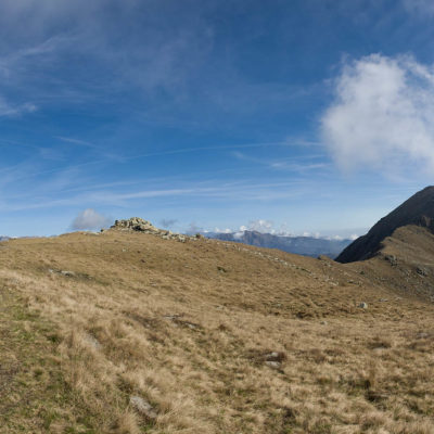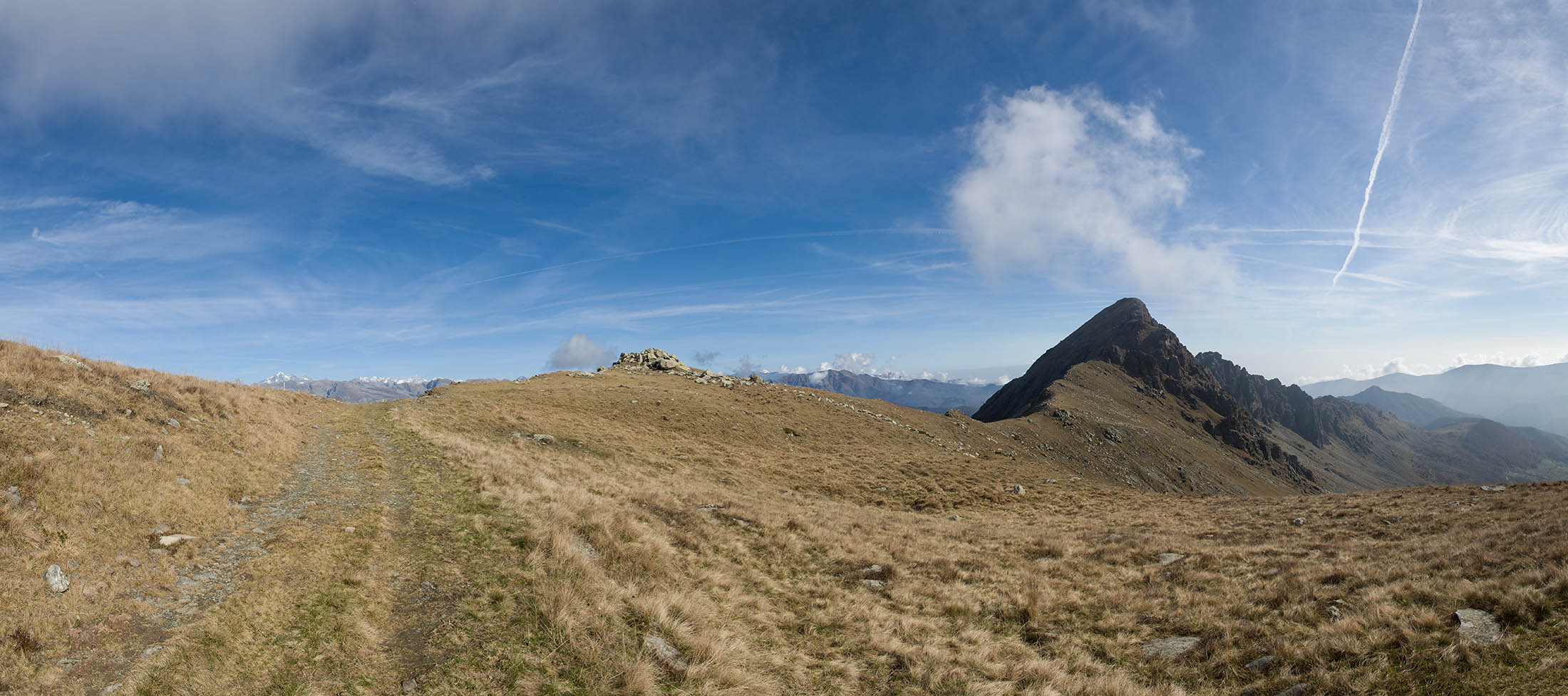 Oberhalb des Ortes zweigt in einer Rechtskurve bei einem Wegweiser ein unbefestigter Fahrweg ab, dieser führt in Kürze leicht ansteigend zum Pian delle Mutte. Weites Land, am Wegesrand ein kleiner See, auf der nahezu ebenen Hochfläche kann man eine Weile gemütlich vor sich hinschlendern und die malerische Umgebung geniessen. Etwa 100 m nach einem hübsch gelegenen einzelstehenden Alpgebäude zweigt rechts ein weiterer Fahrweg Richtung Norden ab (Wegweiser). Nun geht es aufwärts, zunächst durch lauschigen Buchenwald, dann wieder durch offenes und aussichtsreiches Terrain. Das bequem zu begehende Alpsträsschen windet sich in zahlosen Kehren durch ein weitläufiges Alpgebiet am Fuss der steilen Felswände der Rocca Moross. Am Wegesrand die Ruinen der Grange Saudette (1582 m), einige Kurven weiter oberhalb diejenigen der Grange Rivè (1658 m), wo in den Sommermonaten noch gelegentlich Kühe und Rinder weiden. Grange ist eine in manchen Gebieten des Piemont übliche Bezeichnung für eine Alp oder Alm. Die Alpgebäude liegen schon lange in Trümmern, die hässliche Blechbude und der abgestellte Wohnwagen, der als Behausung für den Hirten dient, wirken angesichts der Schönheit der Umgebung ein wenig deplatziert. Der breite grasige Fahrweg endet schliesslich bei den Hütten von Alpetto (1770 m). Der nun spärliche aber gut markierte Pfad mündet nach einer knappen halben Stunde in die geschotterte Alpstrasse, die von der Alpe Grosso heraufkommt. Auf dieser nun in weiteren 20 Minuten zum Colle Pian Fium (2042 m), Wasserscheide zwischen dem Valle di Viù und dem nördlich gelegenen Val d‘Ala. Dort erwartet einen ein aprupter Landschaftswechsel. Der entlegene Übergang befindet sich auf einer sanft gewellten kleinen Hochfläche, bereits von hier geniesst man weite Blicke in die Ferne. Ein faszinierender Ort inmitten der Einsamkeit. Pause, Rucksack absetzen, Picknick auspacken und die Augen auf das richten, was einen berührt, das nahe Gipfelziel bereits vor Augen.