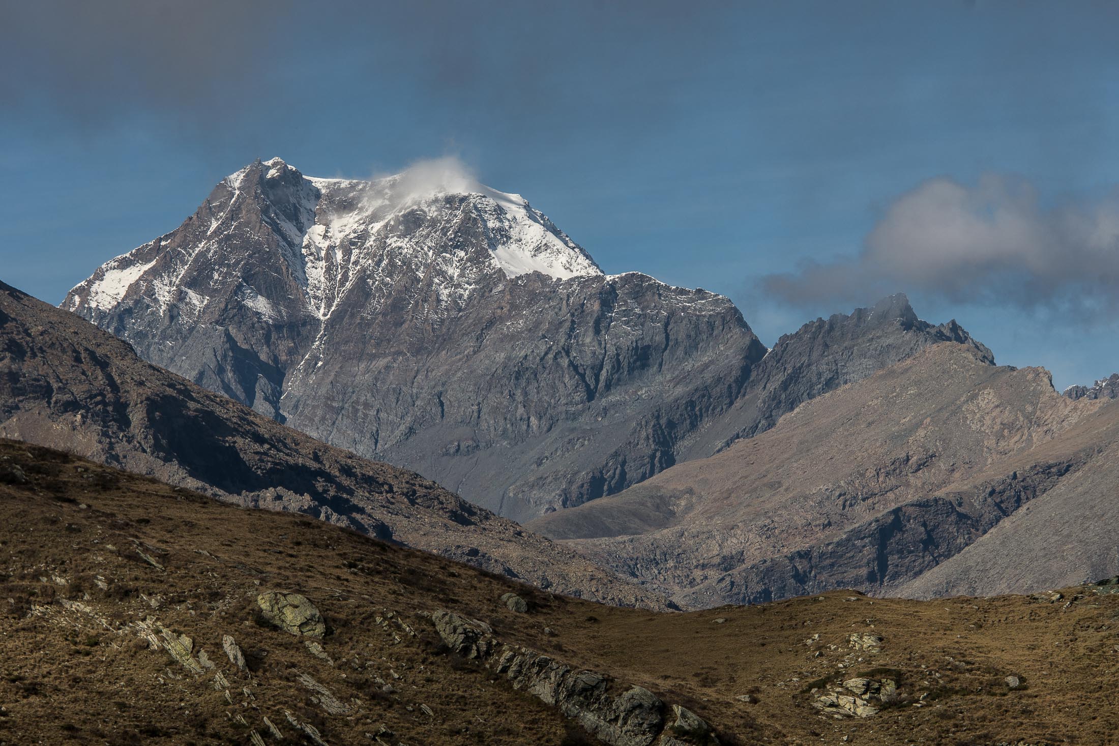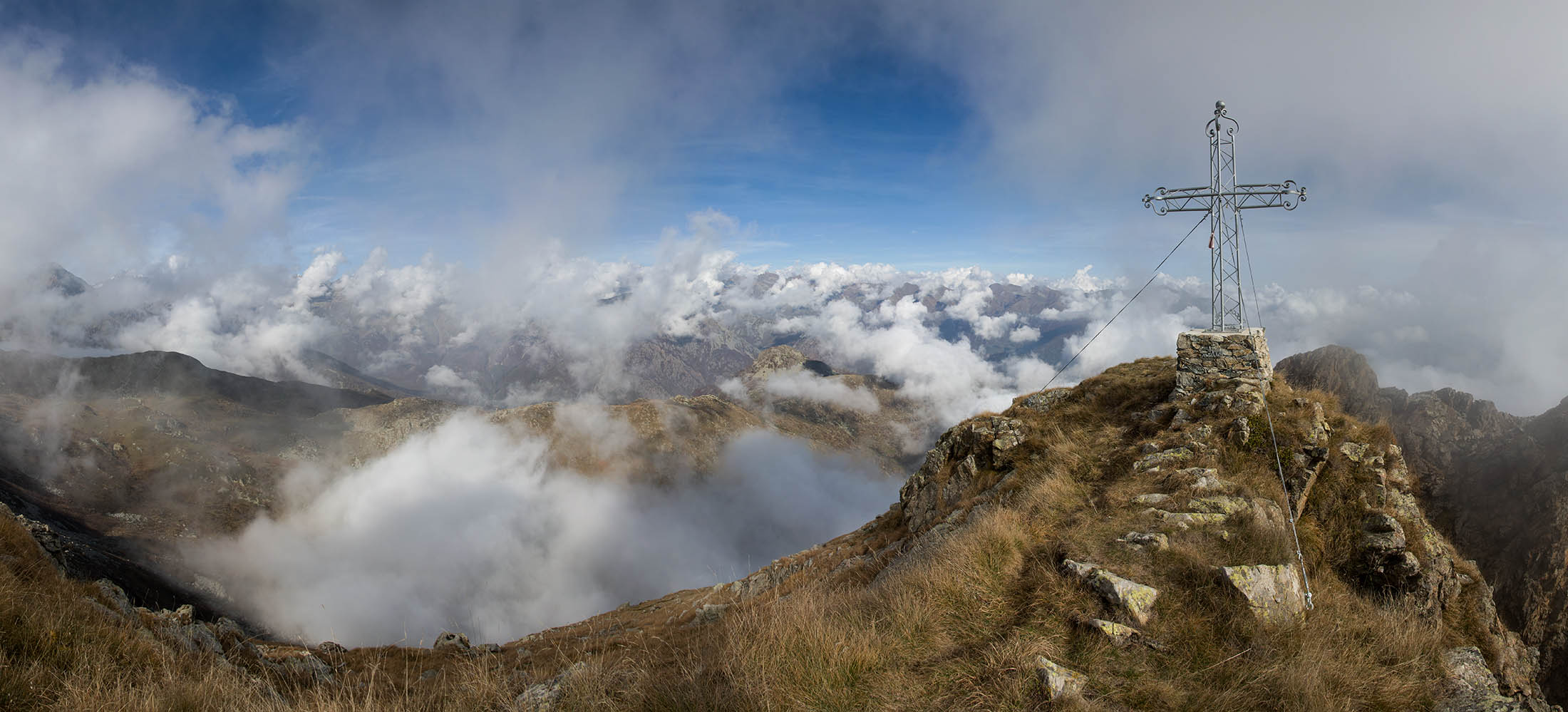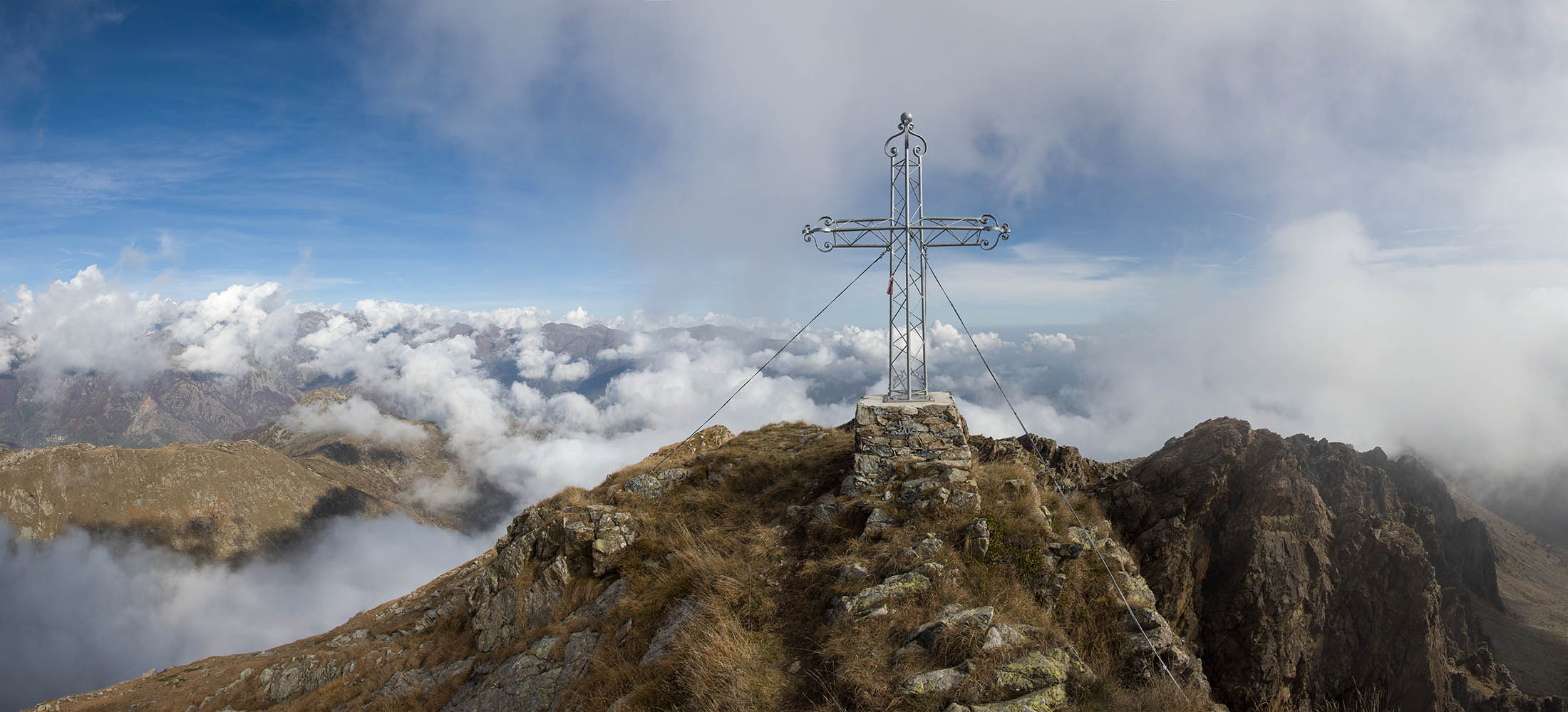 Wem das tolle Panorama noch nicht reicht, macht sich auf den Weiterweg. Am Colle Pian Fium beginnt eine anfangs undeutliche Wegspur, auf der man Richtung Osten über einen grasigen Rücken zunächst etwa 50 Höhenmeter absteigt. Der verbleibende halbstündige Aufstieg zum Gipfel führt auf nun klar erkennbaren und gut markiertem Pfad entlang des Westgrats. Der Weg ist an keiner Stelle ausgesetzt, zwischendurch müssen lediglich zwei kleinere Blockfelder überquert werden, was bei trockener Witterung unschwierig ist. Nach einem steilen Schlussanstieg erreicht man schliesslich das grosse, im Jahr 2021 neu errichtete Gipfelkreuz auf der Rocca Moross (2135 m). Zur Belohnung gibt es ein atemberaubendes 360°-Panorama, fern am Horizont verlieren sich Zeit und Raum. Im Nordwesten dominiert die Uja di Ciamarella (3676 m), der höchste Gipfel der drei Lanzo-Täler. Im Norden erhebt sich majestätisch der Gran Paradiso (4061 m) mit all seinen Trabanten, im Nordosten das vergletscherte Monte Rosa-Massiv. Im Süden zeigt sich der Monviso (3841 m), die höchste Erhebung der Südalpen, bei klarem Wetter blickt man bis in die Seealpen. Im Osten erstreckt sich die piemontesische Tiefebene. Höhen und Tiefen, soweit das Auge reicht.