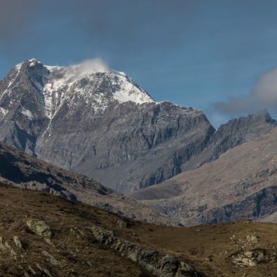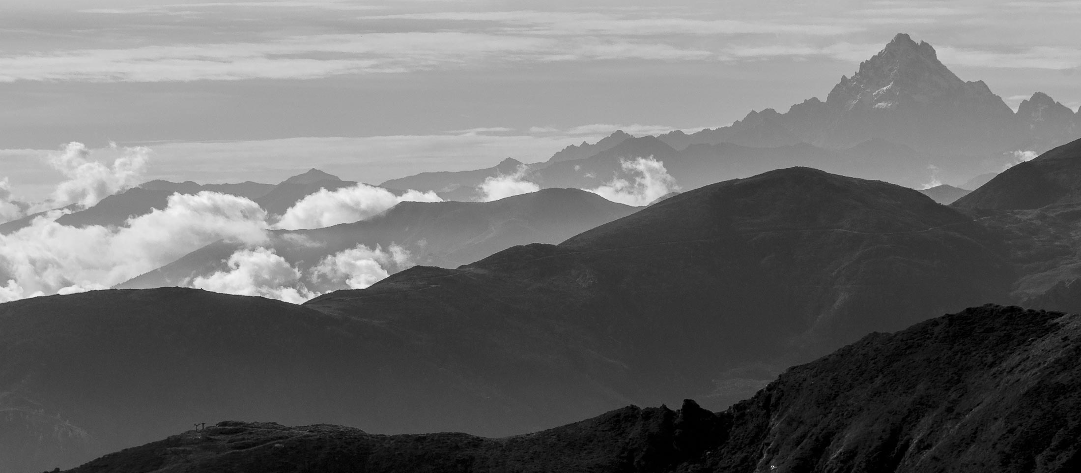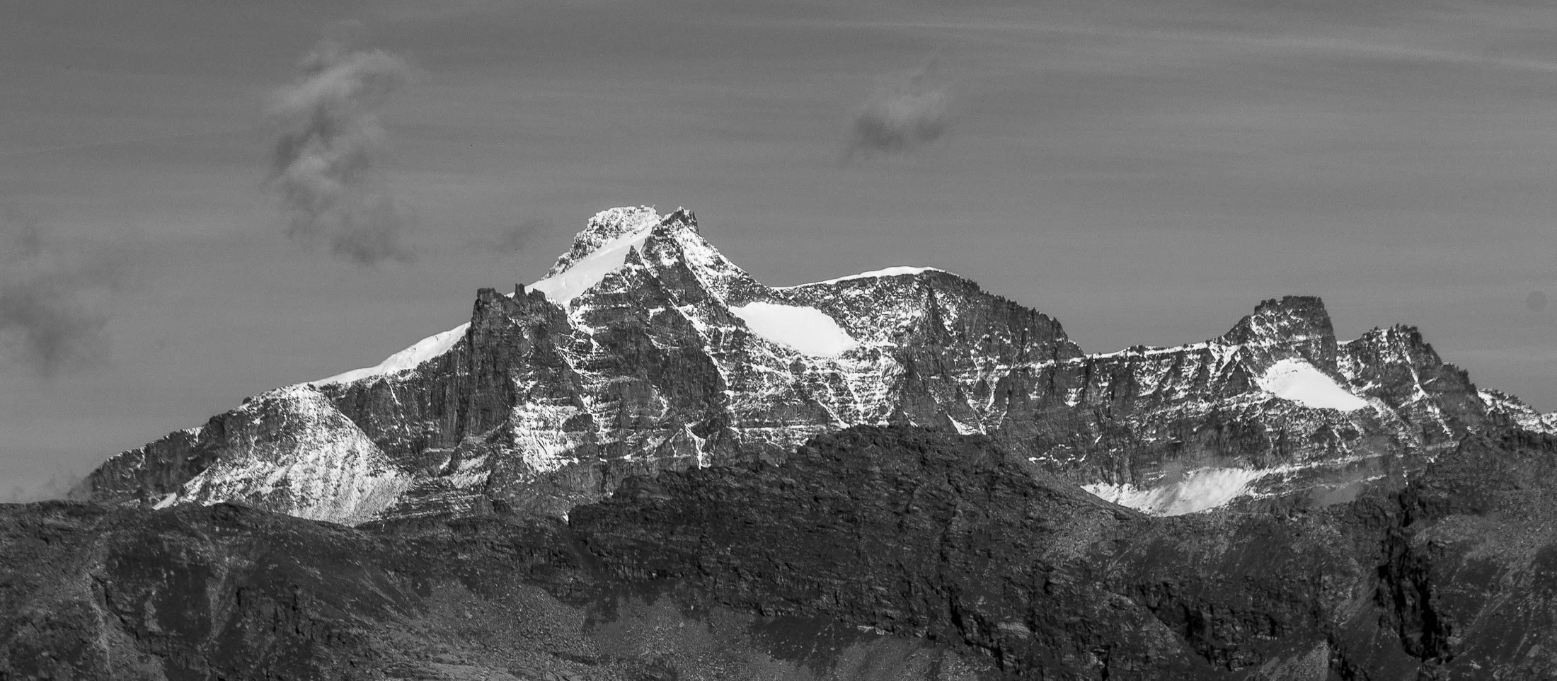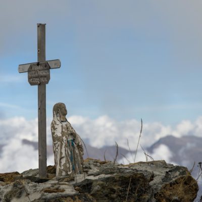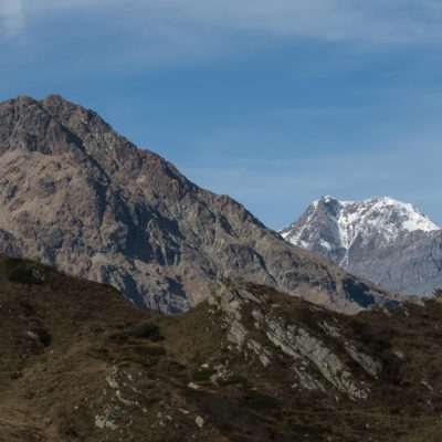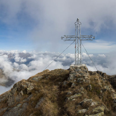 Wem das tolle Panorama noch nicht reicht, macht sich auf den Weiterweg. Am Colle Pian Fium beginnt eine anfangs undeutliche Wegspur, auf der man Richtung Osten über einen grasigen Rücken zunächst etwa 50 Höhenmeter absteigt. Der verbleibende halbstündige Aufstieg zum Gipfel führt auf nun klar erkennbaren und gut markiertem Pfad entlang des Westgrats. Der Weg ist an keiner Stelle ausgesetzt, zwischendurch müssen lediglich zwei kleinere Blockfelder überquert werden, was bei trockener Witterung unschwierig ist. Nach einem steilen Schlussanstieg erreicht man schliesslich das grosse, im Jahr 2021 neu errichtete Gipfelkreuz auf der Rocca Moross (2135 m). Zur Belohnung gibt es ein atemberaubendes 360°-Panorama, fern am Horizont verlieren sich Zeit und Raum. Im Nordwesten dominiert die Uja di Ciamarella (3676 m), der höchste Gipfel der drei Lanzo-Täler. Im Norden erhebt sich majestätisch der Gran Paradiso (4061 m) mit all seinen Trabanten, im Nordosten das vergletscherte Monte Rosa-Massiv. Im Süden zeigt sich der Monviso (3841 m), die höchste Erhebung der Südalpen, bei klarem Wetter blickt man bis in die Seealpen. Im Osten erstreckt sich die piemontesische Tiefebene. Höhen und Tiefen, soweit das Auge reicht.