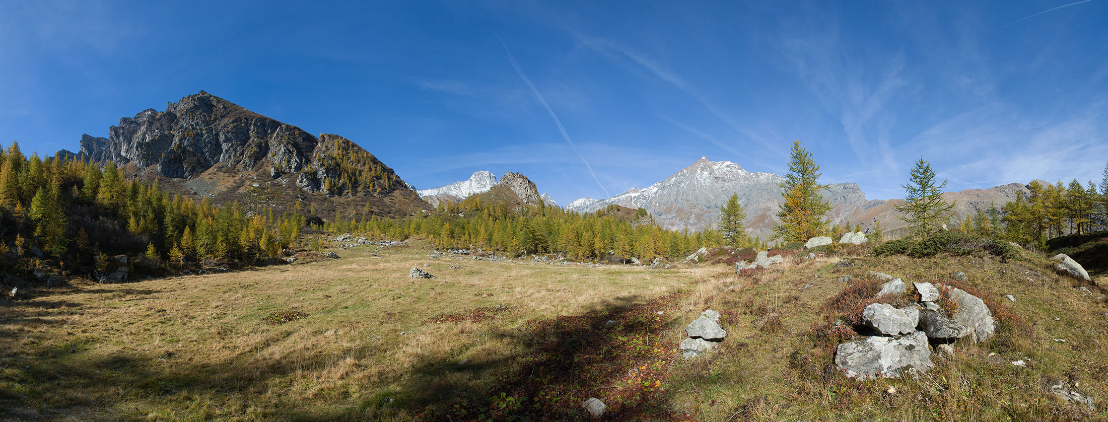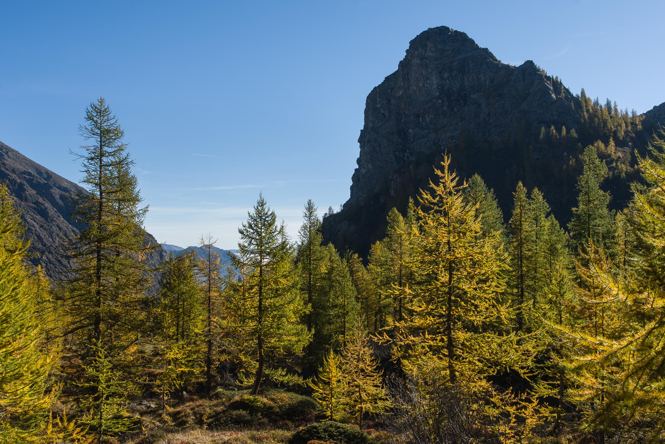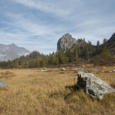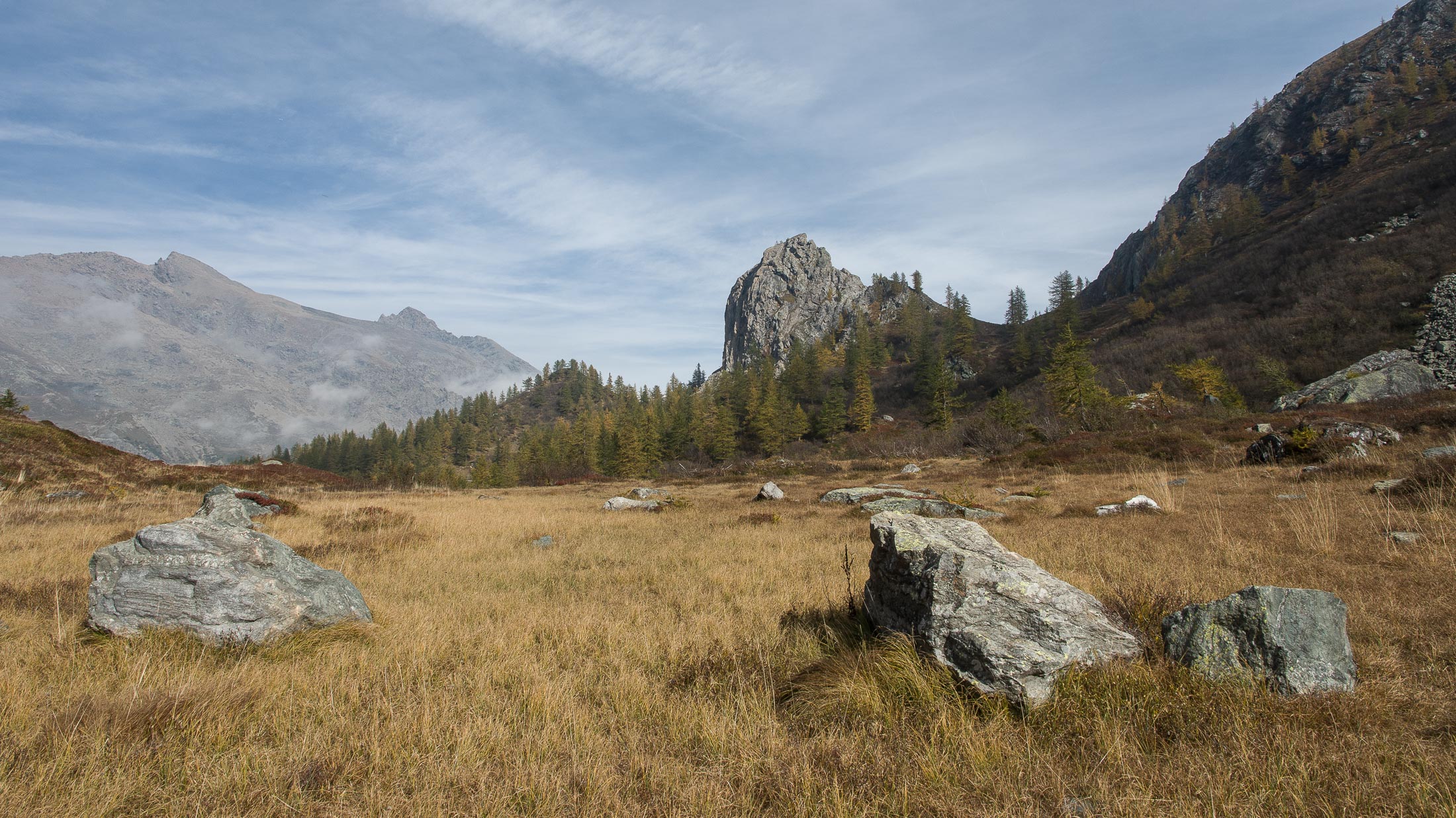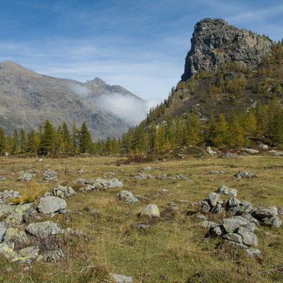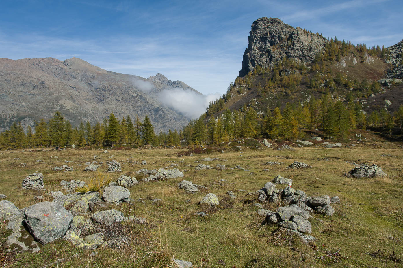 Ausgangspunkt der Tour ist der Pian della Mussa, eine zwei Kilometer lange Hochebene mit wunderschönem Lärchenbestand, welche einst von einem eiszeitlichen See geformt wurde. Der Pian della Mussa wurde (leider) mit einer Strasse erschlossen und ist ein von Turin bequem und relativ schnell erreichbares Ausflugsziel. An Sonntagen mit schönem Wetter verwandelt sich die malerische Hochfläche nicht selten in einen gigantischen Parkplatz. Hier erlebt man Italien hautnah, die einen gehen spazieren, die anderen kommen nur hierher gefahren, um im Restaurant zu Mittag zu essen. Andere wiederum zelebrieren ein riesiges Picknick auf der Wiese oder in der Nähe des Autos, eine überaus beliebte Freizeitbeschäftigung vieler Stadt-Italiener. Viele sind auch einfach nur auf der Suche nach etwas Abkühlung von der im Sommer brütend heissen Tiefebene. Wo soviele Menschen beisammen kommen, bleiben negative Auswüchse nicht aus. Wenigstens ein Minimum an Umweltbewusstsein ist leider bei vielen Italienern noch nicht in den Köpfen angekommen. Nicht selten wird Müll einfach in der Landschaft zurückgelassen, geschweige denn ist man bereit, diesen bei der Entsorgung zu trennen. 100 oder 200 km mit dem Auto, nur für ein Picknick im Grünen? Ist das heute noch zeitgemäss? Fragen über Fragen in einer grenzenlos (über)motorisierten Nation. Der Rummel beschränkt sich jedoch nur auf die Ebene selbst oder auf die Restaurants in der näheren Umgebung, am frühen Abend ist der Spuk vorbei und es kehrt Ruhe ein. Unter der Woche begegnet man hier bis auf den Ferienmonat August kaum jemandem. Zwischen November und April bleibt die Strasse aufgrund der Wintersperre geschlossen.
