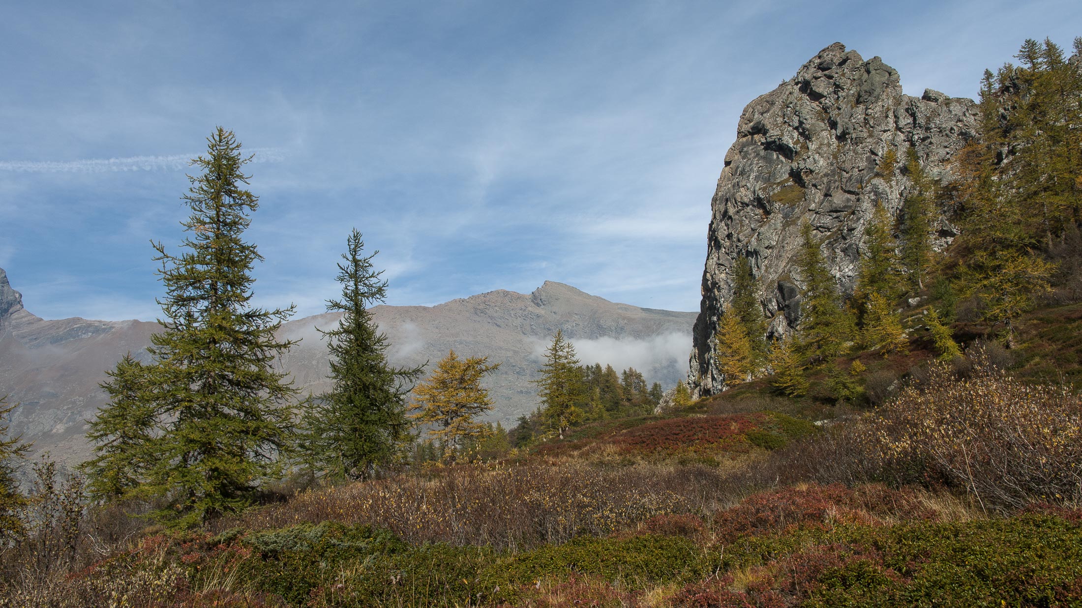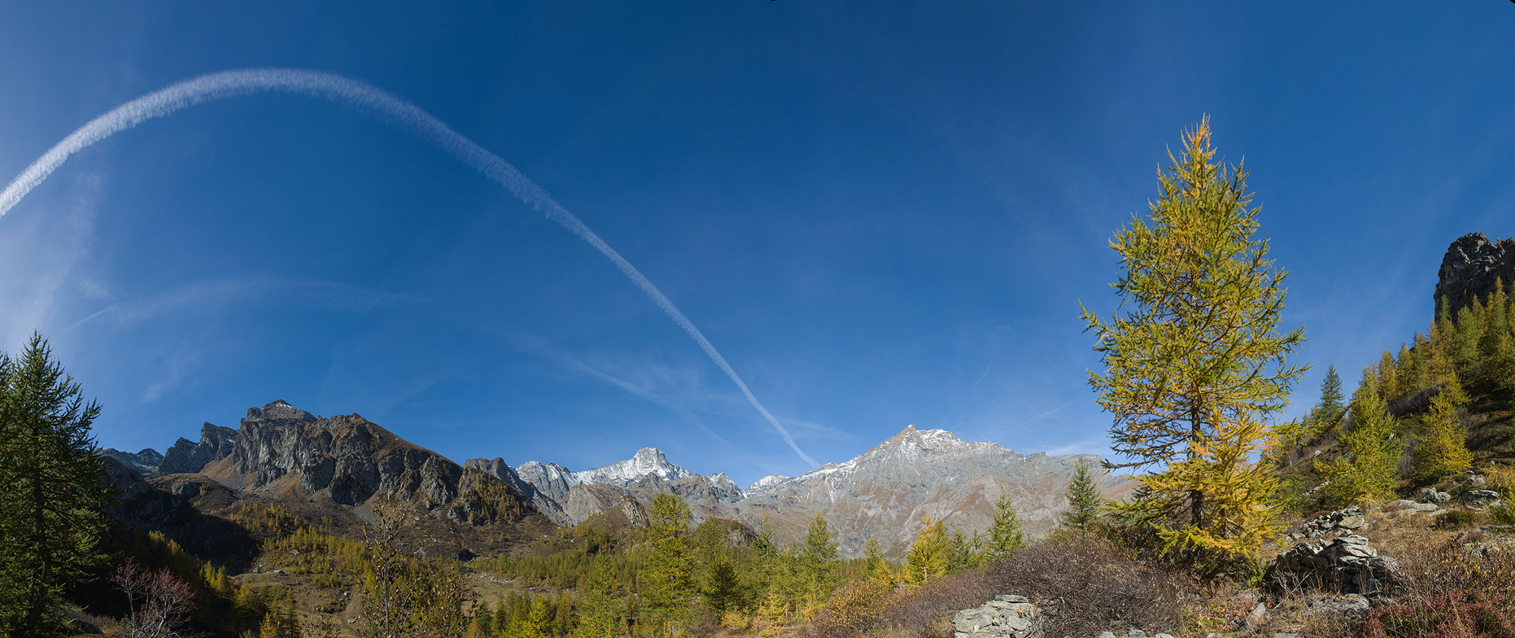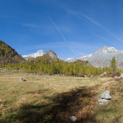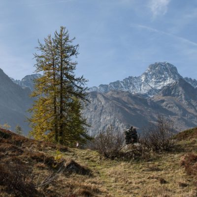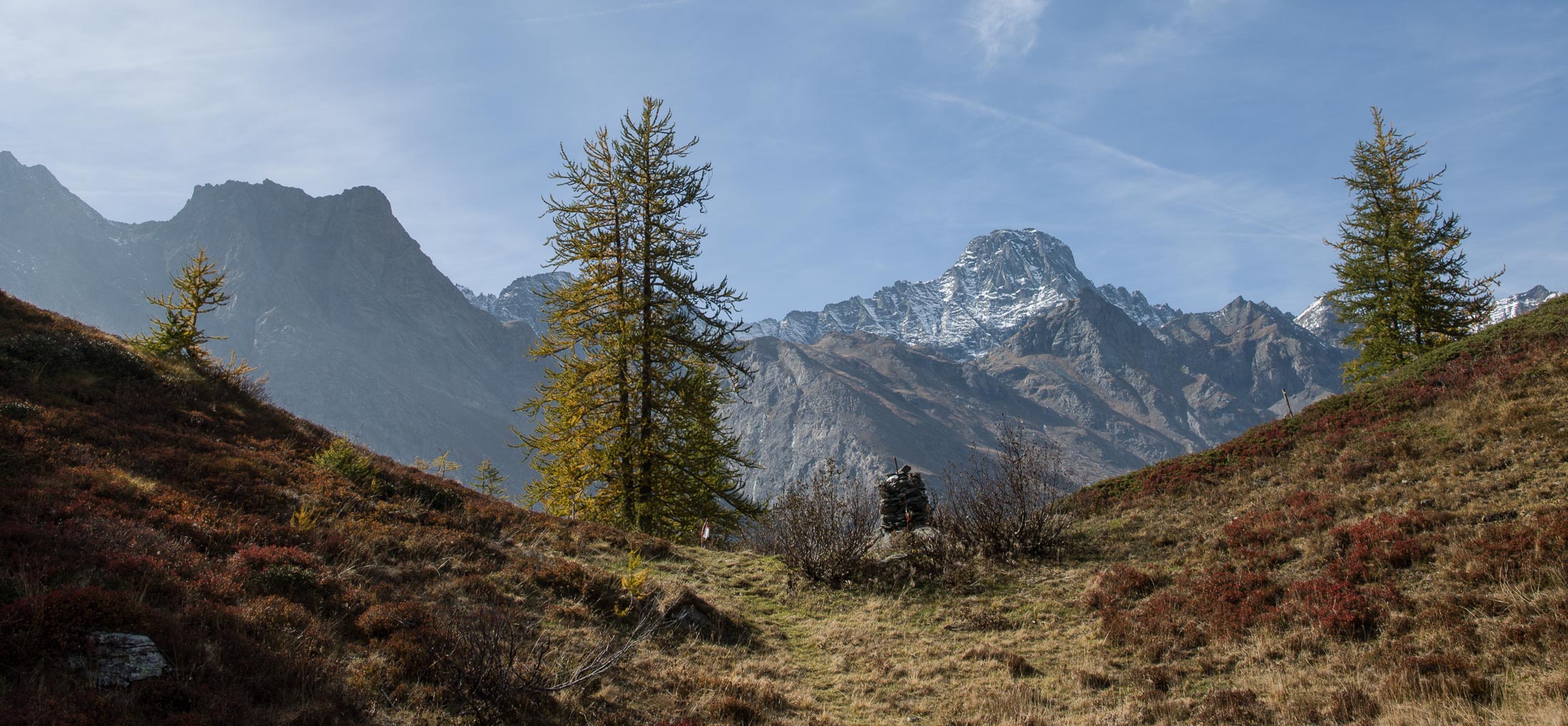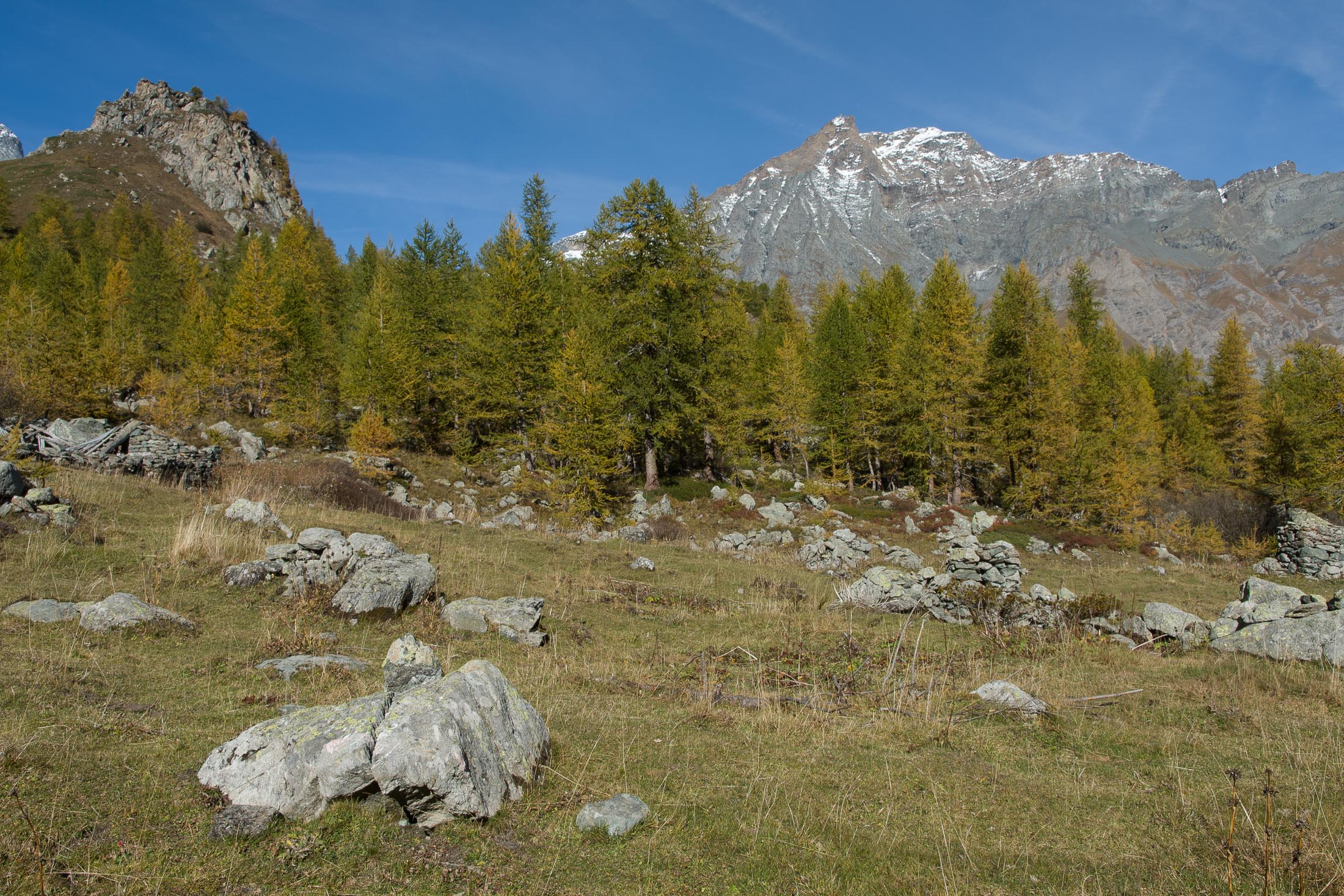 Ausgangspunkt der Tour ist der Pian della Mussa, eine zwei Kilometer lange Hochebene mit wunderschönem Lärchenbestand, welche einst von einem eiszeitlichen See geformt wurde. Der Pian della Mussa wurde (leider) mit einer Strasse erschlossen und ist ein von Turin bequem und relativ schnell erreichbares Ausflugsziel. An Sonntagen mit schönem Wetter verwandelt sich die malerische Hochfläche nicht selten in einen gigantischen Parkplatz. Hier erlebt man Italien hautnah, die einen gehen spazieren, die anderen kommen nur hierher gefahren, um im Restaurant zu Mittag zu essen. Andere wiederum zelebrieren ein riesiges Picknick auf der Wiese oder in der Nähe des Autos, eine überaus beliebte Freizeitbeschäftigung vieler Stadt-Italiener. Viele sind auch einfach nur auf der Suche nach etwas Abkühlung von der im Sommer brütend heissen Tiefebene. Wo soviele Menschen beisammen kommen, bleiben negative Auswüchse nicht aus. Wenigstens ein Minimum an Umweltbewusstsein ist leider bei vielen Italienern noch nicht in den Köpfen angekommen. Nicht selten wird Müll einfach in der Landschaft zurückgelassen, geschweige denn ist man bereit, diesen bei der Entsorgung zu trennen. 100 oder 200 km mit dem Auto, nur für ein Picknick im Grünen? Ist das heute noch zeitgemäss? Fragen über Fragen in einer grenzenlos (über)motorisierten Nation. Der Rummel beschränkt sich jedoch nur auf die Ebene selbst oder auf die Restaurants in der näheren Umgebung, am frühen Abend ist der Spuk vorbei und es kehrt Ruhe ein. Unter der Woche begegnet man hier bis auf den Ferienmonat August kaum jemandem. Zwischen November und April bleibt die Strasse aufgrund der Wintersperre geschlossen.