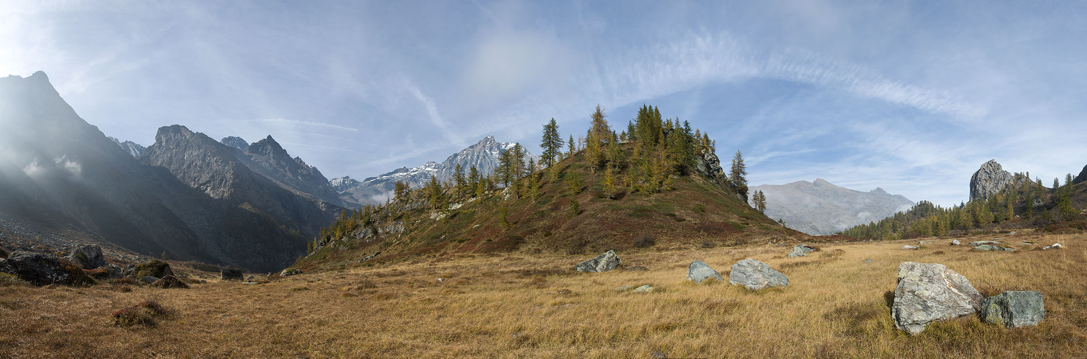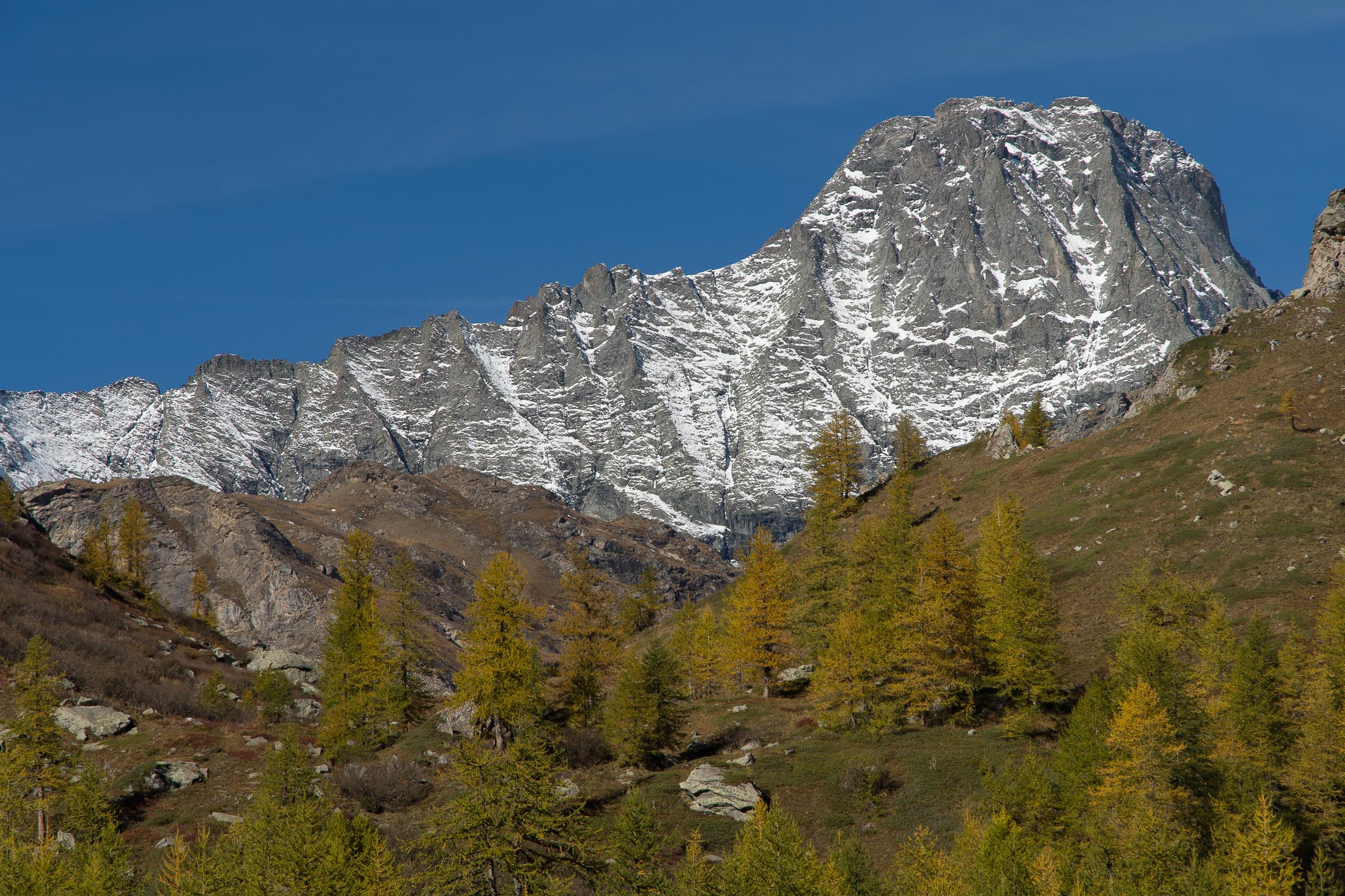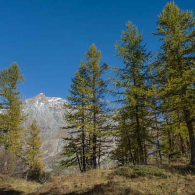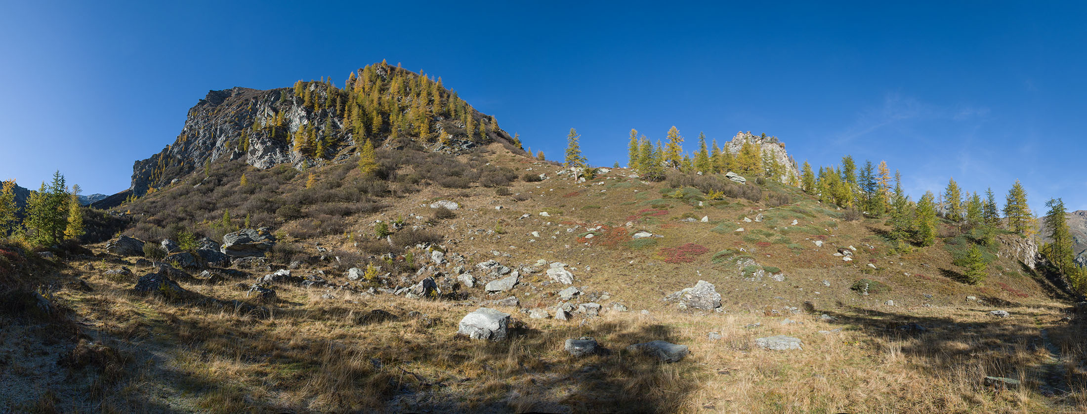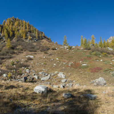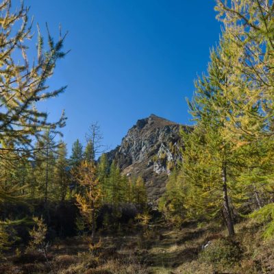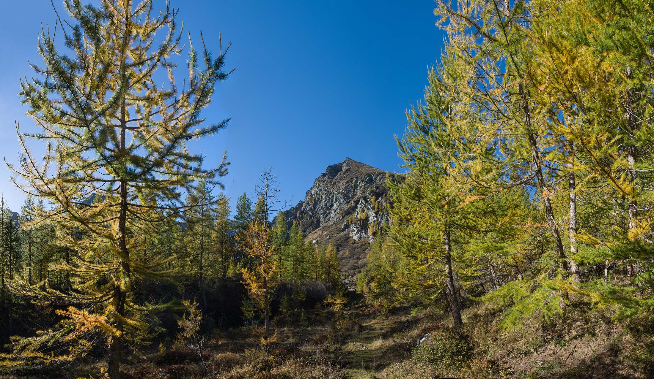 Ausgangspunkt der Tour ist der Pian della Mussa, eine zwei Kilometer lange Hochebene mit wunderschönem Lärchenbestand, welche einst von einem eiszeitlichen See geformt wurde. Der Pian della Mussa wurde (leider) mit einer Strasse erschlossen und ist ein von Turin bequem und relativ schnell erreichbares Ausflugsziel. An Sonntagen mit schönem Wetter verwandelt sich die malerische Hochfläche nicht selten in einen gigantischen Parkplatz. Hier erlebt man Italien hautnah, die einen gehen spazieren, die anderen kommen nur hierher gefahren, um im Restaurant zu Mittag zu essen. Andere wiederum zelebrieren ein riesiges Picknick auf der Wiese oder in der Nähe des Autos, eine überaus beliebte Freizeitbeschäftigung vieler Stadt-Italiener. Viele sind auch einfach nur auf der Suche nach etwas Abkühlung von der im Sommer brütend heissen Tiefebene. Wo soviele Menschen beisammen kommen, bleiben negative Auswüchse nicht aus. Wenigstens ein Minimum an Umweltbewusstsein ist leider bei vielen Italienern noch nicht in den Köpfen angekommen. Nicht selten wird Müll einfach in der Landschaft zurückgelassen, geschweige denn ist man bereit, diesen bei der Entsorgung zu trennen. 100 oder 200 km mit dem Auto, nur für ein Picknick im Grünen? Ist das heute noch zeitgemäss? Fragen über Fragen in einer grenzenlos (über)motorisierten Nation. Der Rummel beschränkt sich jedoch nur auf die Ebene selbst oder auf die Restaurants in der näheren Umgebung, am frühen Abend ist der Spuk vorbei und es kehrt Ruhe ein. Unter der Woche begegnet man hier bis auf den Ferienmonat August kaum jemandem. Zwischen November und April bleibt die Strasse aufgrund der Wintersperre geschlossen.