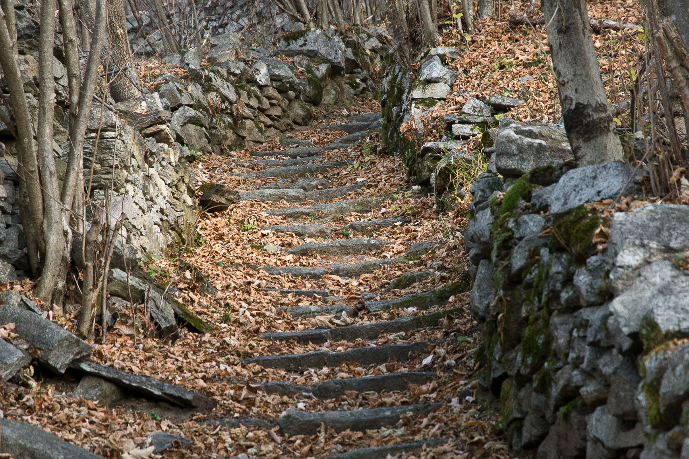 Keine, auch mit Turnschuhen geeignet. Orientierung problemlos, in der Regel auch ohne Karte möglich.