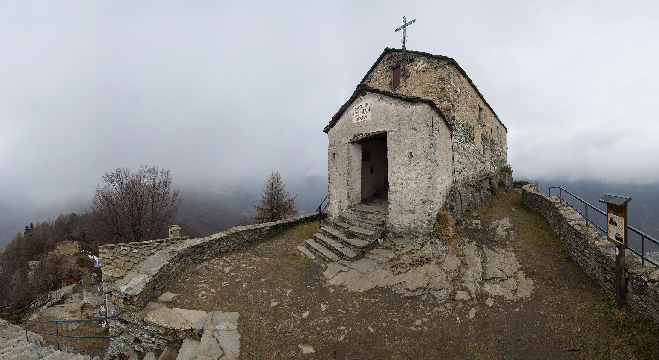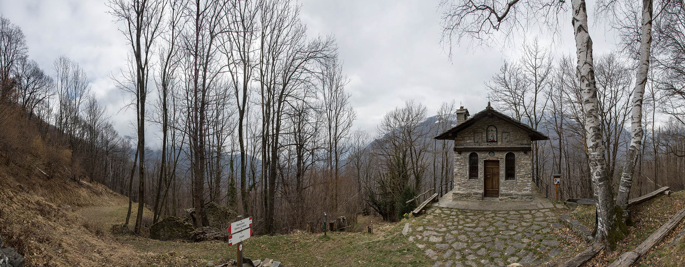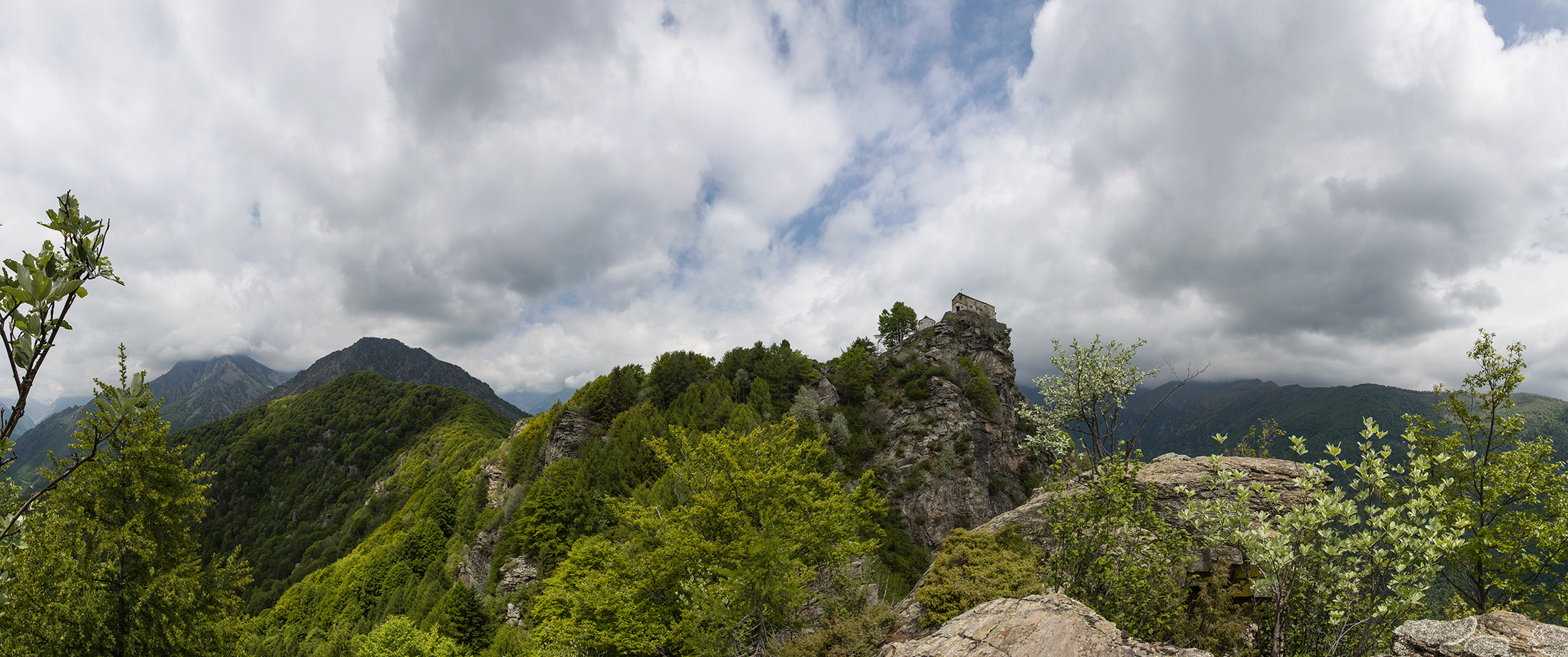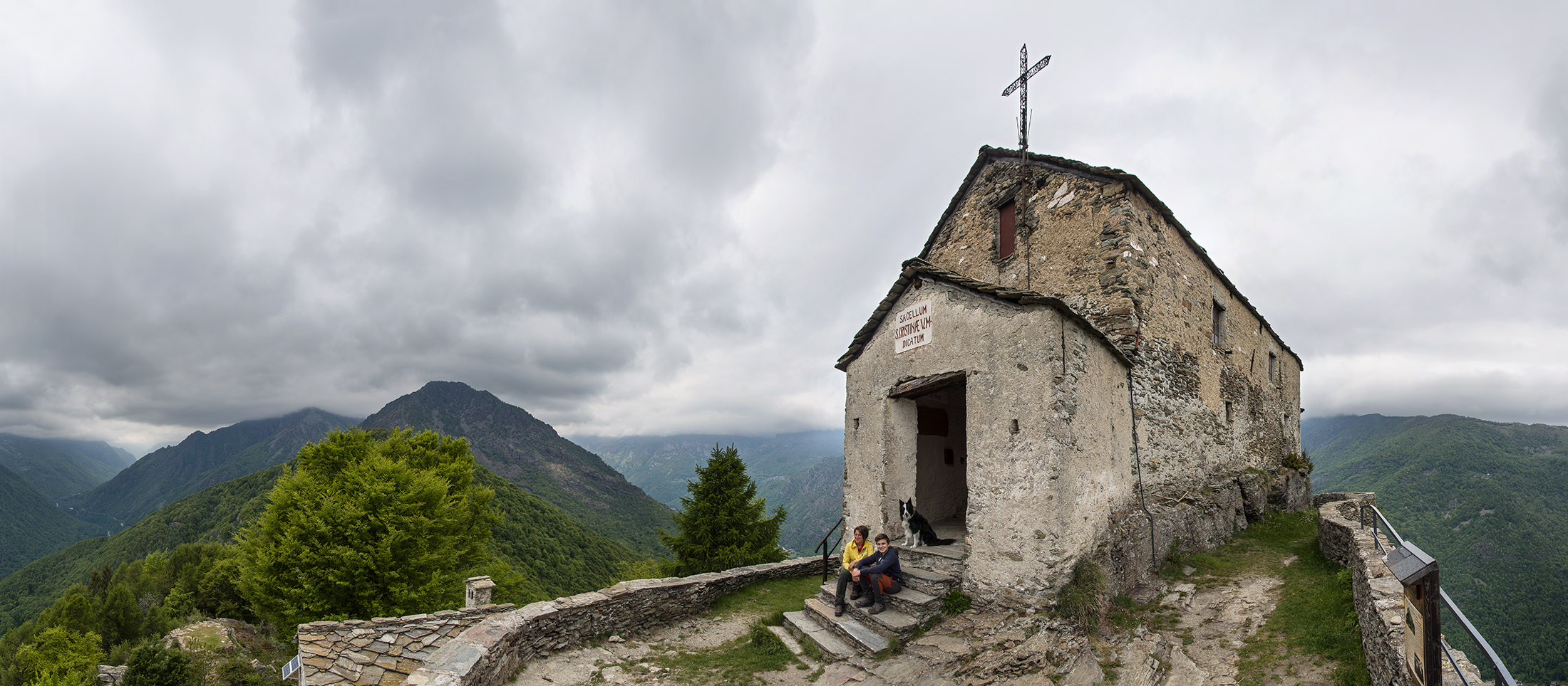 Nach einer Weile erreicht man den Pian di Ceres (891 m), eine ehemalige Sommersiedlung auf einer aussichtsreichen Lichtung, die heute nicht mehr bewohnt ist. Verschlossene Türen und Fenster, an den Häusern bröckelt der Putz. Es ist still, nur die Blätter der Bäume rascheln im Wind, Menschen scheinen hier schon lange nicht mehr zu wirtschaften. Die Umgebung versinkt im üppigen Grün, wo einst Tiere weideten, stehen heute wieder Bäume und wildes Gestrüpp. Ein stimmungsvoller und friedlich dahinschlummernder Ort, mit traurigem Beigeschmack. Jenseits der Gebäude mündet die Mulattiera in einen unbefestigten Fahrweg, dem man einen kurzen Moment folgt. Am Wegesrand einige verstreute Ruinen, verwildertes Kulturland und die kleine Cappella degli Appestati (940 m). Zumindest der Glaube an Gott scheint hier die Zivilisation überdauert zu haben. Nach wenigen Minuten zweigt rechts die Fortsetzung der Mulattiera ab, kurz darauf kommt man an einer sogenannten Balm vorbei. Eine Balm ist ein meist an den Rändern abgemauerter Felsüberhang, der den früheren Bergbauern als Lagerstätte, Unterschlupf, an manchen Orten sogar als einfache Behausung diente. Der Weg wird steiler, nach einer Weile passiert man die Cappella della Madonna degli Angeli (1080 m). Das beschauliche Kirchlein steht auf einer kleinen Lichtung im Wald und wird von engagierten Einheimischen in ehrenamtlicher Arbeit gepflegt und instandgehalten. Im weiteren Verlauf windet sich der einfach zu begehende Weg zwischen knorrigen Kiefern hinauf auf einen bewaldeten Rücken. Hier lohnt ein ganz kurzer Abstecher, auf Pfadspuren steigt man in Kürze auf eine felsige Anhöhe. Zur Belohnung gibt es bereits einen kleinen Vorgeschmack auf das Ziel des Tages, der Blick auf das gegenüberliegende Santuario di Santa Cristina ist wirklich grandios. Von dem schönen Aussichtspunkt zurück zum Hauptweg, dann geht es überraschend kurz bergab, kurz darauf darf man die verlorenen Höhenmeter prompt wieder aufsteigen. Zum Schluss noch eine steile Treppe hinauf, ein schweisstreibendes Vergnügen. Ziel erreicht. An heissen Sommertagen ist man gekocht, wenn man hier oben ankommt. Erst mal verschnaufen, dann in aller Ruhe umschauen. Hinter den jahrhundertealten dicken Mauern, die das Kirchenareal umziehen, tun sich Abgründe auf, ziemlich steile. Das Santuario di Santa Cristina (1340 m) ist eine spektakulär auf einem exponierten Felsen gelegene Wallfahrtskirche aus dem 15. Jahrhundert. Sie befindet am unmittelbaren Ende des Kammes, der das Val d‘Ala und das Val Grande di Lanzo voneinander trennt, mit schönem Panorama über die beiden Täler.
