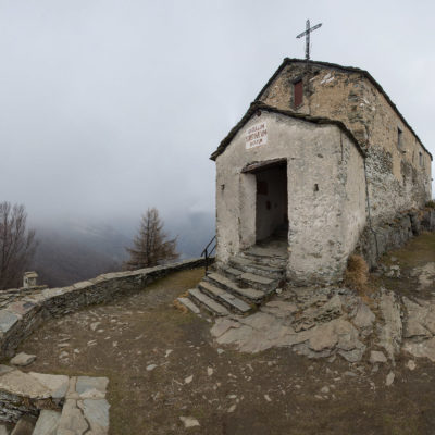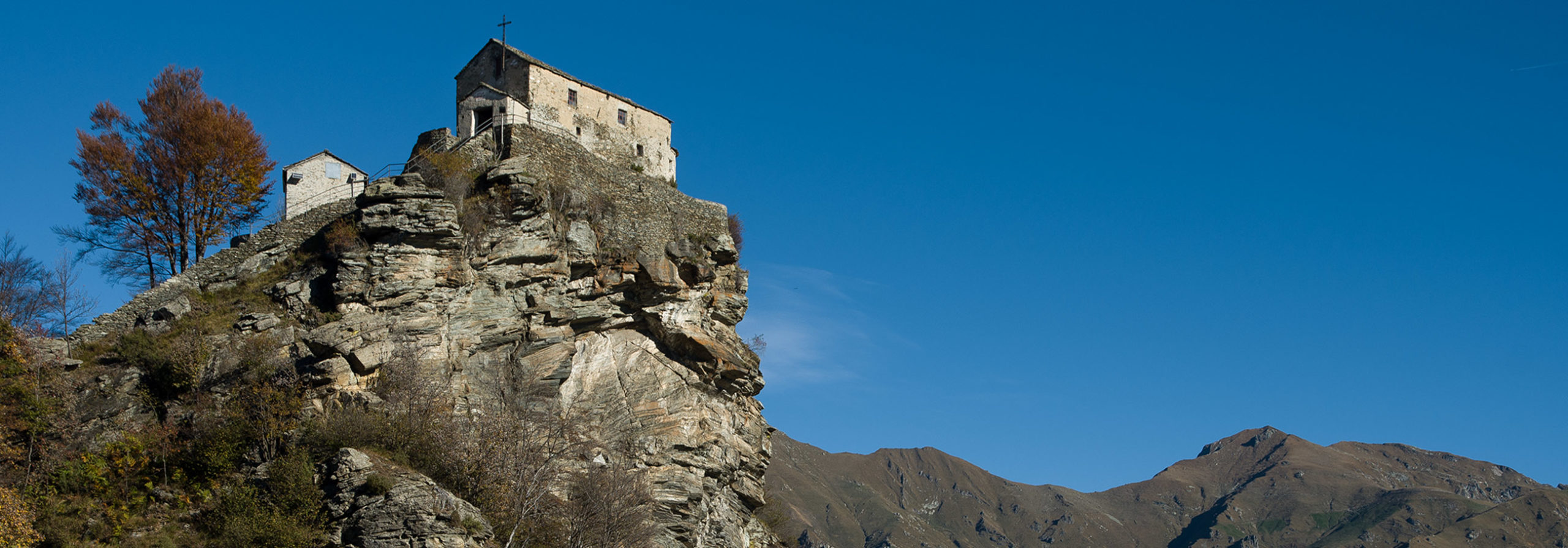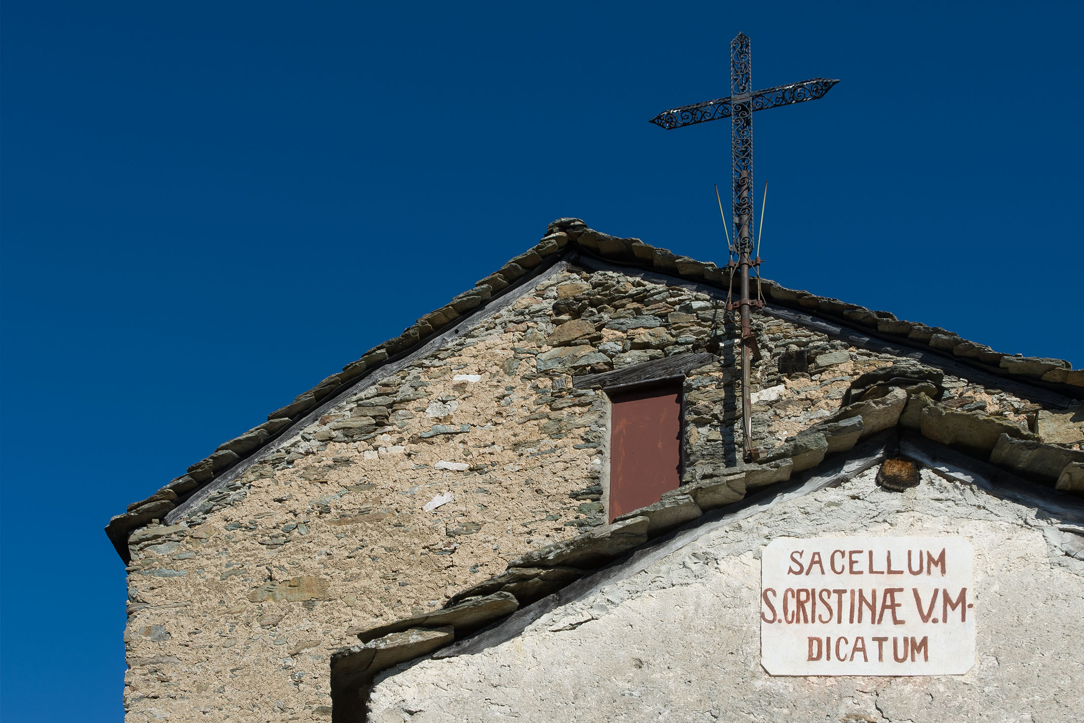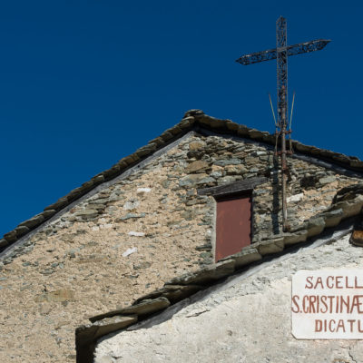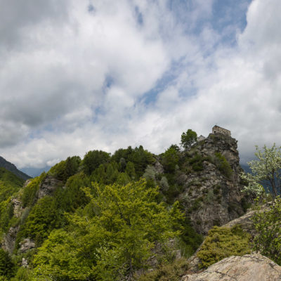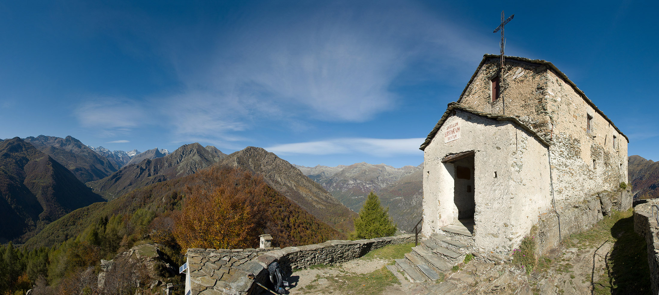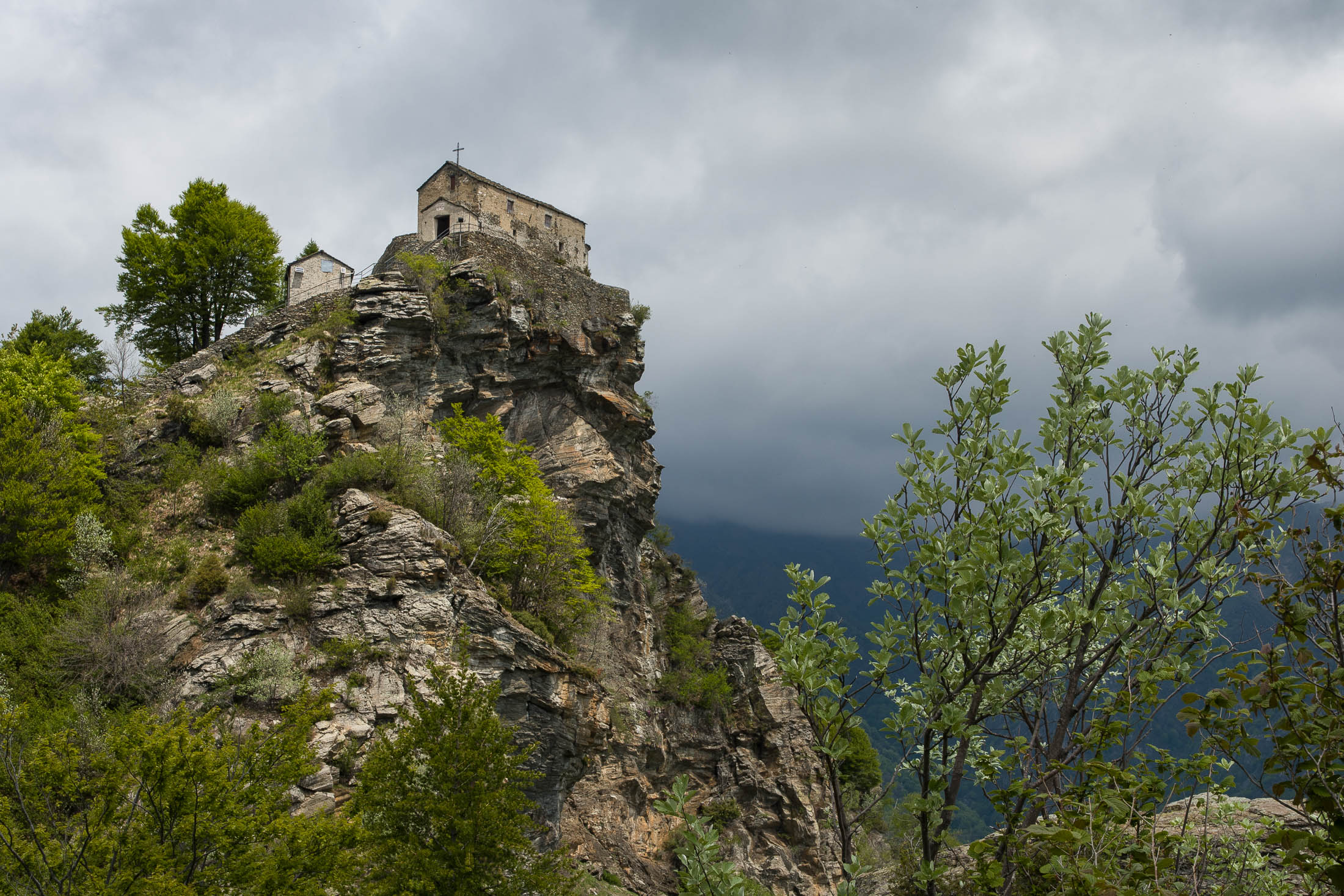 Nach einer Weile erreicht man den Pian di Ceres (891 m), eine ehemalige Sommersiedlung auf einer aussichtsreichen Lichtung, die heute nicht mehr bewohnt ist. Verschlossene Türen und Fenster, an den Häusern bröckelt der Putz. Es ist still, nur die Blätter der Bäume rascheln im Wind, Menschen scheinen hier schon lange nicht mehr zu wirtschaften. Die Umgebung versinkt im üppigen Grün, wo einst Tiere weideten, stehen heute wieder Bäume und wildes Gestrüpp. Ein stimmungsvoller und friedlich dahinschlummernder Ort, mit traurigem Beigeschmack. Jenseits der Gebäude mündet die Mulattiera in einen unbefestigten Fahrweg, dem man einen kurzen Moment folgt. Am Wegesrand einige verstreute Ruinen, verwildertes Kulturland und die kleine Cappella degli Appestati (940 m). Zumindest der Glaube an Gott scheint hier die Zivilisation überdauert zu haben. Nach wenigen Minuten zweigt rechts die Fortsetzung der Mulattiera ab, kurz darauf kommt man an einer sogenannten Balm vorbei. Eine Balm ist ein meist an den Rändern abgemauerter Felsüberhang, der den früheren Bergbauern als Lagerstätte, Unterschlupf, an manchen Orten sogar als einfache Behausung diente. Der Weg wird steiler, nach einer Weile passiert man die Cappella della Madonna degli Angeli (1080 m). Das beschauliche Kirchlein steht auf einer kleinen Lichtung im Wald und wird von engagierten Einheimischen in ehrenamtlicher Arbeit gepflegt und instandgehalten. Im weiteren Verlauf windet sich der einfach zu begehende Weg zwischen knorrigen Kiefern hinauf auf einen bewaldeten Rücken. Hier lohnt ein ganz kurzer Abstecher, auf Pfadspuren steigt man in Kürze auf eine felsige Anhöhe. Zur Belohnung gibt es bereits einen kleinen Vorgeschmack auf das Ziel des Tages, der Blick auf das gegenüberliegende Santuario di Santa Cristina ist wirklich grandios. Von dem schönen Aussichtspunkt zurück zum Hauptweg, dann geht es überraschend kurz bergab, kurz darauf darf man die verlorenen Höhenmeter prompt wieder aufsteigen. Zum Schluss noch eine steile Treppe hinauf, ein schweisstreibendes Vergnügen. Ziel erreicht. An heissen Sommertagen ist man gekocht, wenn man hier oben ankommt. Erst mal verschnaufen, dann in aller Ruhe umschauen. Hinter den jahrhundertealten dicken Mauern, die das Kirchenareal umziehen, tun sich Abgründe auf, ziemlich steile. Das Santuario di Santa Cristina (1340 m) ist eine spektakulär auf einem exponierten Felsen gelegene Wallfahrtskirche aus dem 15. Jahrhundert. Sie befindet am unmittelbaren Ende des Kammes, der das Val d‘Ala und das Val Grande di Lanzo voneinander trennt, mit schönem Panorama über die beiden Täler.