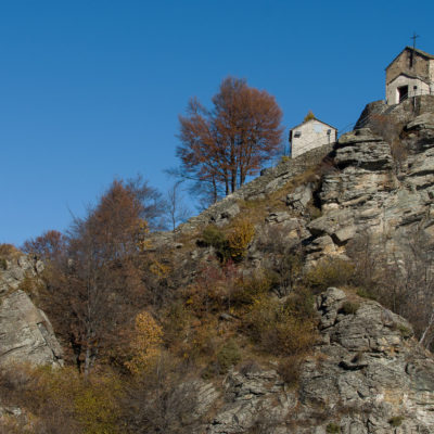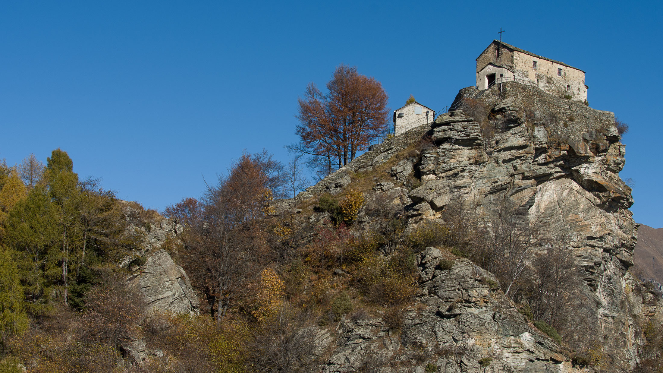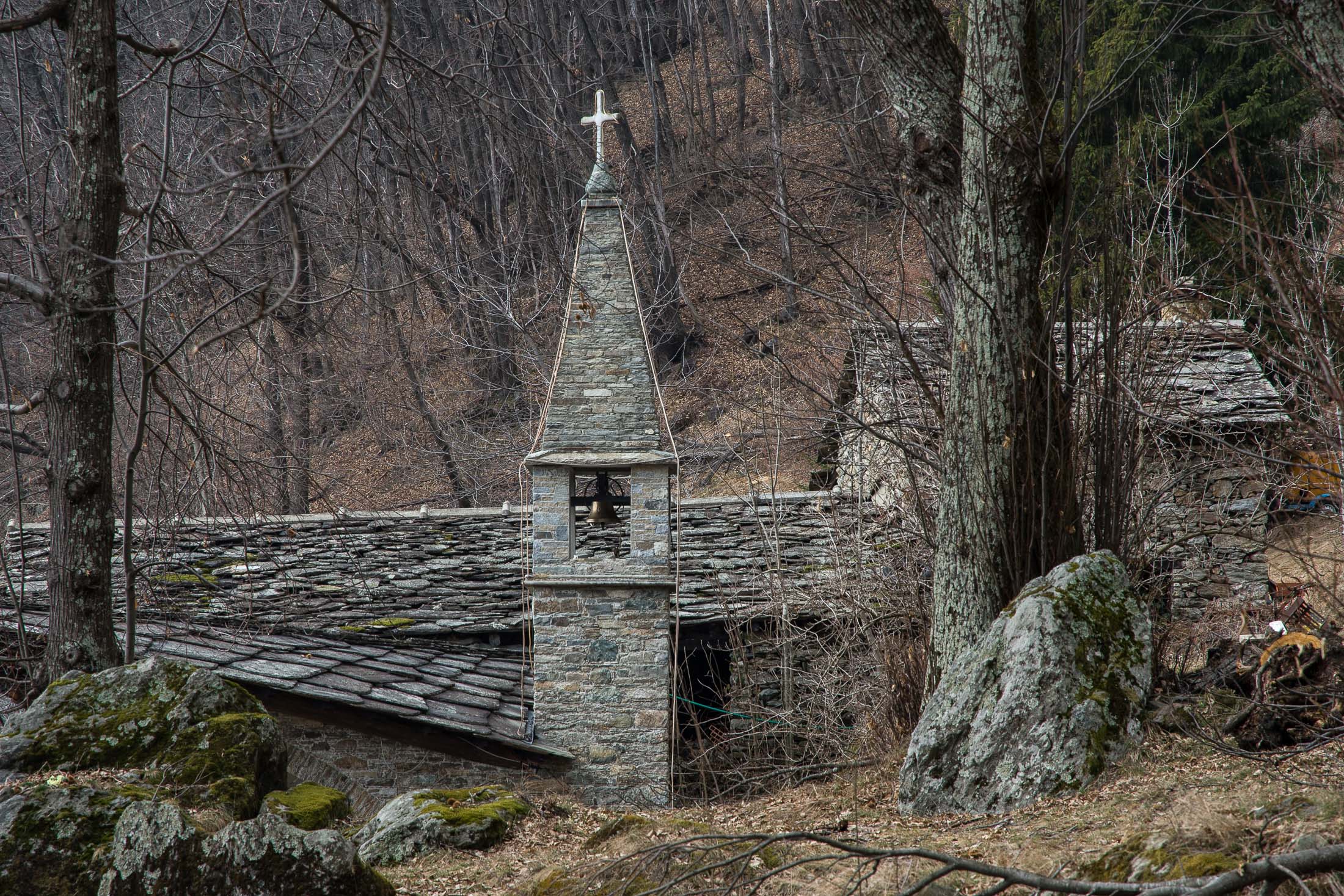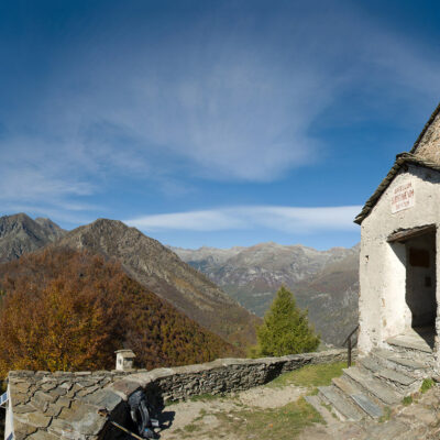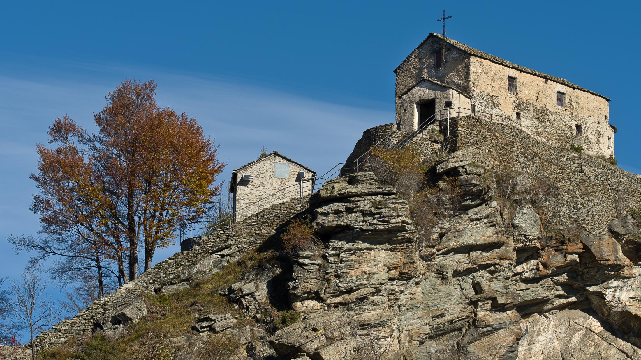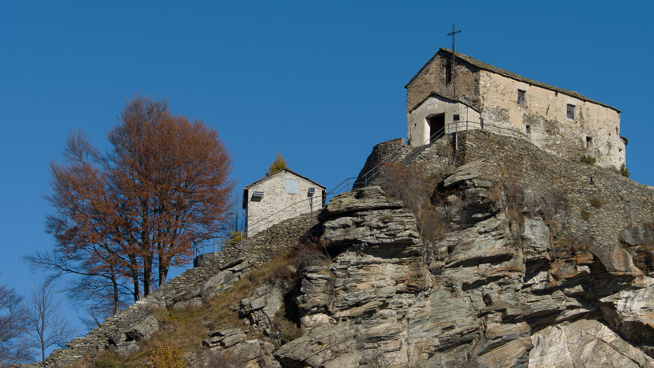 Nach einer Weile erreicht man den Pian di Ceres (891 m), eine ehemalige Sommersiedlung auf einer aussichtsreichen Lichtung, die heute nicht mehr bewohnt ist. Verschlossene Türen und Fenster, an den Häusern bröckelt der Putz. Es ist still, nur die Blätter der Bäume rascheln im Wind, Menschen scheinen hier schon lange nicht mehr zu wirtschaften. Die Umgebung versinkt im üppigen Grün, wo einst Tiere weideten, stehen heute wieder Bäume und wildes Gestrüpp. Ein stimmungsvoller und friedlich dahinschlummernder Ort, mit traurigem Beigeschmack. Jenseits der Gebäude mündet die Mulattiera in einen unbefestigten Fahrweg, dem man einen kurzen Moment folgt. Am Wegesrand einige verstreute Ruinen, verwildertes Kulturland und die kleine Cappella degli Appestati (940 m). Zumindest der Glaube an Gott scheint hier die Zivilisation überdauert zu haben. Nach wenigen Minuten zweigt rechts die Fortsetzung der Mulattiera ab, kurz darauf kommt man an einer sogenannten Balm vorbei. Eine Balm ist ein meist an den Rändern abgemauerter Felsüberhang, der den früheren Bergbauern als Lagerstätte, Unterschlupf, an manchen Orten sogar als einfache Behausung diente. Der Weg wird steiler, nach einer Weile passiert man die Cappella della Madonna degli Angeli (1080 m). Das beschauliche Kirchlein steht auf einer kleinen Lichtung im Wald und wird von engagierten Einheimischen in ehrenamtlicher Arbeit gepflegt und instandgehalten. Im weiteren Verlauf windet sich der einfach zu begehende Weg zwischen knorrigen Kiefern hinauf auf einen bewaldeten Rücken. Hier lohnt ein ganz kurzer Abstecher, auf Pfadspuren steigt man in Kürze auf eine felsige Anhöhe. Zur Belohnung gibt es bereits einen kleinen Vorgeschmack auf das Ziel des Tages, der Blick auf das gegenüberliegende Santuario di Santa Cristina ist wirklich grandios. Von dem schönen Aussichtspunkt zurück zum Hauptweg, dann geht es überraschend kurz bergab, kurz darauf darf man die verlorenen Höhenmeter prompt wieder aufsteigen. Zum Schluss noch eine steile Treppe hinauf, ein schweisstreibendes Vergnügen. Ziel erreicht. An heissen Sommertagen ist man gekocht, wenn man hier oben ankommt. Erst mal verschnaufen, dann in aller Ruhe umschauen. Hinter den jahrhundertealten dicken Mauern, die das Kirchenareal umziehen, tun sich Abgründe auf, ziemlich steile. Das Santuario di Santa Cristina (1340 m) ist eine spektakulär auf einem exponierten Felsen gelegene Wallfahrtskirche aus dem 15. Jahrhundert. Sie befindet am unmittelbaren Ende des Kammes, der das Val d‘Ala und das Val Grande di Lanzo voneinander trennt, mit schönem Panorama über die beiden Täler.