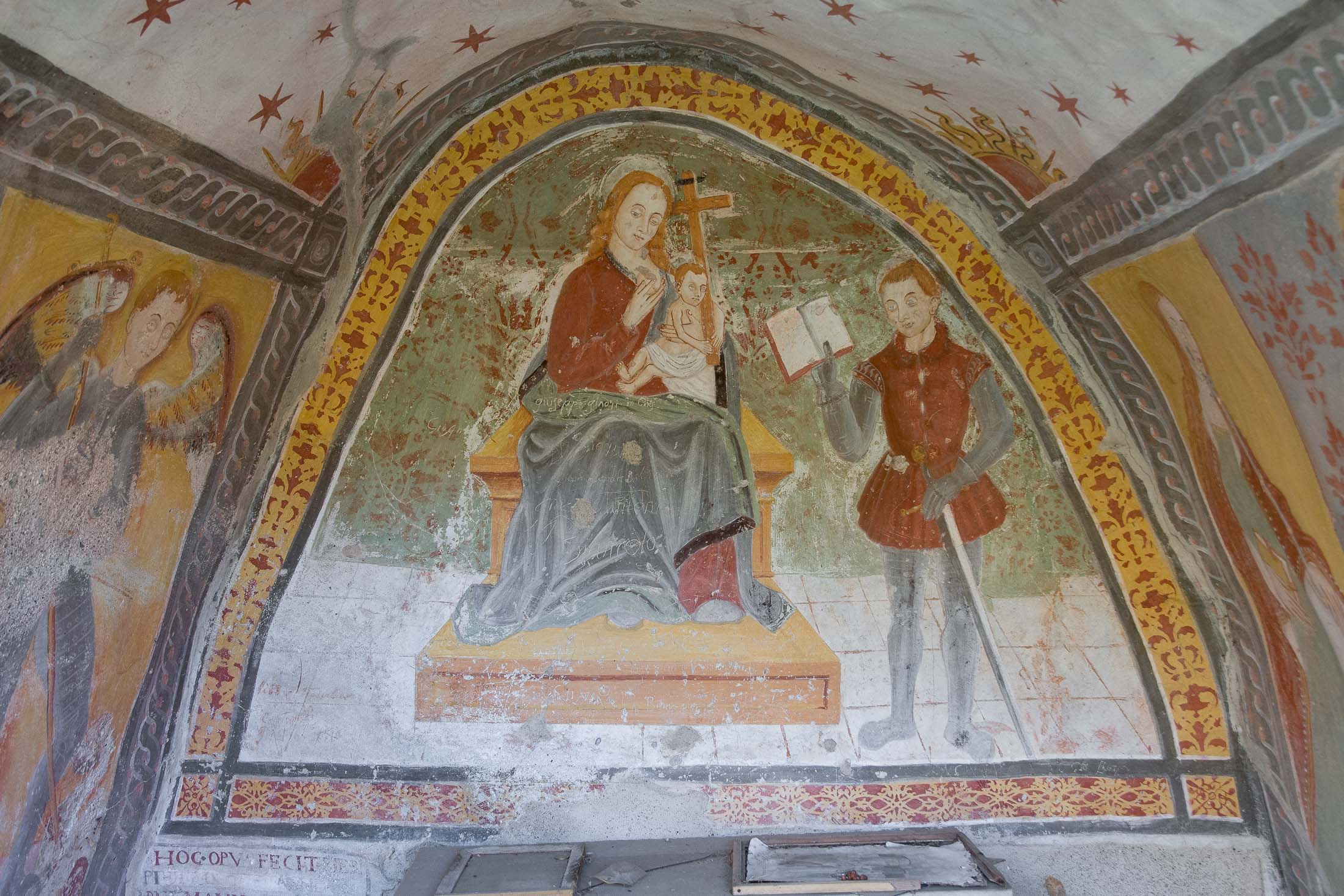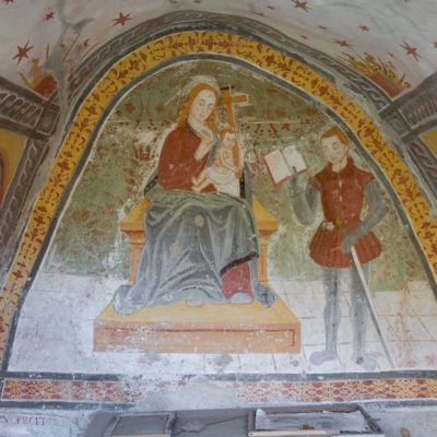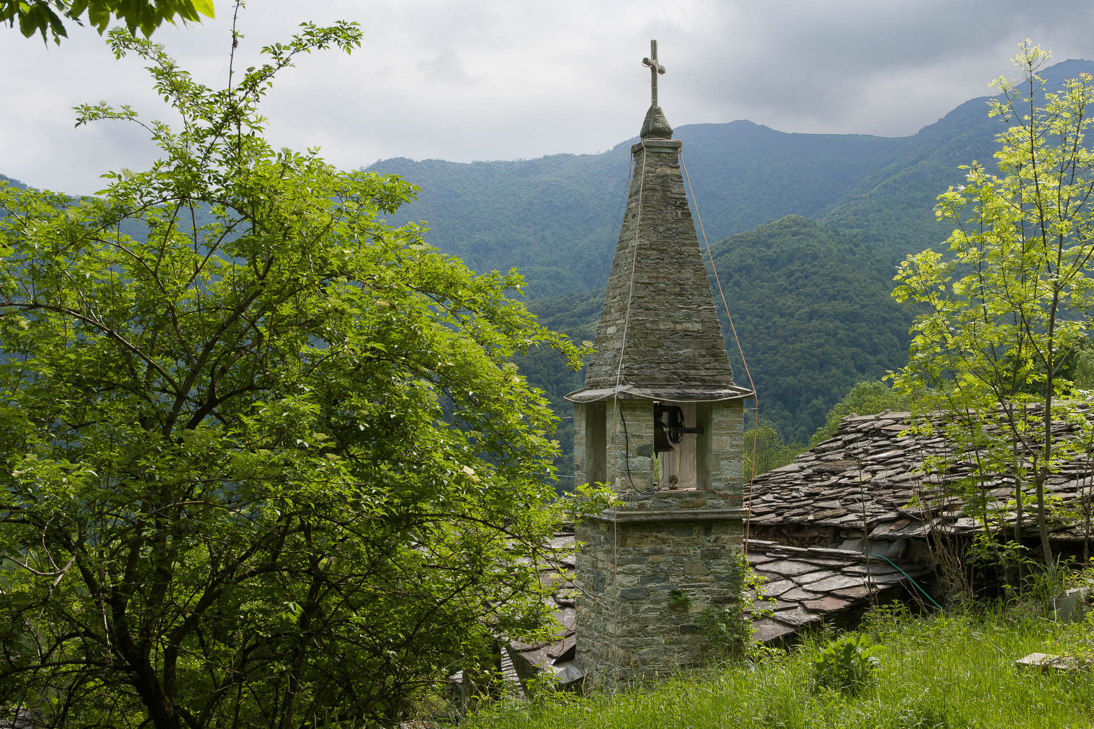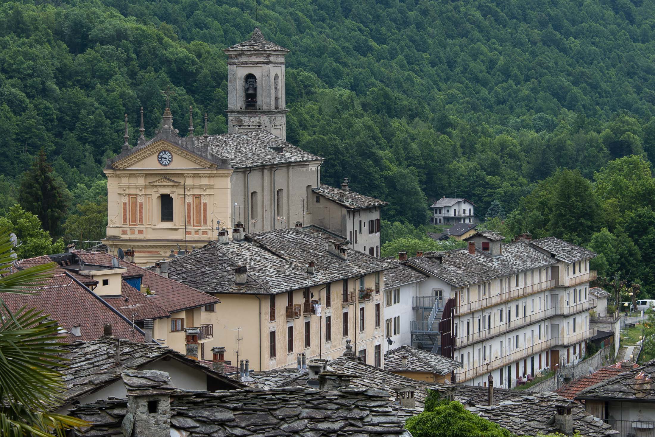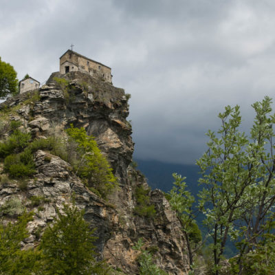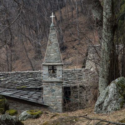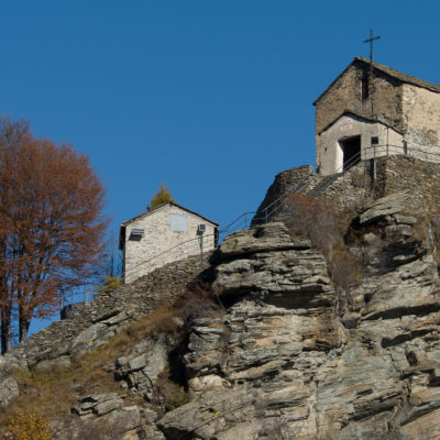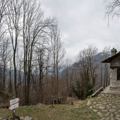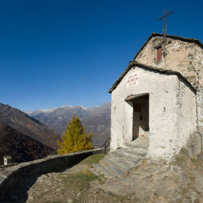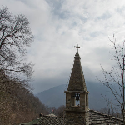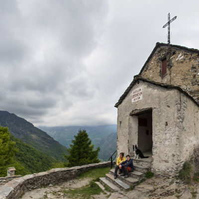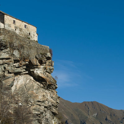 Nach einer Weile erreicht man den Pian di Ceres (891 m), eine ehemalige Sommersiedlung auf einer aussichtsreichen Lichtung, die heute nicht mehr bewohnt ist. Verschlossene Türen und Fenster, an den Häusern bröckelt der Putz. Es ist still, nur die Blätter der Bäume rascheln im Wind, Menschen scheinen hier schon lange nicht mehr zu wirtschaften. Die Umgebung versinkt im üppigen Grün, wo einst Tiere weideten, stehen heute wieder Bäume und wildes Gestrüpp. Ein stimmungsvoller und friedlich dahinschlummernder Ort, mit traurigem Beigeschmack. Jenseits der Gebäude mündet die Mulattiera in einen unbefestigten Fahrweg, dem man einen kurzen Moment folgt. Am Wegesrand einige verstreute Ruinen, verwildertes Kulturland und die kleine Cappella degli Appestati (940 m). Zumindest der Glaube an Gott scheint hier die Zivilisation überdauert zu haben. Nach wenigen Minuten zweigt rechts die Fortsetzung der Mulattiera ab, kurz darauf kommt man an einer sogenannten Balm vorbei. Eine Balm ist ein meist an den Rändern abgemauerter Felsüberhang, der den früheren Bergbauern als Lagerstätte, Unterschlupf, an manchen Orten sogar als einfache Behausung diente. Der Weg wird steiler, nach einer Weile passiert man die Cappella della Madonna degli Angeli (1080 m). Das beschauliche Kirchlein steht auf einer kleinen Lichtung im Wald und wird von engagierten Einheimischen in ehrenamtlicher Arbeit gepflegt und instandgehalten. Im weiteren Verlauf windet sich der einfach zu begehende Weg zwischen knorrigen Kiefern hinauf auf einen bewaldeten Rücken. Hier lohnt ein ganz kurzer Abstecher, auf Pfadspuren steigt man in Kürze auf eine felsige Anhöhe. Zur Belohnung gibt es bereits einen kleinen Vorgeschmack auf das Ziel des Tages, der Blick auf das gegenüberliegende Santuario di Santa Cristina ist wirklich grandios. Von dem schönen Aussichtspunkt zurück zum Hauptweg, dann geht es überraschend kurz bergab, kurz darauf darf man die verlorenen Höhenmeter prompt wieder aufsteigen. Zum Schluss noch eine steile Treppe hinauf, ein schweisstreibendes Vergnügen. Ziel erreicht. An heissen Sommertagen ist man gekocht, wenn man hier oben ankommt. Erst mal verschnaufen, dann in aller Ruhe umschauen. Hinter den jahrhundertealten dicken Mauern, die das Kirchenareal umziehen, tun sich Abgründe auf, ziemlich steile. Das Santuario di Santa Cristina (1340 m) ist eine spektakulär auf einem exponierten Felsen gelegene Wallfahrtskirche aus dem 15. Jahrhundert. Sie befindet am unmittelbaren Ende des Kammes, der das Val d‘Ala und das Val Grande di Lanzo voneinander trennt, mit schönem Panorama über die beiden Täler.