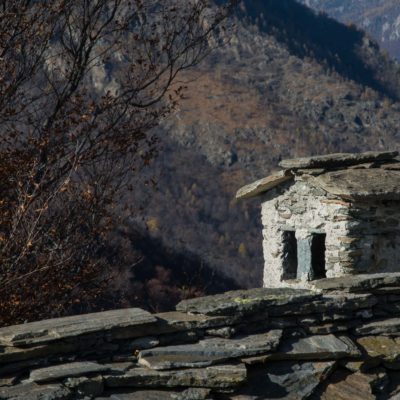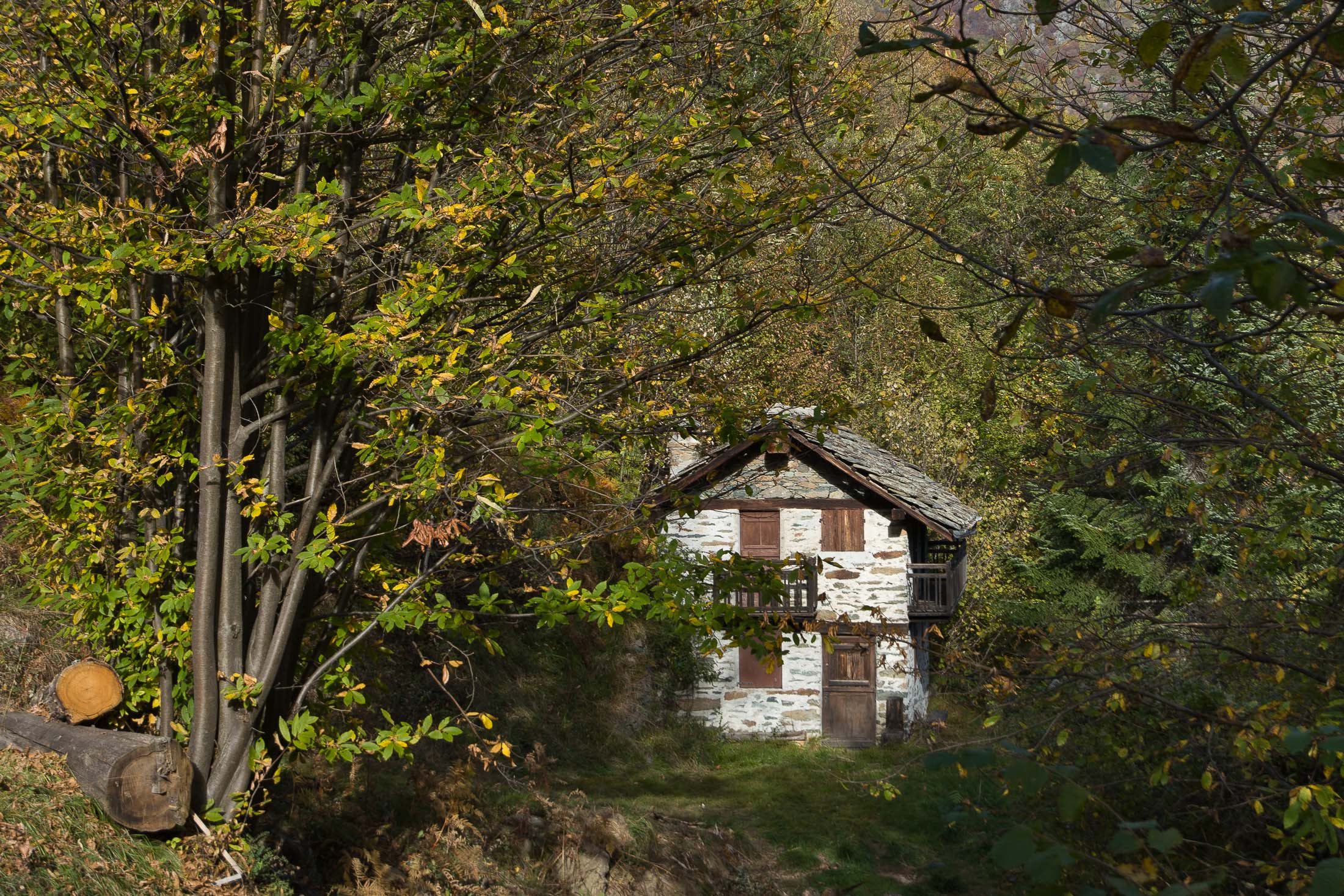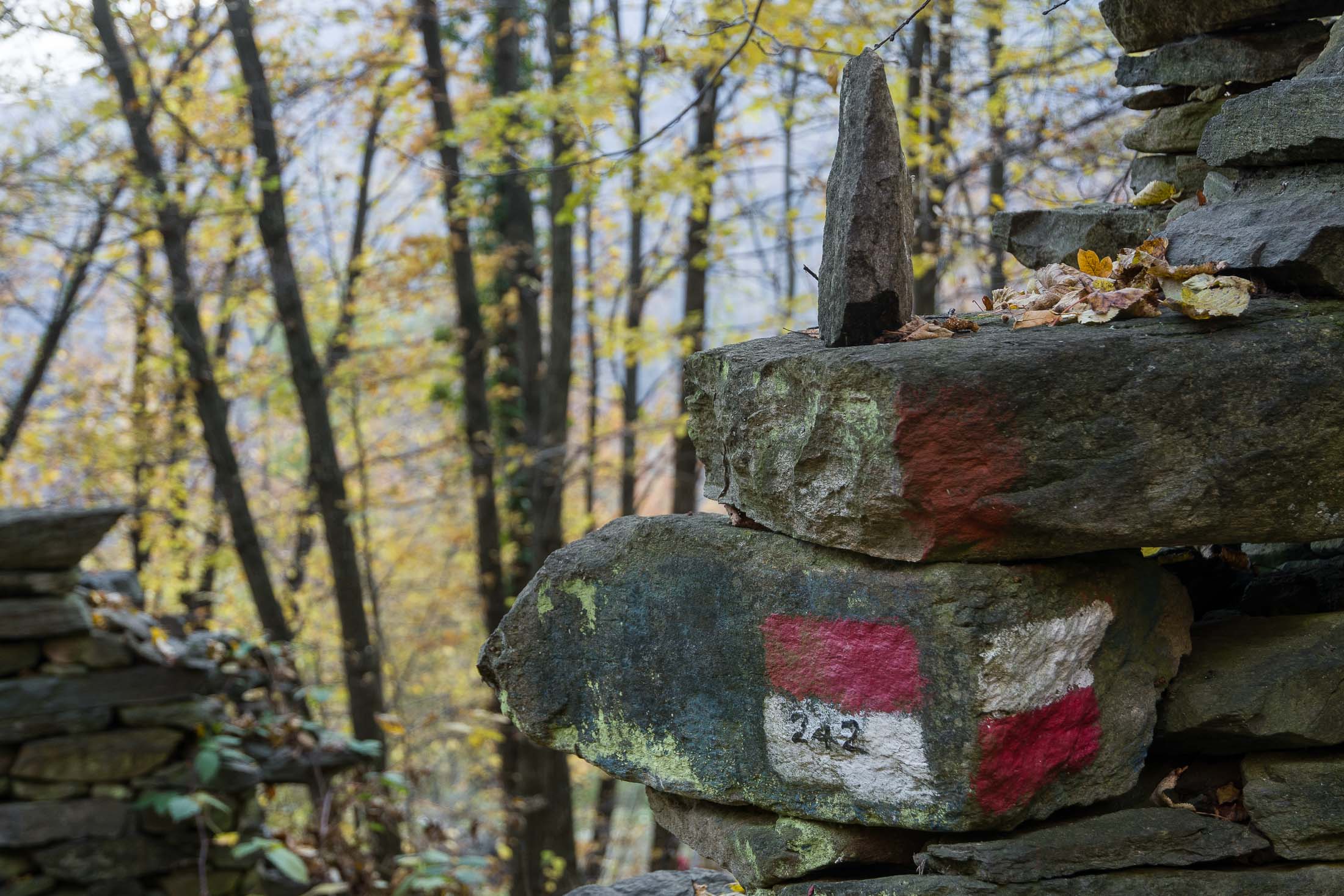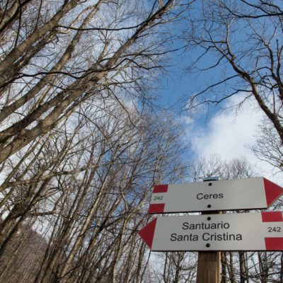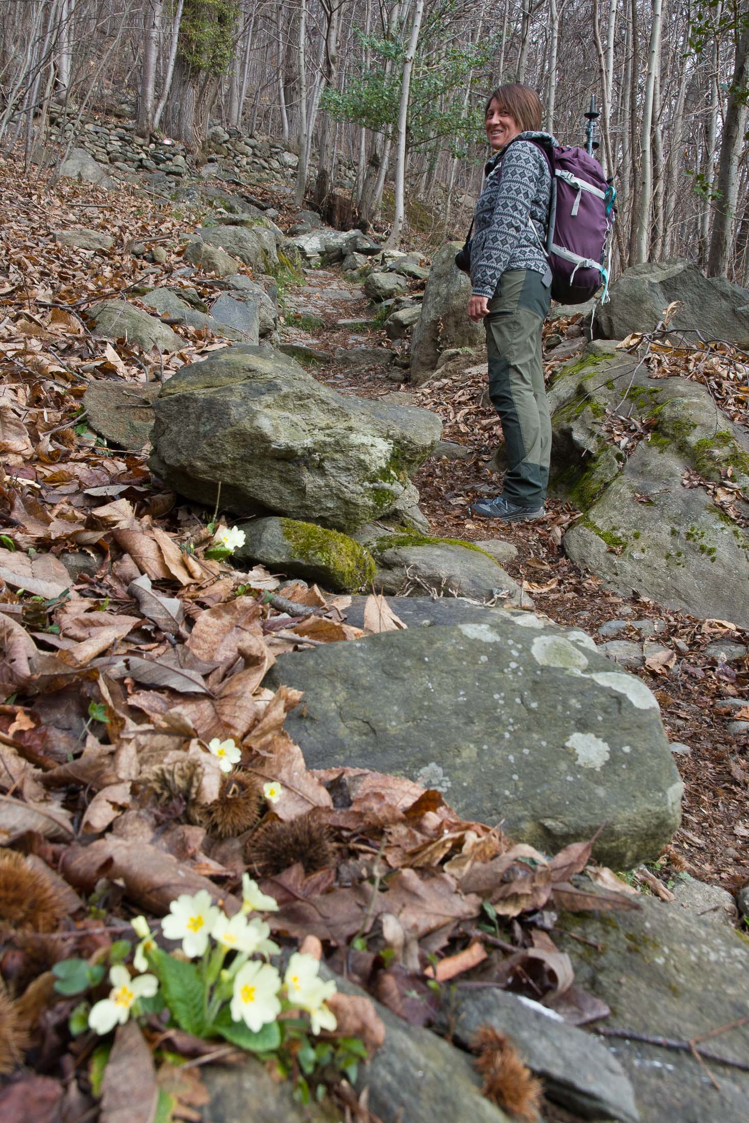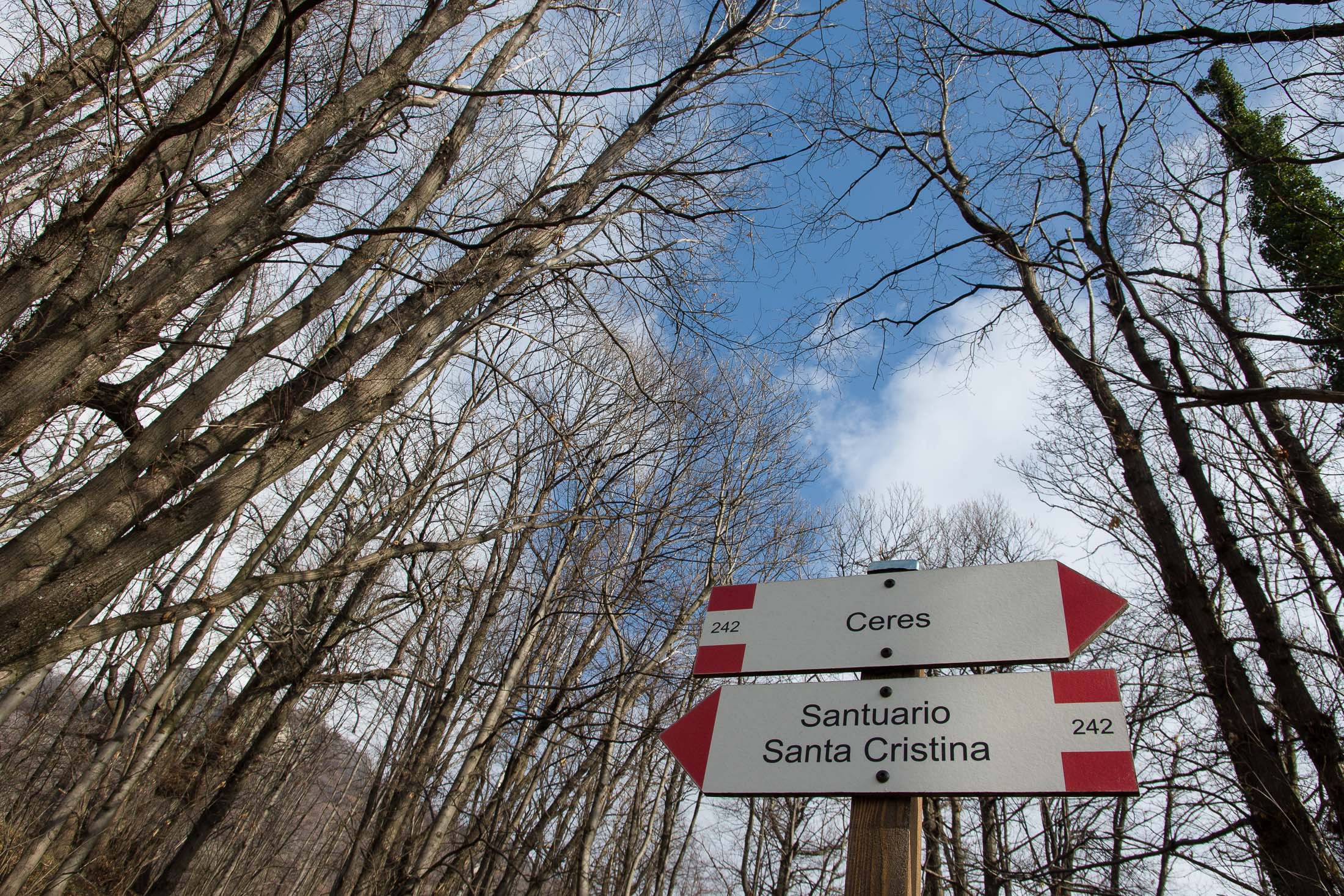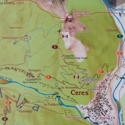 Die Wanderung beginnt in Ceres (703 m), ein kleiner Marktort an den Talausgängen der beiden Täler Val d‘Ala und Val Grande di Lanzo mit verwinkelten Gassen und lebendigen Plätzen. Vom Parkplatz an der Piazza Municipio vor der grossen Kirche geht es wenige Schritte abwärts zur Piazza Europa, dort die Via Roma nehmen, vorbei an einigen sehenswerten Häuserzeilen bis zu einem Wegweiser. Weiter auf der Via Cavalieri di Vittorio Veneti hinauf bis zum oberen Ortsende. Hinter den letzten Häusern beginnt eine wunderschöne, teils gepflasterte Mulattiera (= Saumweg oder Maultierweg), die anfangs auf einer Treppe entlang von aufgeschichteten Trockensteinmauern durch Kastanienwald führt. Die Früchte der Esskastanie, auch Maronen genannt, war eines der Grundnahrungsmittel der einstigen Bergbewohner, unter anderem für die Herstellung von Brot. Kastanien gedeihen auf der Alpensüdseite an sonnigen warmen Hängen gebietsweise bis zu einer Höhe von 1200 m.