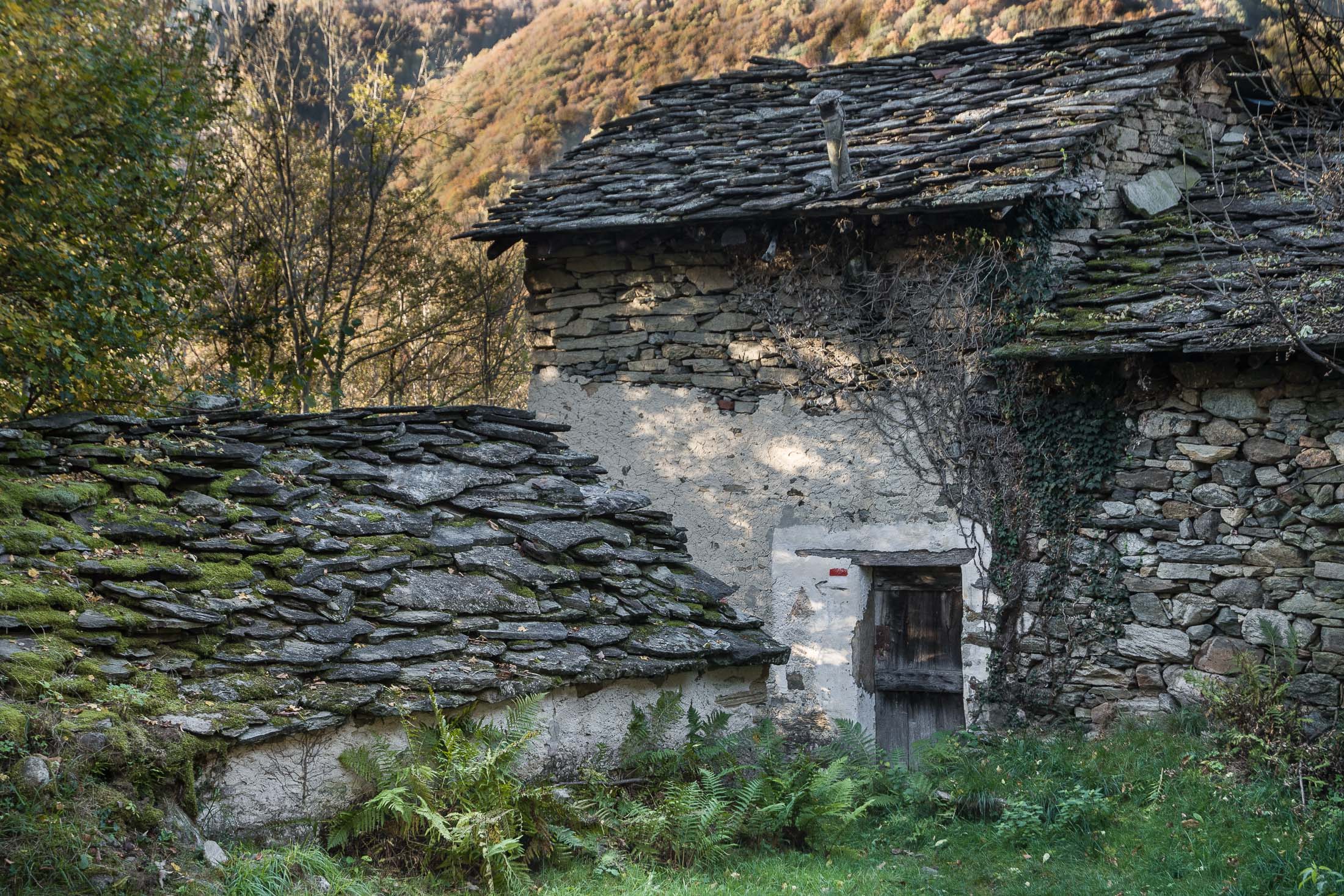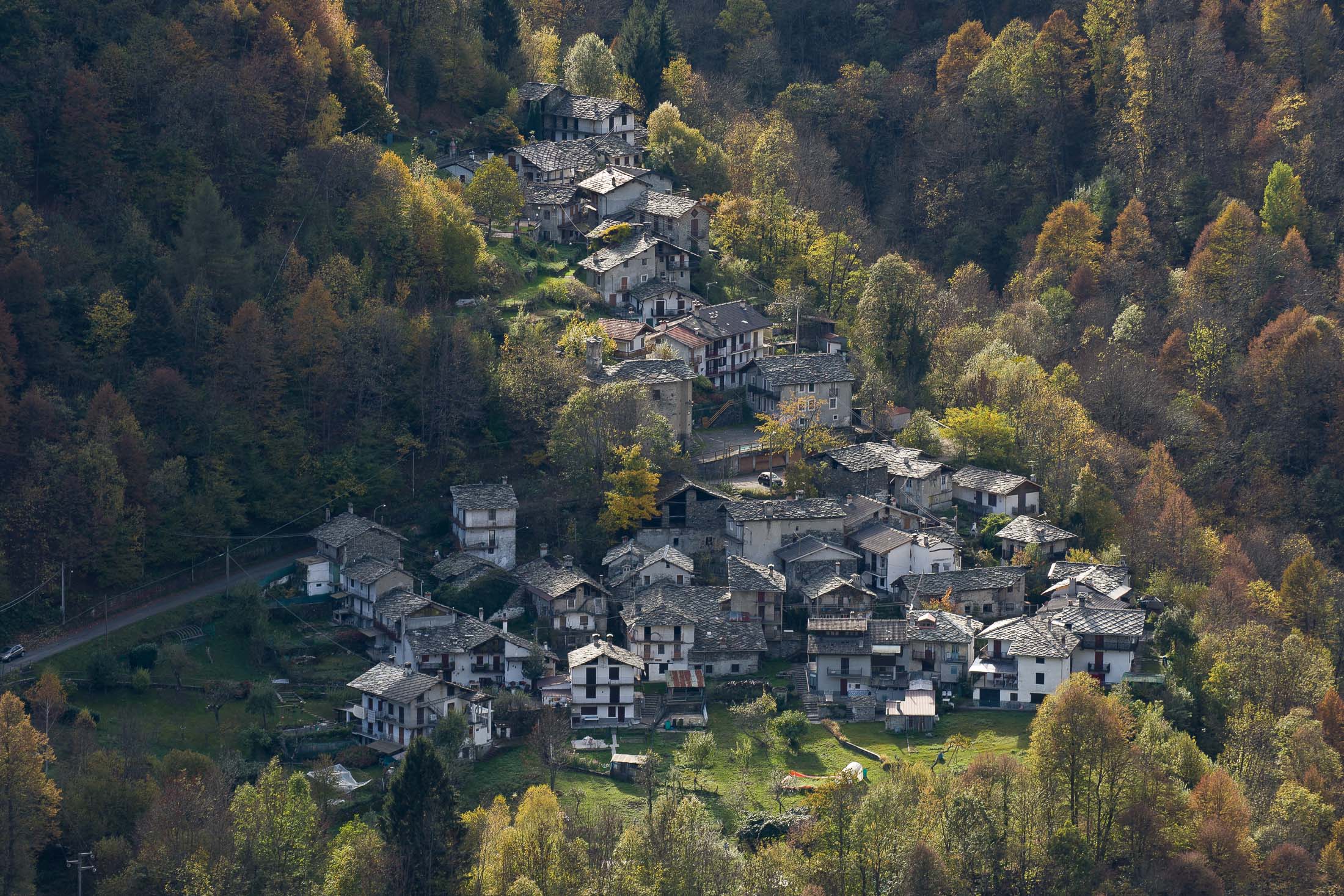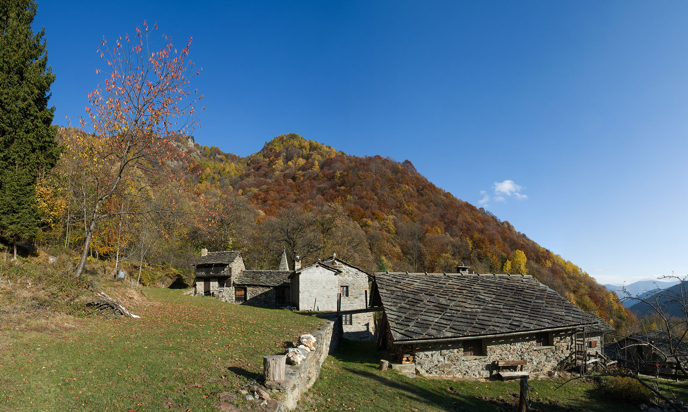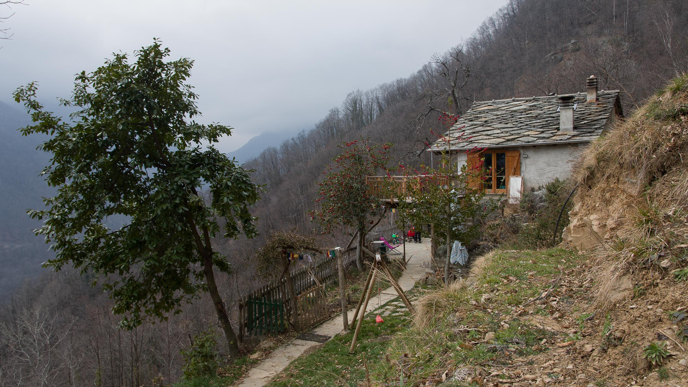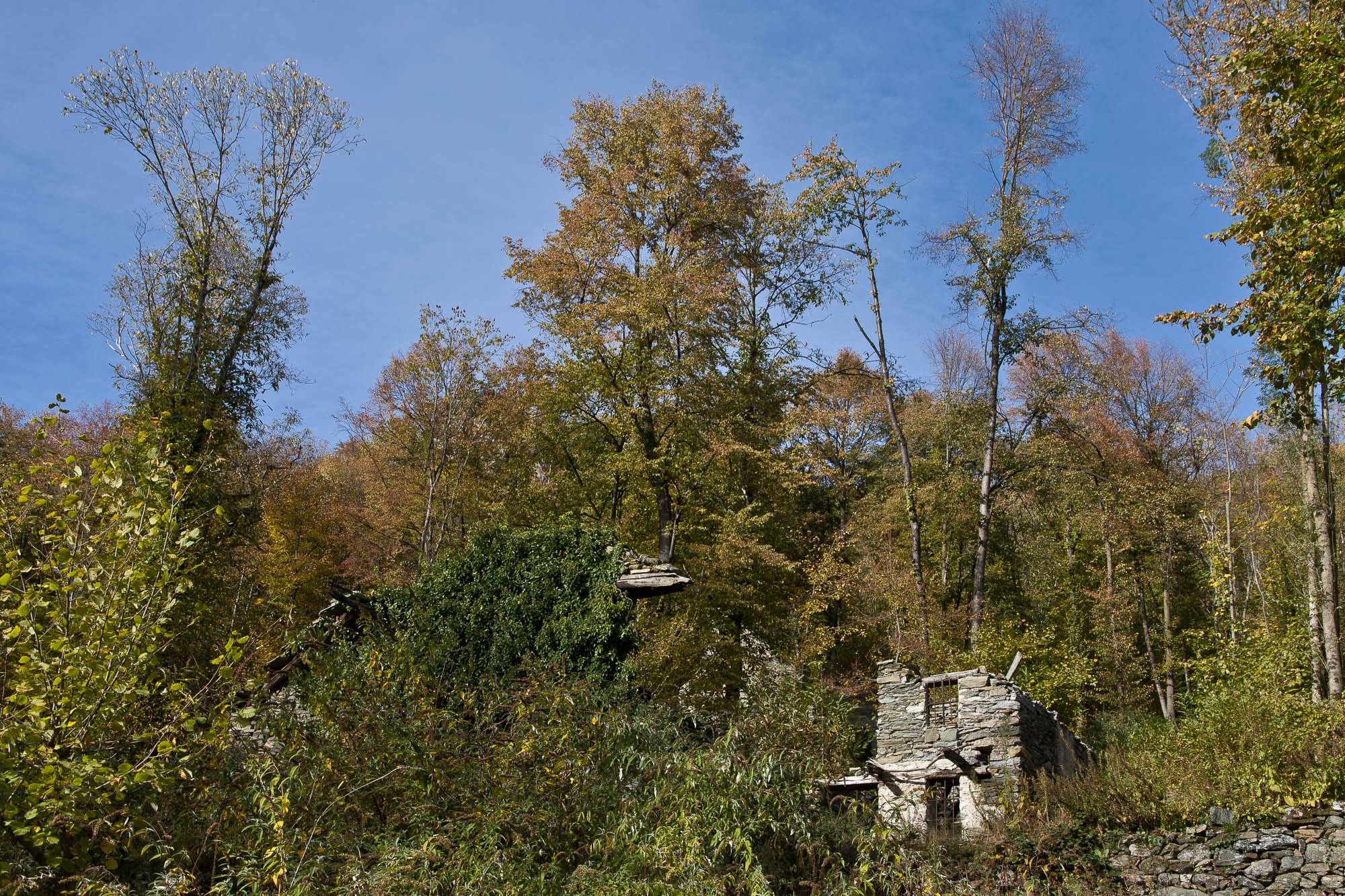 Vom Santuario geht es zunächst etwa 10 Minuten auf dem Aufstiegsweg zurück, bei einem Wegweiser zweigt rechts ein Pfad ab. Auf diesem durch lauschigen Buchenwald steil hinab nach Monti di Voragno (973 m), im Spätherbst bei viel Laub eine wahre Freude. Monti di Voragno (973 m) ist eine aus zwei grösseren Gebäudegruppen bestehende ehemalige Sommersiedlung auf einer grossen Lichtung mit einigen hübsch renovierten alten Häusern, die heute als Wochenend- oder Ferienwohnsitze genutzt werden, meist von Einheimischen, die unten im Tal leben. Am unterem Rand der Siedlung zweigt von der unbefestigten Zufahrtsstrasse ein markierter Pfad ab, auf diesem in einigem Auf und Ab in einer halben Stunde zu dem herrlich gelegenen kleinen Weiler L‘Aran (950 m), der nur aus einem Wohnhaus und zwei Wirtschaftsgebäuden besteht. Hier leben Riccardo und Cristina mit ihren zwei kleinen Kindern. Des Stadtlebens überdrüssig haben sich die jungen Leute vor einigen Jahren in L‘Aran niedergelassen und das alte Anwesen zu einem heimeligen Agriturismo umgebaut. Das umliegende, im Laufe der Jahre völlig verwilderte Kulturland haben die beiden von Bäumen, Gebüsch und Unkraut befreit und in mühseliger langer Arbeit einen riesigen Gemüsegarten angelegt. Wenn Riccardo und Cristina zuhause sind, kann man hier in rustikalem Ambiente auf ein Bier oder ein Glas Wein einkehren. Bei Häusern von L‘Aran endet ein unbefestigter Fahrweg, auf diesem nun sanft bergab bis zum Pian di Ceres. Von dort wandert man auf dem Aufstiegsweg mit der schönen Mulattiera zurück nach Ceres.