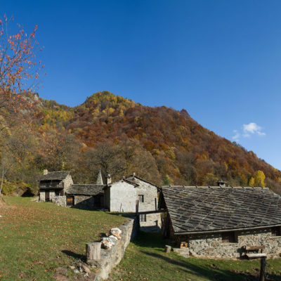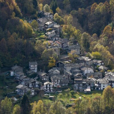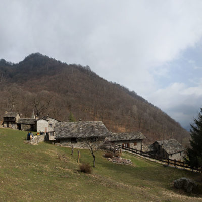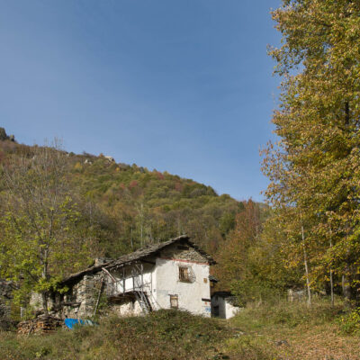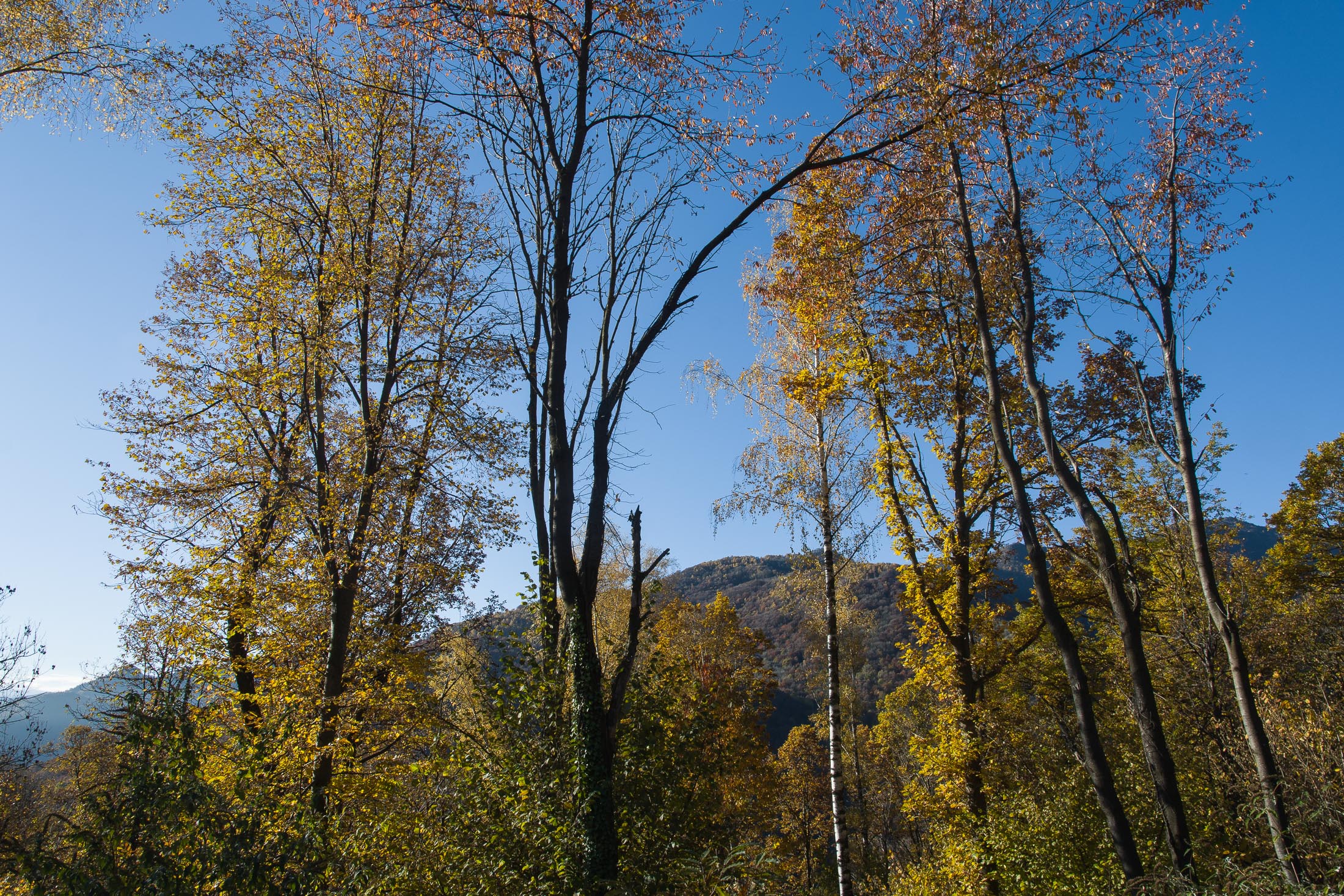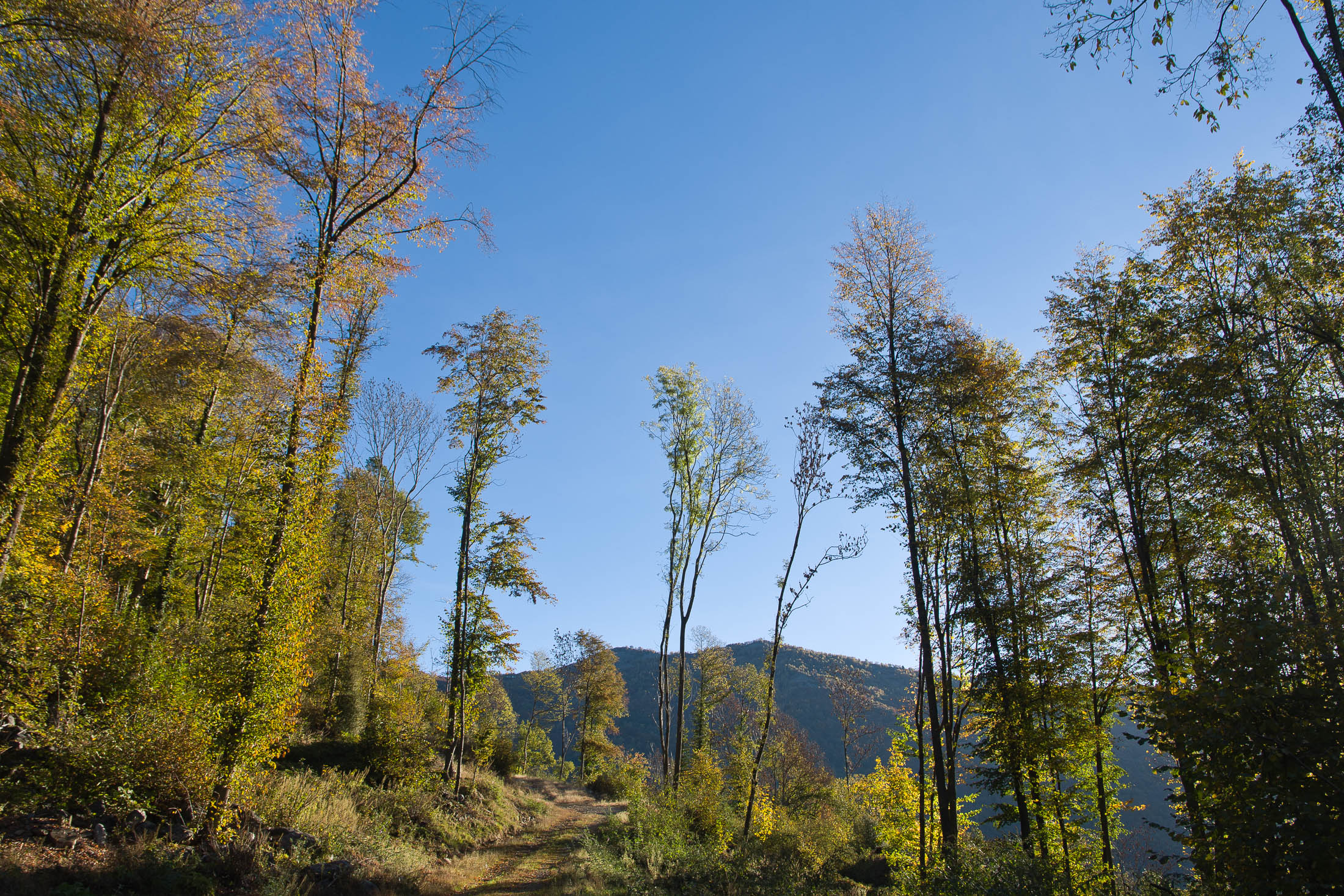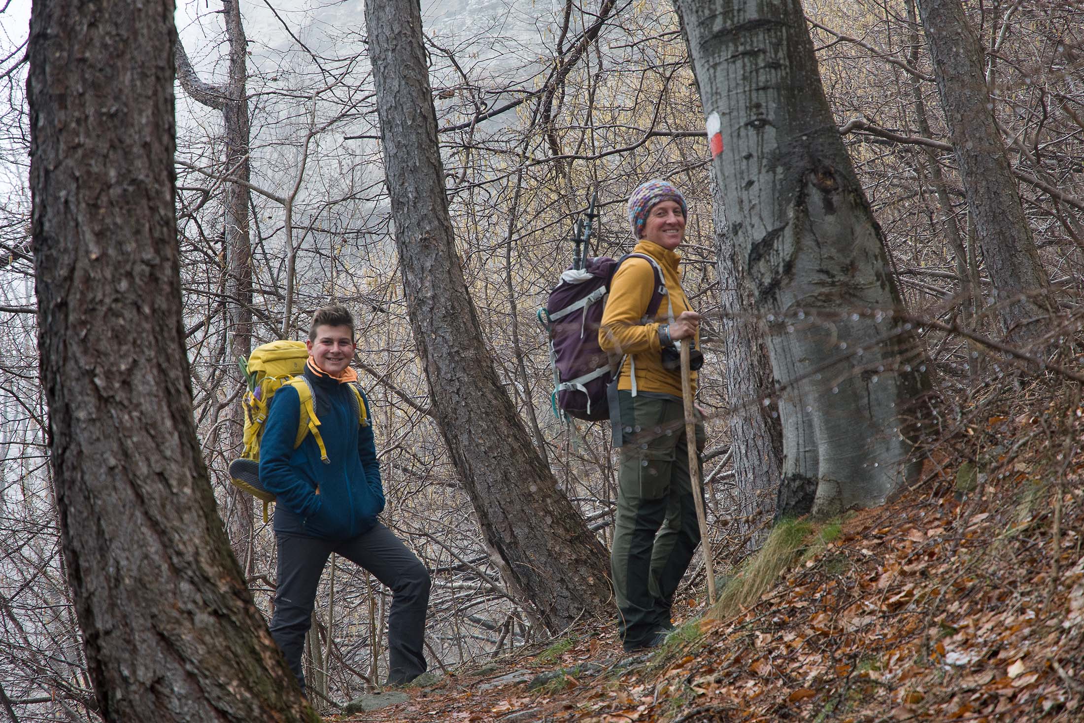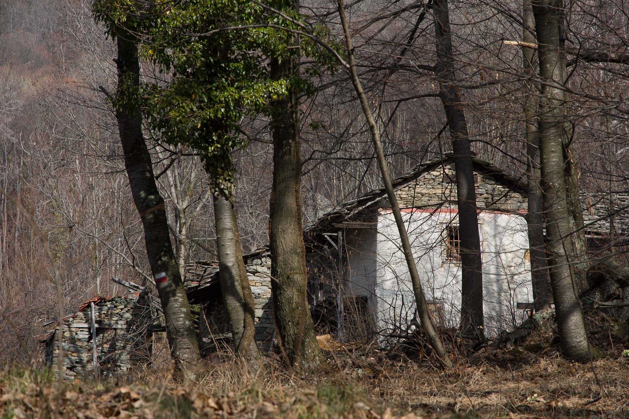 Vom Santuario geht es zunächst etwa 10 Minuten auf dem Aufstiegsweg zurück, bei einem Wegweiser zweigt rechts ein Pfad ab. Auf diesem durch lauschigen Buchenwald steil hinab nach Monti di Voragno (973 m), im Spätherbst bei viel Laub eine wahre Freude. Monti di Voragno (973 m) ist eine aus zwei grösseren Gebäudegruppen bestehende ehemalige Sommersiedlung auf einer grossen Lichtung mit einigen hübsch renovierten alten Häusern, die heute als Wochenend- oder Ferienwohnsitze genutzt werden, meist von Einheimischen, die unten im Tal leben. Am unterem Rand der Siedlung zweigt von der unbefestigten Zufahrtsstrasse ein markierter Pfad ab, auf diesem in einigem Auf und Ab in einer halben Stunde zu dem herrlich gelegenen kleinen Weiler L‘Aran (950 m), der nur aus einem Wohnhaus und zwei Wirtschaftsgebäuden besteht. Hier leben Riccardo und Cristina mit ihren zwei kleinen Kindern. Des Stadtlebens überdrüssig haben sich die jungen Leute vor einigen Jahren in L‘Aran niedergelassen und das alte Anwesen zu einem heimeligen Agriturismo umgebaut. Das umliegende, im Laufe der Jahre völlig verwilderte Kulturland haben die beiden von Bäumen, Gebüsch und Unkraut befreit und in mühseliger langer Arbeit einen riesigen Gemüsegarten angelegt. Wenn Riccardo und Cristina zuhause sind, kann man hier in rustikalem Ambiente auf ein Bier oder ein Glas Wein einkehren. Bei Häusern von L‘Aran endet ein unbefestigter Fahrweg, auf diesem nun sanft bergab bis zum Pian di Ceres. Von dort wandert man auf dem Aufstiegsweg mit der schönen Mulattiera zurück nach Ceres.