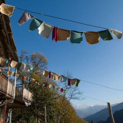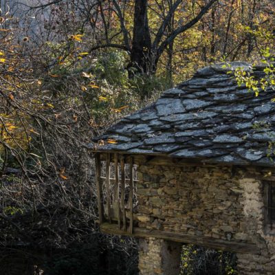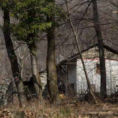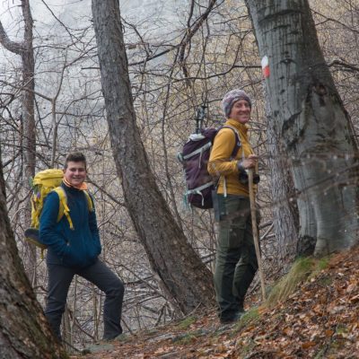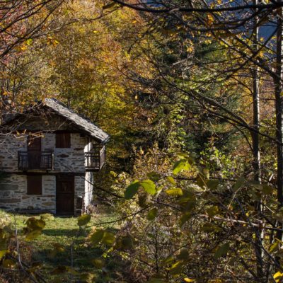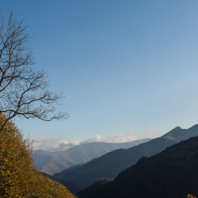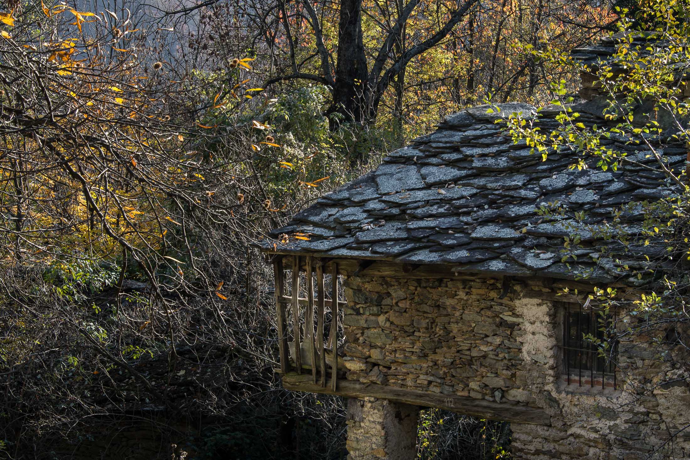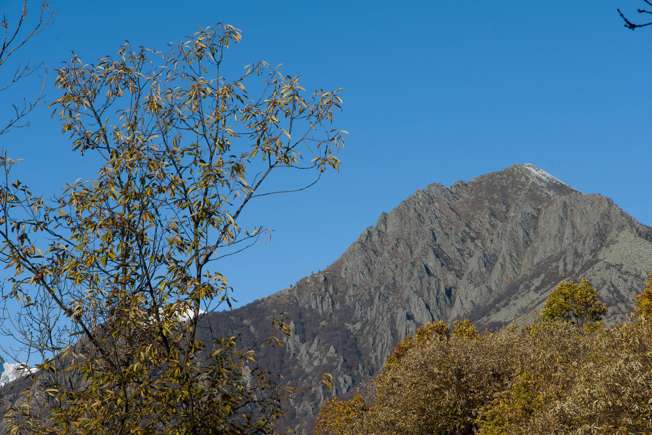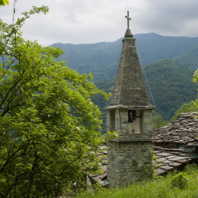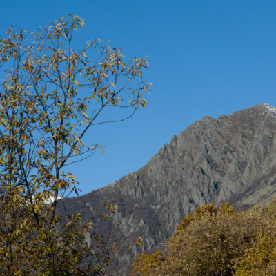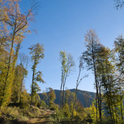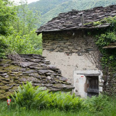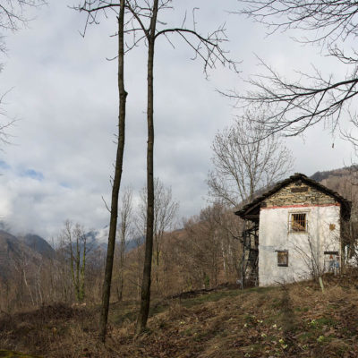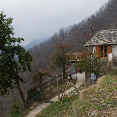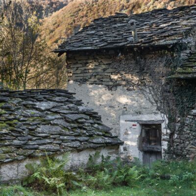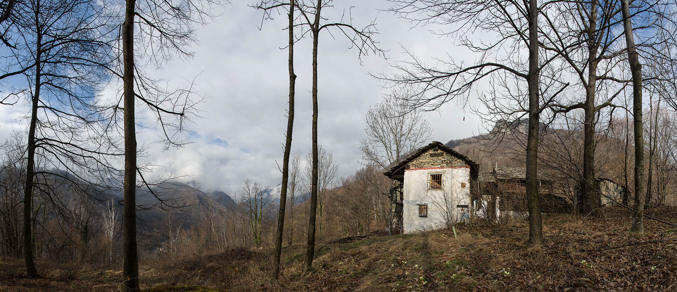 Vom Santuario geht es zunächst etwa 10 Minuten auf dem Aufstiegsweg zurück, bei einem Wegweiser zweigt rechts ein Pfad ab. Auf diesem durch lauschigen Buchenwald steil hinab nach Monti di Voragno (973 m), im Spätherbst bei viel Laub eine wahre Freude. Monti di Voragno (973 m) ist eine aus zwei grösseren Gebäudegruppen bestehende ehemalige Sommersiedlung auf einer grossen Lichtung mit einigen hübsch renovierten alten Häusern, die heute als Wochenend- oder Ferienwohnsitze genutzt werden, meist von Einheimischen, die unten im Tal leben. Am unterem Rand der Siedlung zweigt von der unbefestigten Zufahrtsstrasse ein markierter Pfad ab, auf diesem in einigem Auf und Ab in einer halben Stunde zu dem herrlich gelegenen kleinen Weiler L‘Aran (950 m), der nur aus einem Wohnhaus und zwei Wirtschaftsgebäuden besteht. Hier leben Riccardo und Cristina mit ihren zwei kleinen Kindern. Des Stadtlebens überdrüssig haben sich die jungen Leute vor einigen Jahren in L‘Aran niedergelassen und das alte Anwesen zu einem heimeligen Agriturismo umgebaut. Das umliegende, im Laufe der Jahre völlig verwilderte Kulturland haben die beiden von Bäumen, Gebüsch und Unkraut befreit und in mühseliger langer Arbeit einen riesigen Gemüsegarten angelegt. Wenn Riccardo und Cristina zuhause sind, kann man hier in rustikalem Ambiente auf ein Bier oder ein Glas Wein einkehren. Bei Häusern von L‘Aran endet ein unbefestigter Fahrweg, auf diesem nun sanft bergab bis zum Pian di Ceres. Von dort wandert man auf dem Aufstiegsweg mit der schönen Mulattiera zurück nach Ceres.