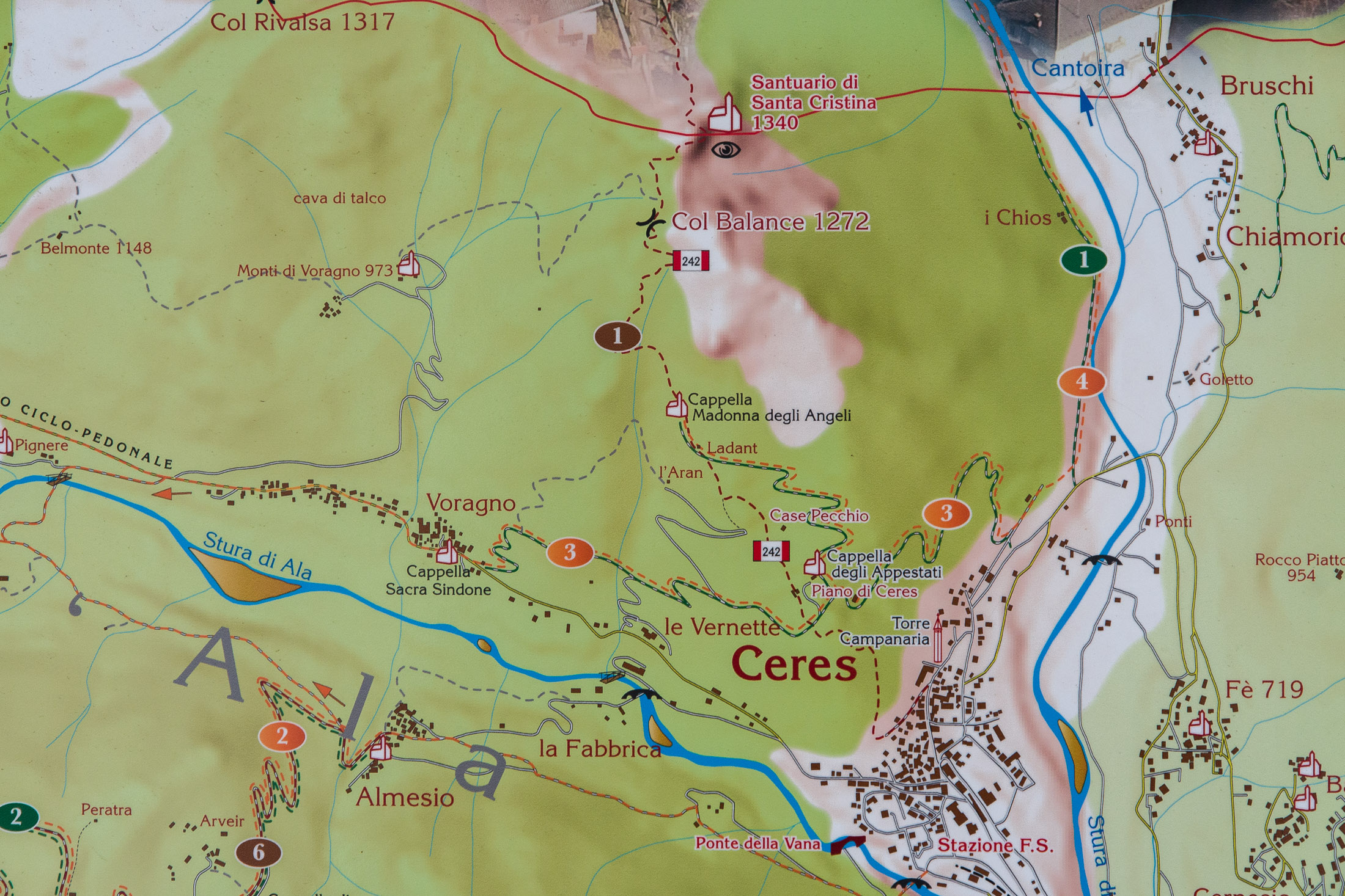 - Ausgangs- und Endpunkt: Ceres (703 m), Parkplatz auf der Piazza Municipio vor der Kirche