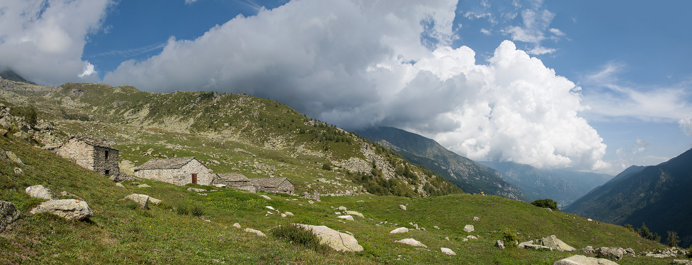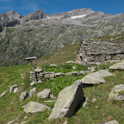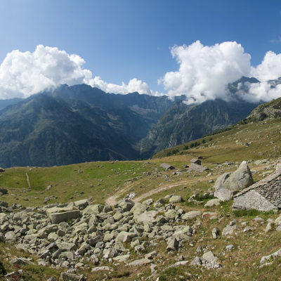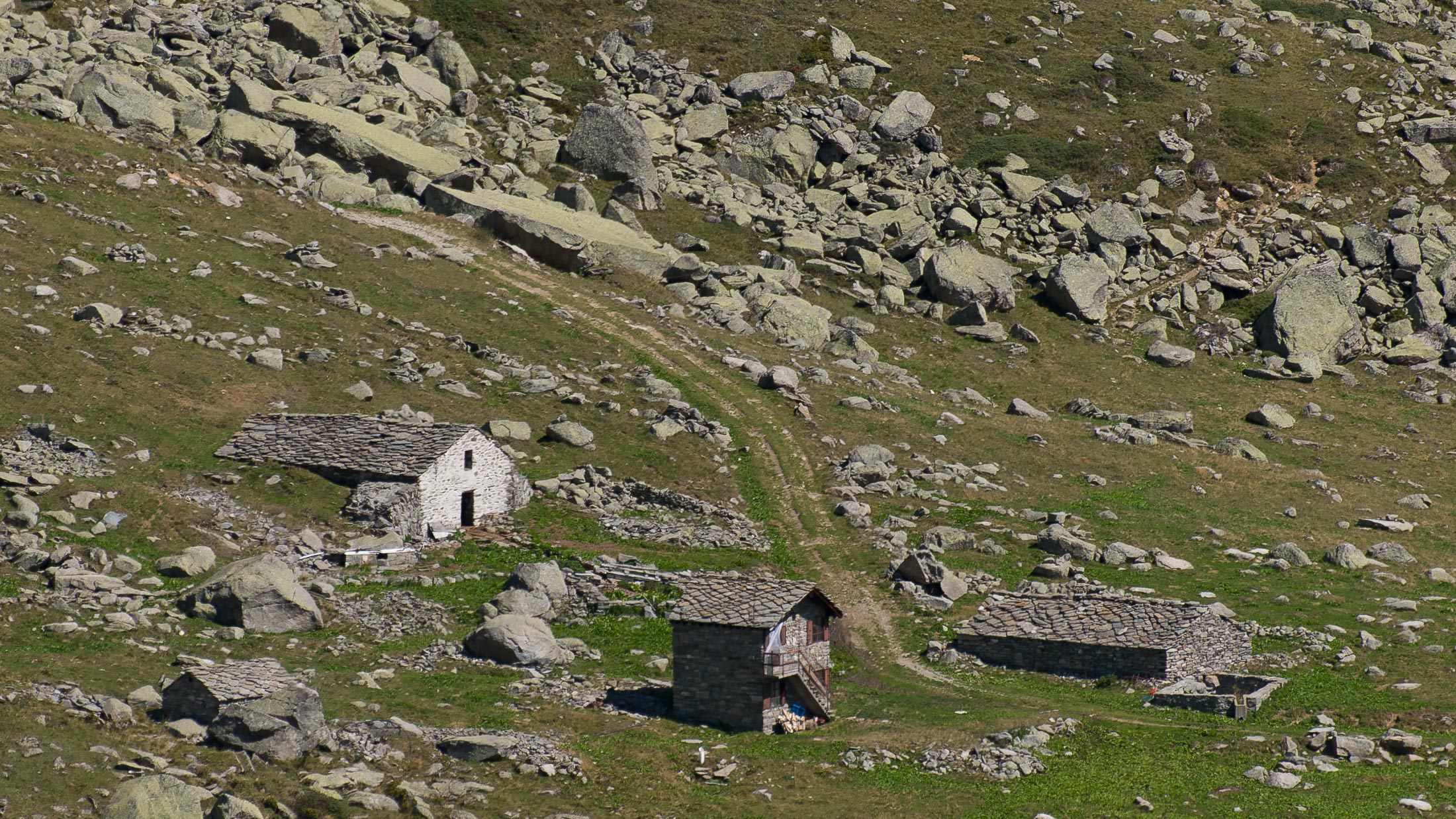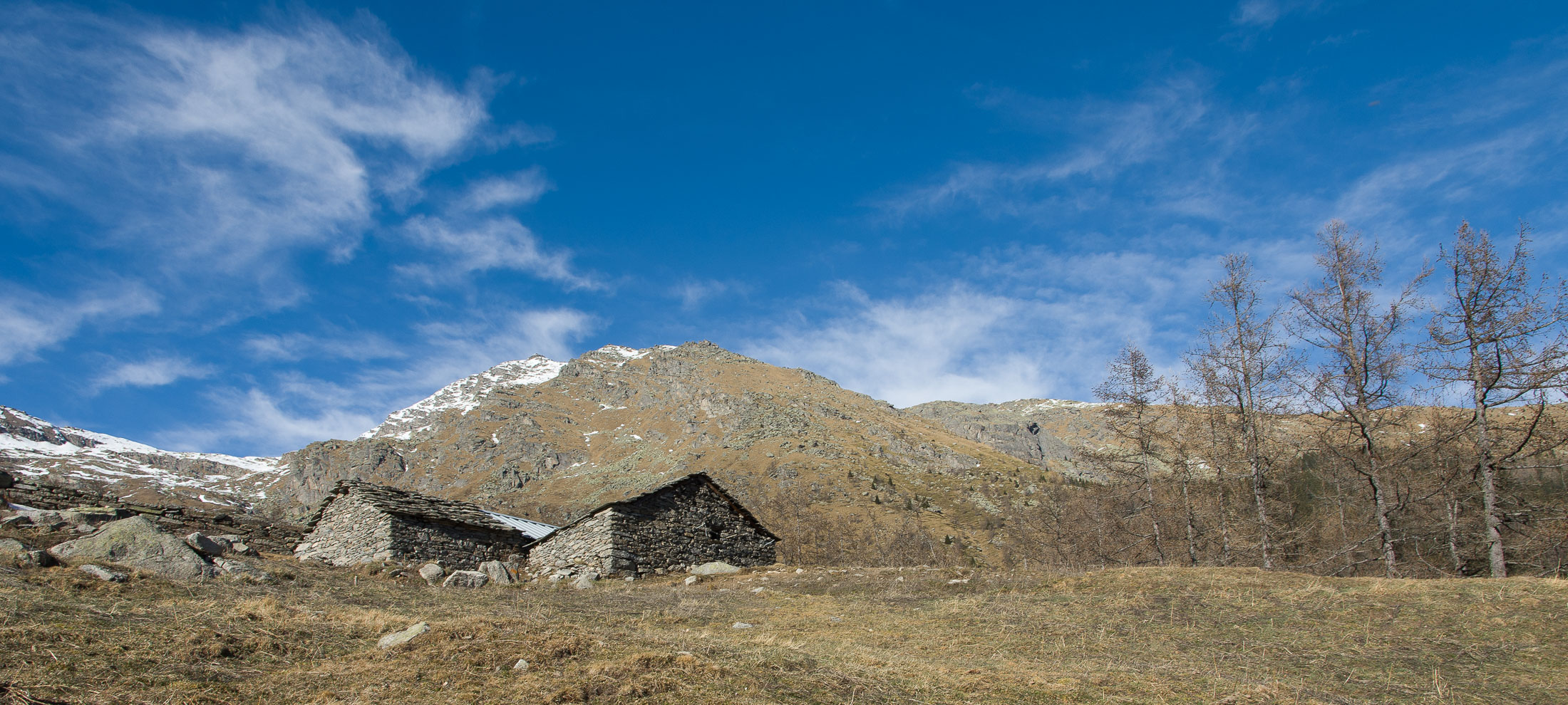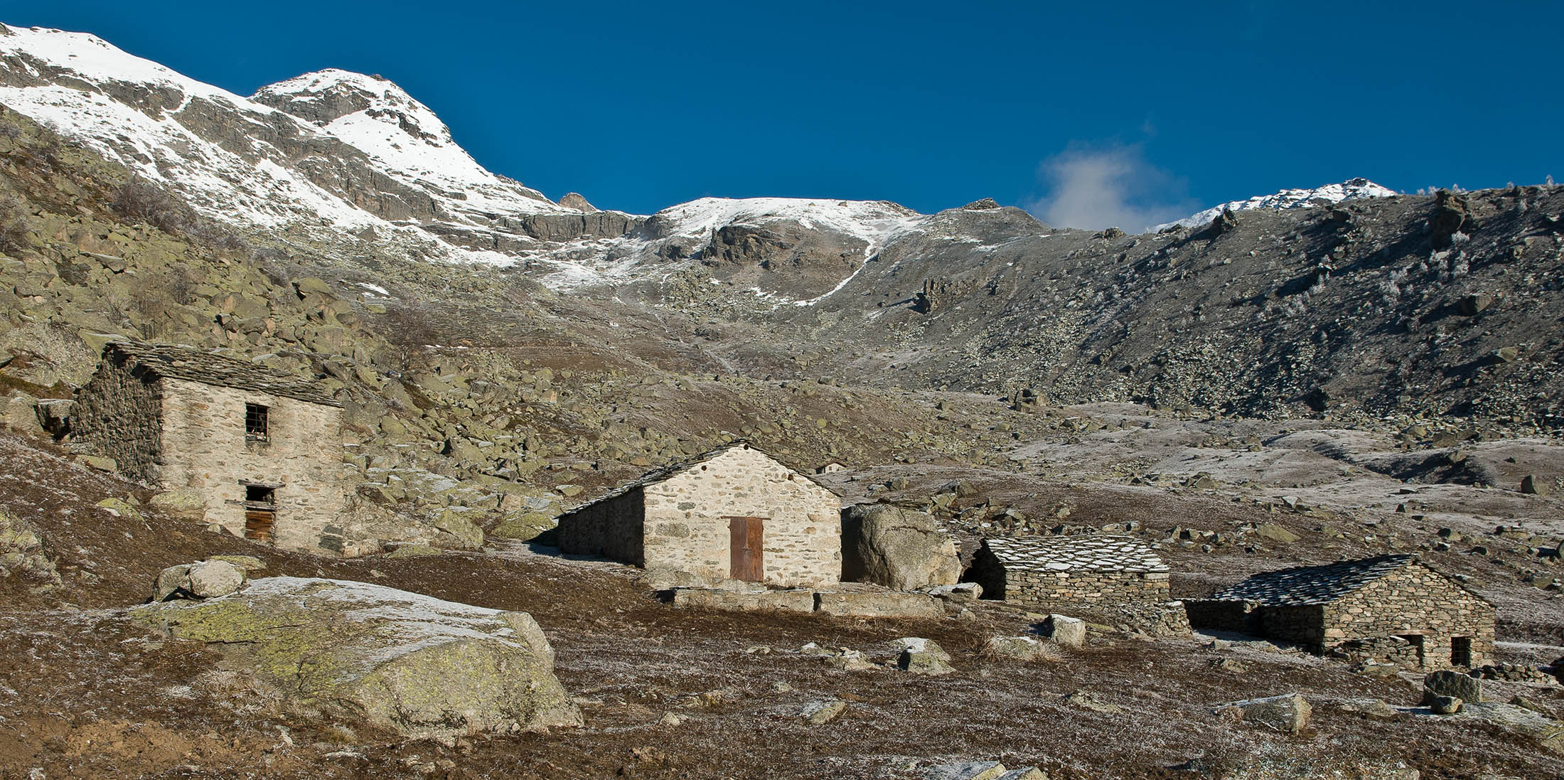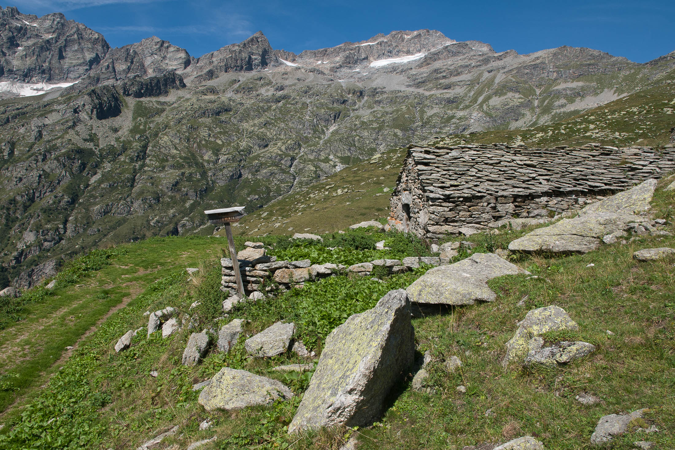 Über einige Serpentinen windet sich der Weg weiter talaufwärts, das Panorama wird immer eindrücklicher. Mit jedem Schritt nähert man sich dem Alpenhauptkamm mit der Gipfelkette zwischen der Uja di Ciamarella (3676 m) und der Levanna Orientale (3555 m), eine gigantische Kulisse mit vielen wilden Graten und Türmen. Es folgt ein längerer flacherer Wegabschnitt, die Hänge sind übersät von Geröllfeldern, ringsherum liegen riesige Steine in der Landschaft rum. Dann ein besonders auffälliger Felsbrocken, man könnte meinen, hier wäre ein Meteorit eingeschlagen. In der Nähe plätschert der Rio Sagnasse zu Tal, auf den von vielen Rinnsalen durchzogenen Feuchtwiesen blühen im Frühsommer Alpen-Kuhschellen, Enzian, Schlangen-Knöterich und Trollblumen. Zwei Kurven weiter oberhalb die aufgegebenen Hütten der Gias Crest (1880 m), ein Kuhstall ist noch intakt, das Schicksal der anderen Gebäude ist bereits besiegelt. Zurück bleiben zerborstene Dachbalken und herumliegende Trümmer. Dann erreicht man den Rand einer weiten Hochebene, ein wenig unterhalb die steinernen Hütten der in den Sommermonaten bewirtschafteten Alpe Pià Nou (1853 m), wo um diese Zeit zahlreiche Kühe und Rinder auf den umliegenden Weiden grasen. Im weiteren Verlauf überquert man die riesigen Alphochflächen der Gias dei Signori und der Gias Sagnasse. Jenseits davon umrundet der Sentiero Balcone sanft ansteigend einen Geländerücken und endet schliesslich wenig später bei den archaisch anmutenden Alpgebäuden der Gias Nuovo Fontane (1986 m). Ein abgeschiedener und faszinierender Ort inmitten einer gewaltigen Hochgebirgslandschaft. Das Panorama ist umfassend, man überblickt nahezu das gesamte Val Grande di Lanzo, vom Monte Bellavarda im Osten bis zum Steilabfall des Alpenhauptkamms, der hier zum Greifen nah ist.