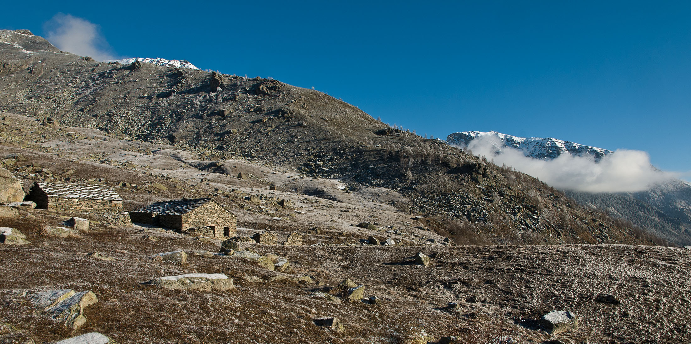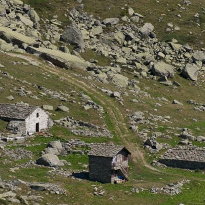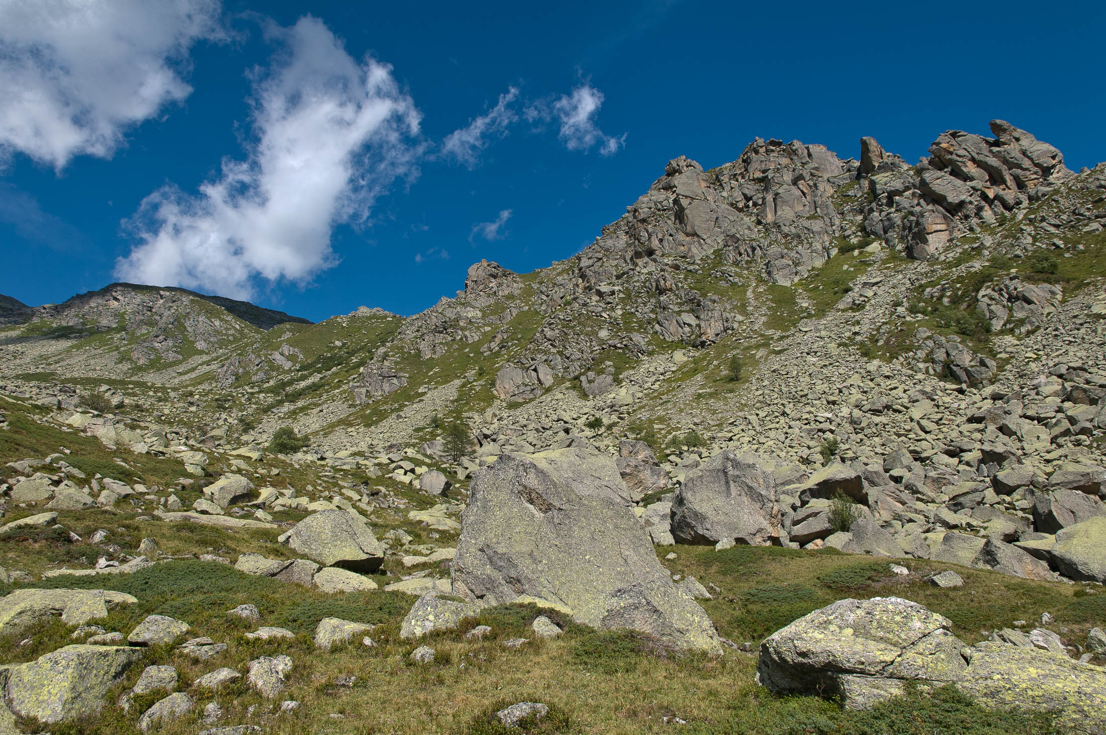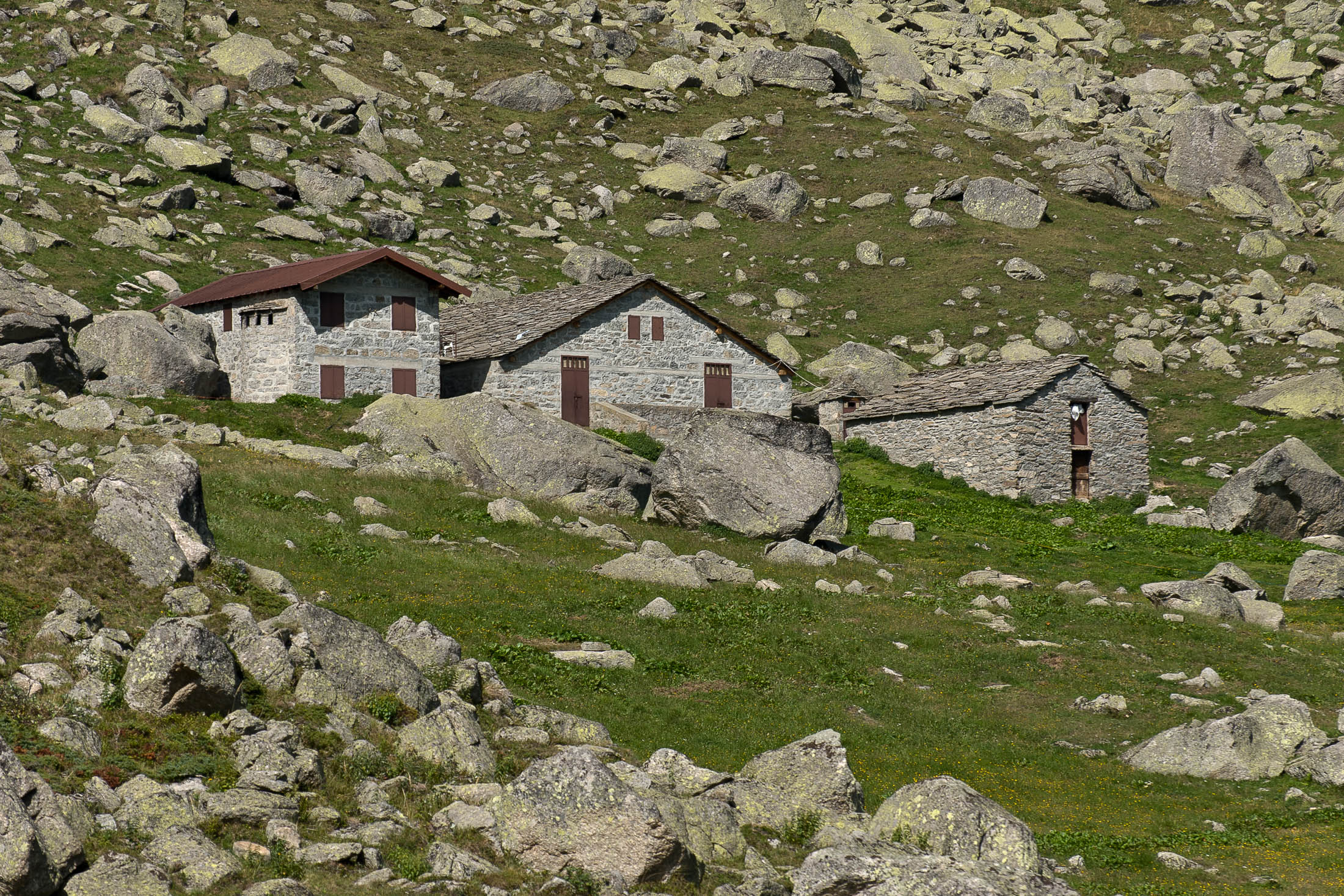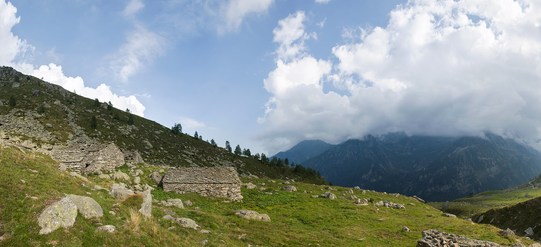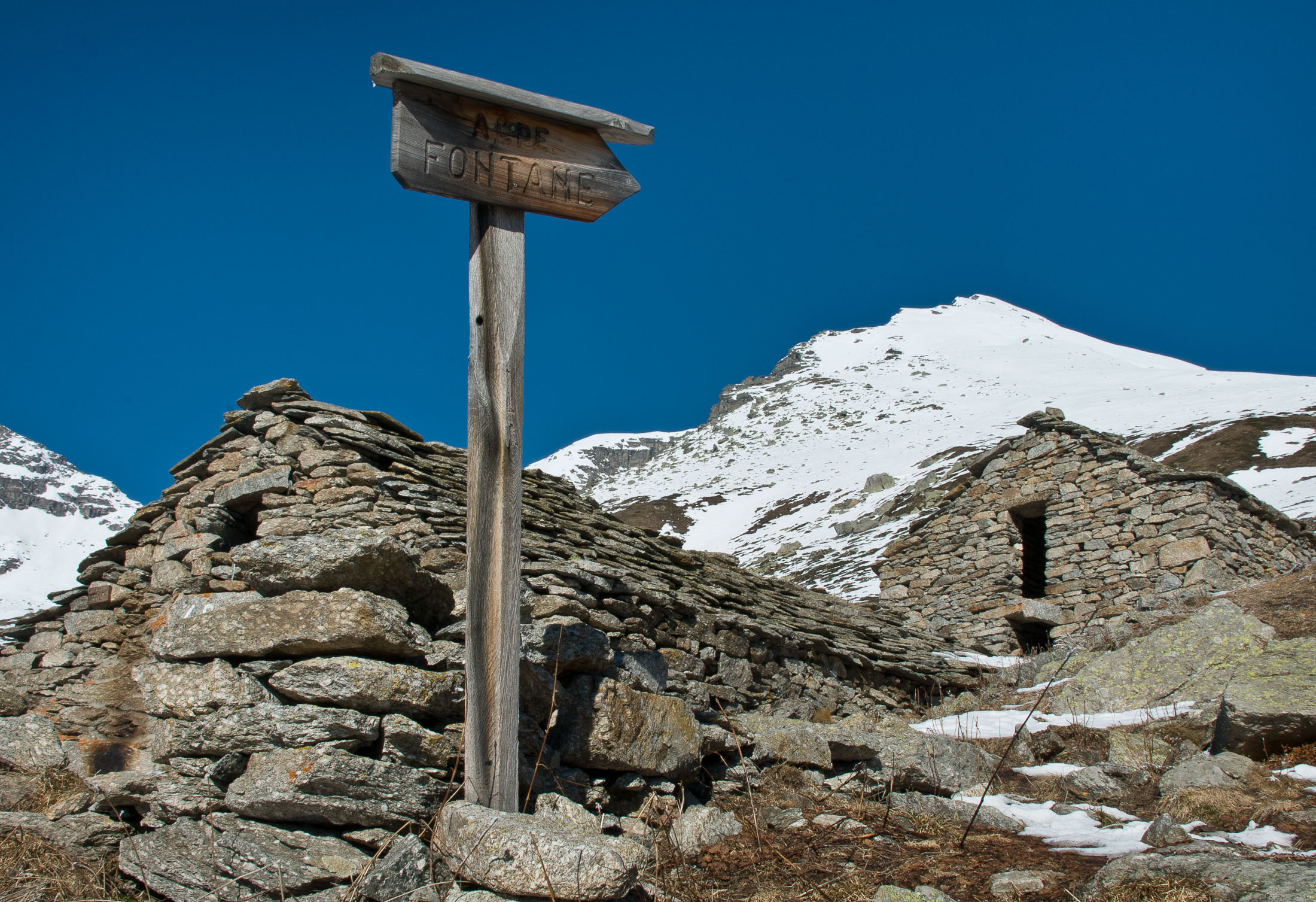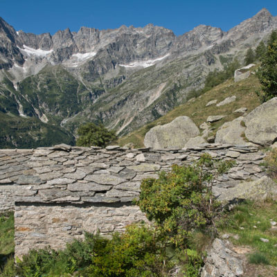 Über einige Serpentinen windet sich der Weg weiter talaufwärts, das Panorama wird immer eindrücklicher. Mit jedem Schritt nähert man sich dem Alpenhauptkamm mit der Gipfelkette zwischen der Uja di Ciamarella (3676 m) und der Levanna Orientale (3555 m), eine gigantische Kulisse mit vielen wilden Graten und Türmen. Es folgt ein längerer flacherer Wegabschnitt, die Hänge sind übersät von Geröllfeldern, ringsherum liegen riesige Steine in der Landschaft rum. Dann ein besonders auffälliger Felsbrocken, man könnte meinen, hier wäre ein Meteorit eingeschlagen. In der Nähe plätschert der Rio Sagnasse zu Tal, auf den von vielen Rinnsalen durchzogenen Feuchtwiesen blühen im Frühsommer Alpen-Kuhschellen, Enzian, Schlangen-Knöterich und Trollblumen. Zwei Kurven weiter oberhalb die aufgegebenen Hütten der Gias Crest (1880 m), ein Kuhstall ist noch intakt, das Schicksal der anderen Gebäude ist bereits besiegelt. Zurück bleiben zerborstene Dachbalken und herumliegende Trümmer. Dann erreicht man den Rand einer weiten Hochebene, ein wenig unterhalb die steinernen Hütten der in den Sommermonaten bewirtschafteten Alpe Pià Nou (1853 m), wo um diese Zeit zahlreiche Kühe und Rinder auf den umliegenden Weiden grasen. Im weiteren Verlauf überquert man die riesigen Alphochflächen der Gias dei Signori und der Gias Sagnasse. Jenseits davon umrundet der Sentiero Balcone sanft ansteigend einen Geländerücken und endet schliesslich wenig später bei den archaisch anmutenden Alpgebäuden der Gias Nuovo Fontane (1986 m). Ein abgeschiedener und faszinierender Ort inmitten einer gewaltigen Hochgebirgslandschaft. Das Panorama ist umfassend, man überblickt nahezu das gesamte Val Grande di Lanzo, vom Monte Bellavarda im Osten bis zum Steilabfall des Alpenhauptkamms, der hier zum Greifen nah ist.