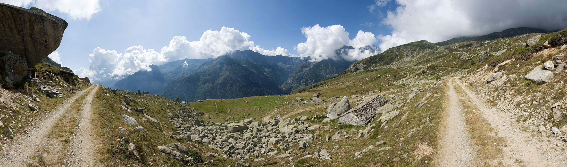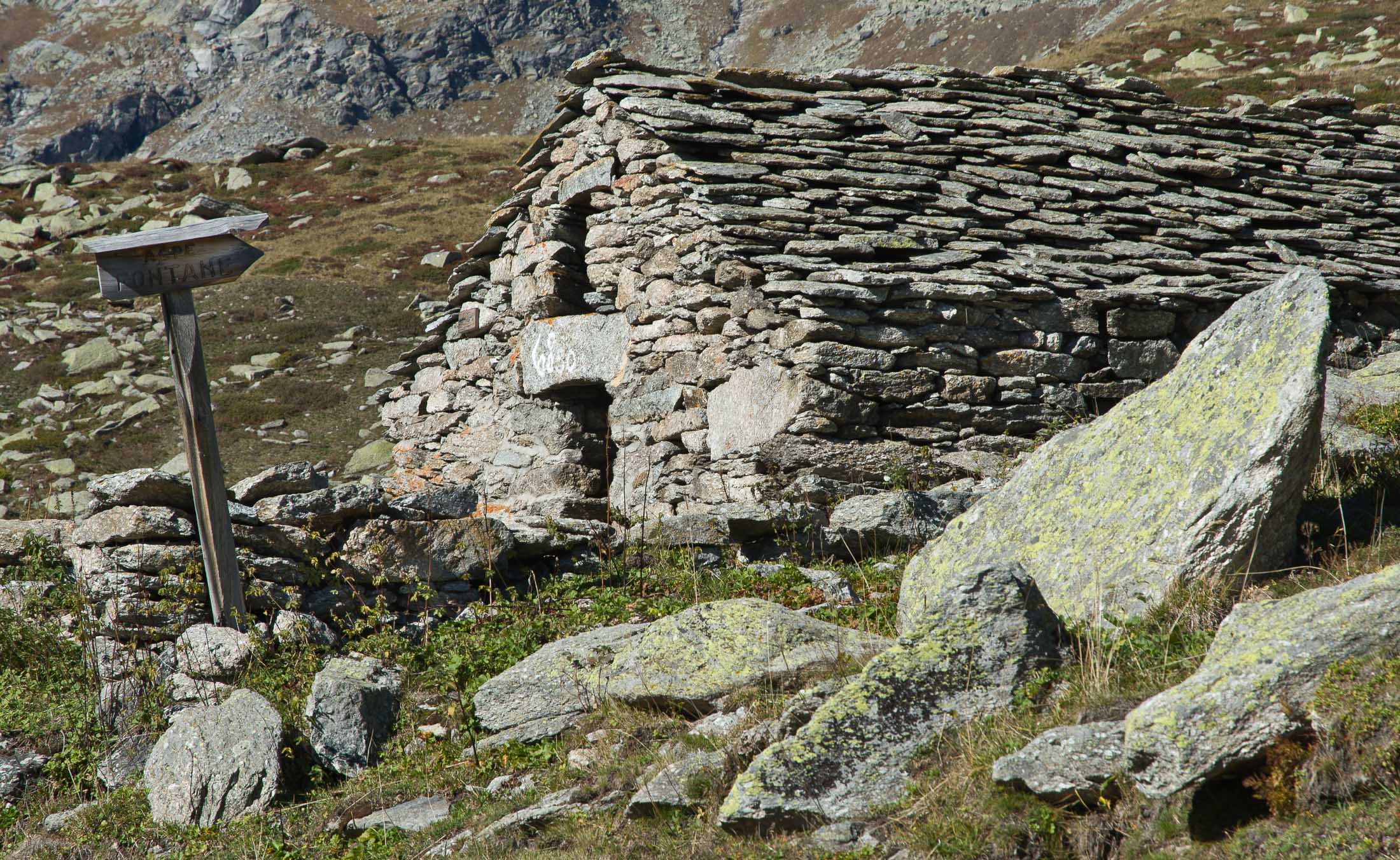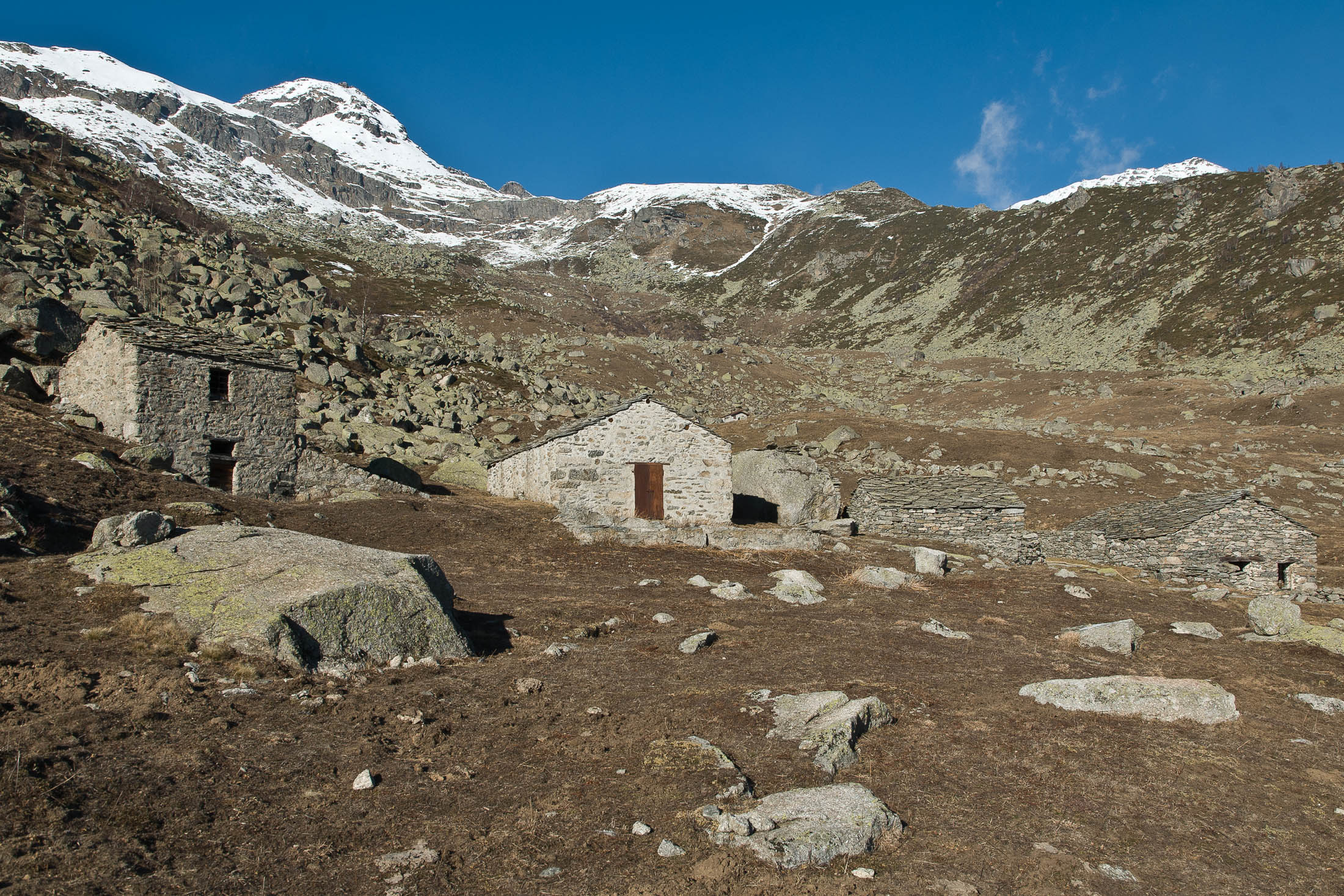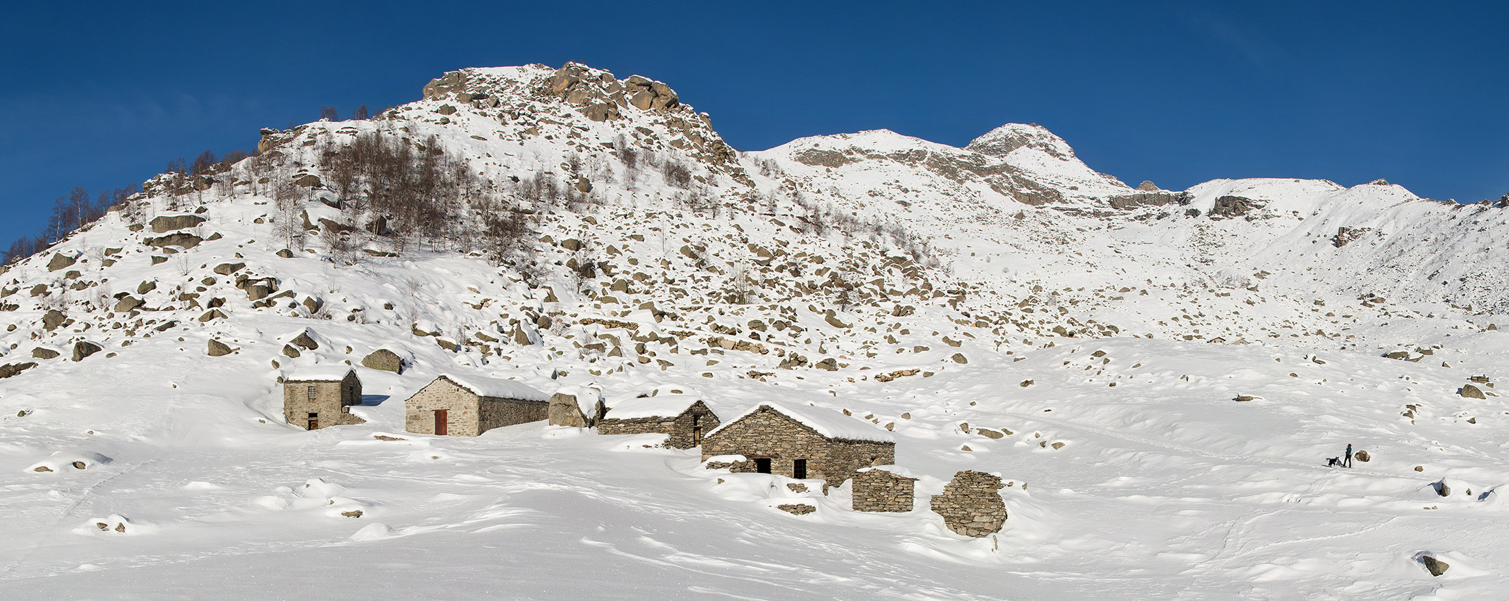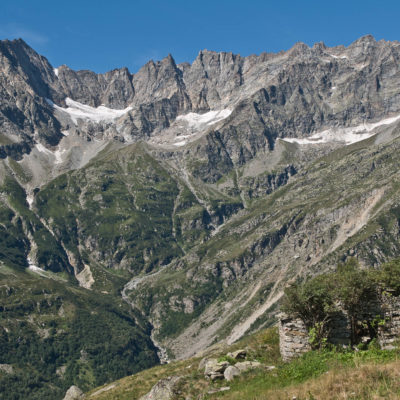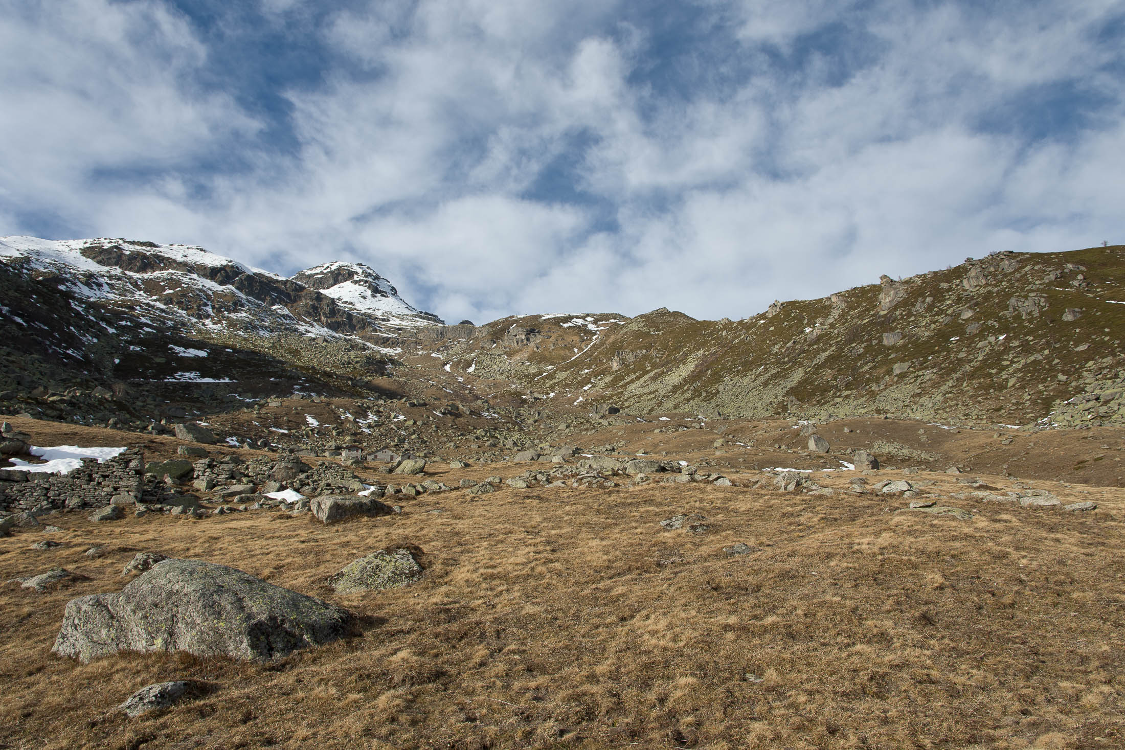 Über einige Serpentinen windet sich der Weg weiter talaufwärts, das Panorama wird immer eindrücklicher. Mit jedem Schritt nähert man sich dem Alpenhauptkamm mit der Gipfelkette zwischen der Uja di Ciamarella (3676 m) und der Levanna Orientale (3555 m), eine gigantische Kulisse mit vielen wilden Graten und Türmen. Es folgt ein längerer flacherer Wegabschnitt, die Hänge sind übersät von Geröllfeldern, ringsherum liegen riesige Steine in der Landschaft rum. Dann ein besonders auffälliger Felsbrocken, man könnte meinen, hier wäre ein Meteorit eingeschlagen. In der Nähe plätschert der Rio Sagnasse zu Tal, auf den von vielen Rinnsalen durchzogenen Feuchtwiesen blühen im Frühsommer Alpen-Kuhschellen, Enzian, Schlangen-Knöterich und Trollblumen. Zwei Kurven weiter oberhalb die aufgegebenen Hütten der Gias Crest (1880 m), ein Kuhstall ist noch intakt, das Schicksal der anderen Gebäude ist bereits besiegelt. Zurück bleiben zerborstene Dachbalken und herumliegende Trümmer. Dann erreicht man den Rand einer weiten Hochebene, ein wenig unterhalb die steinernen Hütten der in den Sommermonaten bewirtschafteten Alpe Pià Nou (1853 m), wo um diese Zeit zahlreiche Kühe und Rinder auf den umliegenden Weiden grasen. Im weiteren Verlauf überquert man die riesigen Alphochflächen der Gias dei Signori und der Gias Sagnasse. Jenseits davon umrundet der Sentiero Balcone sanft ansteigend einen Geländerücken und endet schliesslich wenig später bei den archaisch anmutenden Alpgebäuden der Gias Nuovo Fontane (1986 m). Ein abgeschiedener und faszinierender Ort inmitten einer gewaltigen Hochgebirgslandschaft. Das Panorama ist umfassend, man überblickt nahezu das gesamte Val Grande di Lanzo, vom Monte Bellavarda im Osten bis zum Steilabfall des Alpenhauptkamms, der hier zum Greifen nah ist.