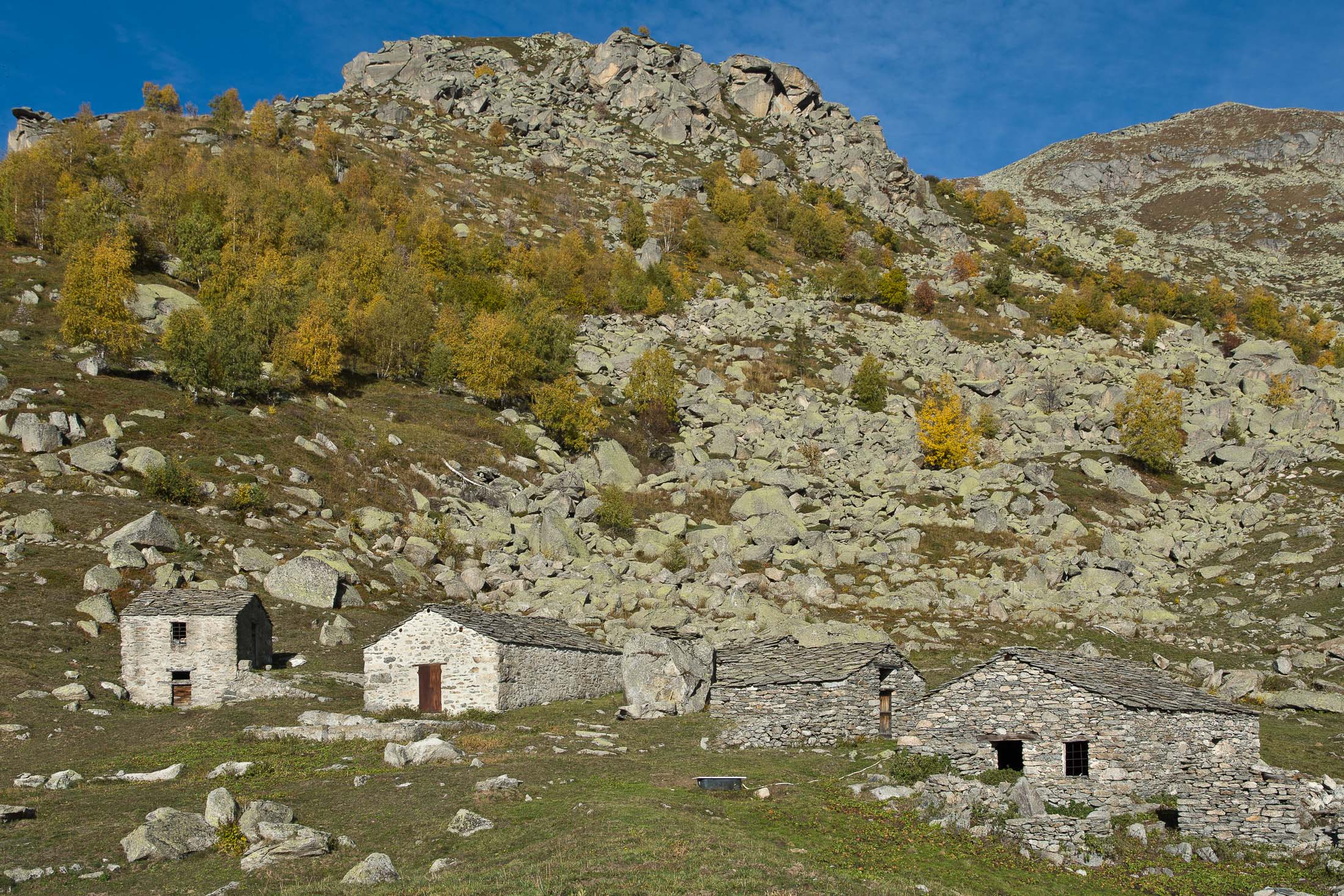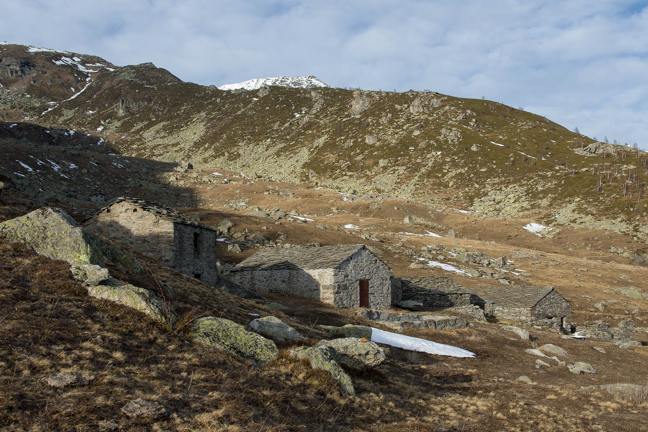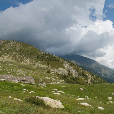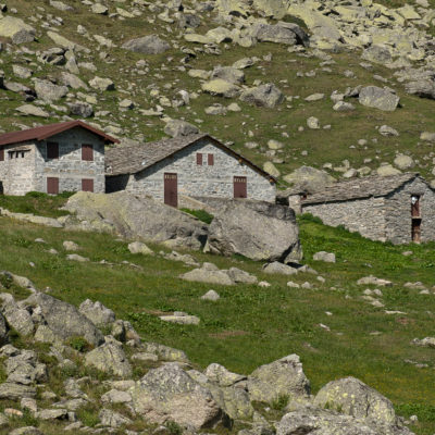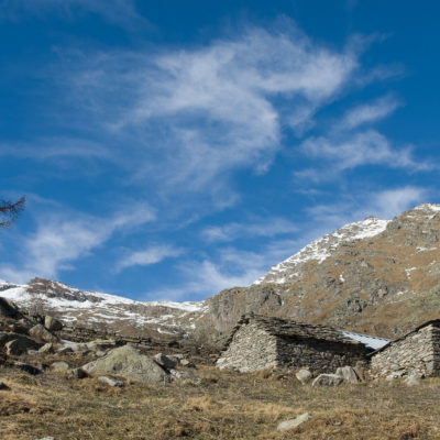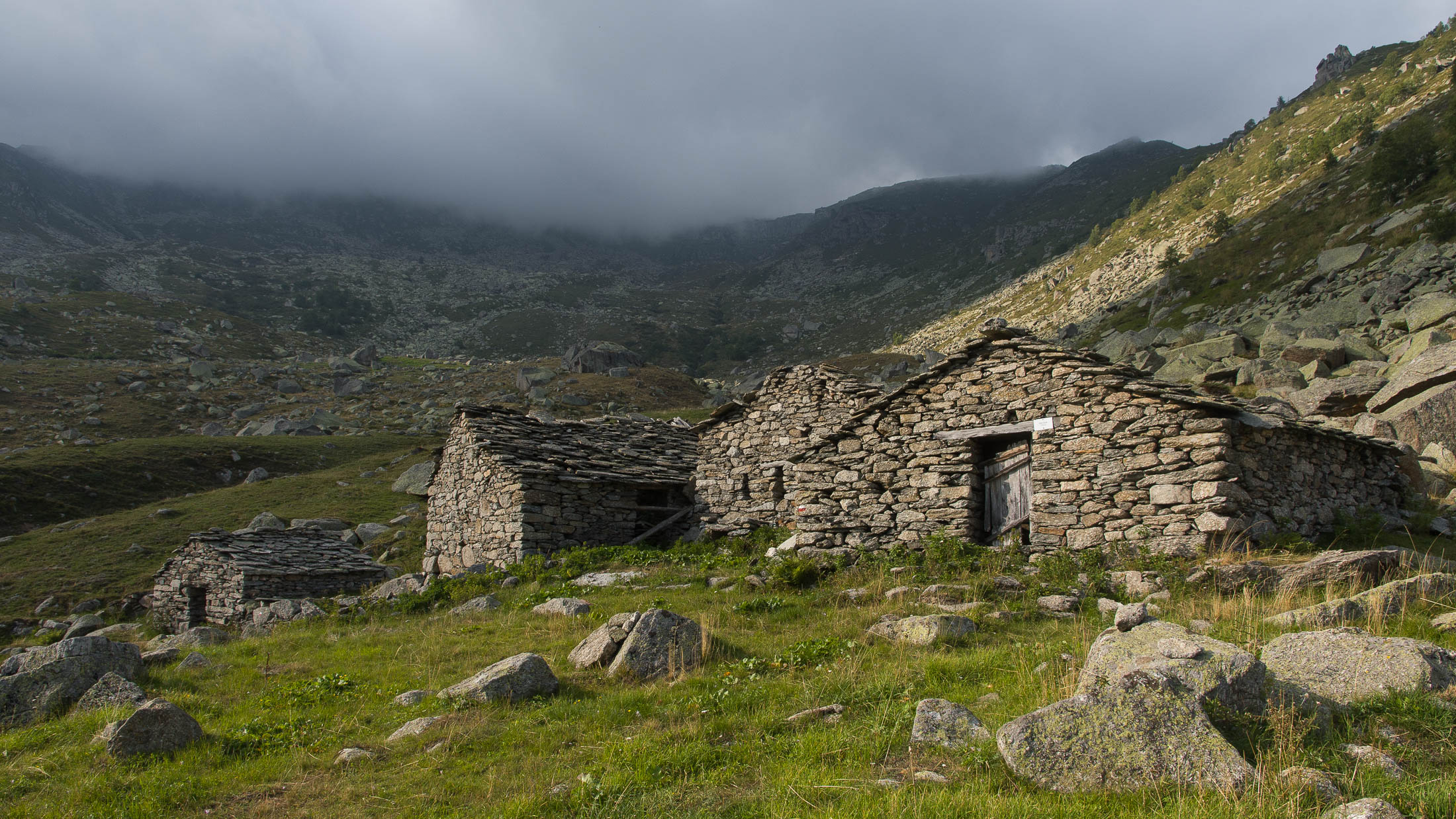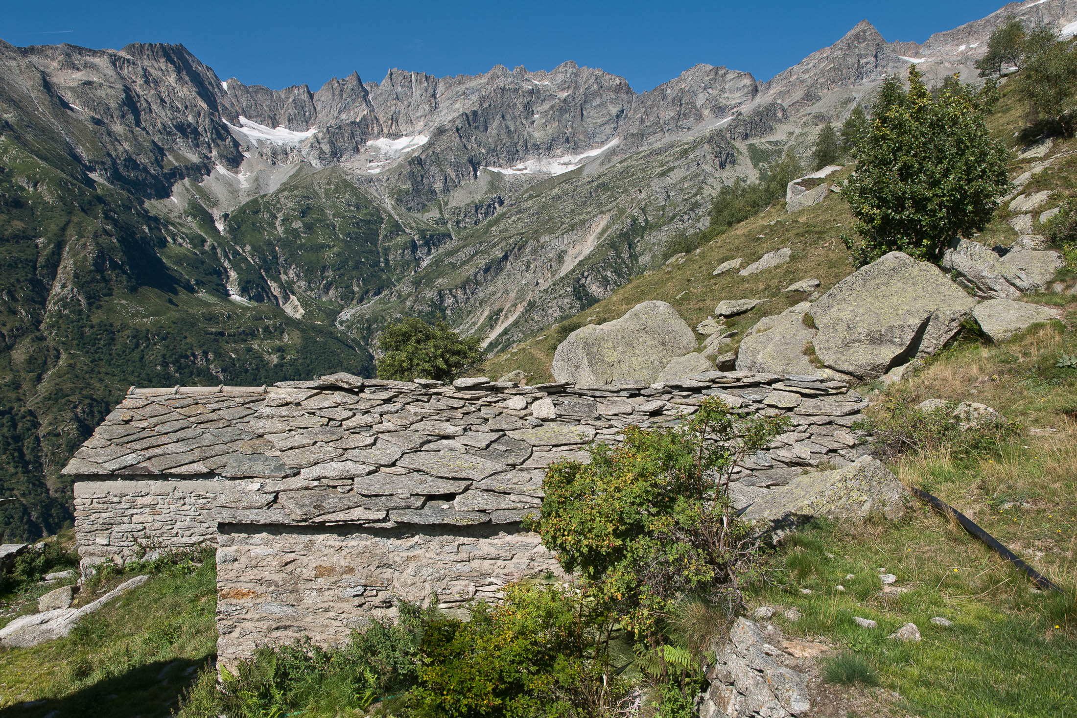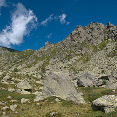 Über einige Serpentinen windet sich der Weg weiter talaufwärts, das Panorama wird immer eindrücklicher. Mit jedem Schritt nähert man sich dem Alpenhauptkamm mit der Gipfelkette zwischen der Uja di Ciamarella (3676 m) und der Levanna Orientale (3555 m), eine gigantische Kulisse mit vielen wilden Graten und Türmen. Es folgt ein längerer flacherer Wegabschnitt, die Hänge sind übersät von Geröllfeldern, ringsherum liegen riesige Steine in der Landschaft rum. Dann ein besonders auffälliger Felsbrocken, man könnte meinen, hier wäre ein Meteorit eingeschlagen. In der Nähe plätschert der Rio Sagnasse zu Tal, auf den von vielen Rinnsalen durchzogenen Feuchtwiesen blühen im Frühsommer Alpen-Kuhschellen, Enzian, Schlangen-Knöterich und Trollblumen. Zwei Kurven weiter oberhalb die aufgegebenen Hütten der Gias Crest (1880 m), ein Kuhstall ist noch intakt, das Schicksal der anderen Gebäude ist bereits besiegelt. Zurück bleiben zerborstene Dachbalken und herumliegende Trümmer. Dann erreicht man den Rand einer weiten Hochebene, ein wenig unterhalb die steinernen Hütten der in den Sommermonaten bewirtschafteten Alpe Pià Nou (1853 m), wo um diese Zeit zahlreiche Kühe und Rinder auf den umliegenden Weiden grasen. Im weiteren Verlauf überquert man die riesigen Alphochflächen der Gias dei Signori und der Gias Sagnasse. Jenseits davon umrundet der Sentiero Balcone sanft ansteigend einen Geländerücken und endet schliesslich wenig später bei den archaisch anmutenden Alpgebäuden der Gias Nuovo Fontane (1986 m). Ein abgeschiedener und faszinierender Ort inmitten einer gewaltigen Hochgebirgslandschaft. Das Panorama ist umfassend, man überblickt nahezu das gesamte Val Grande di Lanzo, vom Monte Bellavarda im Osten bis zum Steilabfall des Alpenhauptkamms, der hier zum Greifen nah ist.