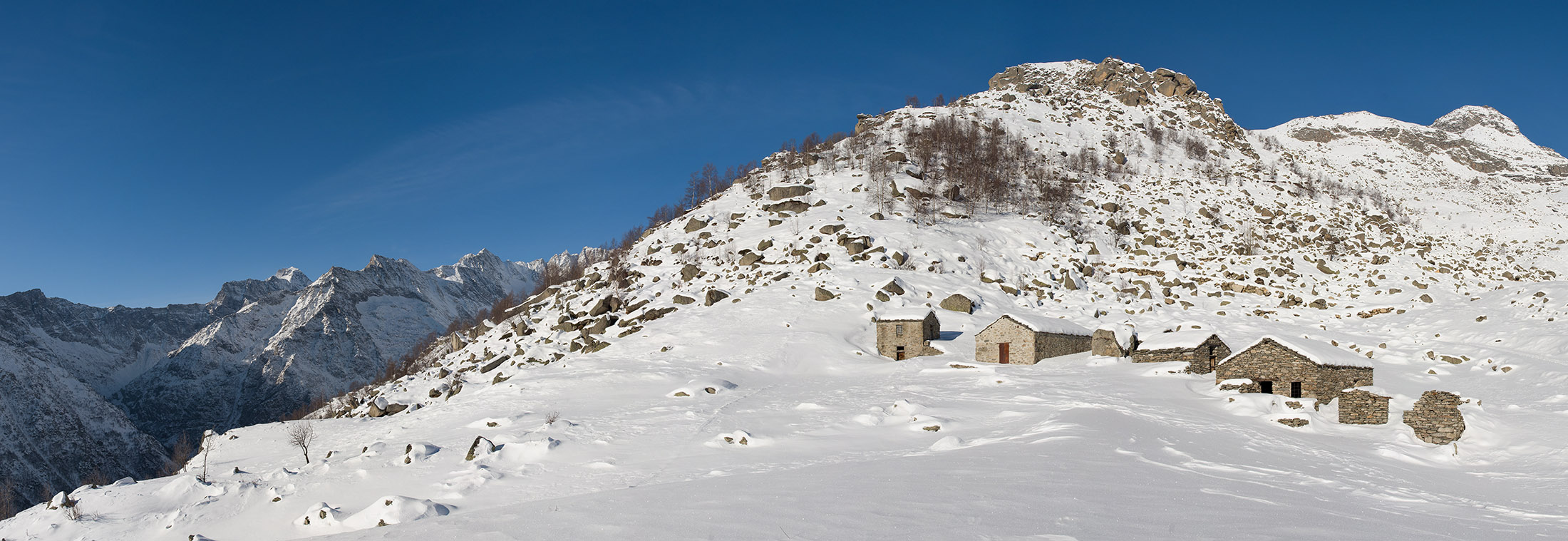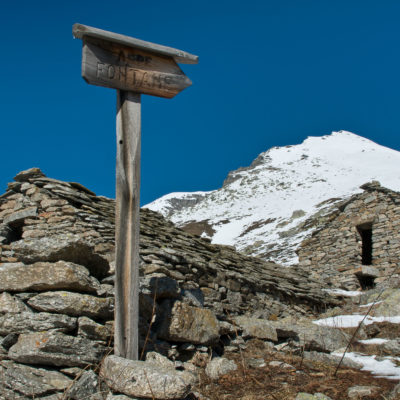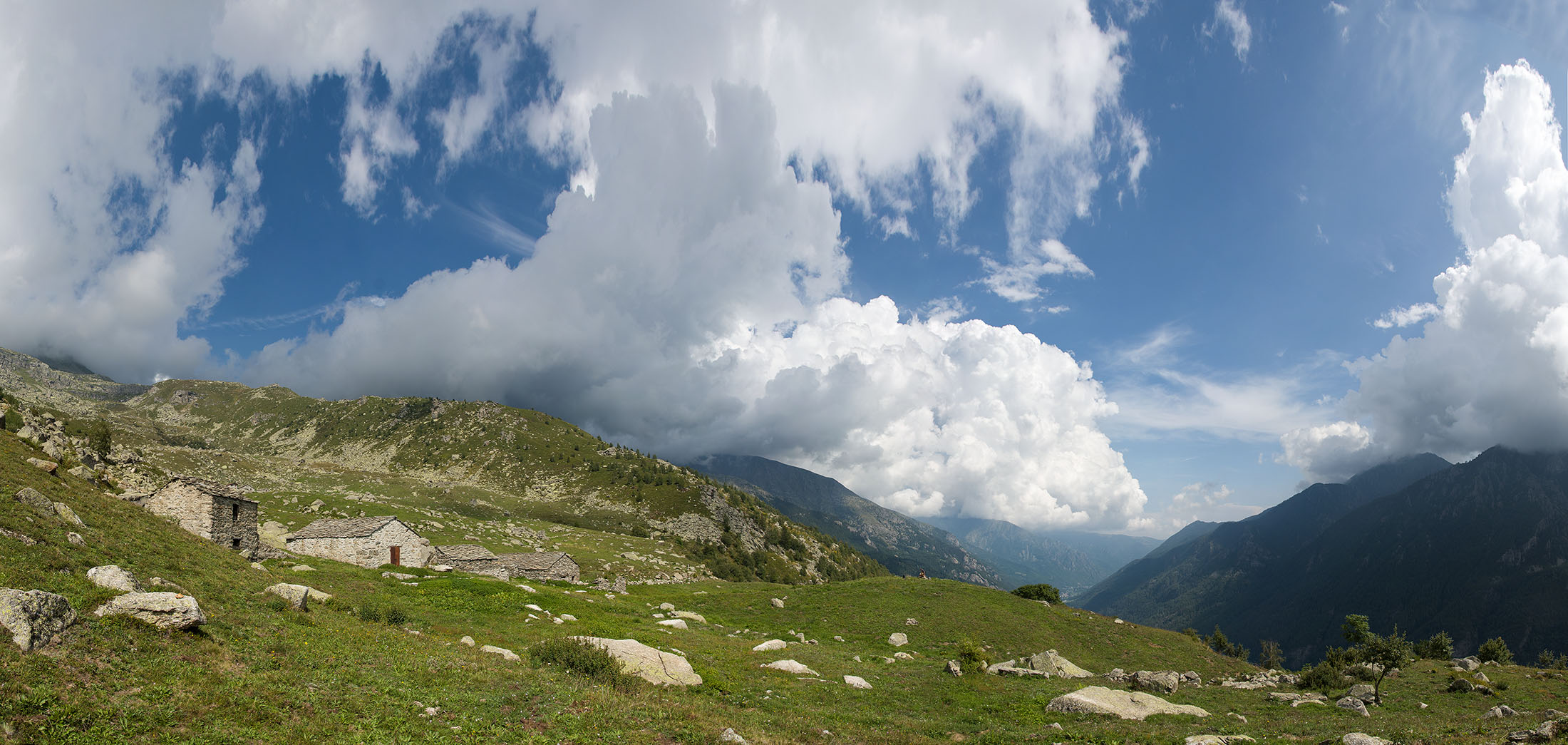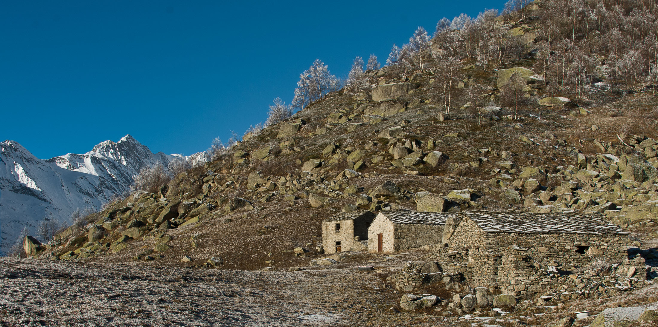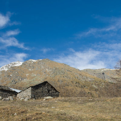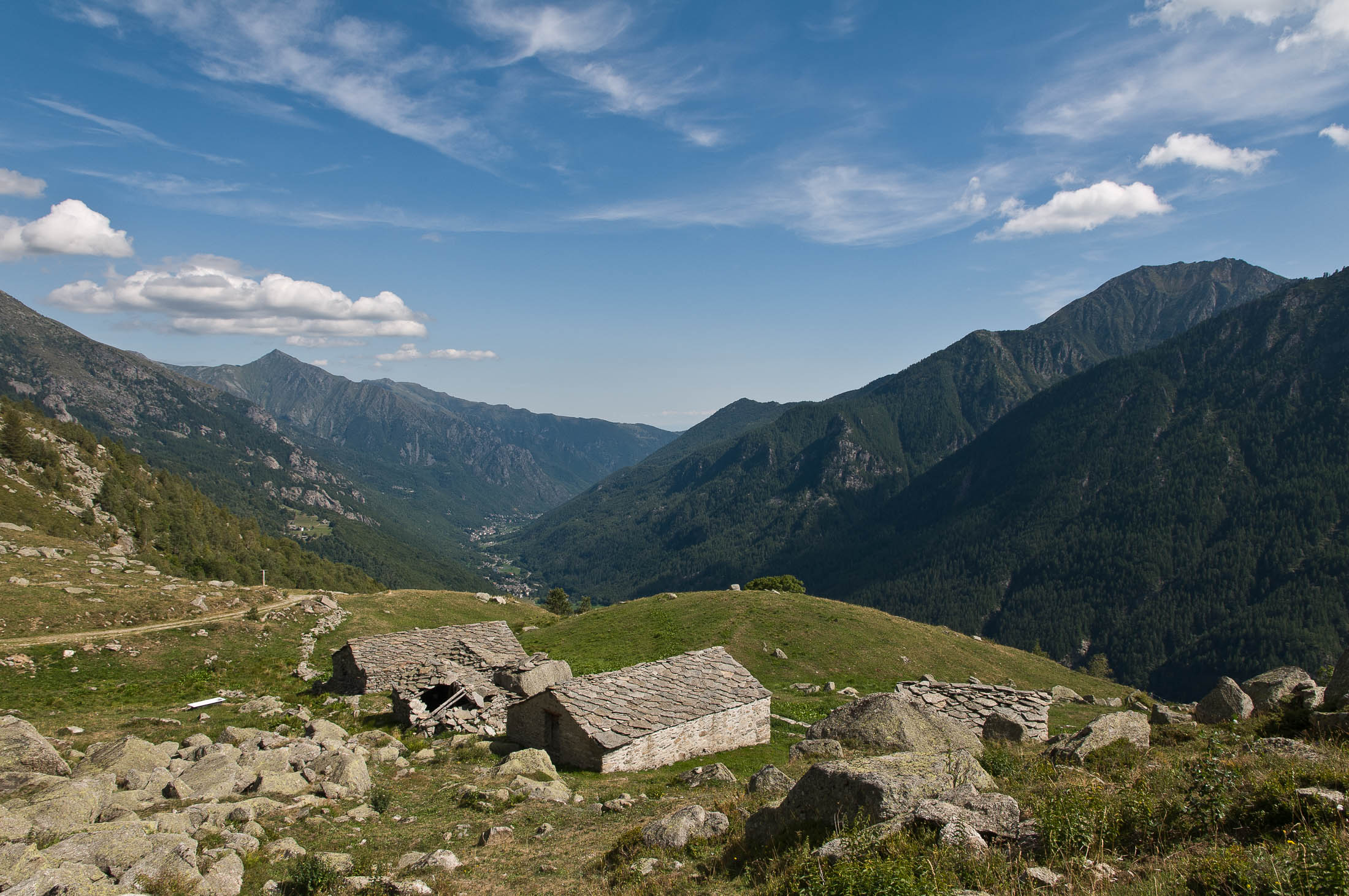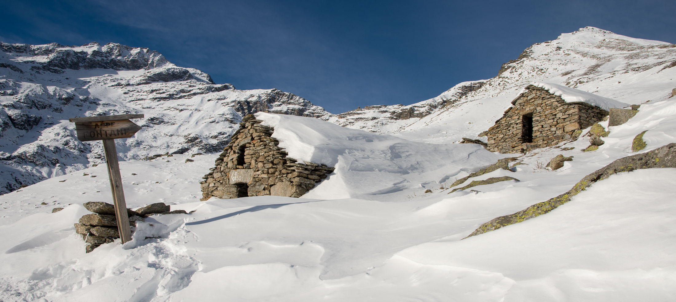 Über einige Serpentinen windet sich der Weg weiter talaufwärts, das Panorama wird immer eindrücklicher. Mit jedem Schritt nähert man sich dem Alpenhauptkamm mit der Gipfelkette zwischen der Uja di Ciamarella (3676 m) und der Levanna Orientale (3555 m), eine gigantische Kulisse mit vielen wilden Graten und Türmen. Es folgt ein längerer flacherer Wegabschnitt, die Hänge sind übersät von Geröllfeldern, ringsherum liegen riesige Steine in der Landschaft rum. Dann ein besonders auffälliger Felsbrocken, man könnte meinen, hier wäre ein Meteorit eingeschlagen. In der Nähe plätschert der Rio Sagnasse zu Tal, auf den von vielen Rinnsalen durchzogenen Feuchtwiesen blühen im Frühsommer Alpen-Kuhschellen, Enzian, Schlangen-Knöterich und Trollblumen. Zwei Kurven weiter oberhalb die aufgegebenen Hütten der Gias Crest (1880 m), ein Kuhstall ist noch intakt, das Schicksal der anderen Gebäude ist bereits besiegelt. Zurück bleiben zerborstene Dachbalken und herumliegende Trümmer. Dann erreicht man den Rand einer weiten Hochebene, ein wenig unterhalb die steinernen Hütten der in den Sommermonaten bewirtschafteten Alpe Pià Nou (1853 m), wo um diese Zeit zahlreiche Kühe und Rinder auf den umliegenden Weiden grasen. Im weiteren Verlauf überquert man die riesigen Alphochflächen der Gias dei Signori und der Gias Sagnasse. Jenseits davon umrundet der Sentiero Balcone sanft ansteigend einen Geländerücken und endet schliesslich wenig später bei den archaisch anmutenden Alpgebäuden der Gias Nuovo Fontane (1986 m). Ein abgeschiedener und faszinierender Ort inmitten einer gewaltigen Hochgebirgslandschaft. Das Panorama ist umfassend, man überblickt nahezu das gesamte Val Grande di Lanzo, vom Monte Bellavarda im Osten bis zum Steilabfall des Alpenhauptkamms, der hier zum Greifen nah ist.