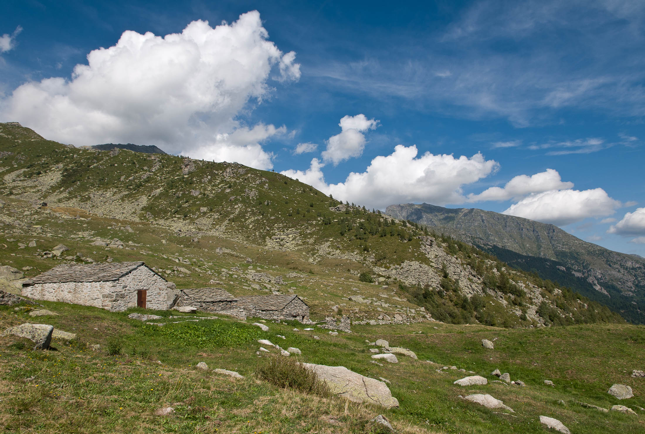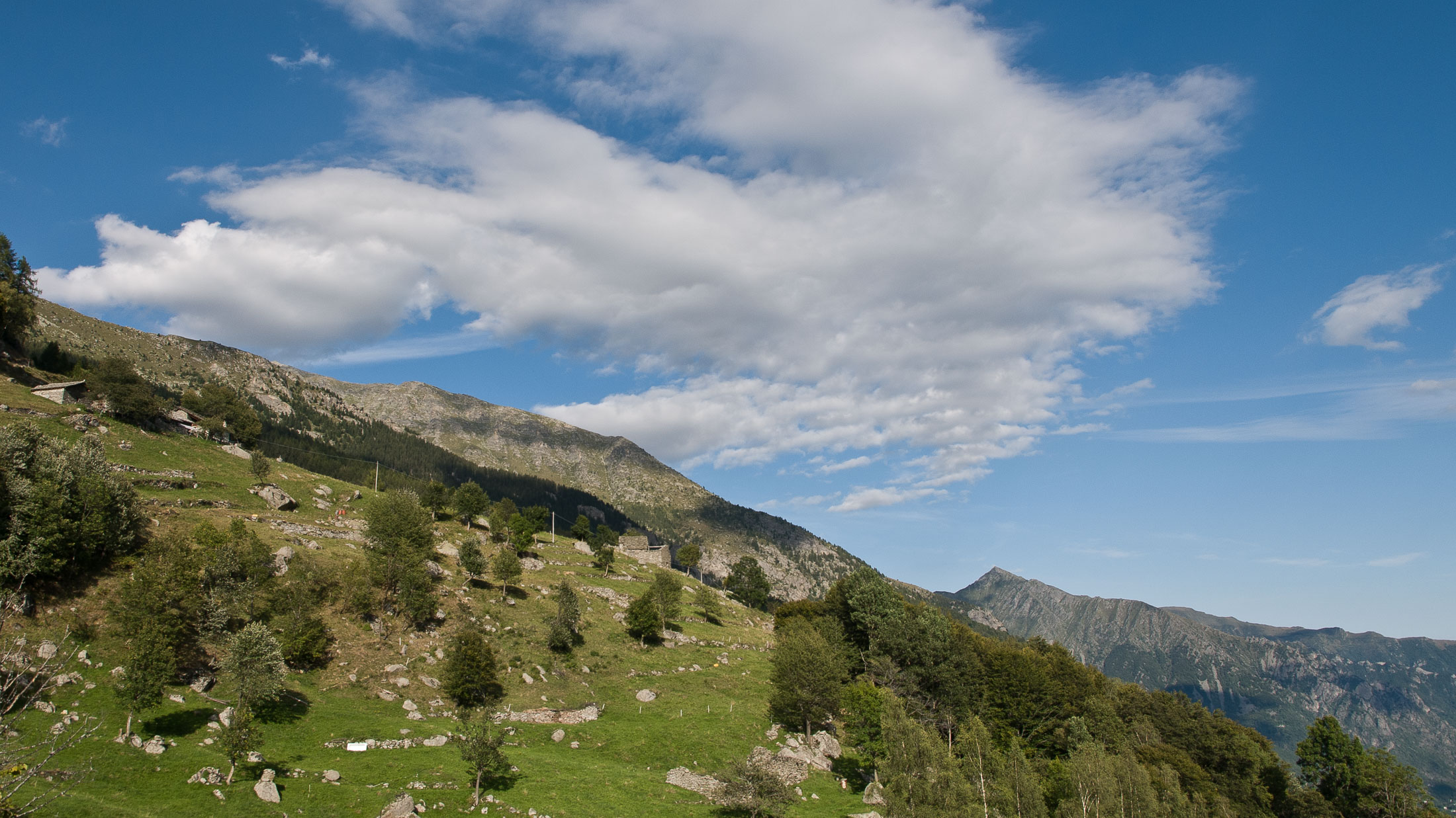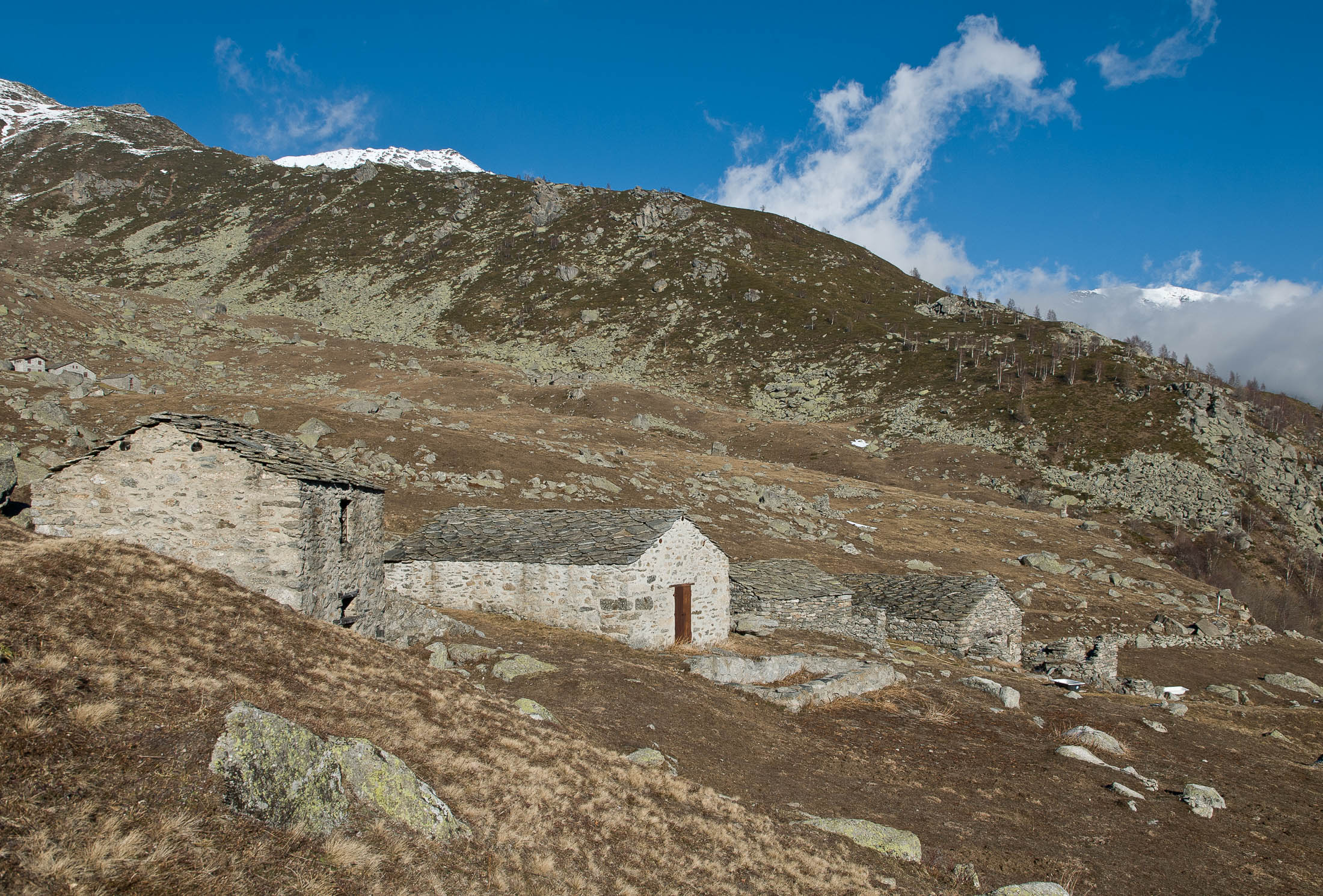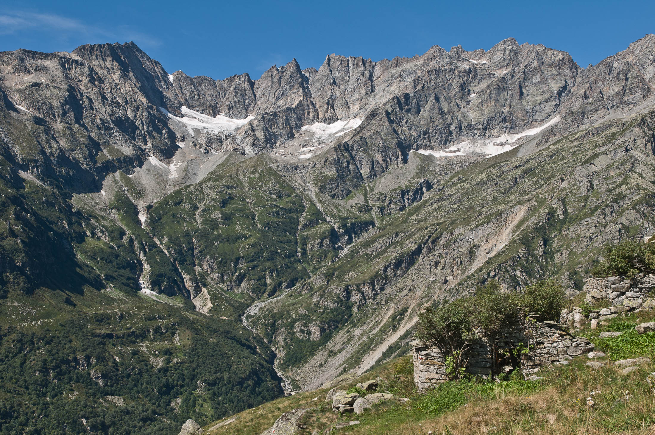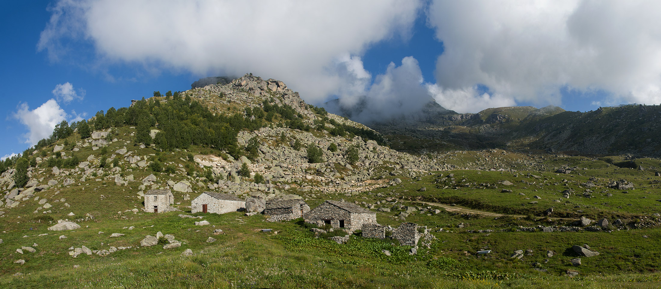 Über einige Serpentinen windet sich der Weg weiter talaufwärts, das Panorama wird immer eindrücklicher. Mit jedem Schritt nähert man sich dem Alpenhauptkamm mit der Gipfelkette zwischen der Uja di Ciamarella (3676 m) und der Levanna Orientale (3555 m), eine gigantische Kulisse mit vielen wilden Graten und Türmen. Es folgt ein längerer flacherer Wegabschnitt, die Hänge sind übersät von Geröllfeldern, ringsherum liegen riesige Steine in der Landschaft rum. Dann ein besonders auffälliger Felsbrocken, man könnte meinen, hier wäre ein Meteorit eingeschlagen. In der Nähe plätschert der Rio Sagnasse zu Tal, auf den von vielen Rinnsalen durchzogenen Feuchtwiesen blühen im Frühsommer Alpen-Kuhschellen, Enzian, Schlangen-Knöterich und Trollblumen. Zwei Kurven weiter oberhalb die aufgegebenen Hütten der Gias Crest (1880 m), ein Kuhstall ist noch intakt, das Schicksal der anderen Gebäude ist bereits besiegelt. Zurück bleiben zerborstene Dachbalken und herumliegende Trümmer. Dann erreicht man den Rand einer weiten Hochebene, ein wenig unterhalb die steinernen Hütten der in den Sommermonaten bewirtschafteten Alpe Pià Nou (1853 m), wo um diese Zeit zahlreiche Kühe und Rinder auf den umliegenden Weiden grasen. Im weiteren Verlauf überquert man die riesigen Alphochflächen der Gias dei Signori und der Gias Sagnasse. Jenseits davon umrundet der Sentiero Balcone sanft ansteigend einen Geländerücken und endet schliesslich wenig später bei den archaisch anmutenden Alpgebäuden der Gias Nuovo Fontane (1986 m). Ein abgeschiedener und faszinierender Ort inmitten einer gewaltigen Hochgebirgslandschaft. Das Panorama ist umfassend, man überblickt nahezu das gesamte Val Grande di Lanzo, vom Monte Bellavarda im Osten bis zum Steilabfall des Alpenhauptkamms, der hier zum Greifen nah ist.