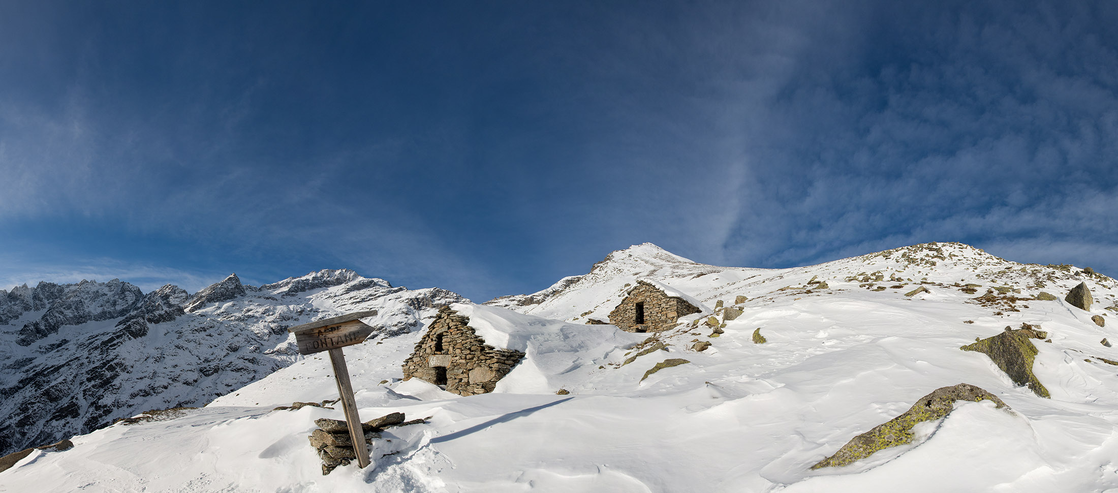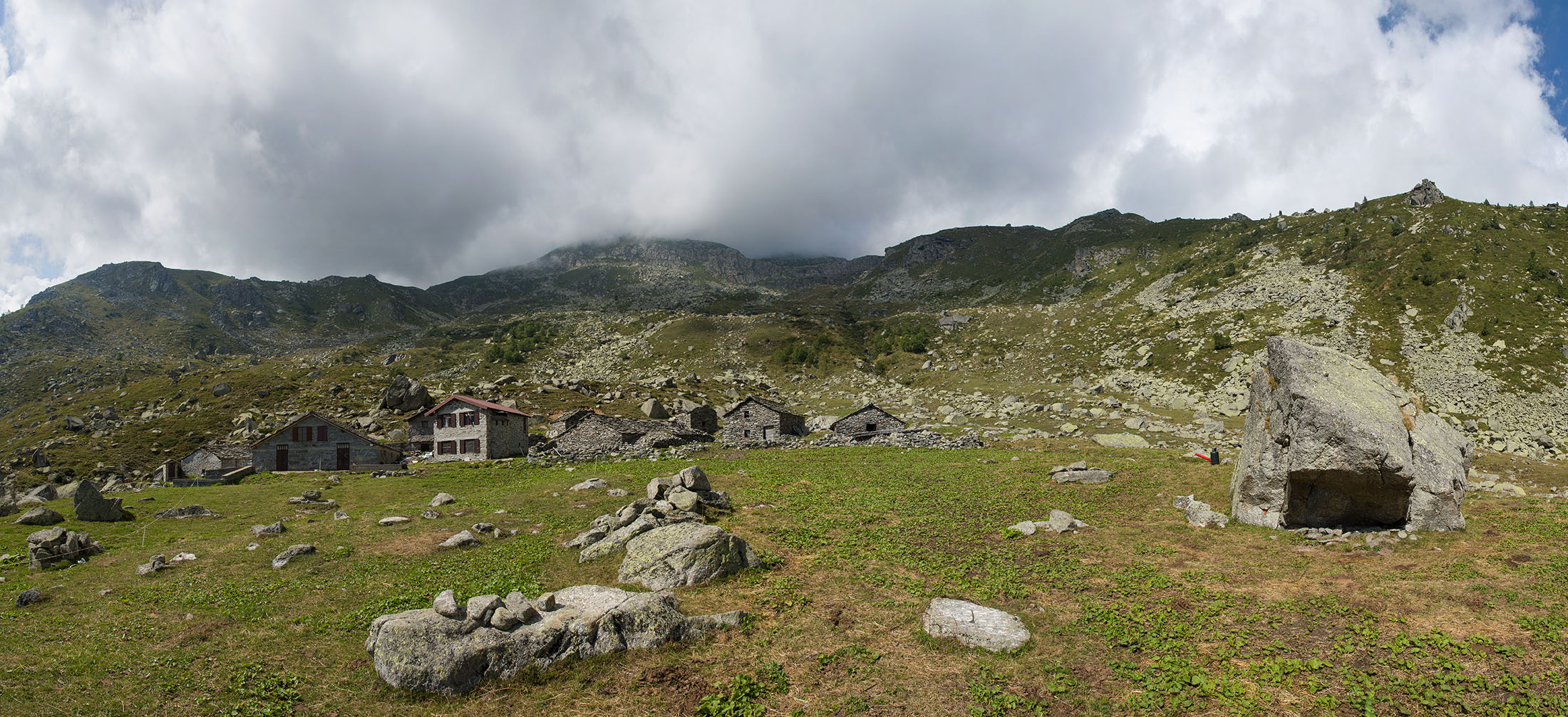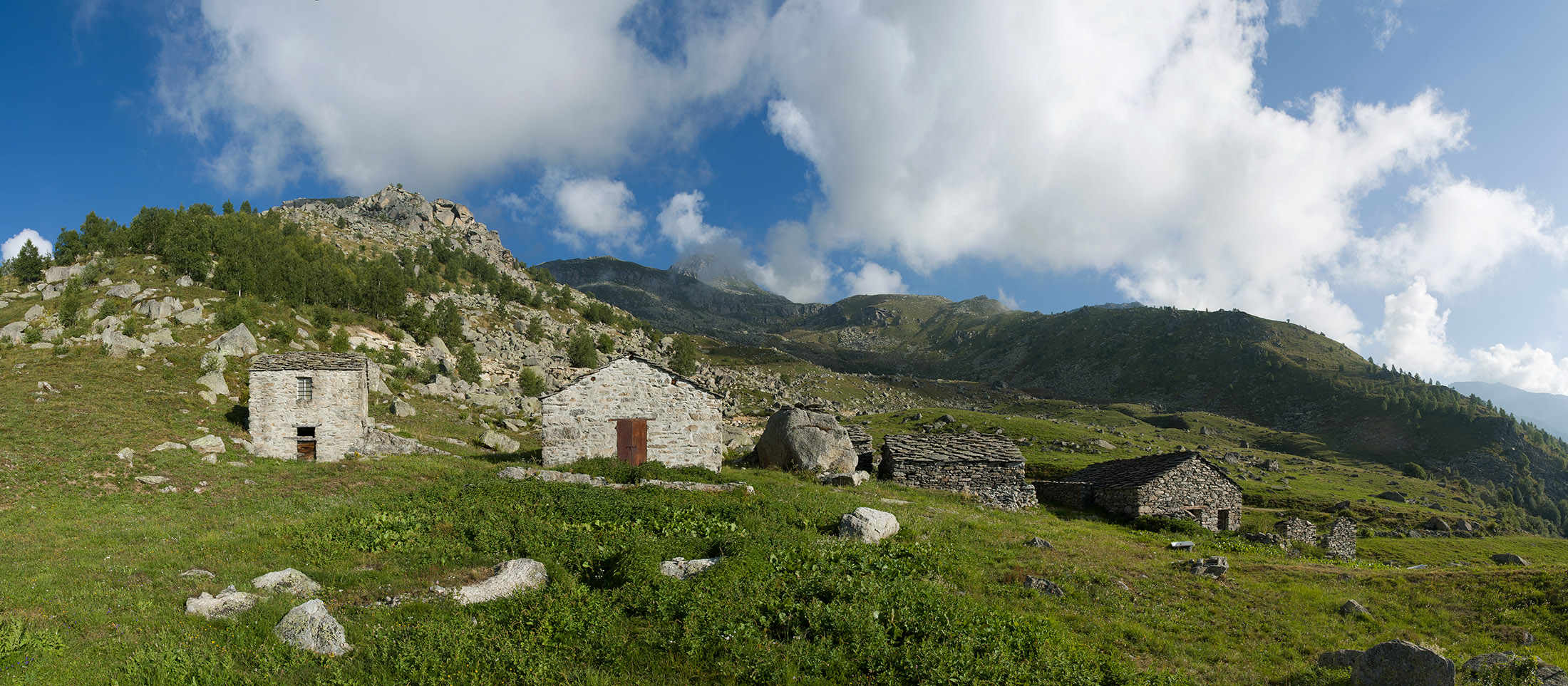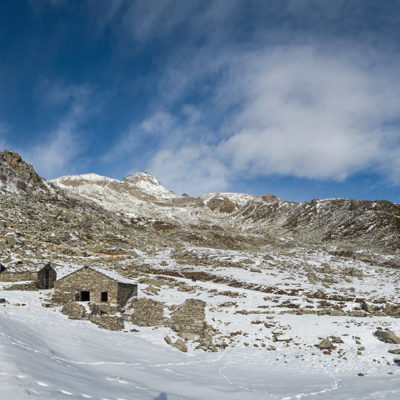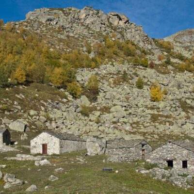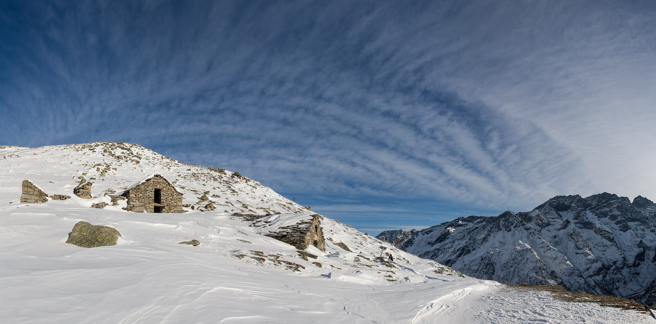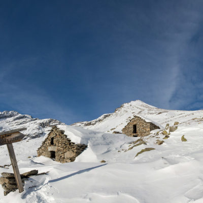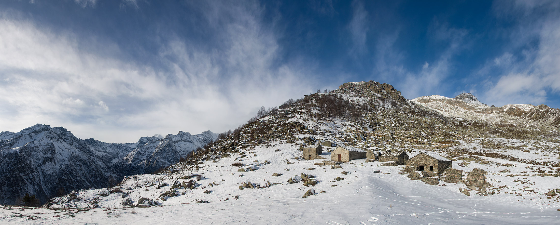 Über einige Serpentinen windet sich der Weg weiter talaufwärts, das Panorama wird immer eindrücklicher. Mit jedem Schritt nähert man sich dem Alpenhauptkamm mit der Gipfelkette zwischen der Uja di Ciamarella (3676 m) und der Levanna Orientale (3555 m), eine gigantische Kulisse mit vielen wilden Graten und Türmen. Es folgt ein längerer flacherer Wegabschnitt, die Hänge sind übersät von Geröllfeldern, ringsherum liegen riesige Steine in der Landschaft rum. Dann ein besonders auffälliger Felsbrocken, man könnte meinen, hier wäre ein Meteorit eingeschlagen. In der Nähe plätschert der Rio Sagnasse zu Tal, auf den von vielen Rinnsalen durchzogenen Feuchtwiesen blühen im Frühsommer Alpen-Kuhschellen, Enzian, Schlangen-Knöterich und Trollblumen. Zwei Kurven weiter oberhalb die aufgegebenen Hütten der Gias Crest (1880 m), ein Kuhstall ist noch intakt, das Schicksal der anderen Gebäude ist bereits besiegelt. Zurück bleiben zerborstene Dachbalken und herumliegende Trümmer. Dann erreicht man den Rand einer weiten Hochebene, ein wenig unterhalb die steinernen Hütten der in den Sommermonaten bewirtschafteten Alpe Pià Nou (1853 m), wo um diese Zeit zahlreiche Kühe und Rinder auf den umliegenden Weiden grasen. Im weiteren Verlauf überquert man die riesigen Alphochflächen der Gias dei Signori und der Gias Sagnasse. Jenseits davon umrundet der Sentiero Balcone sanft ansteigend einen Geländerücken und endet schliesslich wenig später bei den archaisch anmutenden Alpgebäuden der Gias Nuovo Fontane (1986 m). Ein abgeschiedener und faszinierender Ort inmitten einer gewaltigen Hochgebirgslandschaft. Das Panorama ist umfassend, man überblickt nahezu das gesamte Val Grande di Lanzo, vom Monte Bellavarda im Osten bis zum Steilabfall des Alpenhauptkamms, der hier zum Greifen nah ist.