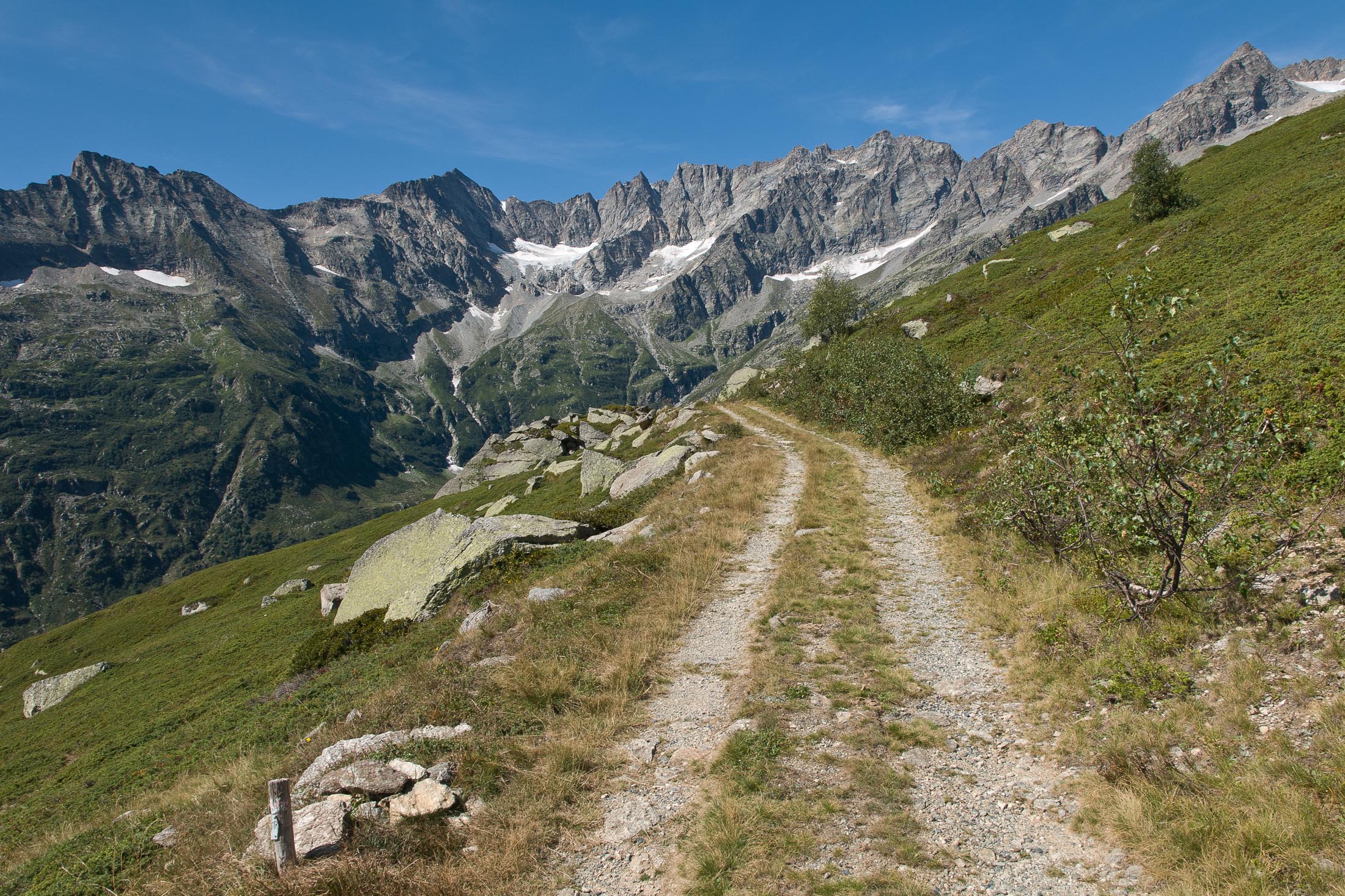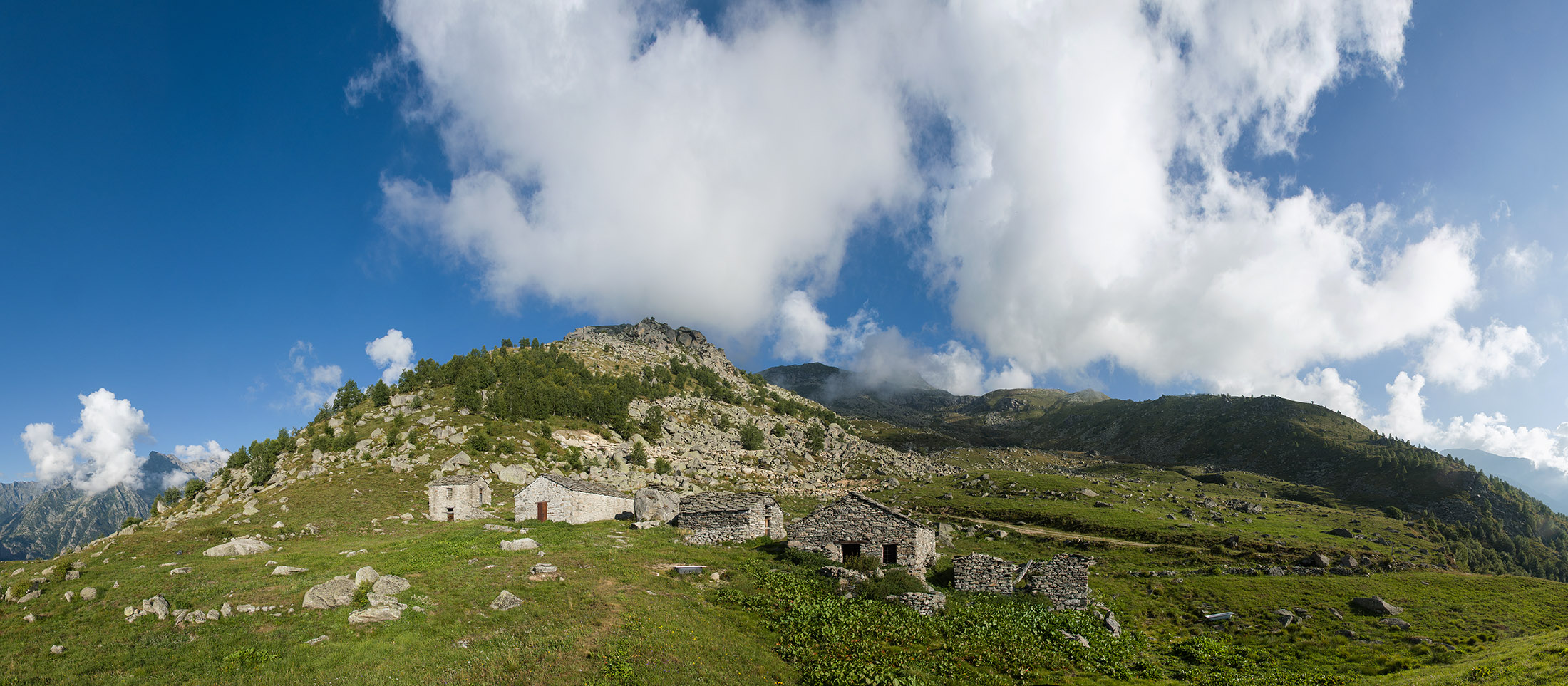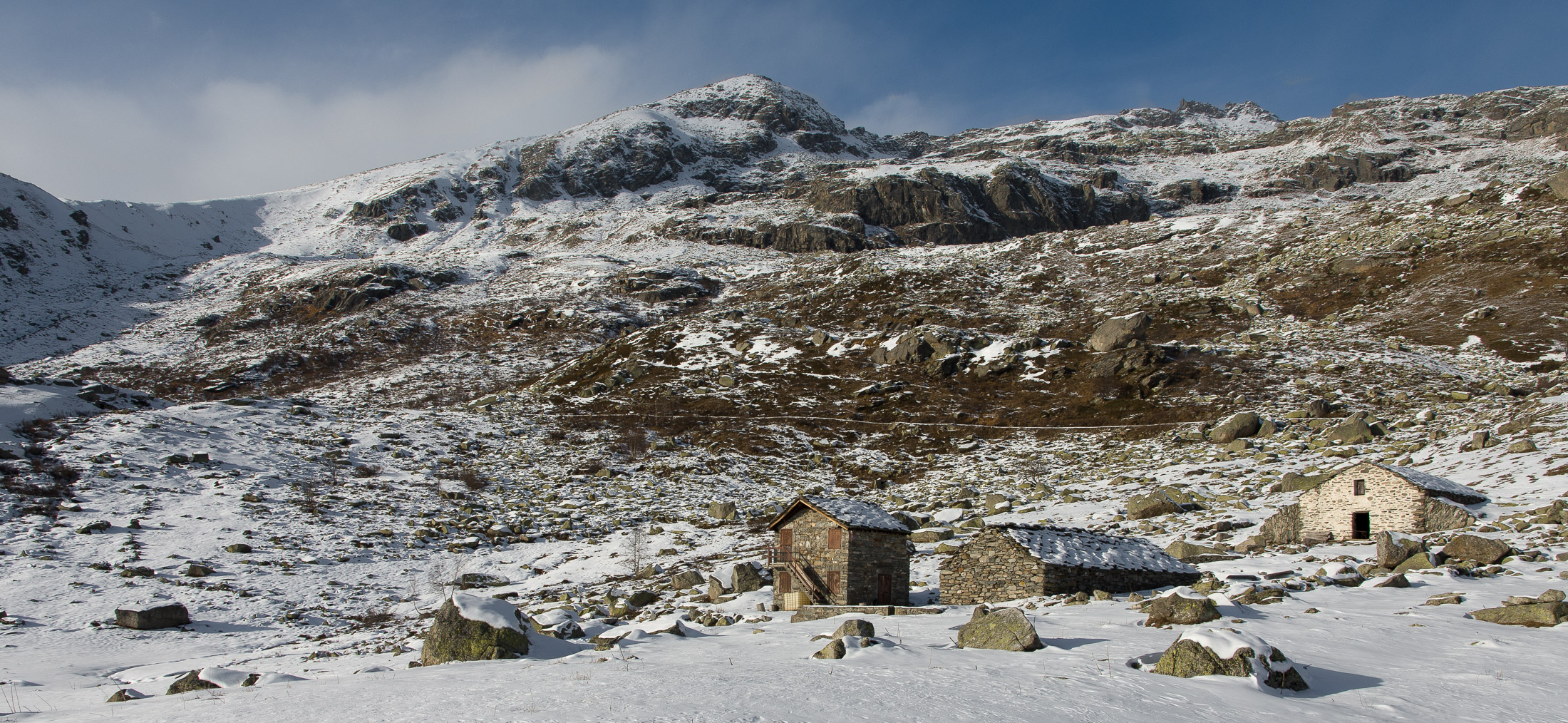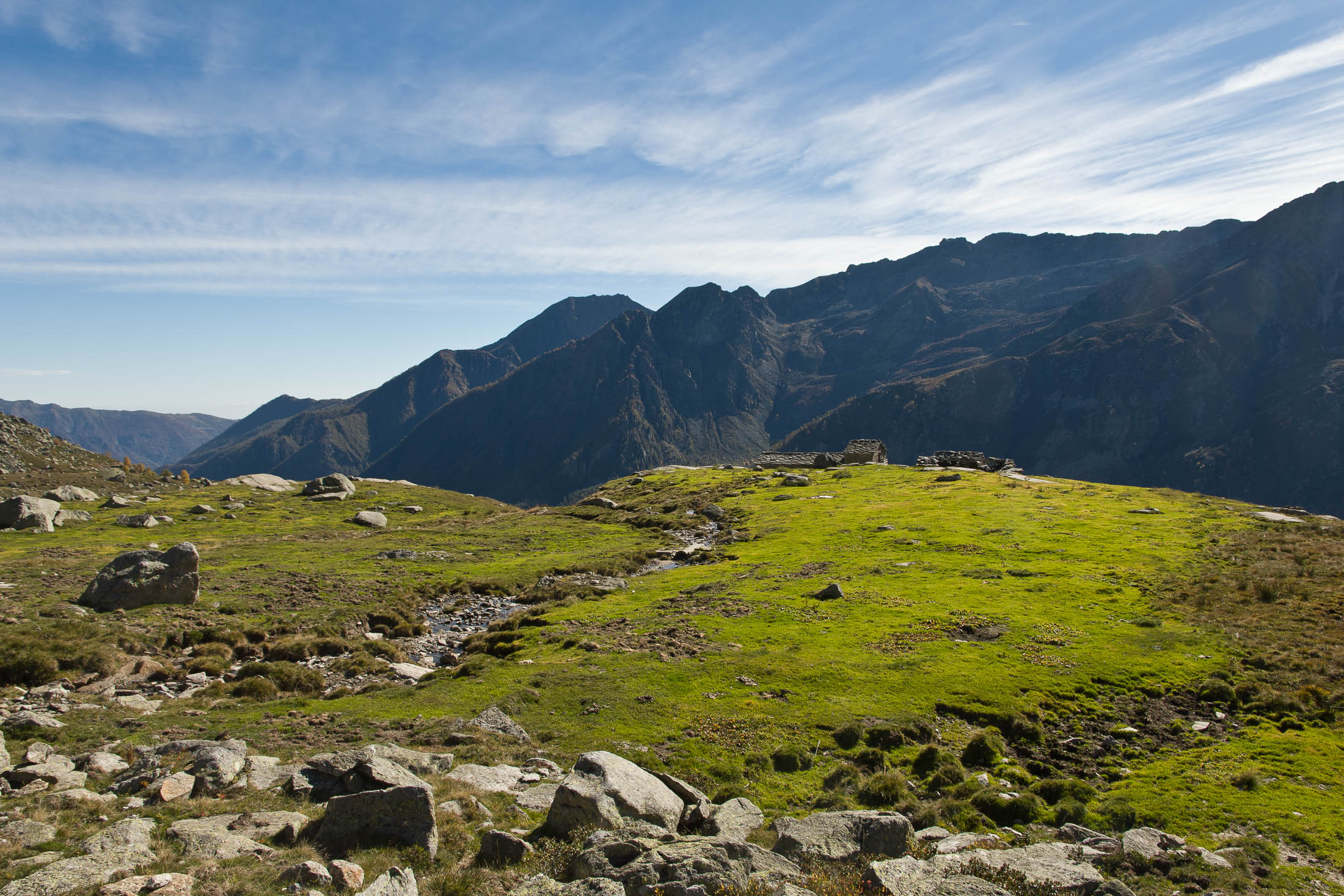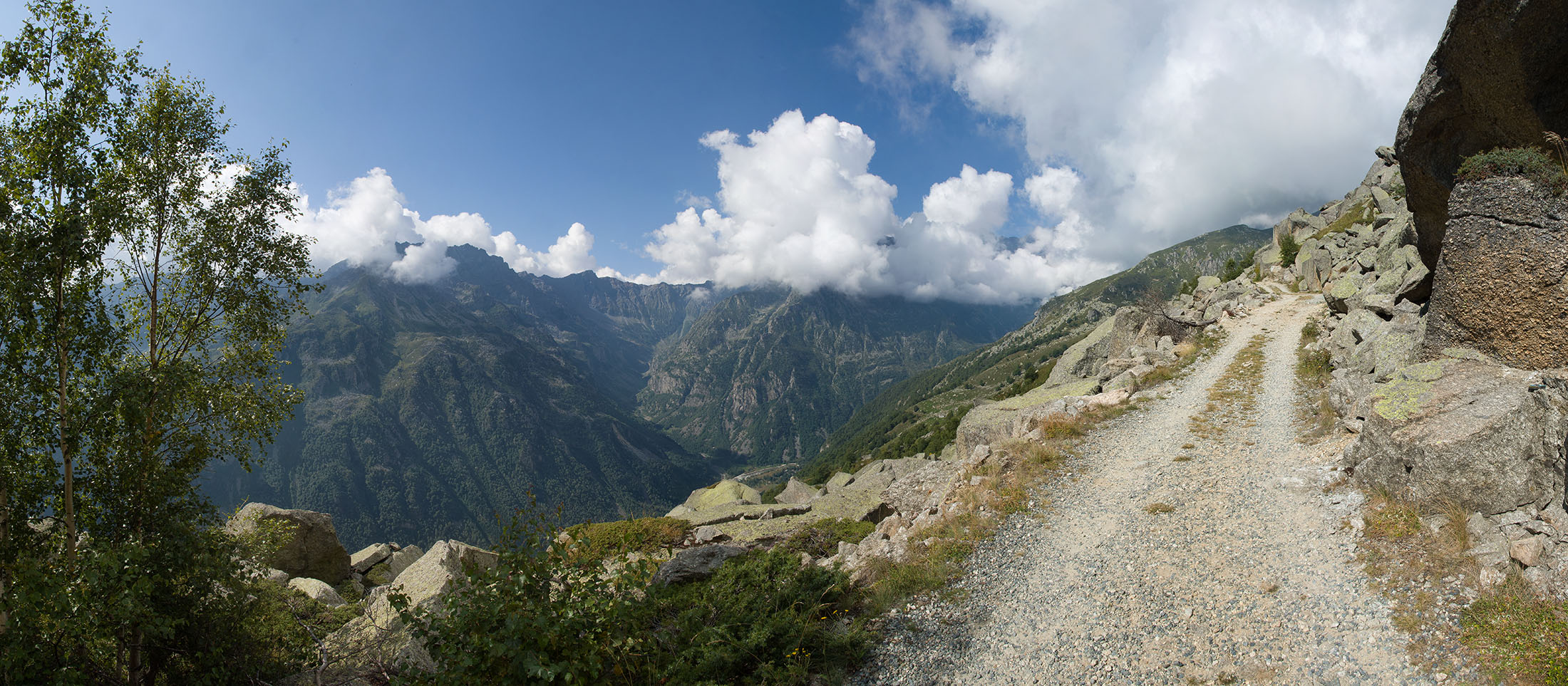 Über einige Serpentinen windet sich der Weg weiter talaufwärts, das Panorama wird immer eindrücklicher. Mit jedem Schritt nähert man sich dem Alpenhauptkamm mit der Gipfelkette zwischen der Uja di Ciamarella (3676 m) und der Levanna Orientale (3555 m), eine gigantische Kulisse mit vielen wilden Graten und Türmen. Es folgt ein längerer flacherer Wegabschnitt, die Hänge sind übersät von Geröllfeldern, ringsherum liegen riesige Steine in der Landschaft rum. Dann ein besonders auffälliger Felsbrocken, man könnte meinen, hier wäre ein Meteorit eingeschlagen. In der Nähe plätschert der Rio Sagnasse zu Tal, auf den von vielen Rinnsalen durchzogenen Feuchtwiesen blühen im Frühsommer Alpen-Kuhschellen, Enzian, Schlangen-Knöterich und Trollblumen. Zwei Kurven weiter oberhalb die aufgegebenen Hütten der Gias Crest (1880 m), ein Kuhstall ist noch intakt, das Schicksal der anderen Gebäude ist bereits besiegelt. Zurück bleiben zerborstene Dachbalken und herumliegende Trümmer. Dann erreicht man den Rand einer weiten Hochebene, ein wenig unterhalb die steinernen Hütten der in den Sommermonaten bewirtschafteten Alpe Pià Nou (1853 m), wo um diese Zeit zahlreiche Kühe und Rinder auf den umliegenden Weiden grasen. Im weiteren Verlauf überquert man die riesigen Alphochflächen der Gias dei Signori und der Gias Sagnasse. Jenseits davon umrundet der Sentiero Balcone sanft ansteigend einen Geländerücken und endet schliesslich wenig später bei den archaisch anmutenden Alpgebäuden der Gias Nuovo Fontane (1986 m). Ein abgeschiedener und faszinierender Ort inmitten einer gewaltigen Hochgebirgslandschaft. Das Panorama ist umfassend, man überblickt nahezu das gesamte Val Grande di Lanzo, vom Monte Bellavarda im Osten bis zum Steilabfall des Alpenhauptkamms, der hier zum Greifen nah ist.