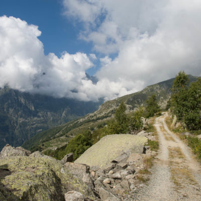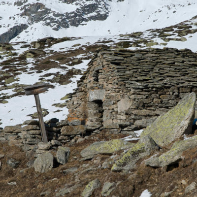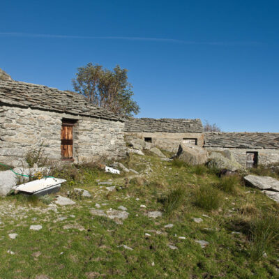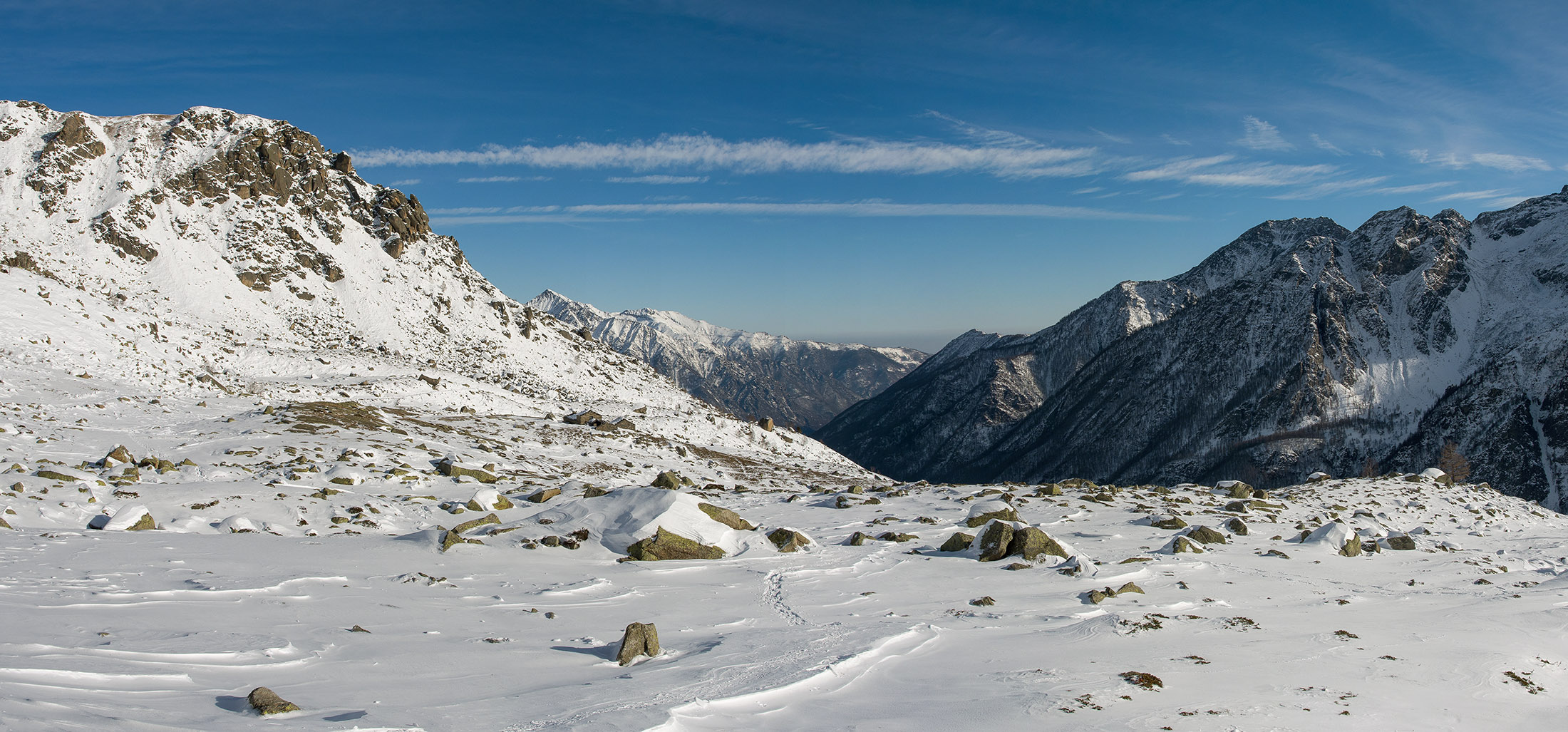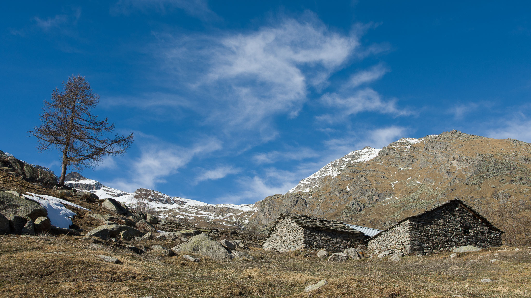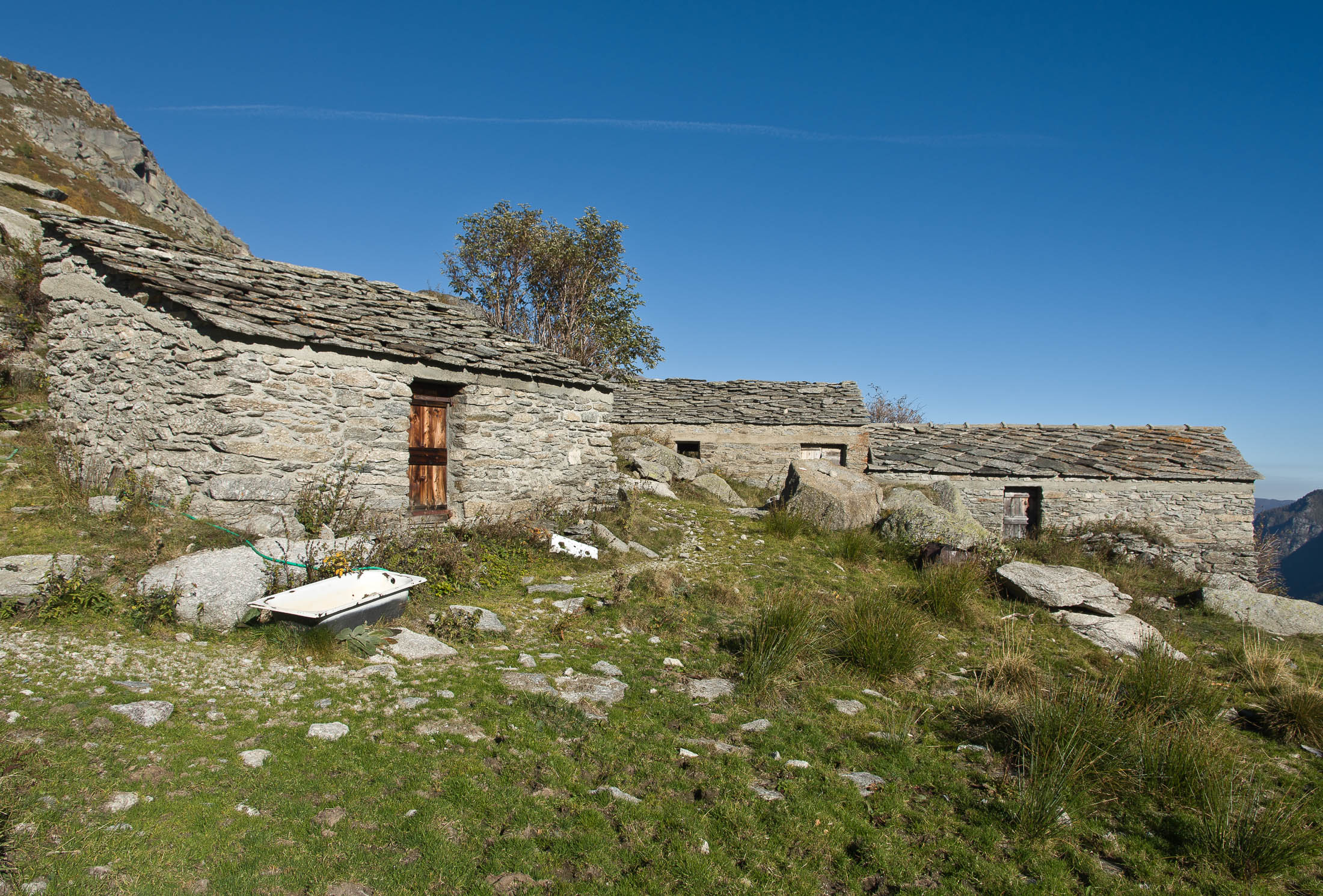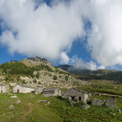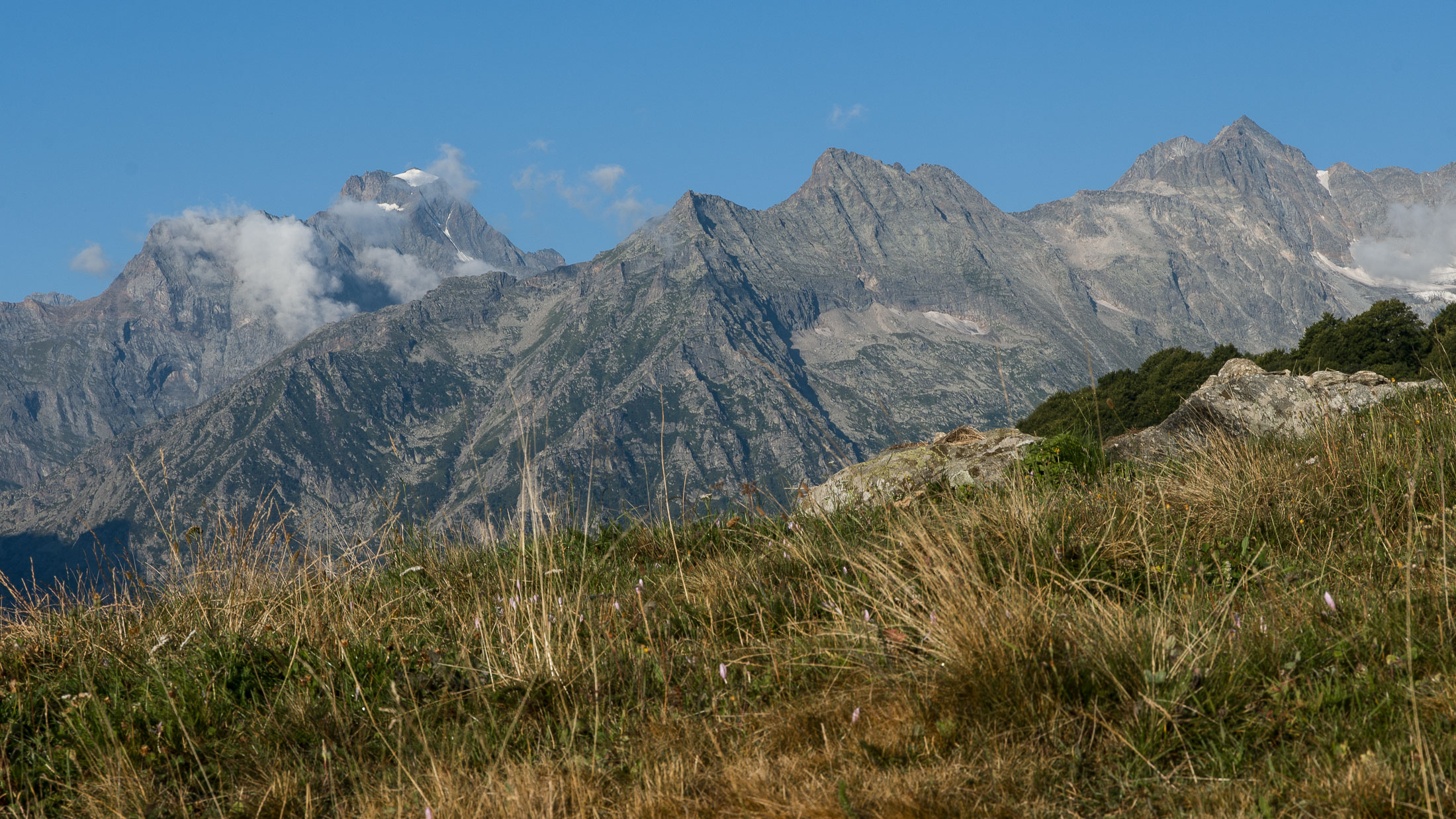 Über einige Serpentinen windet sich der Weg weiter talaufwärts, das Panorama wird immer eindrücklicher. Mit jedem Schritt nähert man sich dem Alpenhauptkamm mit der Gipfelkette zwischen der Uja di Ciamarella (3676 m) und der Levanna Orientale (3555 m), eine gigantische Kulisse mit vielen wilden Graten und Türmen. Es folgt ein längerer flacherer Wegabschnitt, die Hänge sind übersät von Geröllfeldern, ringsherum liegen riesige Steine in der Landschaft rum. Dann ein besonders auffälliger Felsbrocken, man könnte meinen, hier wäre ein Meteorit eingeschlagen. In der Nähe plätschert der Rio Sagnasse zu Tal, auf den von vielen Rinnsalen durchzogenen Feuchtwiesen blühen im Frühsommer Alpen-Kuhschellen, Enzian, Schlangen-Knöterich und Trollblumen. Zwei Kurven weiter oberhalb die aufgegebenen Hütten der Gias Crest (1880 m), ein Kuhstall ist noch intakt, das Schicksal der anderen Gebäude ist bereits besiegelt. Zurück bleiben zerborstene Dachbalken und herumliegende Trümmer. Dann erreicht man den Rand einer weiten Hochebene, ein wenig unterhalb die steinernen Hütten der in den Sommermonaten bewirtschafteten Alpe Pià Nou (1853 m), wo um diese Zeit zahlreiche Kühe und Rinder auf den umliegenden Weiden grasen. Im weiteren Verlauf überquert man die riesigen Alphochflächen der Gias dei Signori und der Gias Sagnasse. Jenseits davon umrundet der Sentiero Balcone sanft ansteigend einen Geländerücken und endet schliesslich wenig später bei den archaisch anmutenden Alpgebäuden der Gias Nuovo Fontane (1986 m). Ein abgeschiedener und faszinierender Ort inmitten einer gewaltigen Hochgebirgslandschaft. Das Panorama ist umfassend, man überblickt nahezu das gesamte Val Grande di Lanzo, vom Monte Bellavarda im Osten bis zum Steilabfall des Alpenhauptkamms, der hier zum Greifen nah ist.