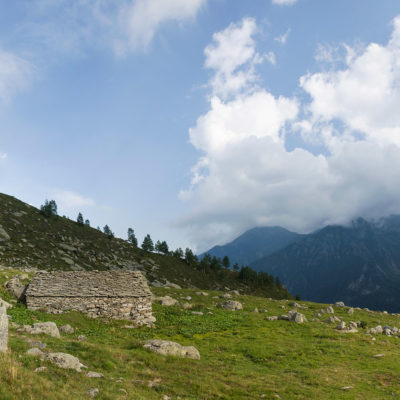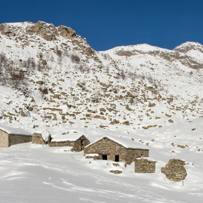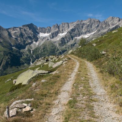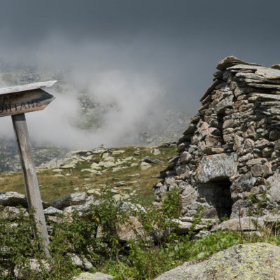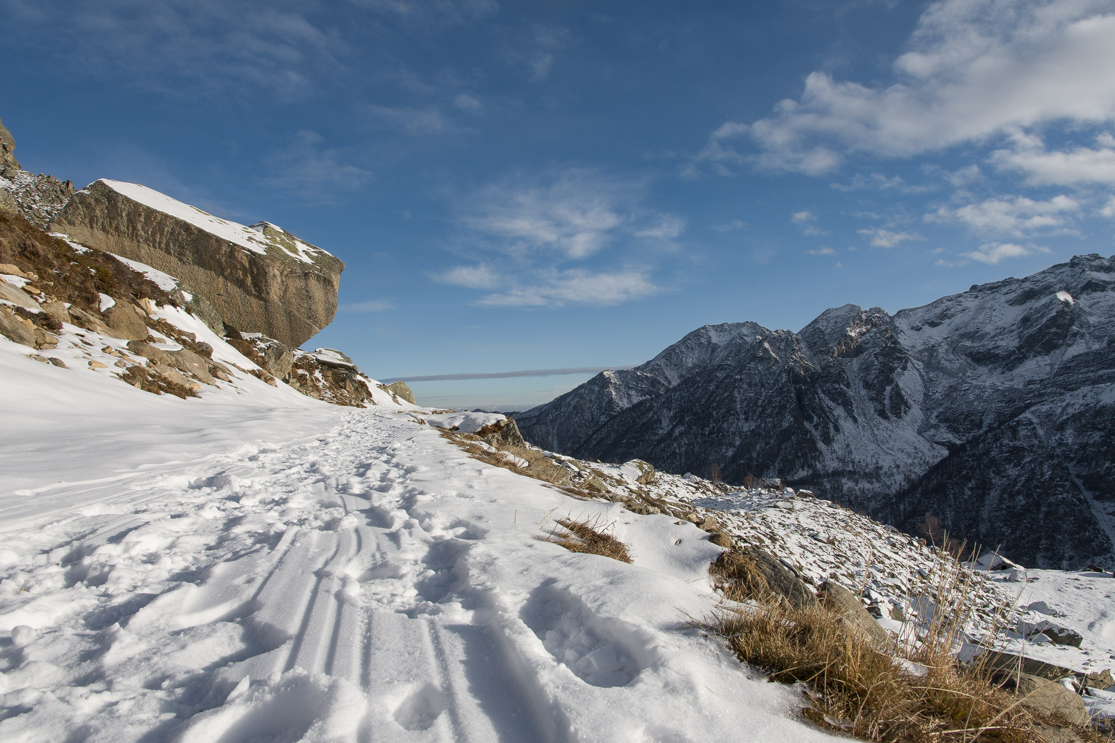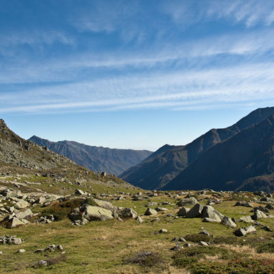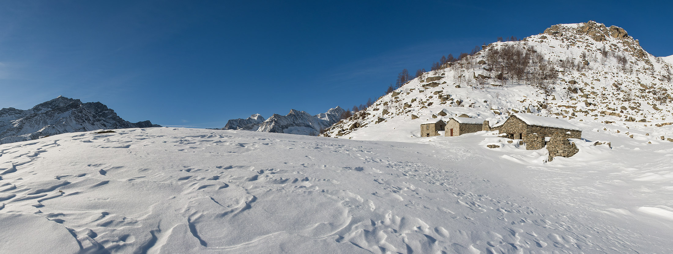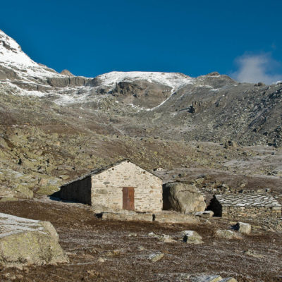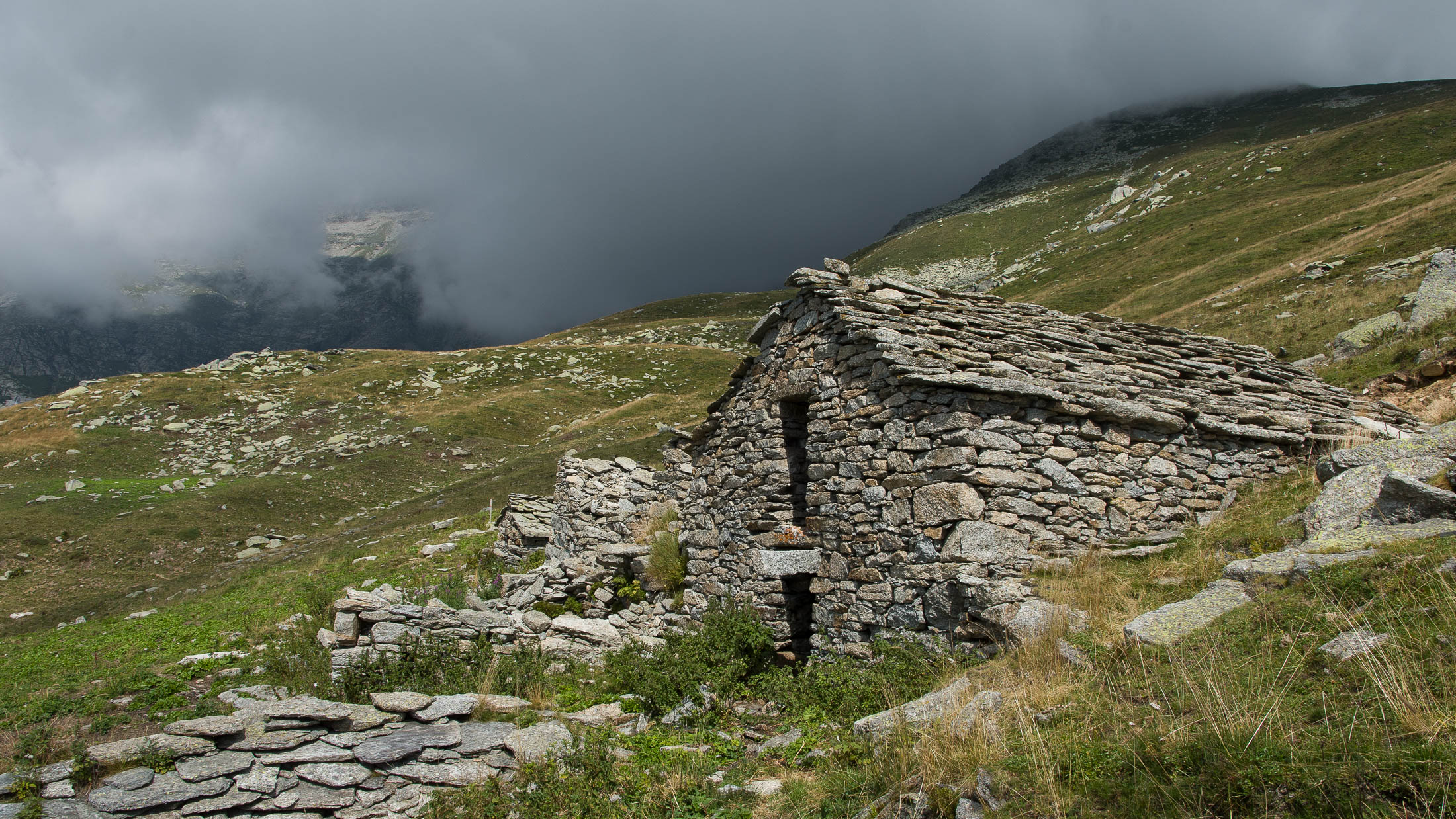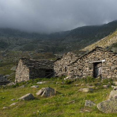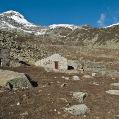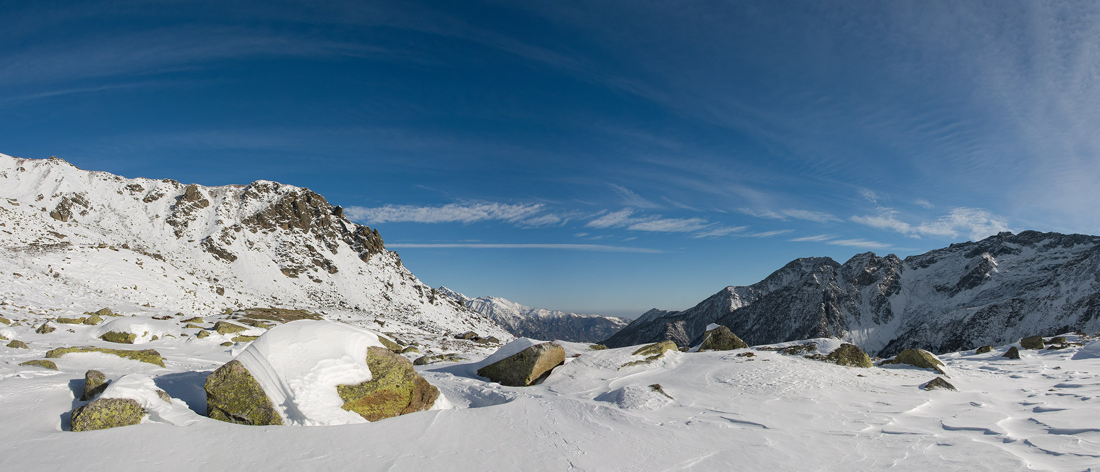 Über einige Serpentinen windet sich der Weg weiter talaufwärts, das Panorama wird immer eindrücklicher. Mit jedem Schritt nähert man sich dem Alpenhauptkamm mit der Gipfelkette zwischen der Uja di Ciamarella (3676 m) und der Levanna Orientale (3555 m), eine gigantische Kulisse mit vielen wilden Graten und Türmen. Es folgt ein längerer flacherer Wegabschnitt, die Hänge sind übersät von Geröllfeldern, ringsherum liegen riesige Steine in der Landschaft rum. Dann ein besonders auffälliger Felsbrocken, man könnte meinen, hier wäre ein Meteorit eingeschlagen. In der Nähe plätschert der Rio Sagnasse zu Tal, auf den von vielen Rinnsalen durchzogenen Feuchtwiesen blühen im Frühsommer Alpen-Kuhschellen, Enzian, Schlangen-Knöterich und Trollblumen. Zwei Kurven weiter oberhalb die aufgegebenen Hütten der Gias Crest (1880 m), ein Kuhstall ist noch intakt, das Schicksal der anderen Gebäude ist bereits besiegelt. Zurück bleiben zerborstene Dachbalken und herumliegende Trümmer. Dann erreicht man den Rand einer weiten Hochebene, ein wenig unterhalb die steinernen Hütten der in den Sommermonaten bewirtschafteten Alpe Pià Nou (1853 m), wo um diese Zeit zahlreiche Kühe und Rinder auf den umliegenden Weiden grasen. Im weiteren Verlauf überquert man die riesigen Alphochflächen der Gias dei Signori und der Gias Sagnasse. Jenseits davon umrundet der Sentiero Balcone sanft ansteigend einen Geländerücken und endet schliesslich wenig später bei den archaisch anmutenden Alpgebäuden der Gias Nuovo Fontane (1986 m). Ein abgeschiedener und faszinierender Ort inmitten einer gewaltigen Hochgebirgslandschaft. Das Panorama ist umfassend, man überblickt nahezu das gesamte Val Grande di Lanzo, vom Monte Bellavarda im Osten bis zum Steilabfall des Alpenhauptkamms, der hier zum Greifen nah ist.