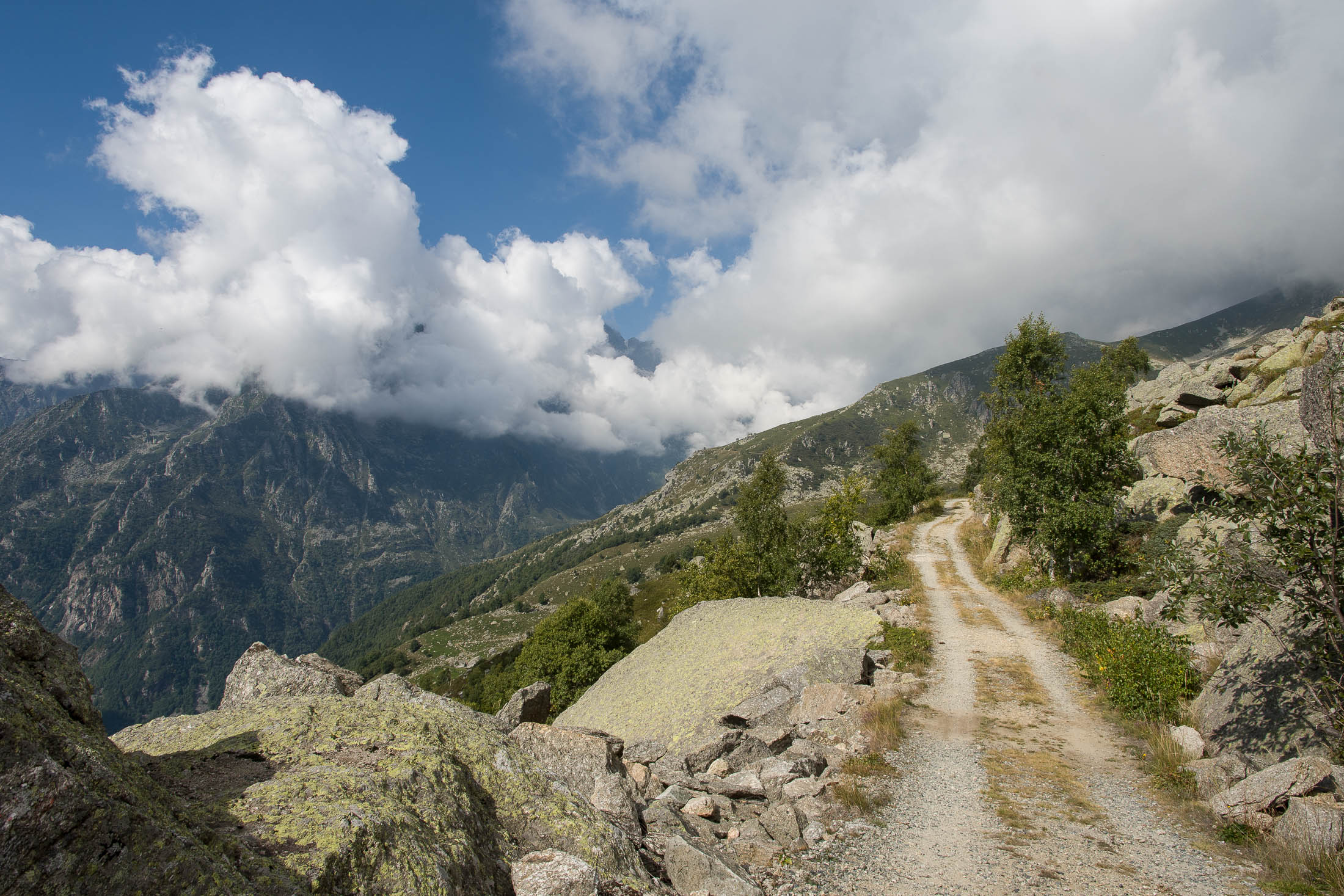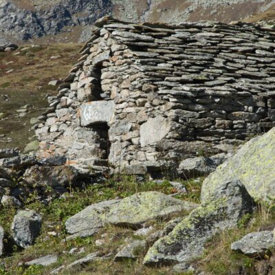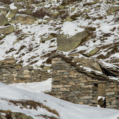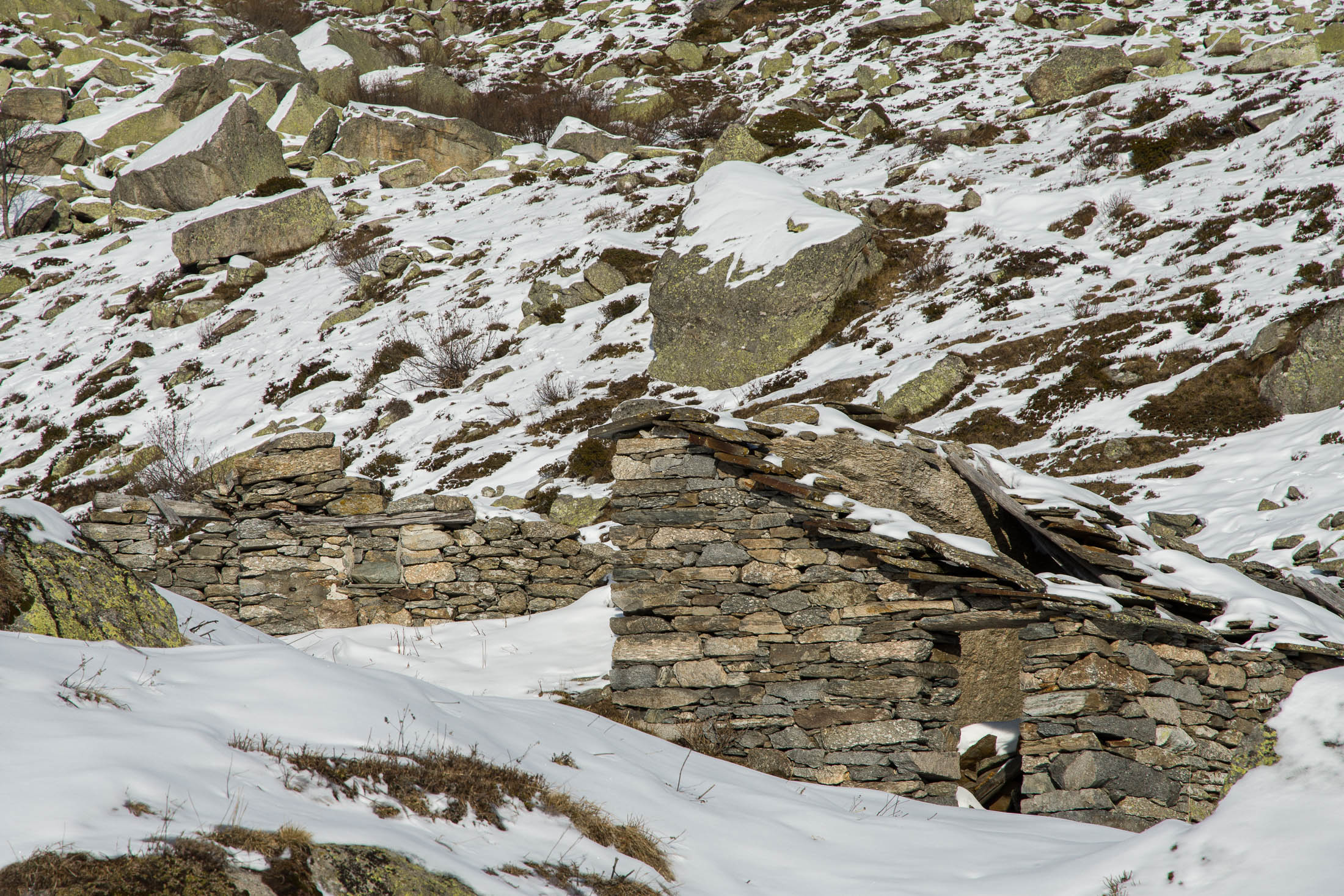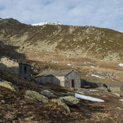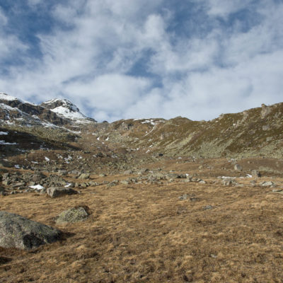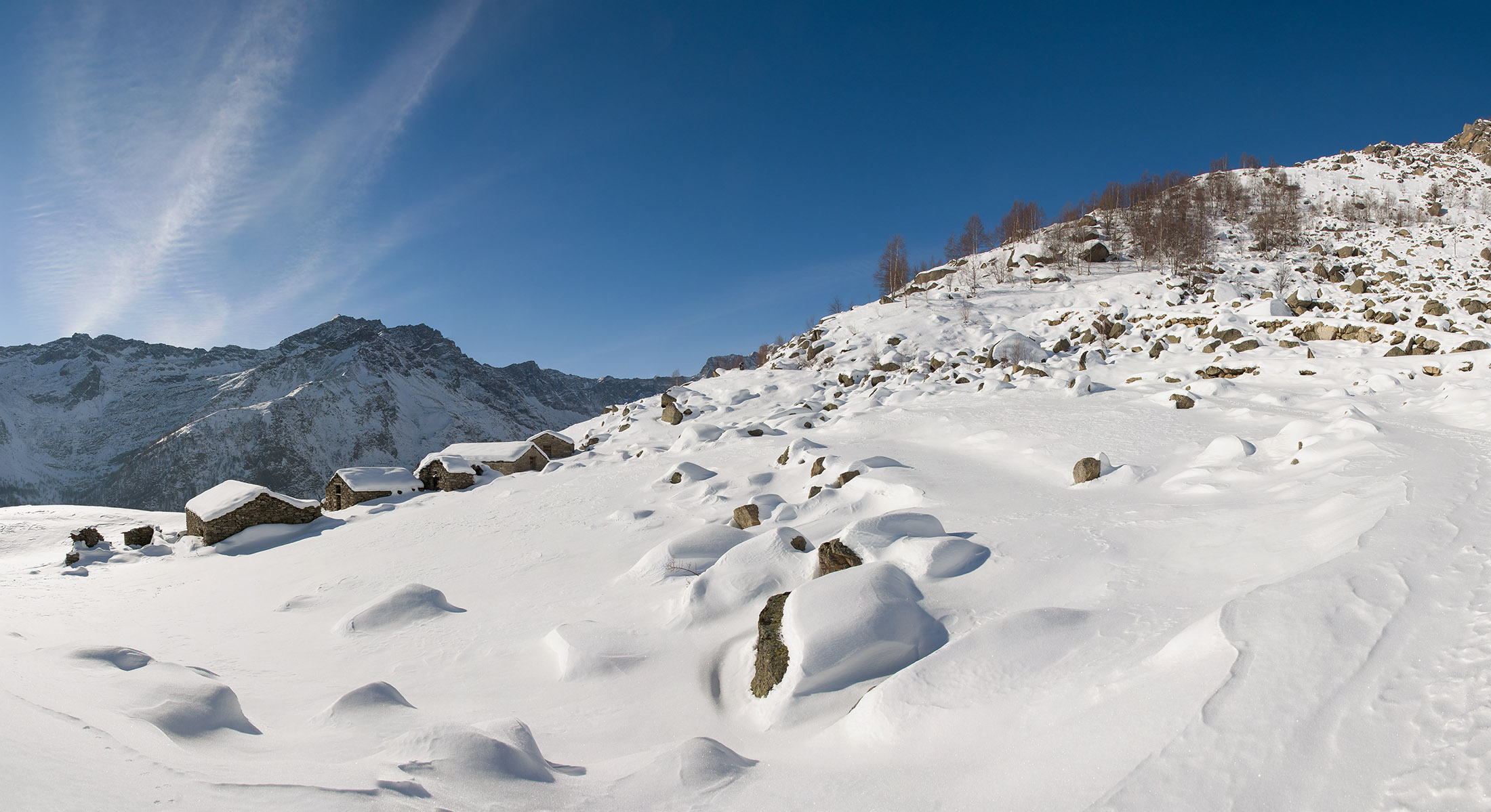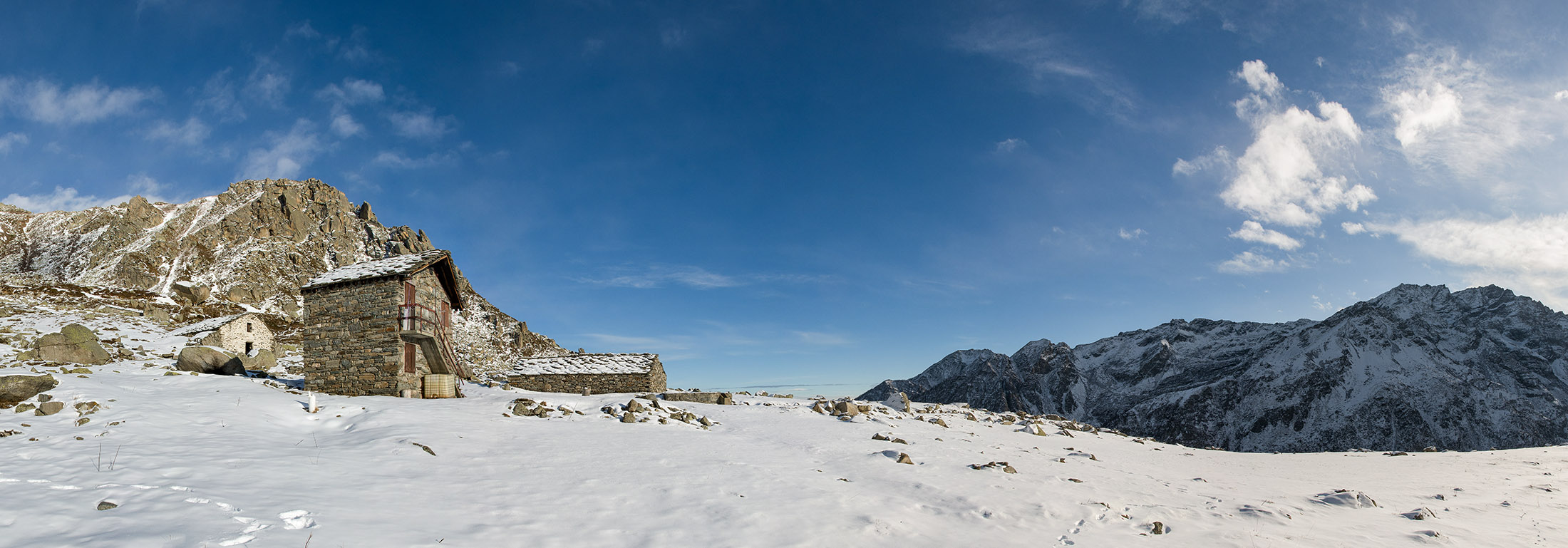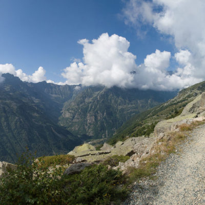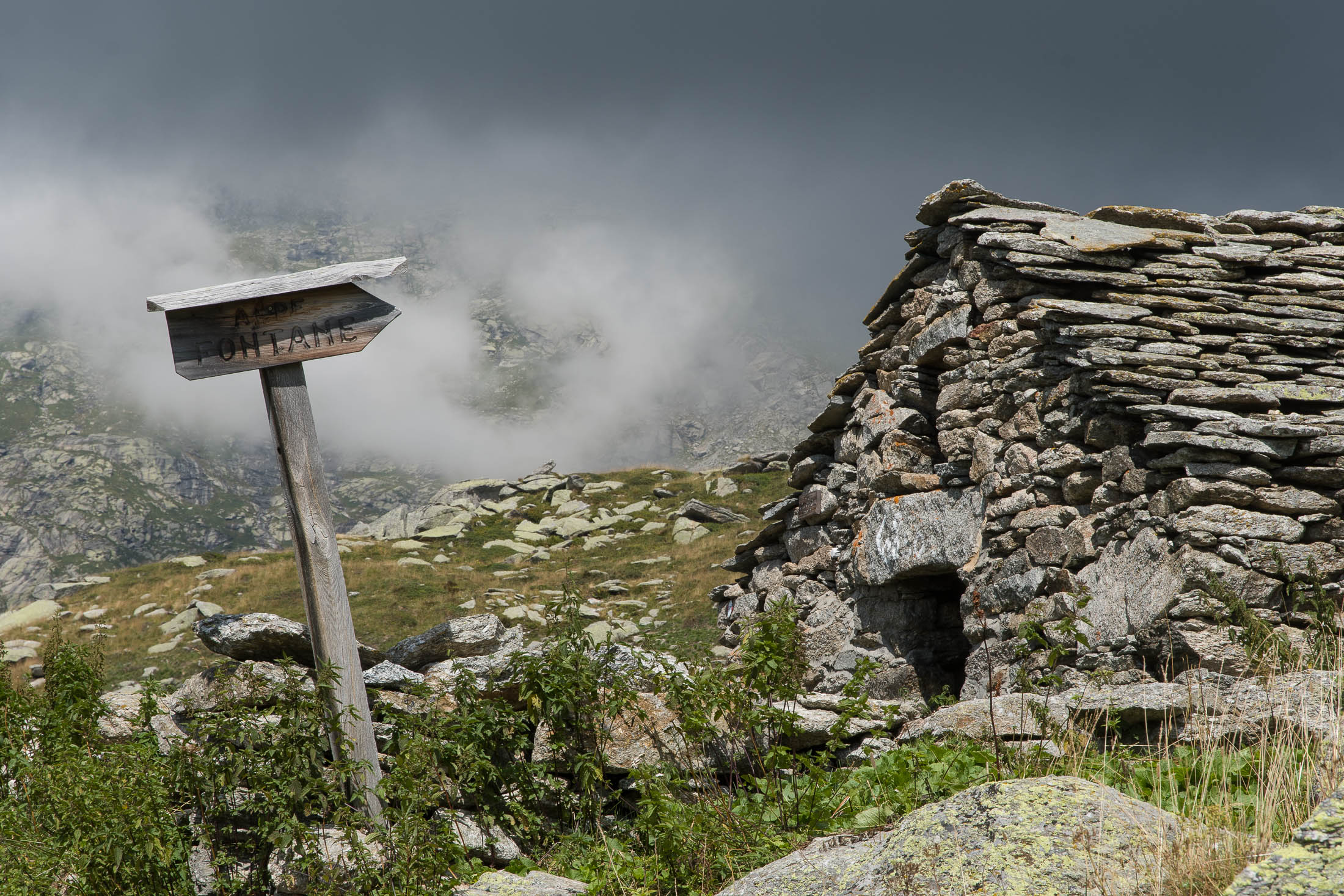 Über einige Serpentinen windet sich der Weg weiter talaufwärts, das Panorama wird immer eindrücklicher. Mit jedem Schritt nähert man sich dem Alpenhauptkamm mit der Gipfelkette zwischen der Uja di Ciamarella (3676 m) und der Levanna Orientale (3555 m), eine gigantische Kulisse mit vielen wilden Graten und Türmen. Es folgt ein längerer flacherer Wegabschnitt, die Hänge sind übersät von Geröllfeldern, ringsherum liegen riesige Steine in der Landschaft rum. Dann ein besonders auffälliger Felsbrocken, man könnte meinen, hier wäre ein Meteorit eingeschlagen. In der Nähe plätschert der Rio Sagnasse zu Tal, auf den von vielen Rinnsalen durchzogenen Feuchtwiesen blühen im Frühsommer Alpen-Kuhschellen, Enzian, Schlangen-Knöterich und Trollblumen. Zwei Kurven weiter oberhalb die aufgegebenen Hütten der Gias Crest (1880 m), ein Kuhstall ist noch intakt, das Schicksal der anderen Gebäude ist bereits besiegelt. Zurück bleiben zerborstene Dachbalken und herumliegende Trümmer. Dann erreicht man den Rand einer weiten Hochebene, ein wenig unterhalb die steinernen Hütten der in den Sommermonaten bewirtschafteten Alpe Pià Nou (1853 m), wo um diese Zeit zahlreiche Kühe und Rinder auf den umliegenden Weiden grasen. Im weiteren Verlauf überquert man die riesigen Alphochflächen der Gias dei Signori und der Gias Sagnasse. Jenseits davon umrundet der Sentiero Balcone sanft ansteigend einen Geländerücken und endet schliesslich wenig später bei den archaisch anmutenden Alpgebäuden der Gias Nuovo Fontane (1986 m). Ein abgeschiedener und faszinierender Ort inmitten einer gewaltigen Hochgebirgslandschaft. Das Panorama ist umfassend, man überblickt nahezu das gesamte Val Grande di Lanzo, vom Monte Bellavarda im Osten bis zum Steilabfall des Alpenhauptkamms, der hier zum Greifen nah ist.