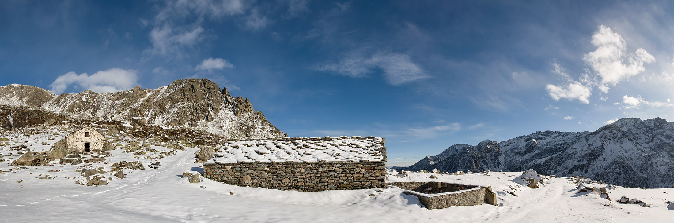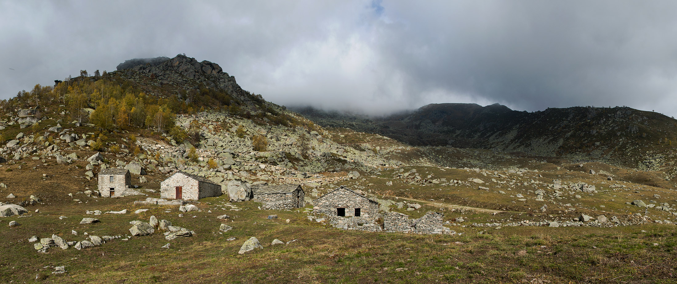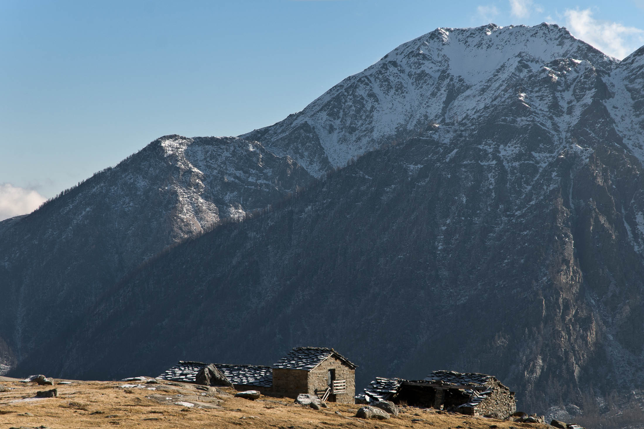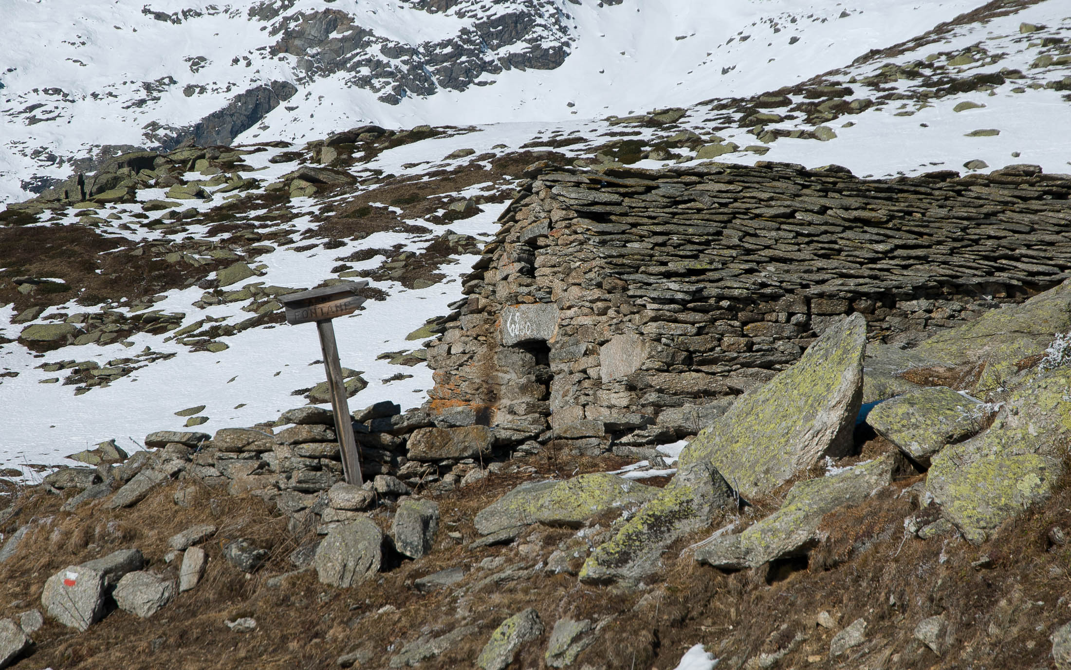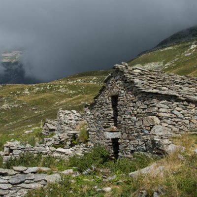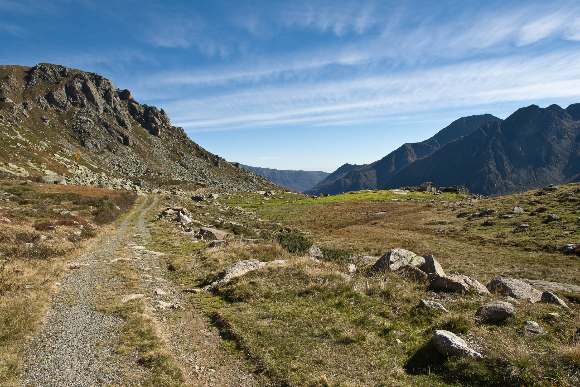Über einige Serpentinen windet sich der Weg weiter talaufwärts, das Panorama wird immer eindrücklicher. Mit jedem Schritt nähert man sich dem Alpenhauptkamm mit der Gipfelkette zwischen der Uja di Ciamarella (3676 m) und der Levanna Orientale (3555 m), eine gigantische Kulisse mit vielen wilden Graten und Türmen. Es folgt ein längerer flacherer Wegabschnitt, die Hänge sind übersät von Geröllfeldern, ringsherum liegen riesige Steine in der Landschaft rum. Dann ein besonders auffälliger Felsbrocken, man könnte meinen, hier wäre ein Meteorit eingeschlagen. In der Nähe plätschert der Rio Sagnasse zu Tal, auf den von vielen Rinnsalen durchzogenen Feuchtwiesen blühen im Frühsommer Alpen-Kuhschellen, Enzian, Schlangen-Knöterich und Trollblumen. Zwei Kurven weiter oberhalb die aufgegebenen Hütten der Gias Crest (1880 m), ein Kuhstall ist noch intakt, das Schicksal der anderen Gebäude ist bereits besiegelt. Zurück bleiben zerborstene Dachbalken und herumliegende Trümmer. Dann erreicht man den Rand einer weiten Hochebene, ein wenig unterhalb die steinernen Hütten der in den Sommermonaten bewirtschafteten Alpe Pià Nou (1853 m), wo um diese Zeit zahlreiche Kühe und Rinder auf den umliegenden Weiden grasen. Im weiteren Verlauf überquert man die riesigen Alphochflächen der Gias dei Signori und der Gias Sagnasse. Jenseits davon umrundet der Sentiero Balcone sanft ansteigend einen Geländerücken und endet schliesslich wenig später bei den archaisch anmutenden Alpgebäuden der Gias Nuovo Fontane (1986 m). Ein abgeschiedener und faszinierender Ort inmitten einer gewaltigen Hochgebirgslandschaft. Das Panorama ist umfassend, man überblickt nahezu das gesamte Val Grande di Lanzo, vom Monte Bellavarda im Osten bis zum Steilabfall des Alpenhauptkamms, der hier zum Greifen nah ist.