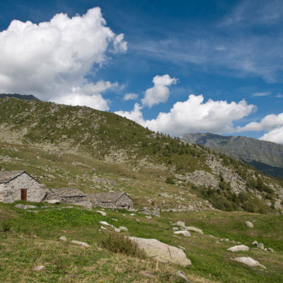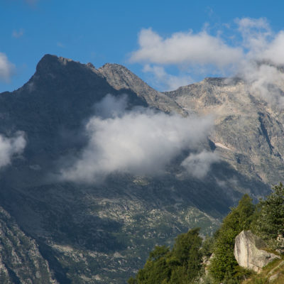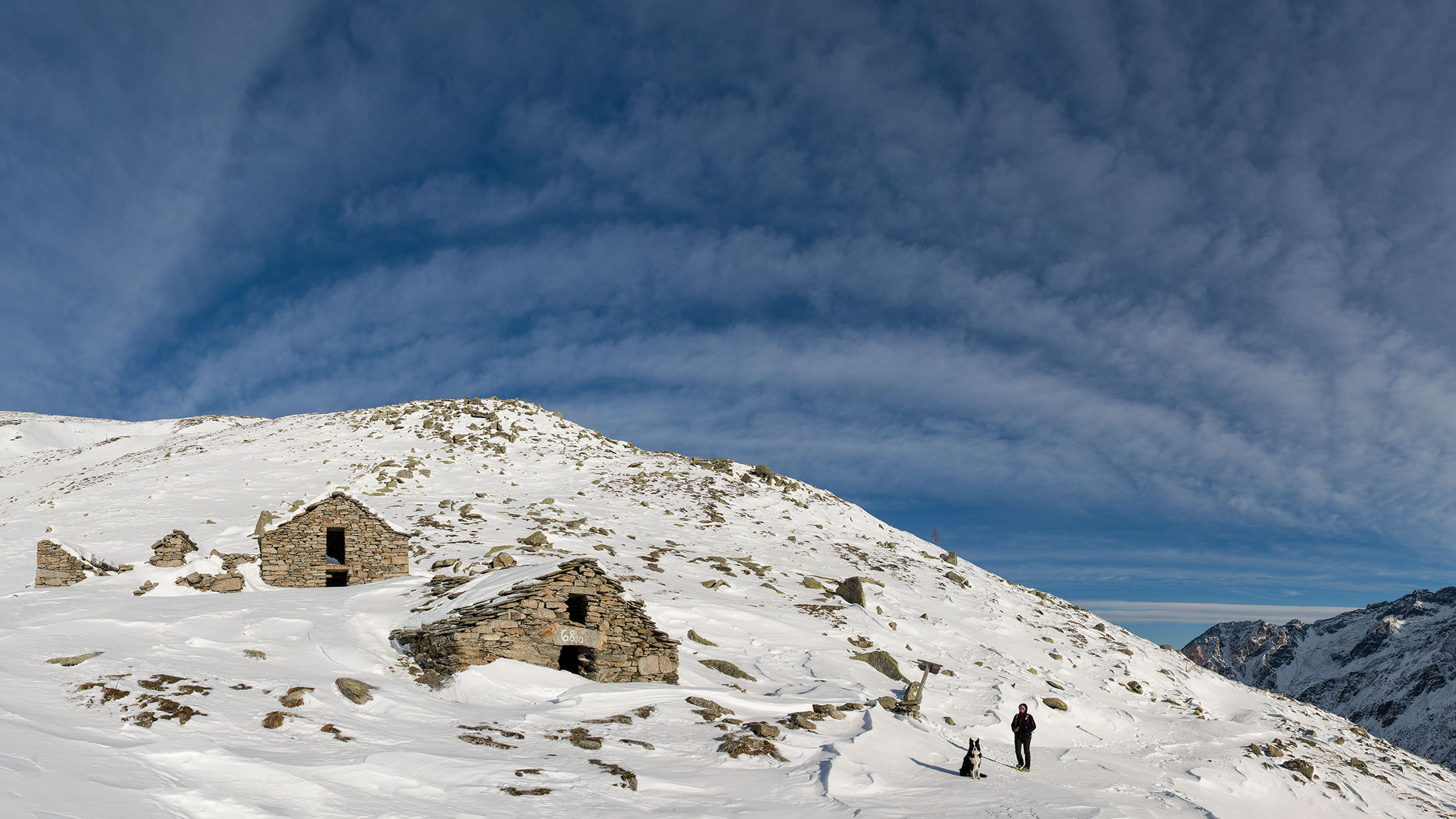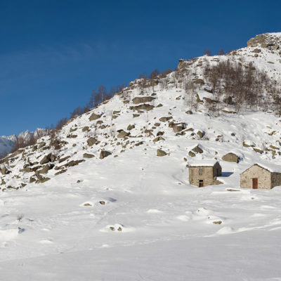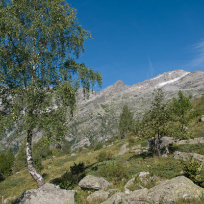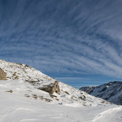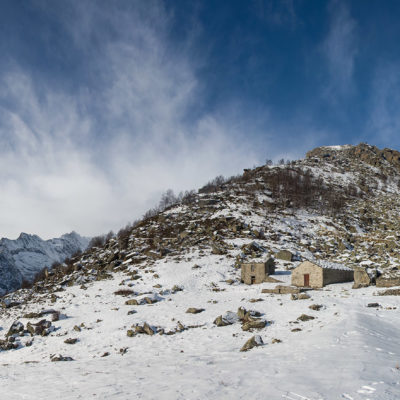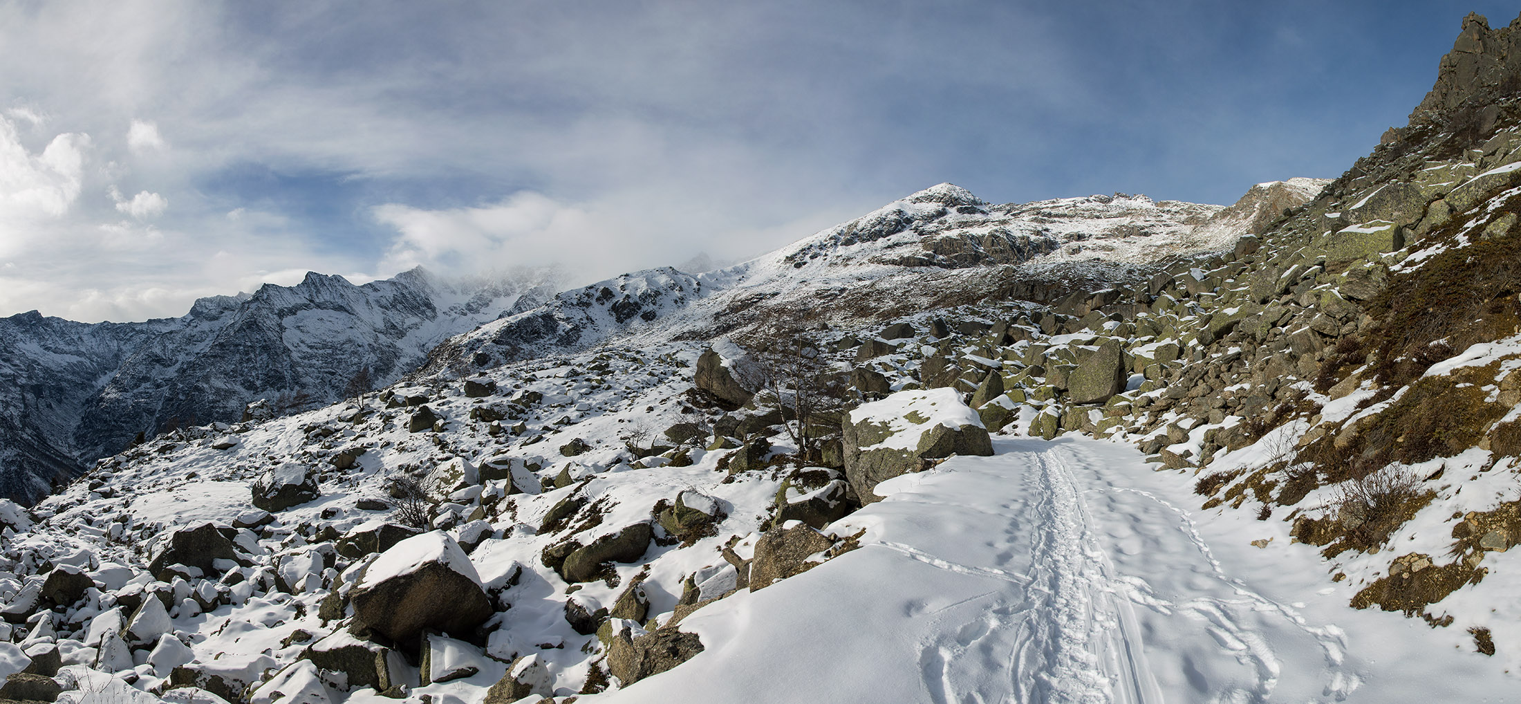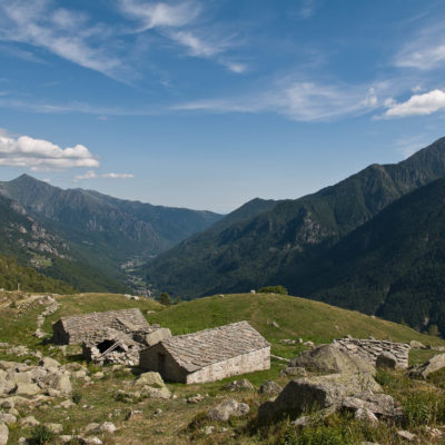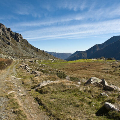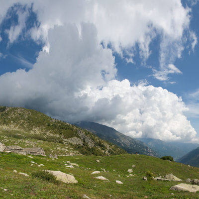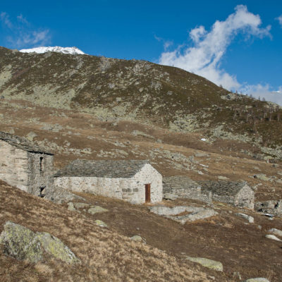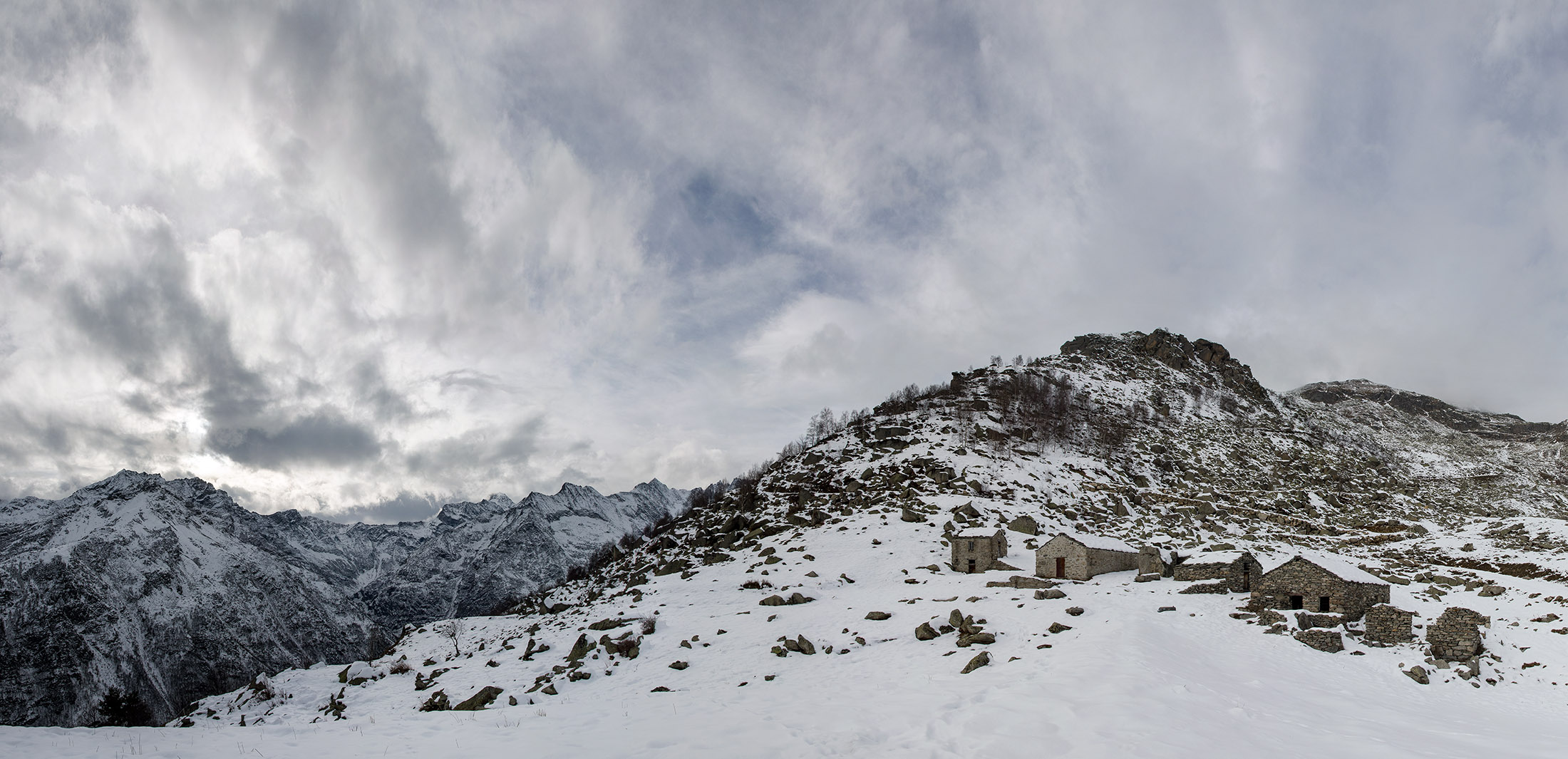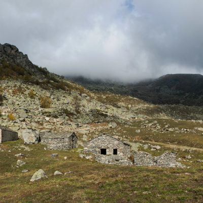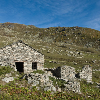 Über einige Serpentinen windet sich der Weg weiter talaufwärts, das Panorama wird immer eindrücklicher. Mit jedem Schritt nähert man sich dem Alpenhauptkamm mit der Gipfelkette zwischen der Uja di Ciamarella (3676 m) und der Levanna Orientale (3555 m), eine gigantische Kulisse mit vielen wilden Graten und Türmen. Es folgt ein längerer flacherer Wegabschnitt, die Hänge sind übersät von Geröllfeldern, ringsherum liegen riesige Steine in der Landschaft rum. Dann ein besonders auffälliger Felsbrocken, man könnte meinen, hier wäre ein Meteorit eingeschlagen. In der Nähe plätschert der Rio Sagnasse zu Tal, auf den von vielen Rinnsalen durchzogenen Feuchtwiesen blühen im Frühsommer Alpen-Kuhschellen, Enzian, Schlangen-Knöterich und Trollblumen. Zwei Kurven weiter oberhalb die aufgegebenen Hütten der Gias Crest (1880 m), ein Kuhstall ist noch intakt, das Schicksal der anderen Gebäude ist bereits besiegelt. Zurück bleiben zerborstene Dachbalken und herumliegende Trümmer. Dann erreicht man den Rand einer weiten Hochebene, ein wenig unterhalb die steinernen Hütten der in den Sommermonaten bewirtschafteten Alpe Pià Nou (1853 m), wo um diese Zeit zahlreiche Kühe und Rinder auf den umliegenden Weiden grasen. Im weiteren Verlauf überquert man die riesigen Alphochflächen der Gias dei Signori und der Gias Sagnasse. Jenseits davon umrundet der Sentiero Balcone sanft ansteigend einen Geländerücken und endet schliesslich wenig später bei den archaisch anmutenden Alpgebäuden der Gias Nuovo Fontane (1986 m). Ein abgeschiedener und faszinierender Ort inmitten einer gewaltigen Hochgebirgslandschaft. Das Panorama ist umfassend, man überblickt nahezu das gesamte Val Grande di Lanzo, vom Monte Bellavarda im Osten bis zum Steilabfall des Alpenhauptkamms, der hier zum Greifen nah ist.