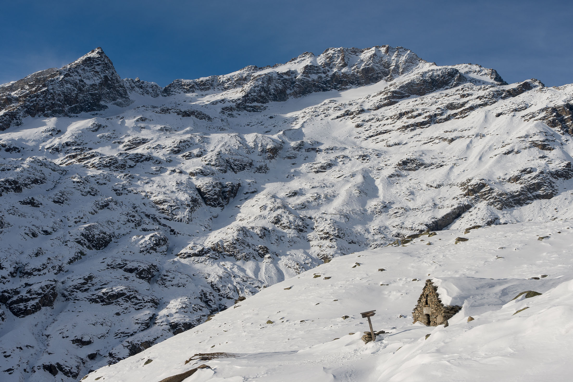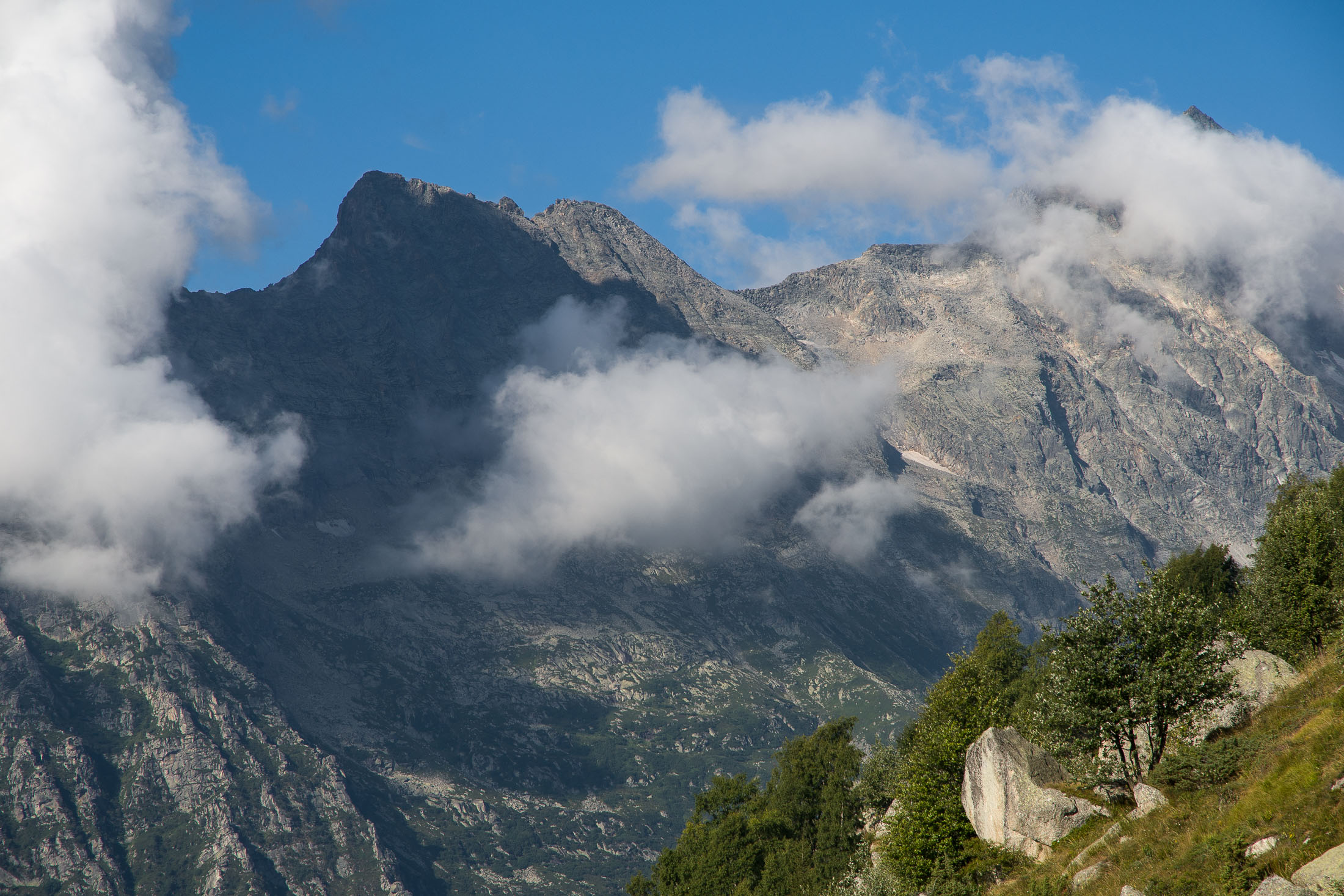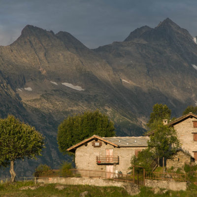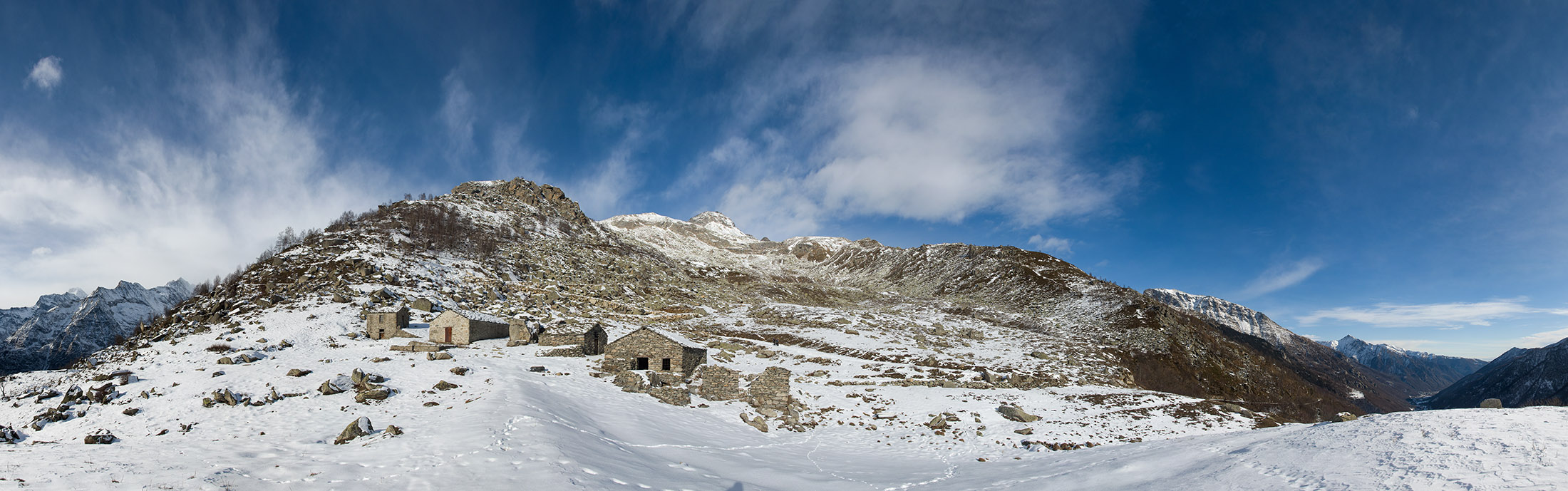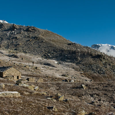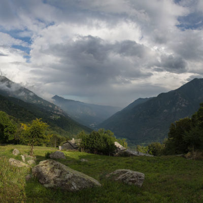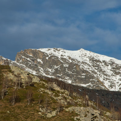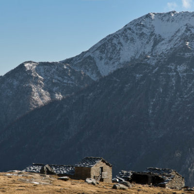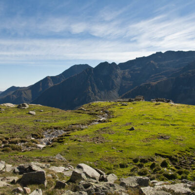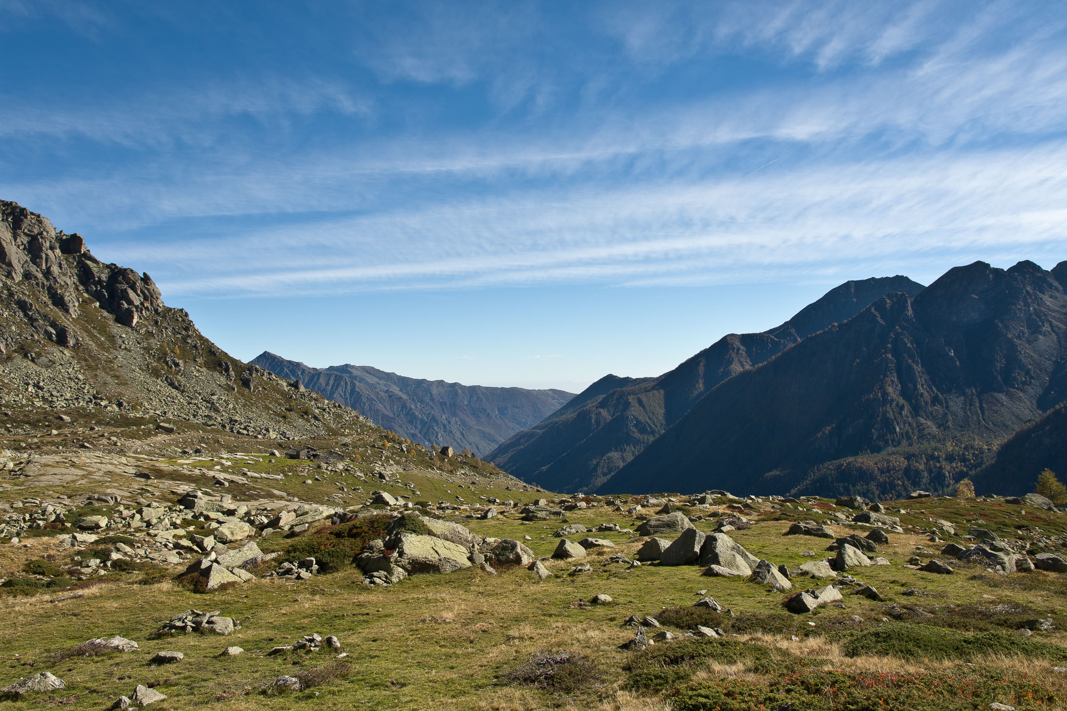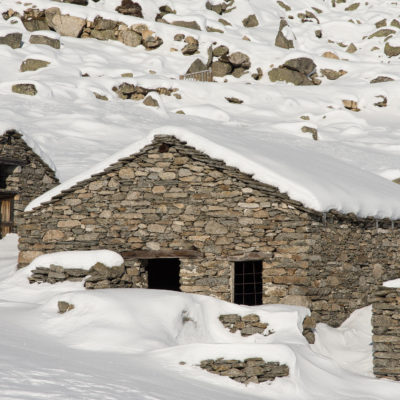 Über einige Serpentinen windet sich der Weg weiter talaufwärts, das Panorama wird immer eindrücklicher. Mit jedem Schritt nähert man sich dem Alpenhauptkamm mit der Gipfelkette zwischen der Uja di Ciamarella (3676 m) und der Levanna Orientale (3555 m), eine gigantische Kulisse mit vielen wilden Graten und Türmen. Es folgt ein längerer flacherer Wegabschnitt, die Hänge sind übersät von Geröllfeldern, ringsherum liegen riesige Steine in der Landschaft rum. Dann ein besonders auffälliger Felsbrocken, man könnte meinen, hier wäre ein Meteorit eingeschlagen. In der Nähe plätschert der Rio Sagnasse zu Tal, auf den von vielen Rinnsalen durchzogenen Feuchtwiesen blühen im Frühsommer Alpen-Kuhschellen, Enzian, Schlangen-Knöterich und Trollblumen. Zwei Kurven weiter oberhalb die aufgegebenen Hütten der Gias Crest (1880 m), ein Kuhstall ist noch intakt, das Schicksal der anderen Gebäude ist bereits besiegelt. Zurück bleiben zerborstene Dachbalken und herumliegende Trümmer. Dann erreicht man den Rand einer weiten Hochebene, ein wenig unterhalb die steinernen Hütten der in den Sommermonaten bewirtschafteten Alpe Pià Nou (1853 m), wo um diese Zeit zahlreiche Kühe und Rinder auf den umliegenden Weiden grasen. Im weiteren Verlauf überquert man die riesigen Alphochflächen der Gias dei Signori und der Gias Sagnasse. Jenseits davon umrundet der Sentiero Balcone sanft ansteigend einen Geländerücken und endet schliesslich wenig später bei den archaisch anmutenden Alpgebäuden der Gias Nuovo Fontane (1986 m). Ein abgeschiedener und faszinierender Ort inmitten einer gewaltigen Hochgebirgslandschaft. Das Panorama ist umfassend, man überblickt nahezu das gesamte Val Grande di Lanzo, vom Monte Bellavarda im Osten bis zum Steilabfall des Alpenhauptkamms, der hier zum Greifen nah ist.