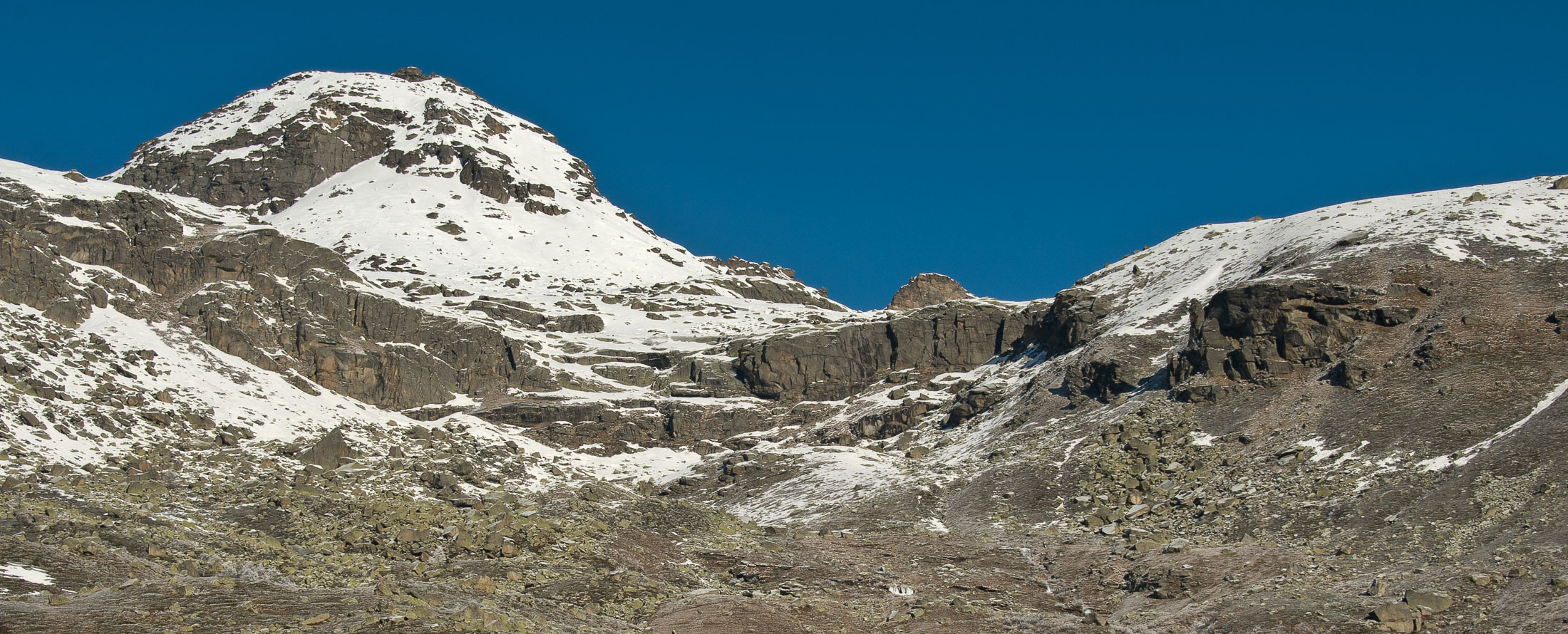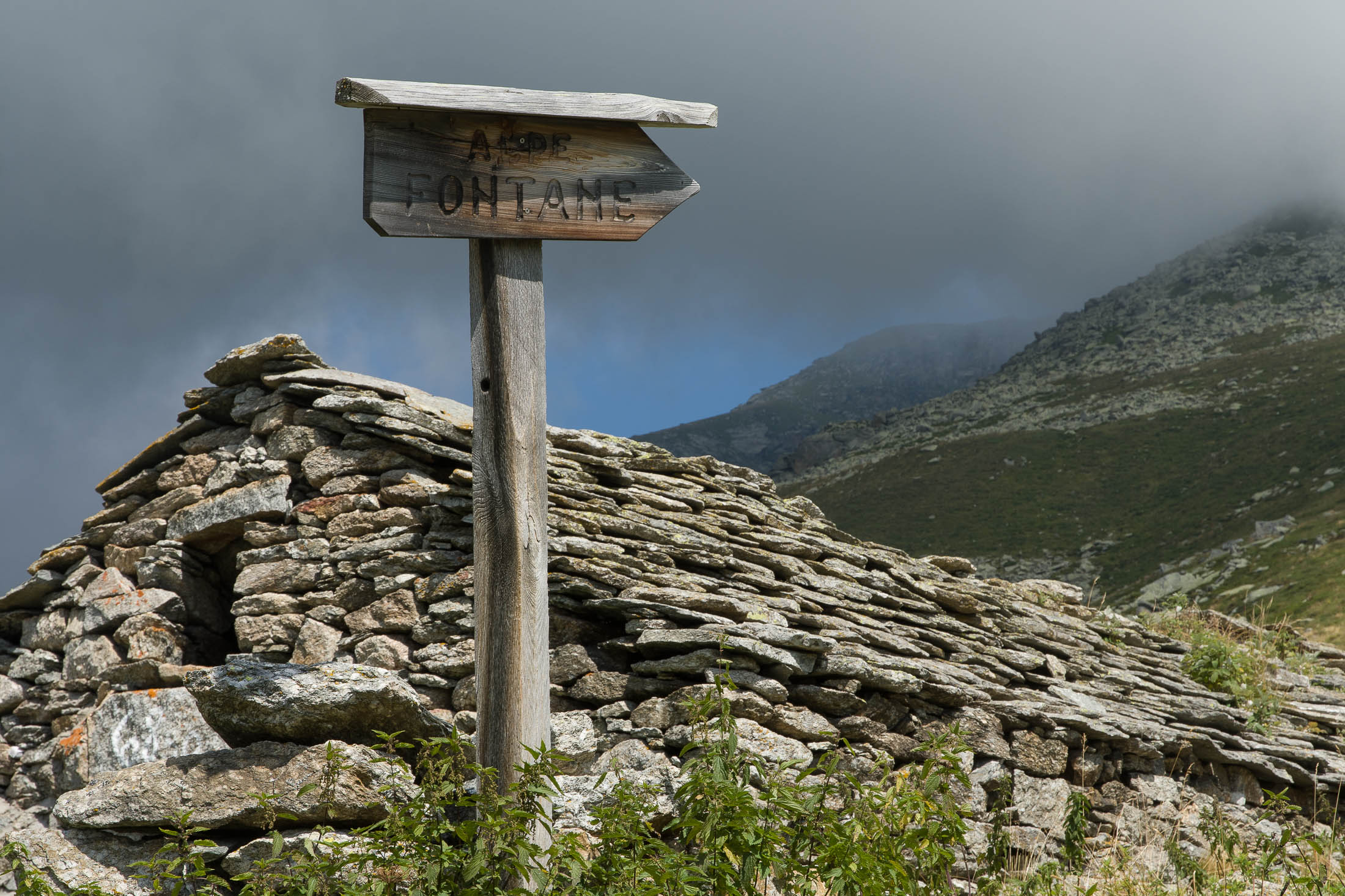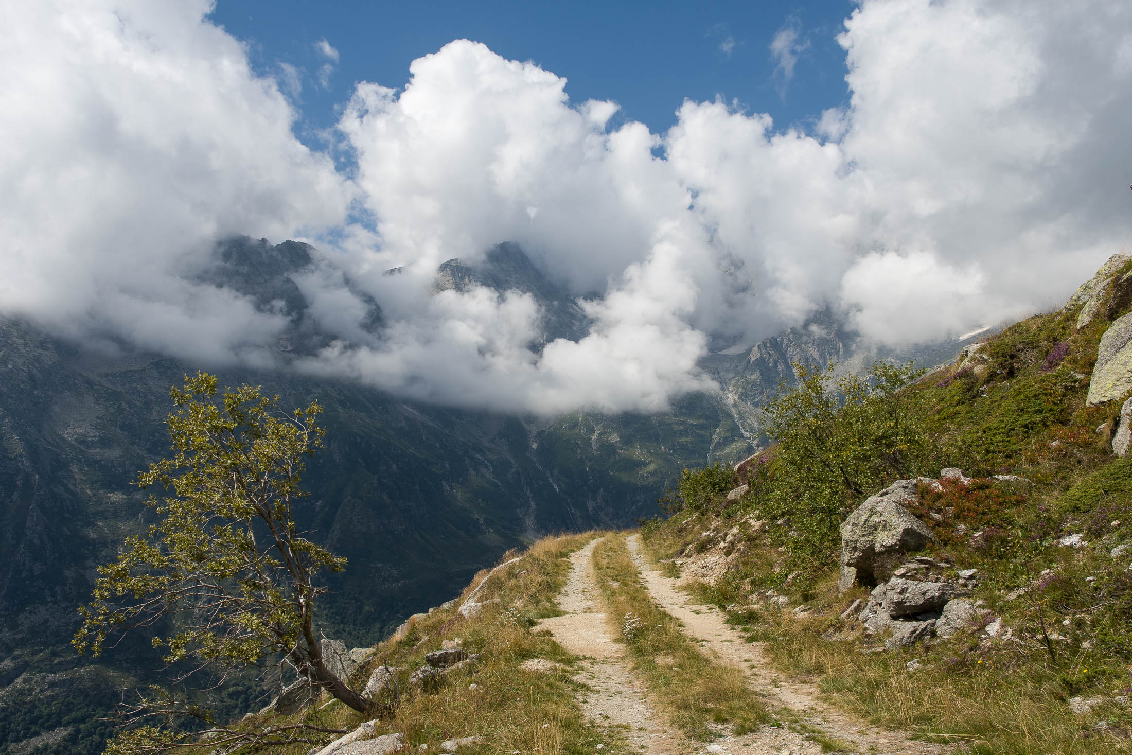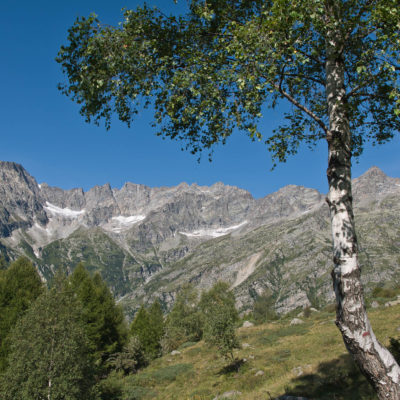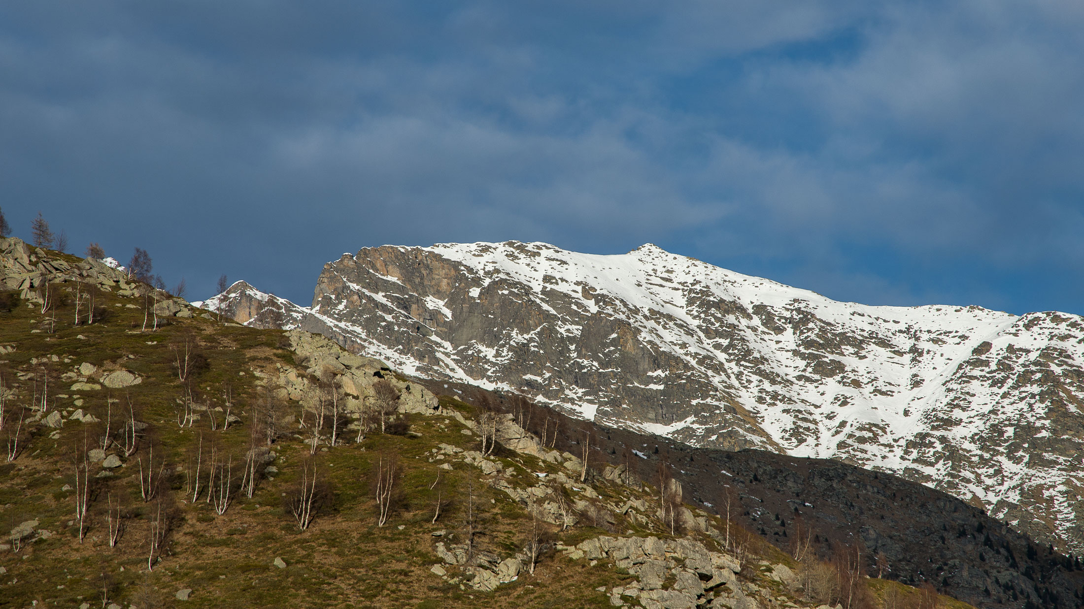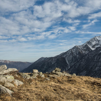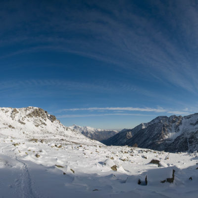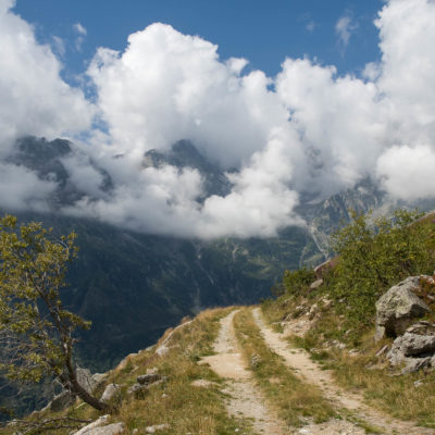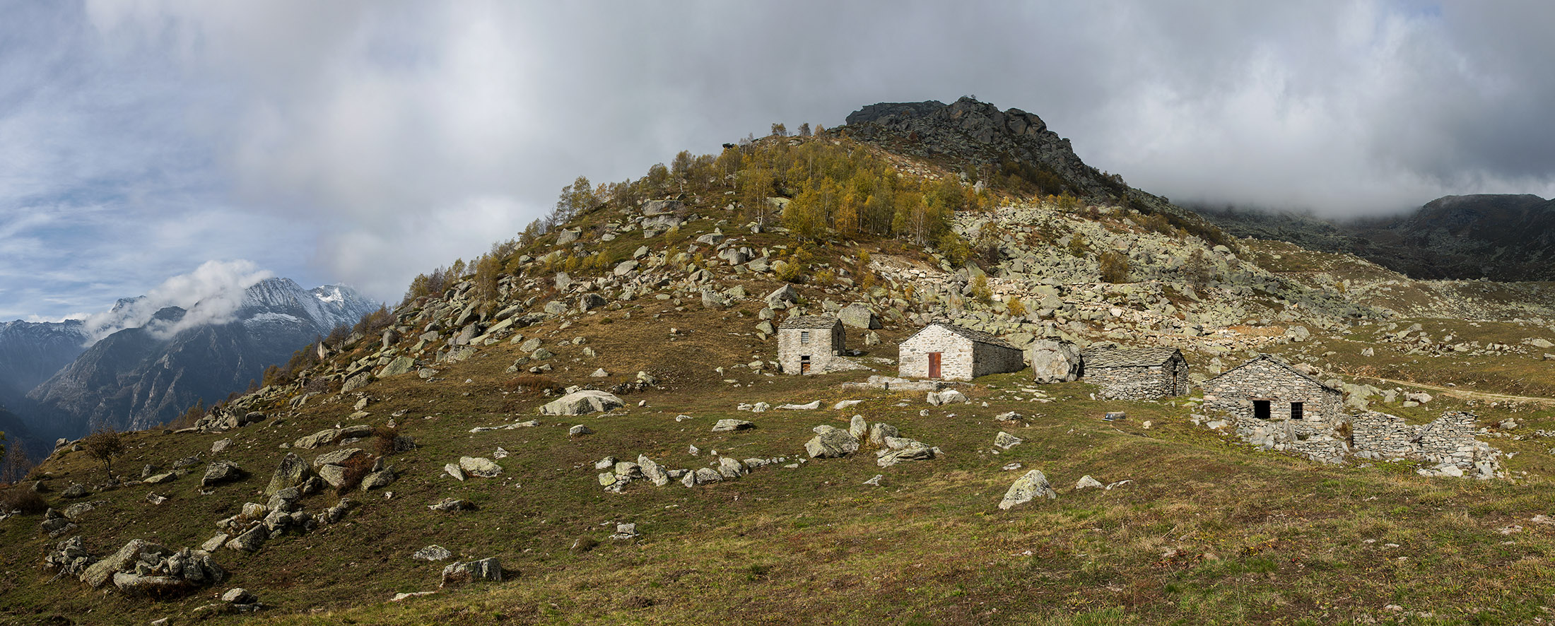 Über einige Serpentinen windet sich der Weg weiter talaufwärts, das Panorama wird immer eindrücklicher. Mit jedem Schritt nähert man sich dem Alpenhauptkamm mit der Gipfelkette zwischen der Uja di Ciamarella (3676 m) und der Levanna Orientale (3555 m), eine gigantische Kulisse mit vielen wilden Graten und Türmen. Es folgt ein längerer flacherer Wegabschnitt, die Hänge sind übersät von Geröllfeldern, ringsherum liegen riesige Steine in der Landschaft rum. Dann ein besonders auffälliger Felsbrocken, man könnte meinen, hier wäre ein Meteorit eingeschlagen. In der Nähe plätschert der Rio Sagnasse zu Tal, auf den von vielen Rinnsalen durchzogenen Feuchtwiesen blühen im Frühsommer Alpen-Kuhschellen, Enzian, Schlangen-Knöterich und Trollblumen. Zwei Kurven weiter oberhalb die aufgegebenen Hütten der Gias Crest (1880 m), ein Kuhstall ist noch intakt, das Schicksal der anderen Gebäude ist bereits besiegelt. Zurück bleiben zerborstene Dachbalken und herumliegende Trümmer. Dann erreicht man den Rand einer weiten Hochebene, ein wenig unterhalb die steinernen Hütten der in den Sommermonaten bewirtschafteten Alpe Pià Nou (1853 m), wo um diese Zeit zahlreiche Kühe und Rinder auf den umliegenden Weiden grasen. Im weiteren Verlauf überquert man die riesigen Alphochflächen der Gias dei Signori und der Gias Sagnasse. Jenseits davon umrundet der Sentiero Balcone sanft ansteigend einen Geländerücken und endet schliesslich wenig später bei den archaisch anmutenden Alpgebäuden der Gias Nuovo Fontane (1986 m). Ein abgeschiedener und faszinierender Ort inmitten einer gewaltigen Hochgebirgslandschaft. Das Panorama ist umfassend, man überblickt nahezu das gesamte Val Grande di Lanzo, vom Monte Bellavarda im Osten bis zum Steilabfall des Alpenhauptkamms, der hier zum Greifen nah ist.