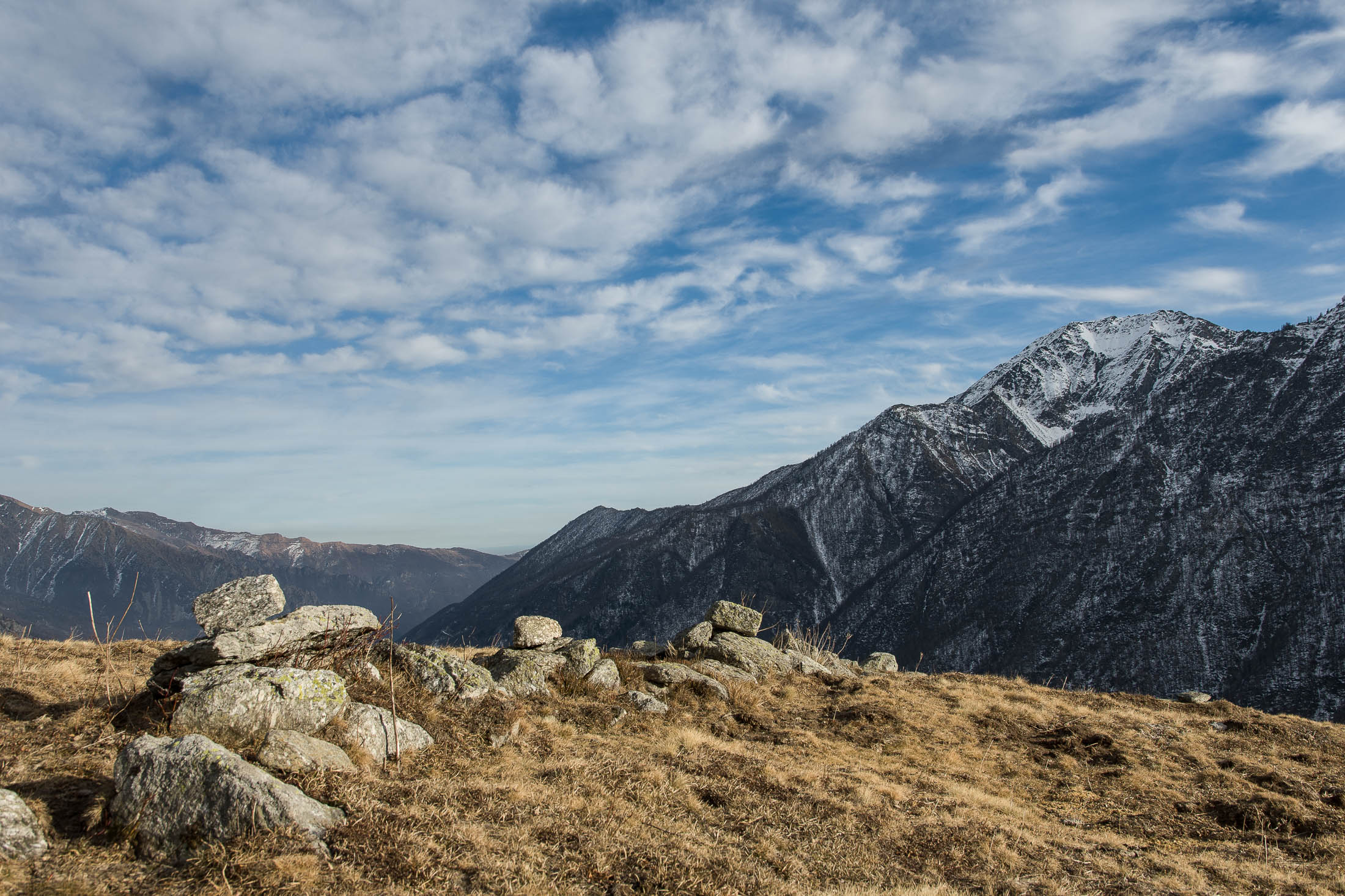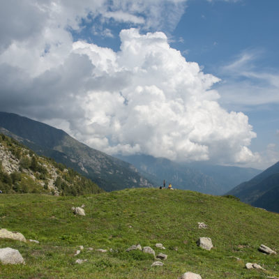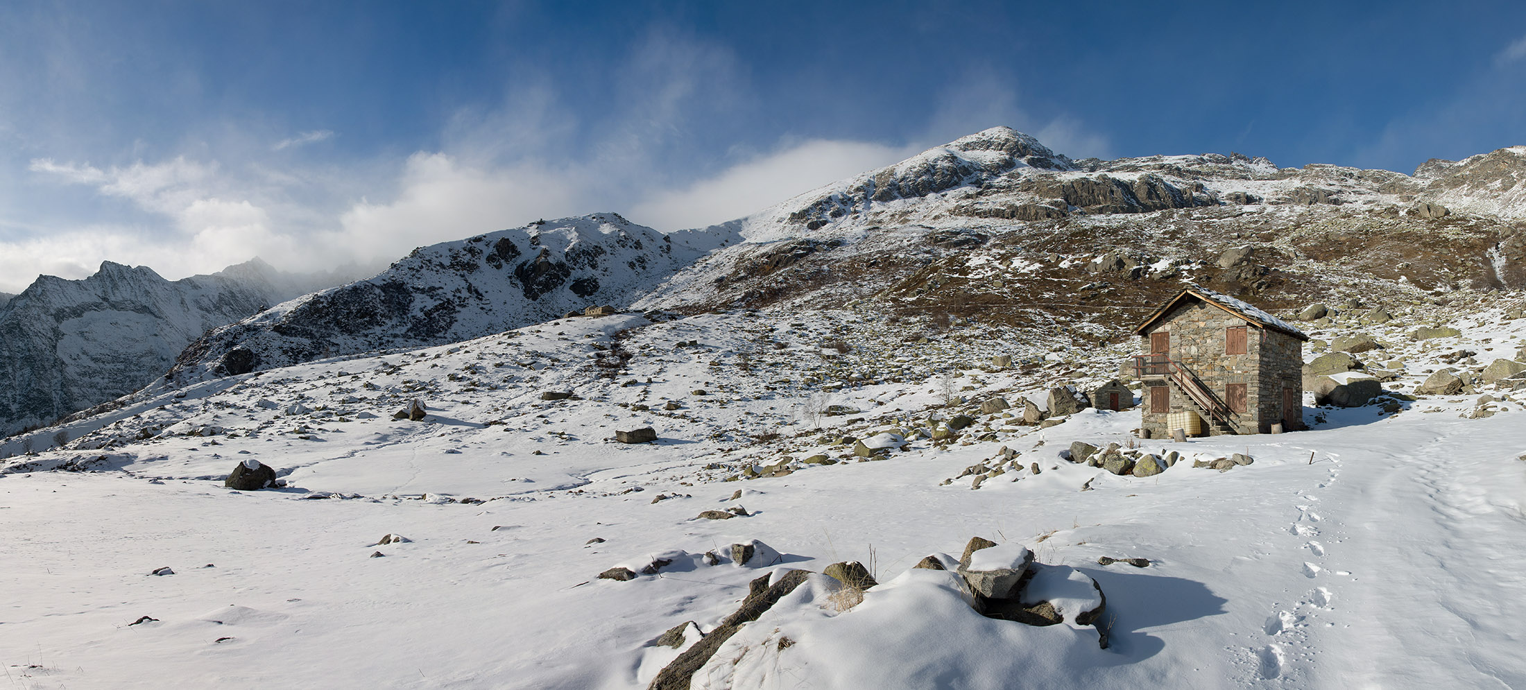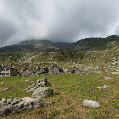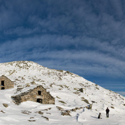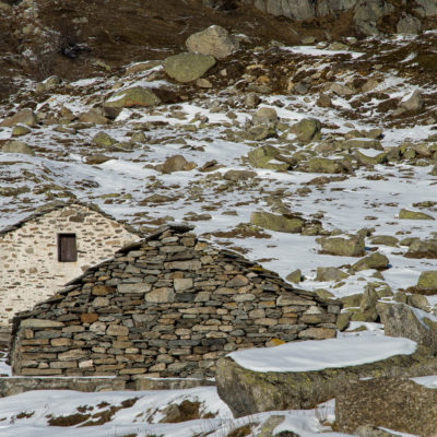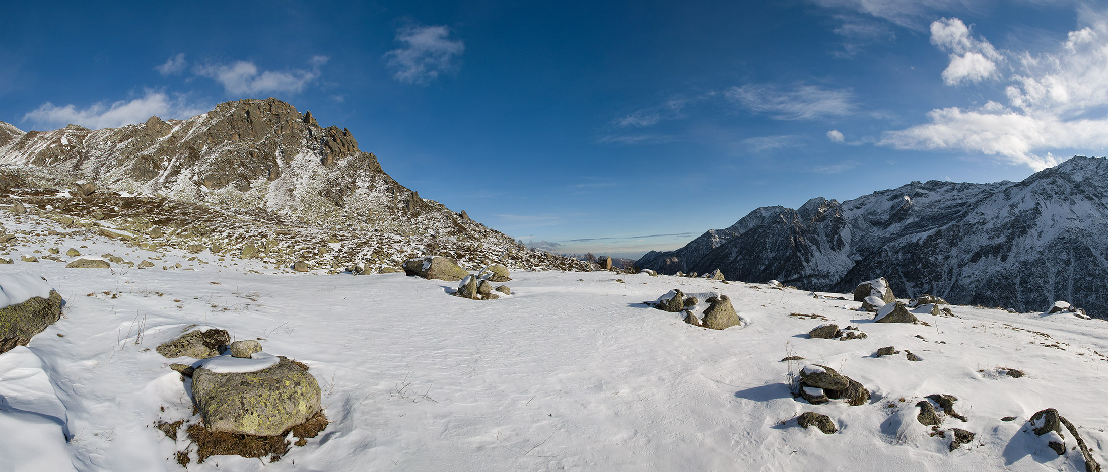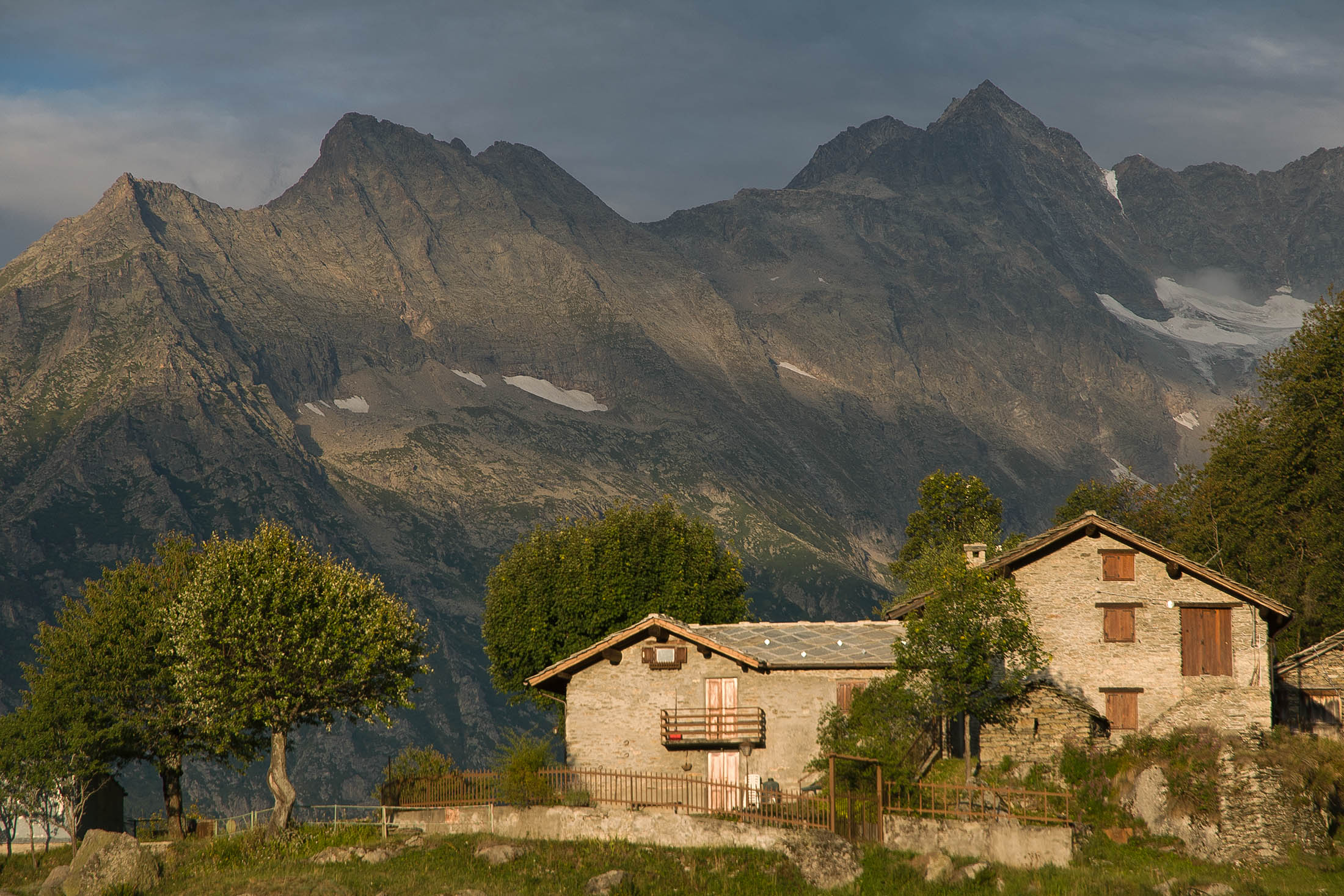 Über einige Serpentinen windet sich der Weg weiter talaufwärts, das Panorama wird immer eindrücklicher. Mit jedem Schritt nähert man sich dem Alpenhauptkamm mit der Gipfelkette zwischen der Uja di Ciamarella (3676 m) und der Levanna Orientale (3555 m), eine gigantische Kulisse mit vielen wilden Graten und Türmen. Es folgt ein längerer flacherer Wegabschnitt, die Hänge sind übersät von Geröllfeldern, ringsherum liegen riesige Steine in der Landschaft rum. Dann ein besonders auffälliger Felsbrocken, man könnte meinen, hier wäre ein Meteorit eingeschlagen. In der Nähe plätschert der Rio Sagnasse zu Tal, auf den von vielen Rinnsalen durchzogenen Feuchtwiesen blühen im Frühsommer Alpen-Kuhschellen, Enzian, Schlangen-Knöterich und Trollblumen. Zwei Kurven weiter oberhalb die aufgegebenen Hütten der Gias Crest (1880 m), ein Kuhstall ist noch intakt, das Schicksal der anderen Gebäude ist bereits besiegelt. Zurück bleiben zerborstene Dachbalken und herumliegende Trümmer. Dann erreicht man den Rand einer weiten Hochebene, ein wenig unterhalb die steinernen Hütten der in den Sommermonaten bewirtschafteten Alpe Pià Nou (1853 m), wo um diese Zeit zahlreiche Kühe und Rinder auf den umliegenden Weiden grasen. Im weiteren Verlauf überquert man die riesigen Alphochflächen der Gias dei Signori und der Gias Sagnasse. Jenseits davon umrundet der Sentiero Balcone sanft ansteigend einen Geländerücken und endet schliesslich wenig später bei den archaisch anmutenden Alpgebäuden der Gias Nuovo Fontane (1986 m). Ein abgeschiedener und faszinierender Ort inmitten einer gewaltigen Hochgebirgslandschaft. Das Panorama ist umfassend, man überblickt nahezu das gesamte Val Grande di Lanzo, vom Monte Bellavarda im Osten bis zum Steilabfall des Alpenhauptkamms, der hier zum Greifen nah ist.